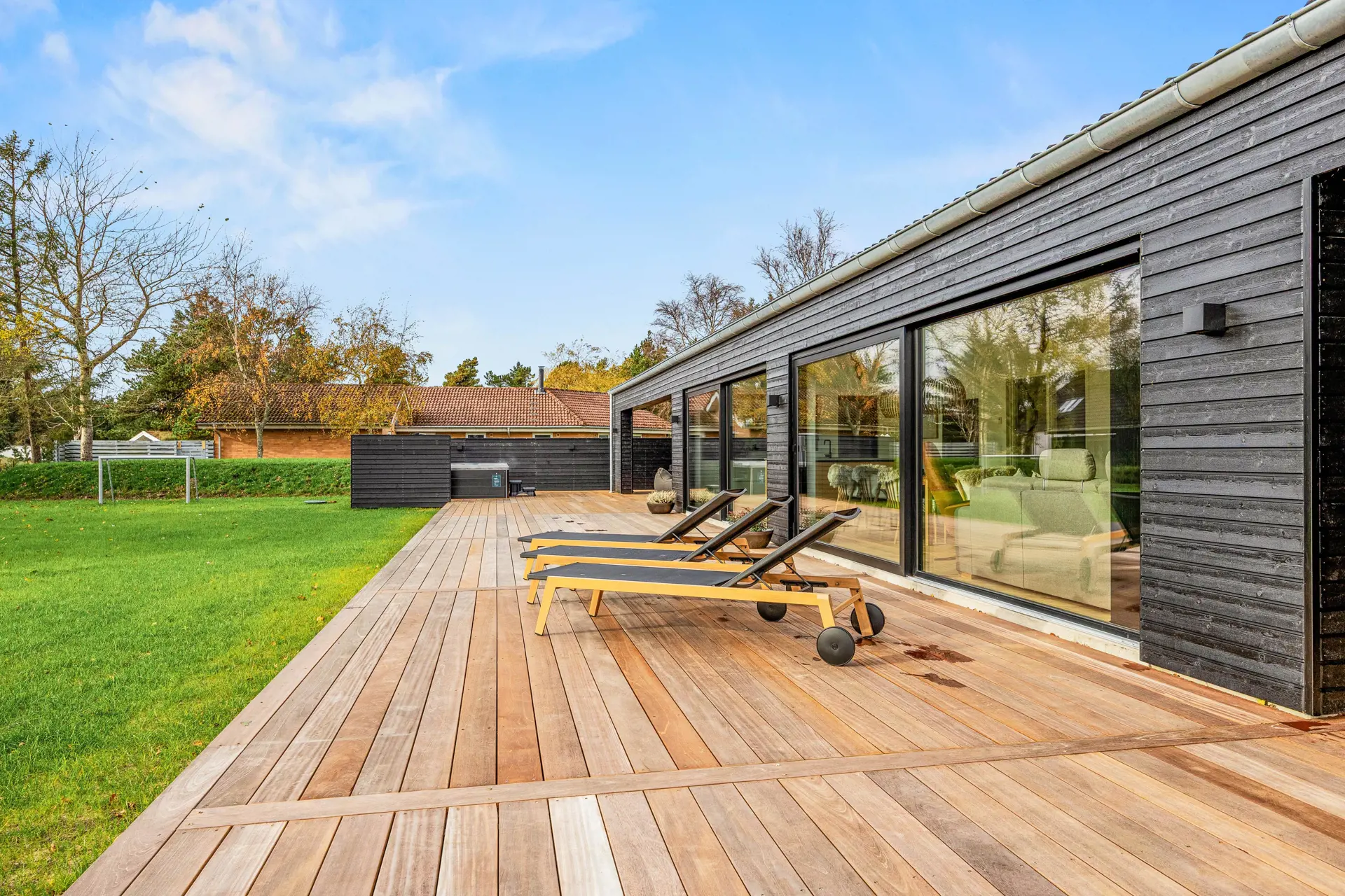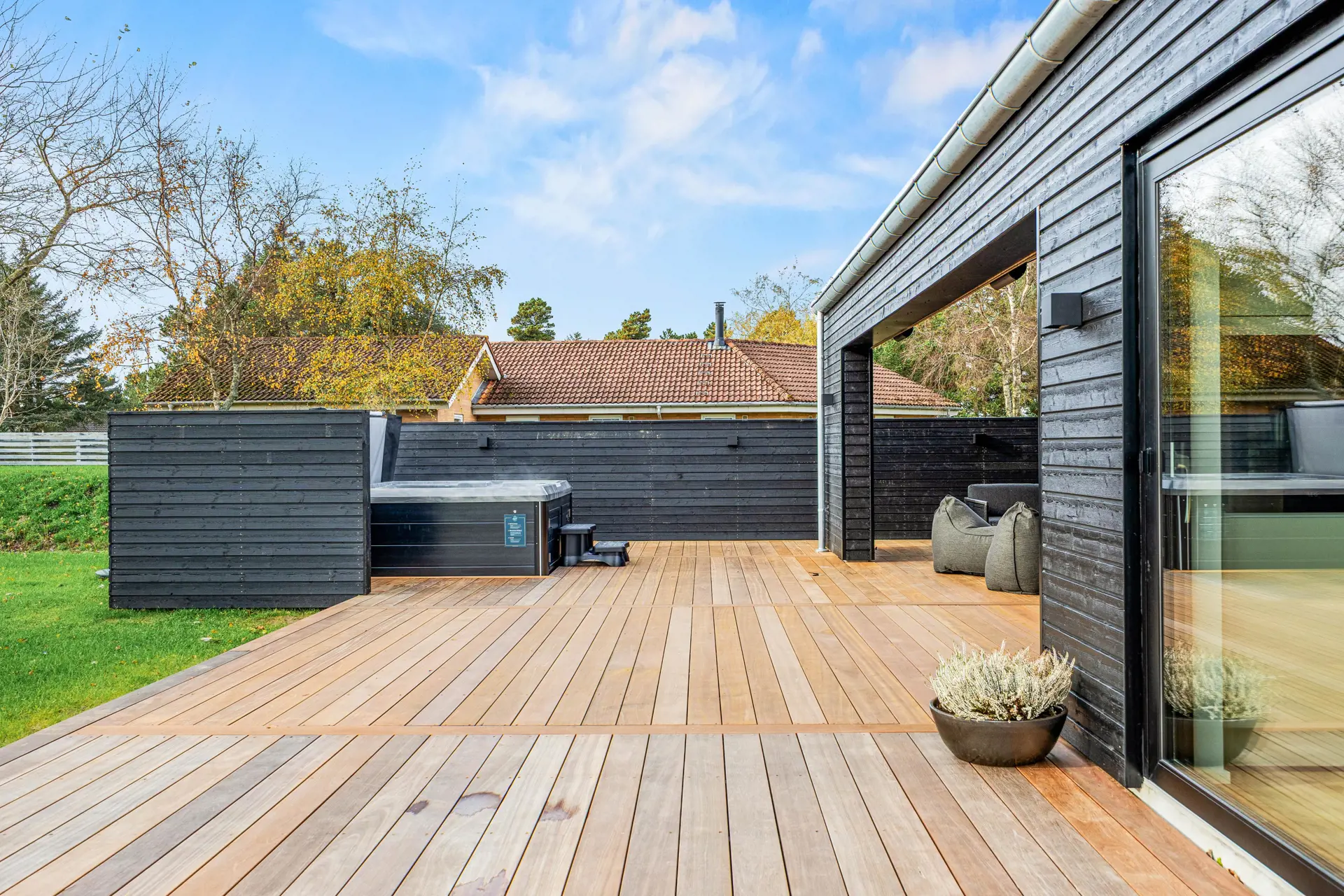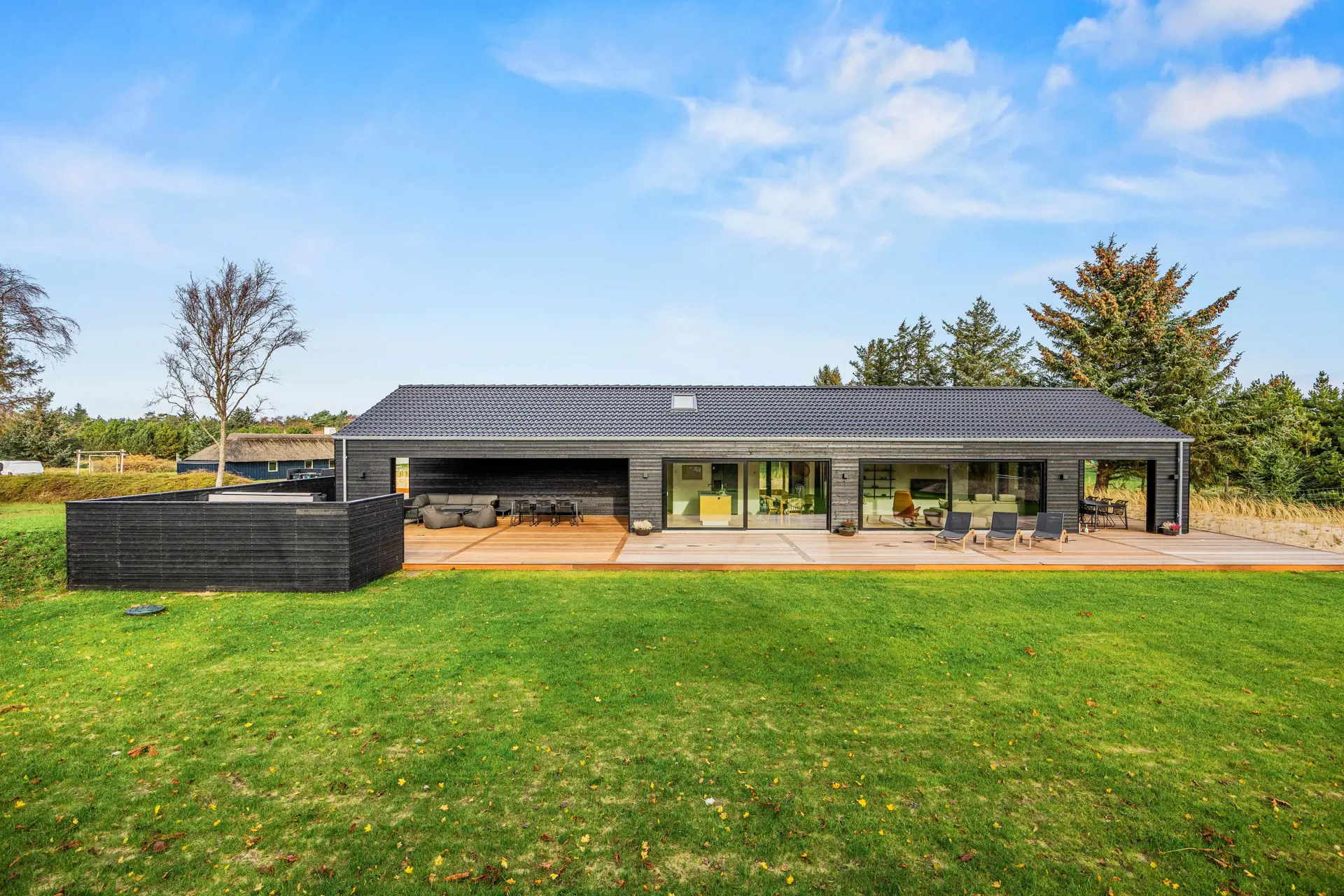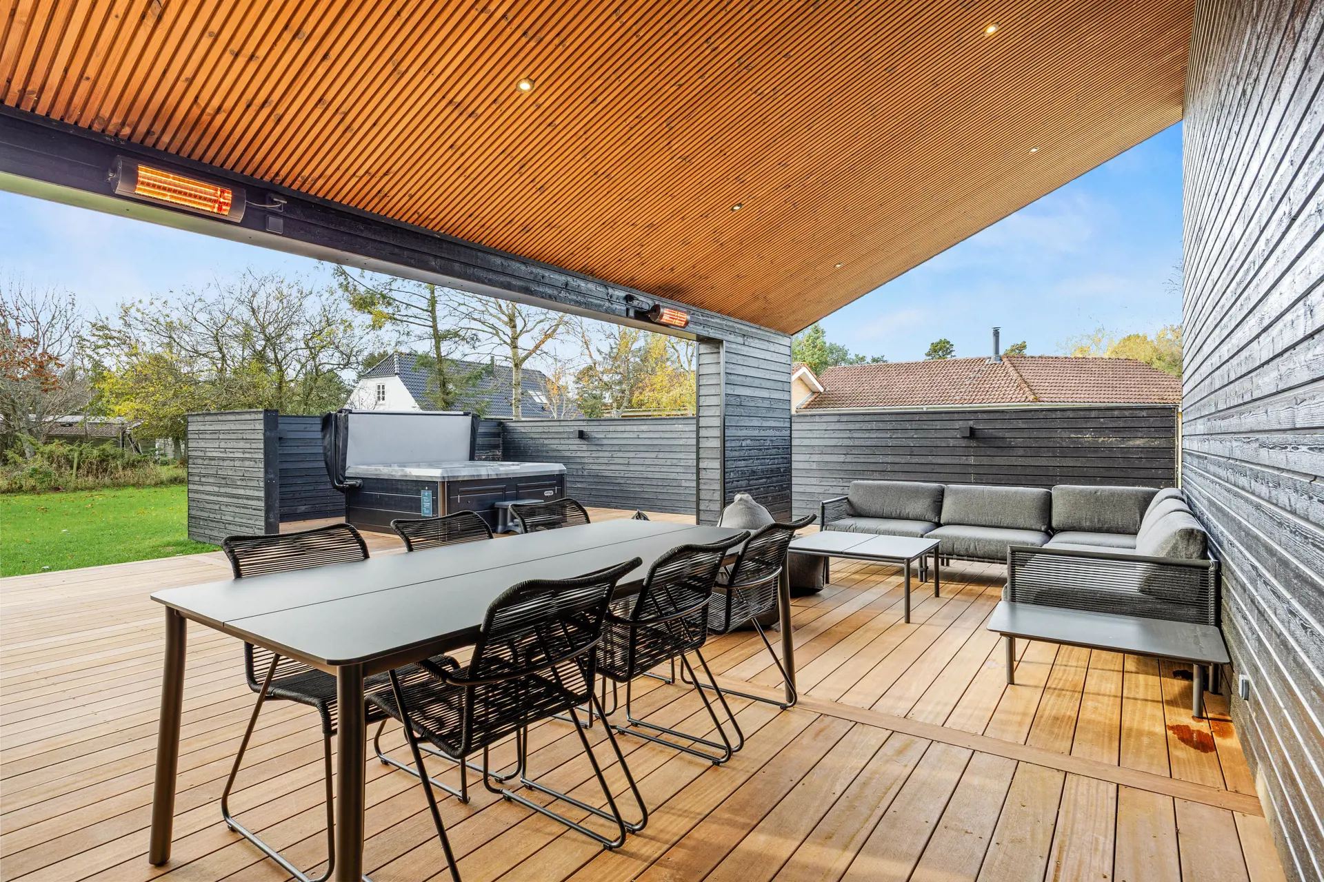 Das Ferienhaus in Vejers bietet eine beeindruckende Grundstücksfläche von 1552 m², die euch ein privates Outdoor-Paradies zur Verfügung stellt. Entspannt auf der offenen oder überdachten Terrasse von etwa 60 m2, während die Kinder im großzügigen Garten spielen. Genießt luxuriöse Momente in einem Außenwhirlpool und erlebt den ultimativen Komfort dank Wärmelampen auf einer der zwei überdachten Terrassen. Diese sind mit komfortablen Loungemöbeln ausgestattet, die zum Verweilen einladen.