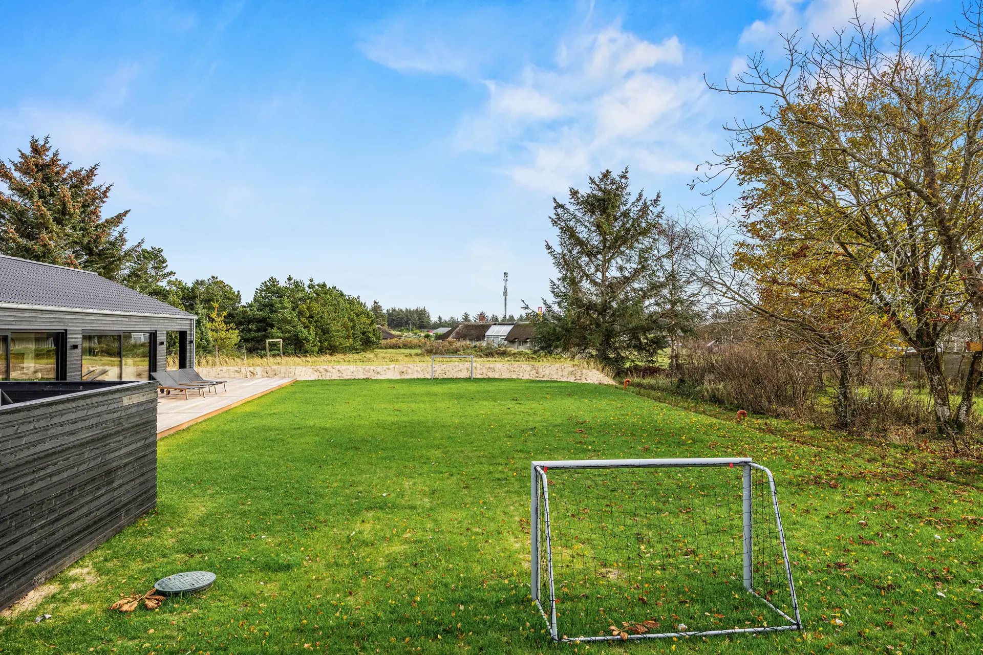 Das Rasengrundstück lädt ein, den Tag mit spannenden Fußballspielen ausklingen zu lassen. Mit nur 1500 Metern Entfernung zum Strand und lediglich 200 Metern bis zu Einkaufsmöglichkeiten ist das Ferienhaus der perfekte Ausgangspunkt für vielseitige Aktivitäten.
