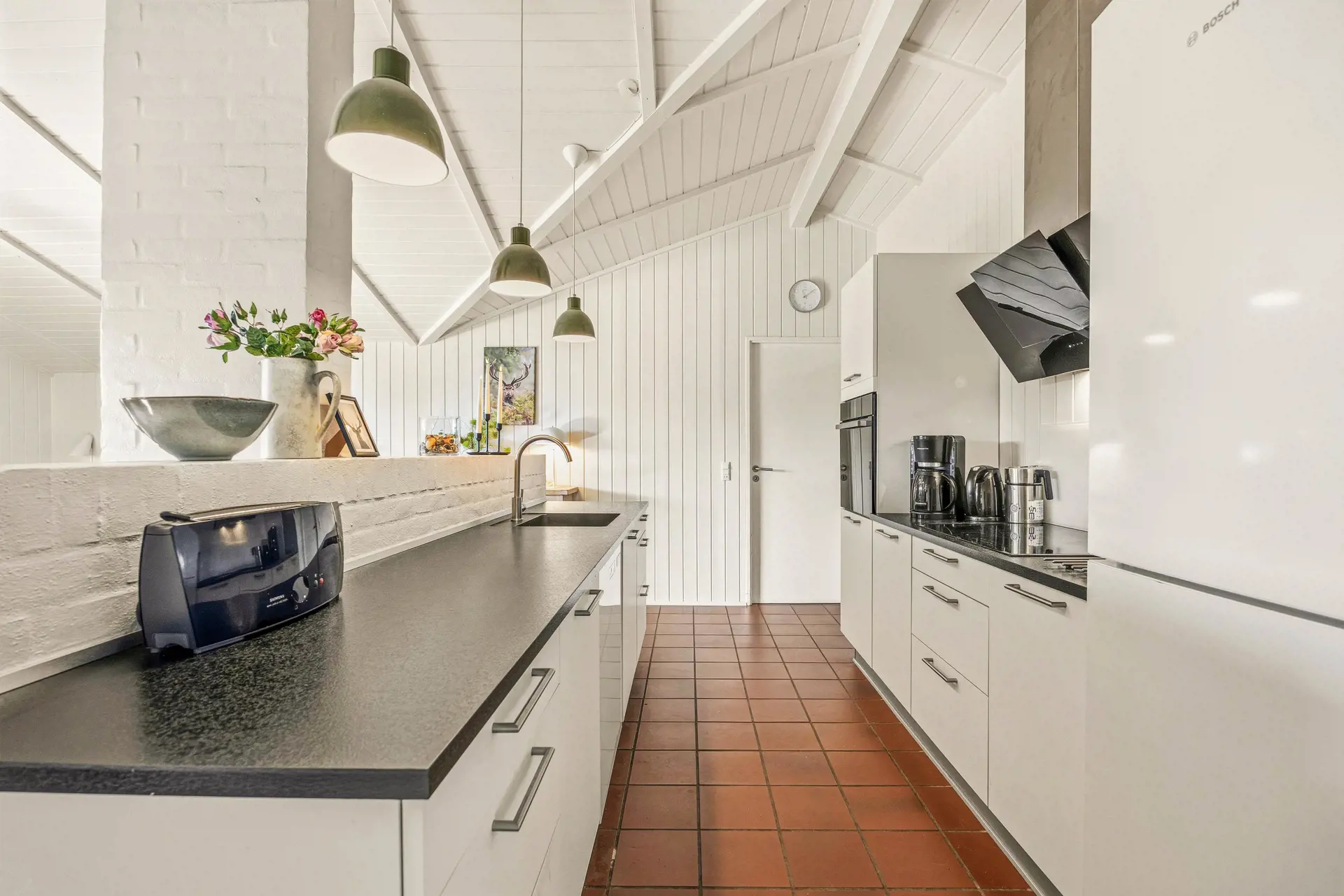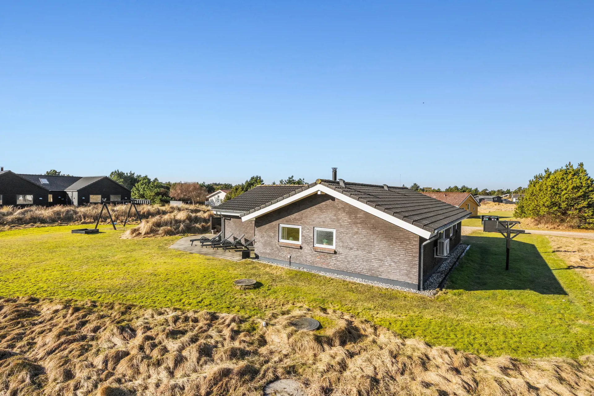 Ihr wohnt nur 1000 Meter vom Meer entfernt, sodass Strandbesuche ein natürlicher Teil des Tagesplans werden können, und es sind etwa 600 Meter bis zum Einkaufen, was es einfach macht, frisches Frühstücksgebäck zu holen oder für das Abendessen einzukaufen. Draußen wartet ein großes Naturgrundstück von insgesamt 2103 m² mit offener Sicht nach oben und einem offenen Gelände, das viel Luft und Platz für Spiel und Aktivitäten bietet. Hier können die Kinder mit Schaukel und Sandkasten spielen, während ihr den Grill anfeuert und den Abend auf der offenen oder überdachten Terrasse je nach Sonne und Wind genießet. Es ist ein Ort, an dem das Leben im Freien seinen Raum bekommt und an dem Pausen auf gute Weise lang erscheinen.