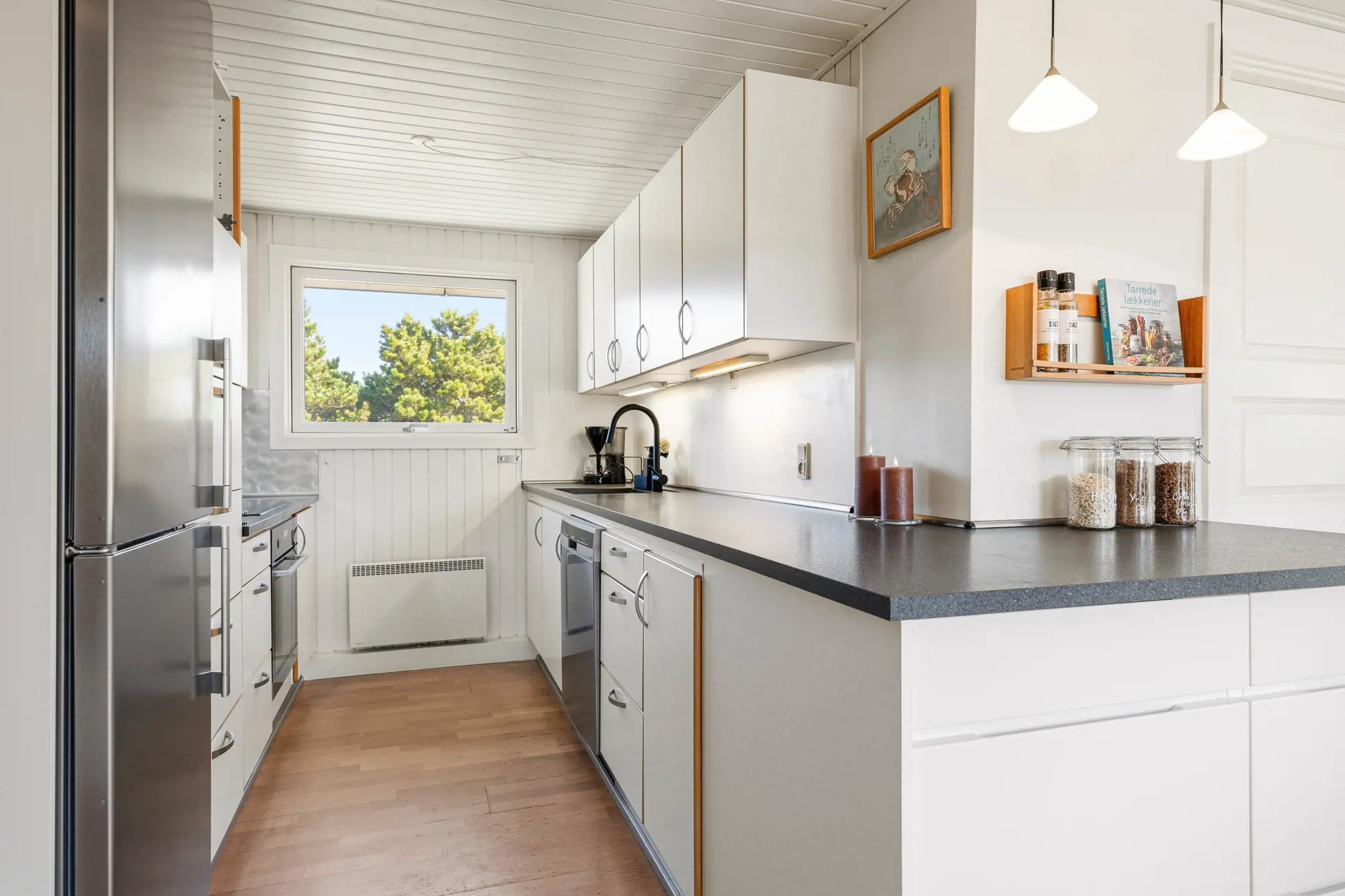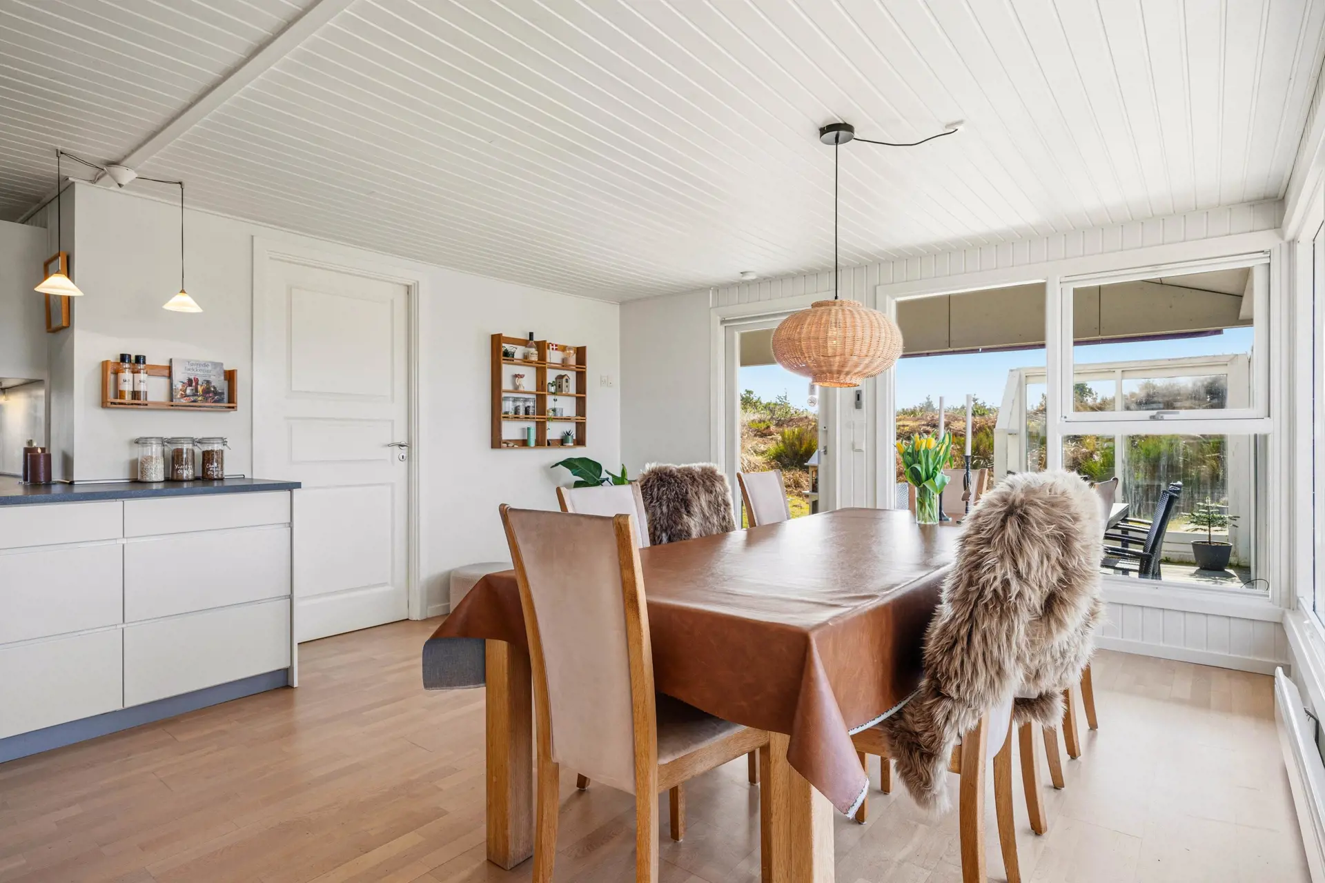 Der Wohnbereich lädt dich ein, den Tag entspannt zu starten und abends zusammenzukommen. Besonders schön: Vom Wohnzimmer aus schaust du direkt auf die Dünen – eine Kulisse, die zu jeder Jahreszeit Stimmung schafft. Wenn es draußen frischer wird, macht es dir der Kaminofen leicht, es gemütlich zu haben. Ergänzend sorgt die Wärmepumpe für angenehme Temperaturen und ein gutes Wohnklima, während du nach einem Strandtag die Füße hochlegst oder den nächsten Ausflug planst.