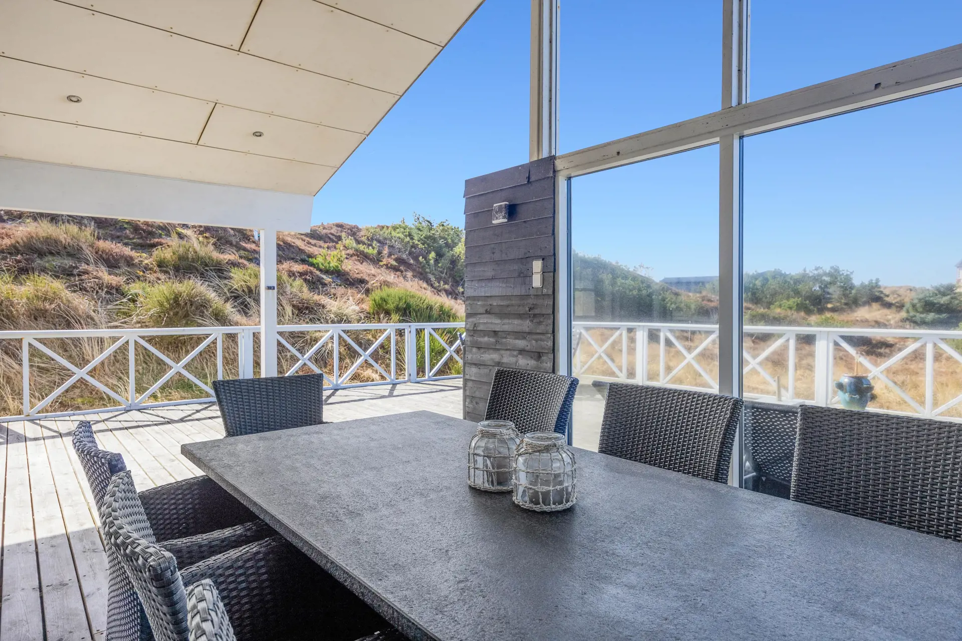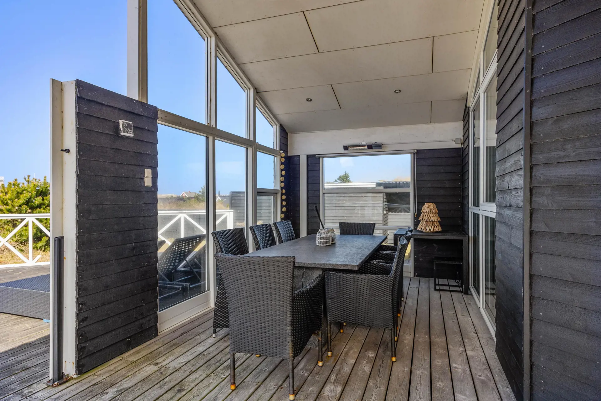 Draußen setzt sich das Urlaubsgefühl fort: Du hast mehrere Terrassen, teilweise mit Windschutz, sodass du je nach Wetter deinen Lieblingsplatz findest. Eine offene Terrasse ist perfekt für sonnige Stunden, während die überdachte Terrasse dir auch bei wechselhaftem Wetter angenehme Zeit im Freien ermöglicht. Ein Highlight ist der eigene Aussichtspunkt, der dir schönes Ausblick und vielleicht eindrucksvolle Sonnenuntergänge schenkt.