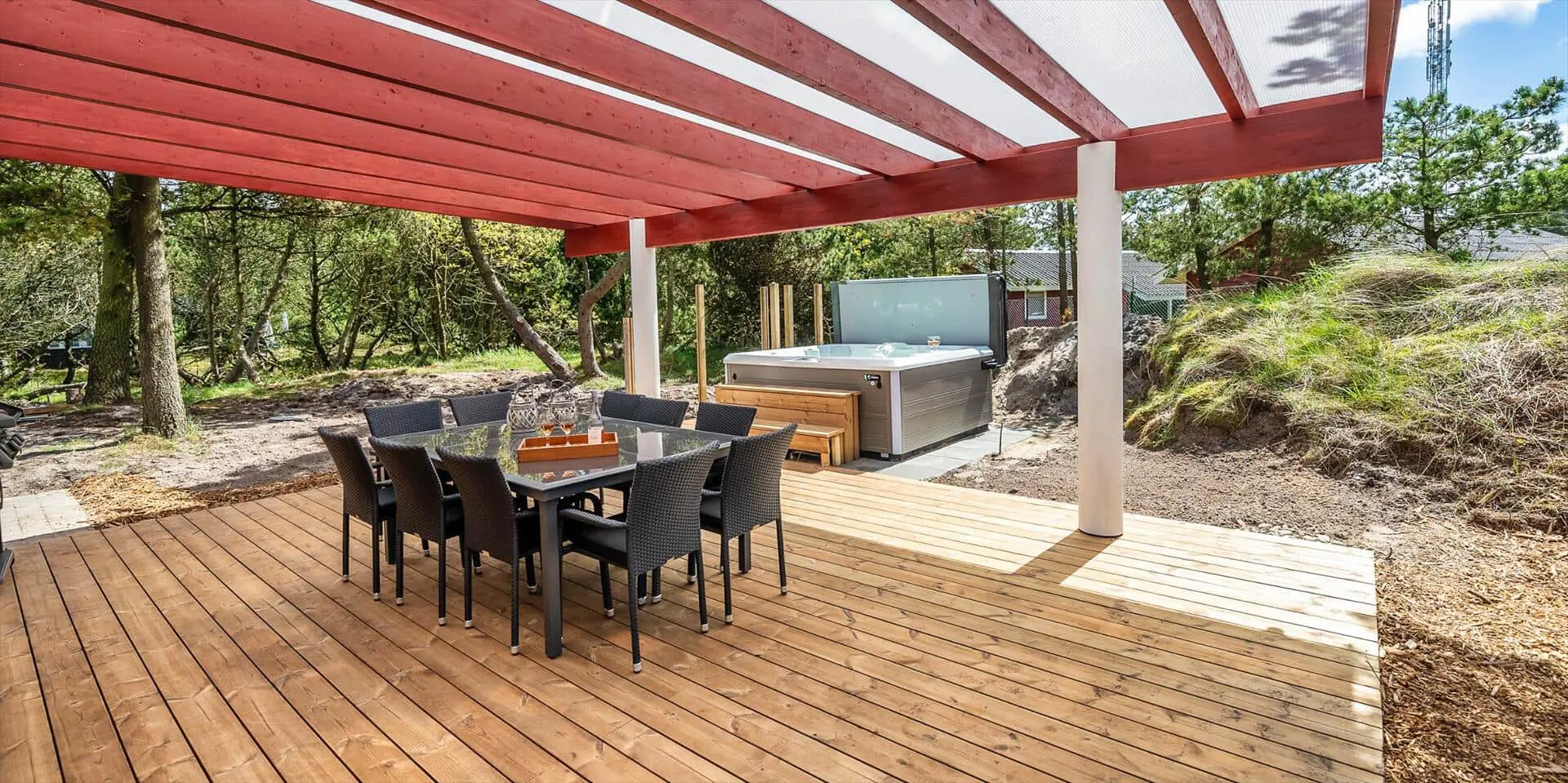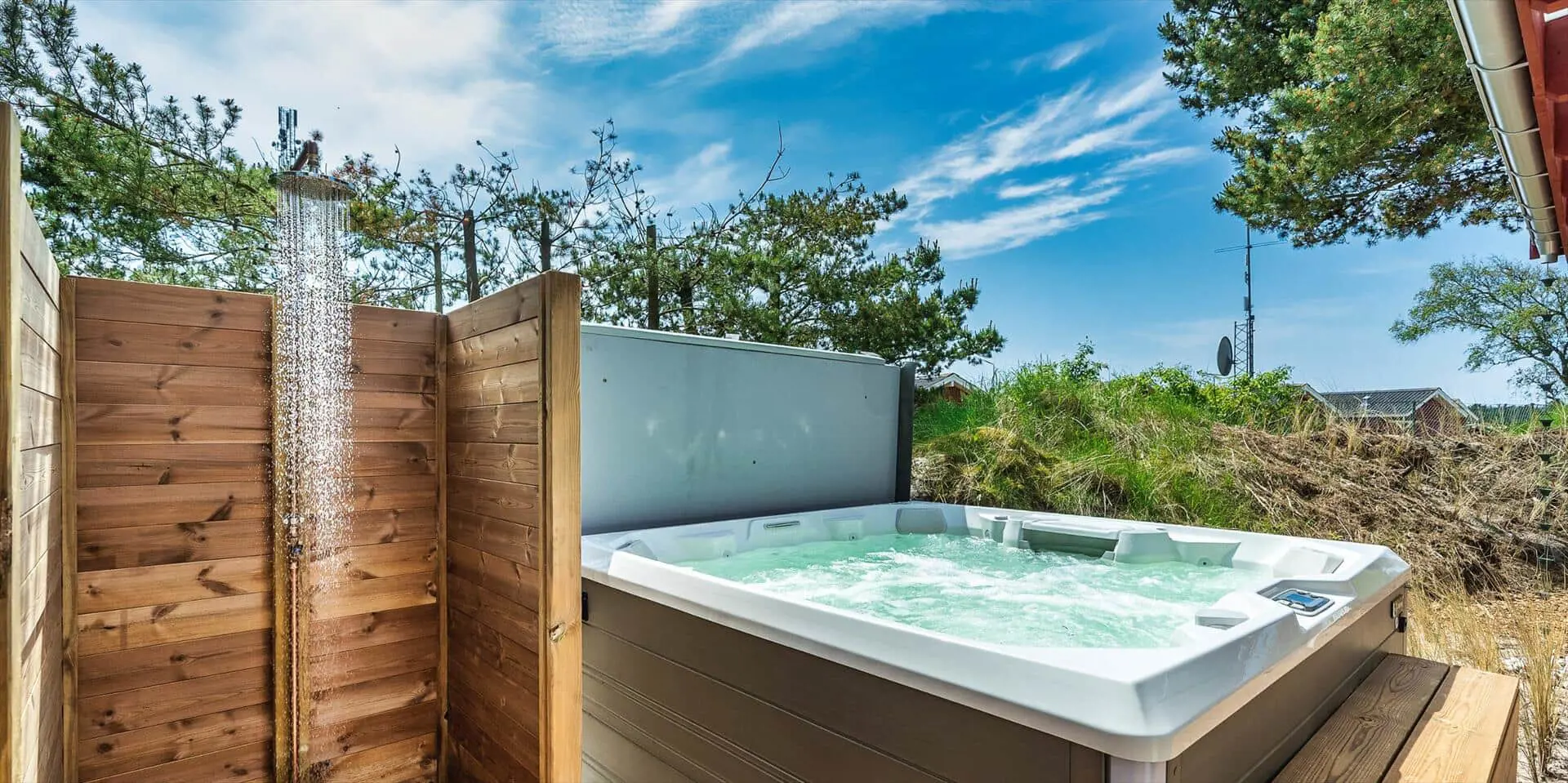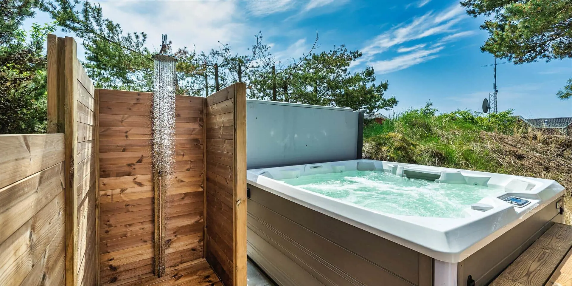 Die Außenbereiche erweitern die sozialen Räume des Hauses: eine große, teilweise überdachte Terrasse mit einer reichen Auswahl an Gartenmöbeln und einem Außen‑Whirlpool lädt zum Verweilen von morgens bis abends ein, während die Außendusche nach einem Strandbesuch für Erfrischung sorgt. Der Garten ist gepflegt und bietet mehrere gemütliche Ecken, Spielgeräte für Kinder und einen charmanten Pavillon, in dem du die Natur bei jedem Wetter genießen kannst — Regen oder Sonne beeinträchtigen die Gemütlichkeit unter dem Pavillondach nicht. Die großzügigen Außenflächen machen es leicht, je nach Wunsch Sonne oder Schatten zu finden, und die Abende lassen sich gut im Loungebereichen oder im Whirlpool unter dem Sternenhimmel verbringen. Hier ist Platz für aktive Tage und ruhige Momente inmitten der Natur.