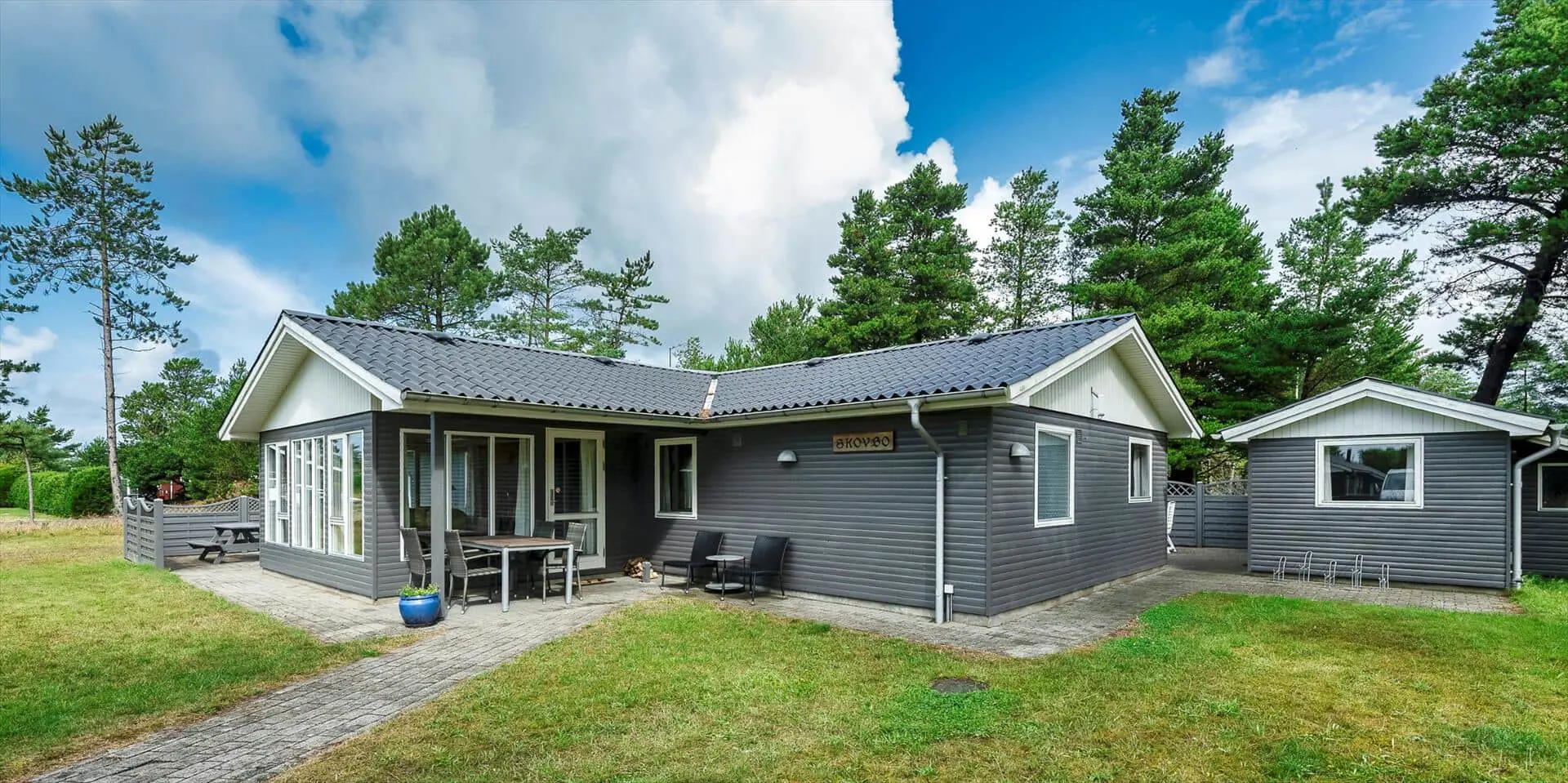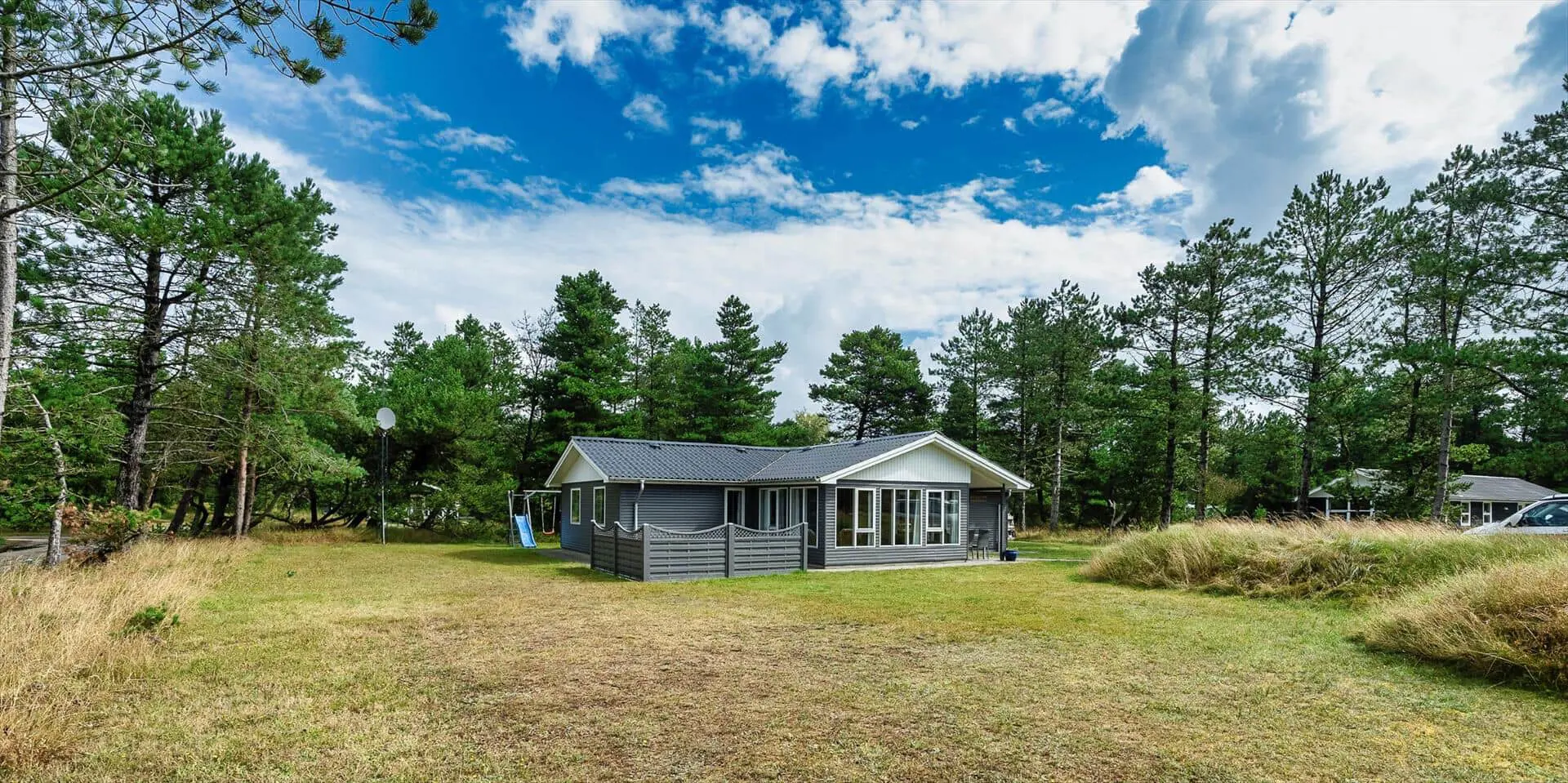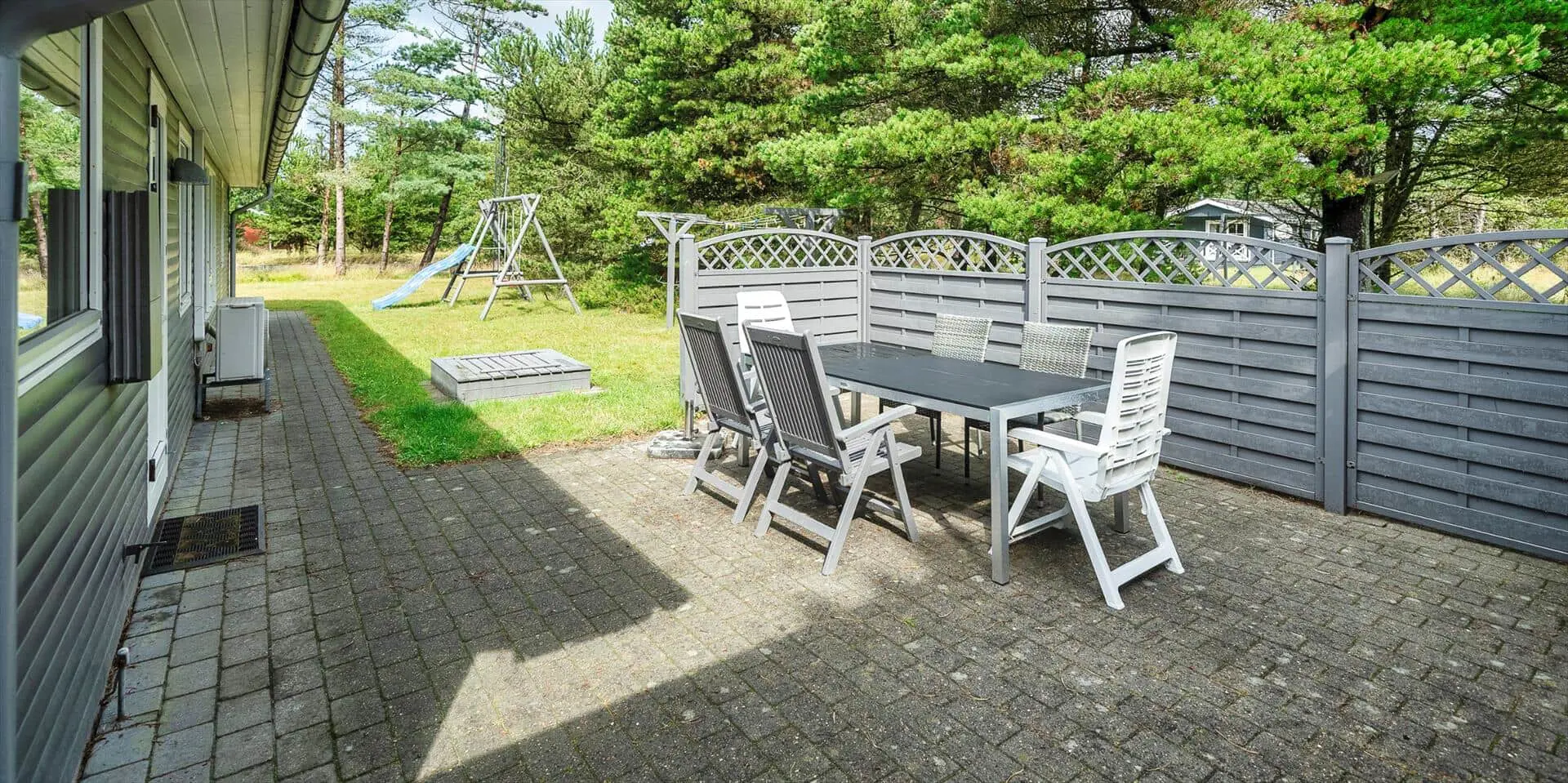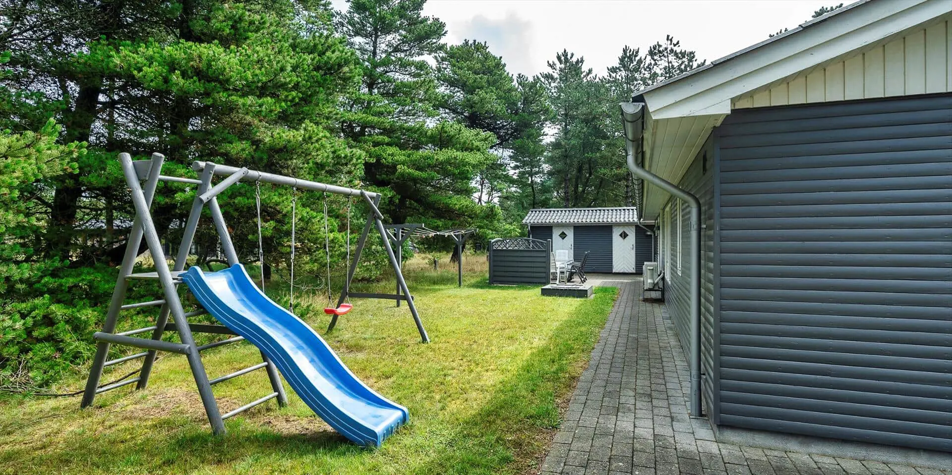 Der gepflegte Garten ist schön und natürlich von Bäumen und anderer Vegetation umgeben, was eine ungestörte und ruhige Atmosphäre rund um das Ferienhaus schafft. Der Garten lädt sowohl zum Entspannen als auch zum Spielen ein, und für die jüngsten Gäste stehen Spielgeräte wie Schaukel und Sandkasten bereit, die schnell zum Mittelpunkt fantasievoller Ferienstunden werden. Ob du dich lieber mit einer Decke zurücklehnst oder aktiv sein möchtest – die Außenbereiche geben dir die Freiheit, deinen Urlaub ganz in deinem eigenen Tempo zu gestalten.