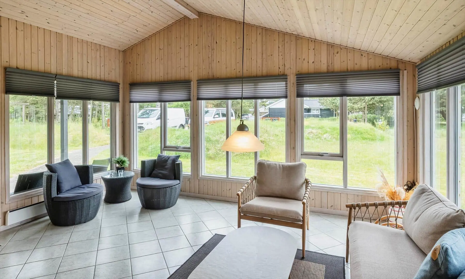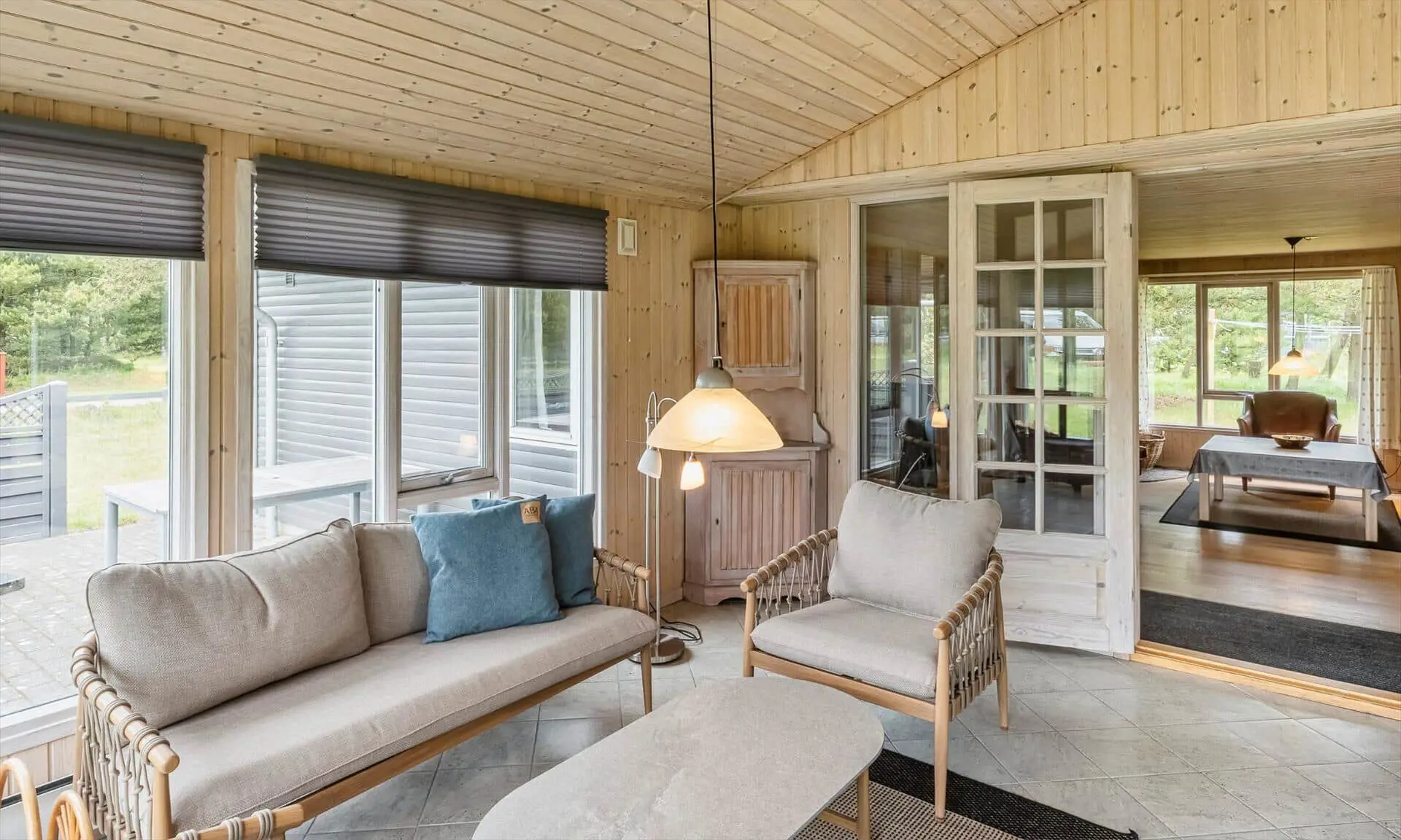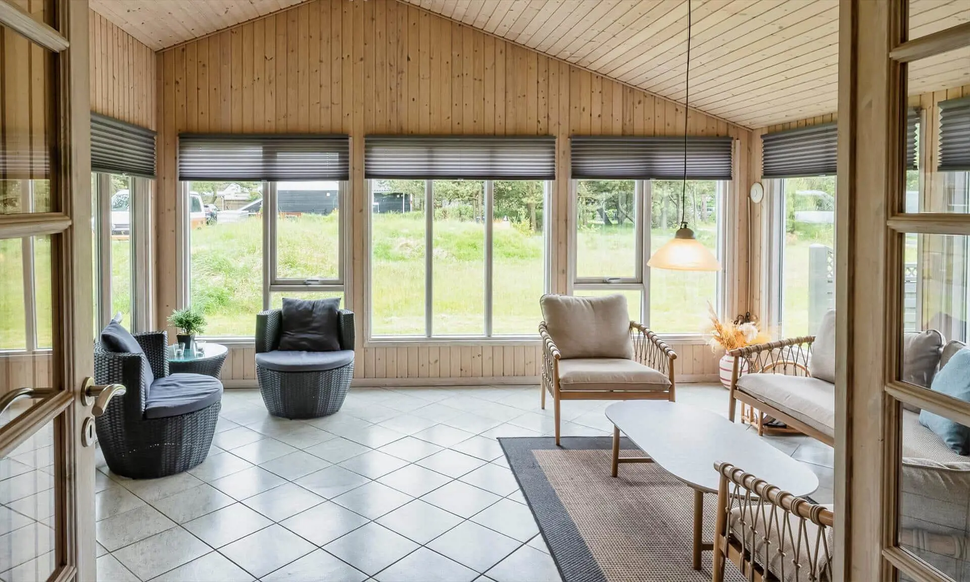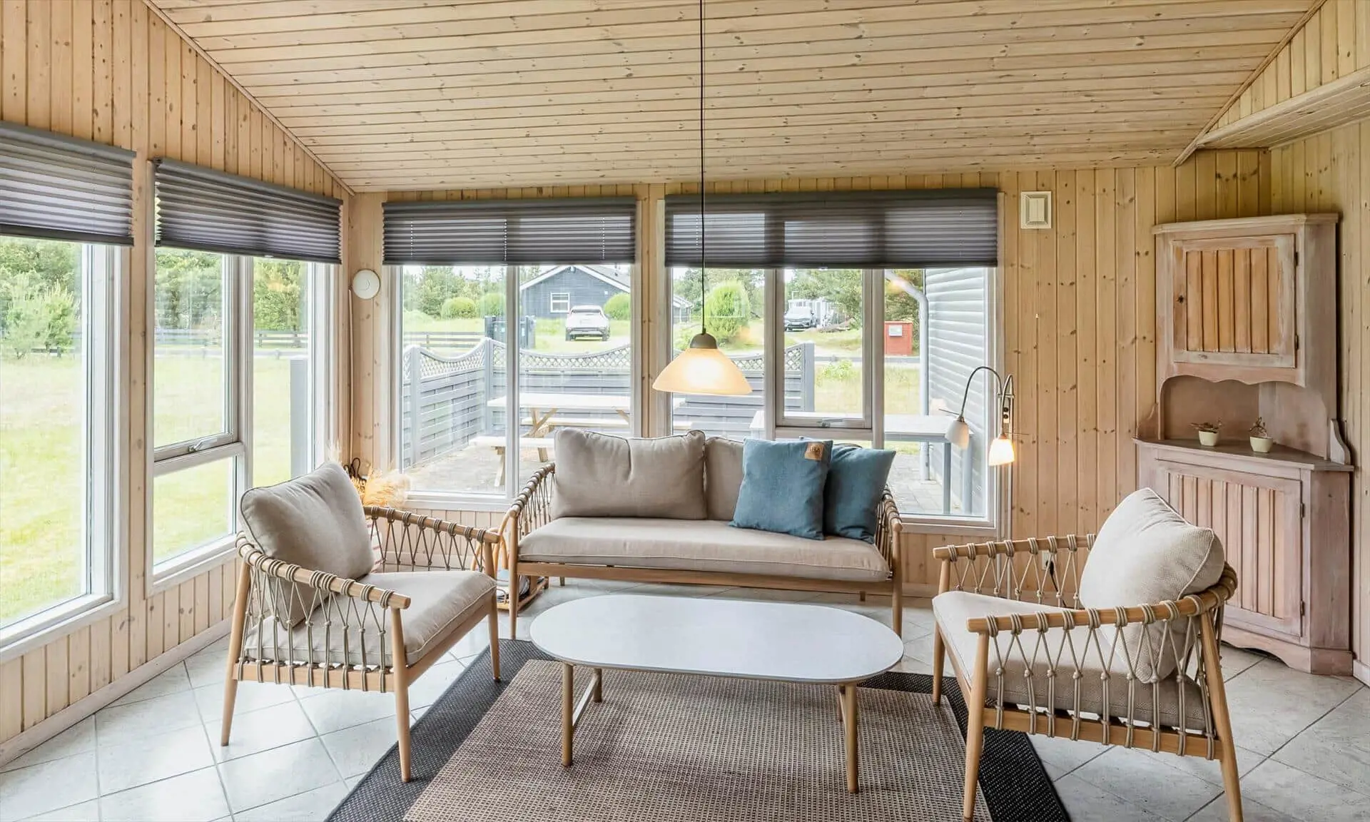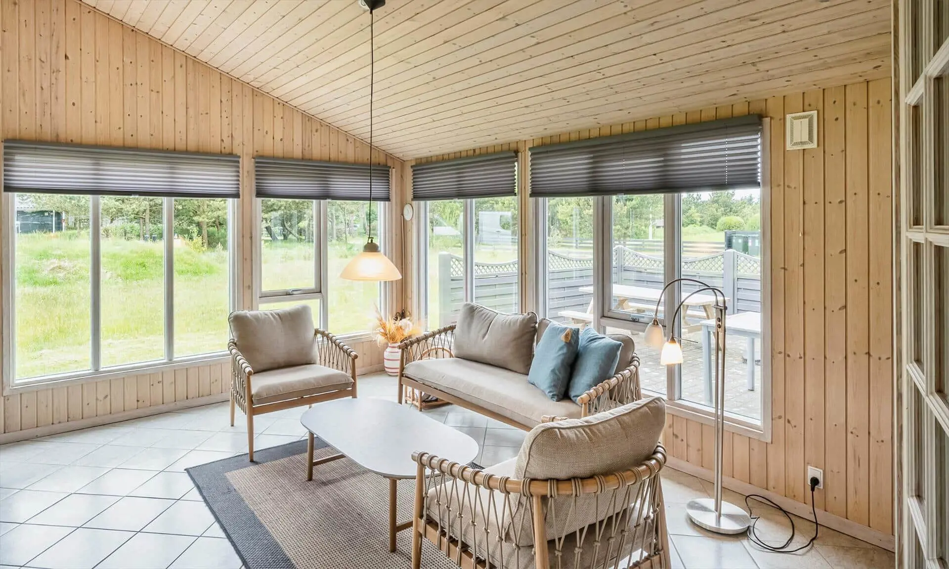 Schon beim Betreten des Ferienhauses spürst du die leichte und einladende Atmosphäre, die die Räume prägt. Die Einrichtung ist hell und freundlich, mit liebevollen Details, die für eine entspannte Ferienhausstimmung sorgen. Das Wohnzimmer bildet den natürlichen Treffpunkt des Hauses, wo du es dir mit einem Buch gemütlich machen, Brettspiele spielen oder einfach die Urlaubsruhe genießen kannst, während das Tageslicht durch die Fenster fällt. Vom Wohnzimmer aus gelangst du in einen wintergartenähnlichen Aufenthaltsraum, dessen Panoramafenster den Blick in den Garten öffnen und dir das Gefühl verleihen, mitten in der Natur zu sitzen – ganz gleich zu welcher Jahreszeit. Darüber hinaus bietet das Ferienhaus mehrere gemütliche Nischen, sodass du leicht deinen eigenen ruhigen Rückzugsort findest, wenn du eine kleine Auszeit brauchst.