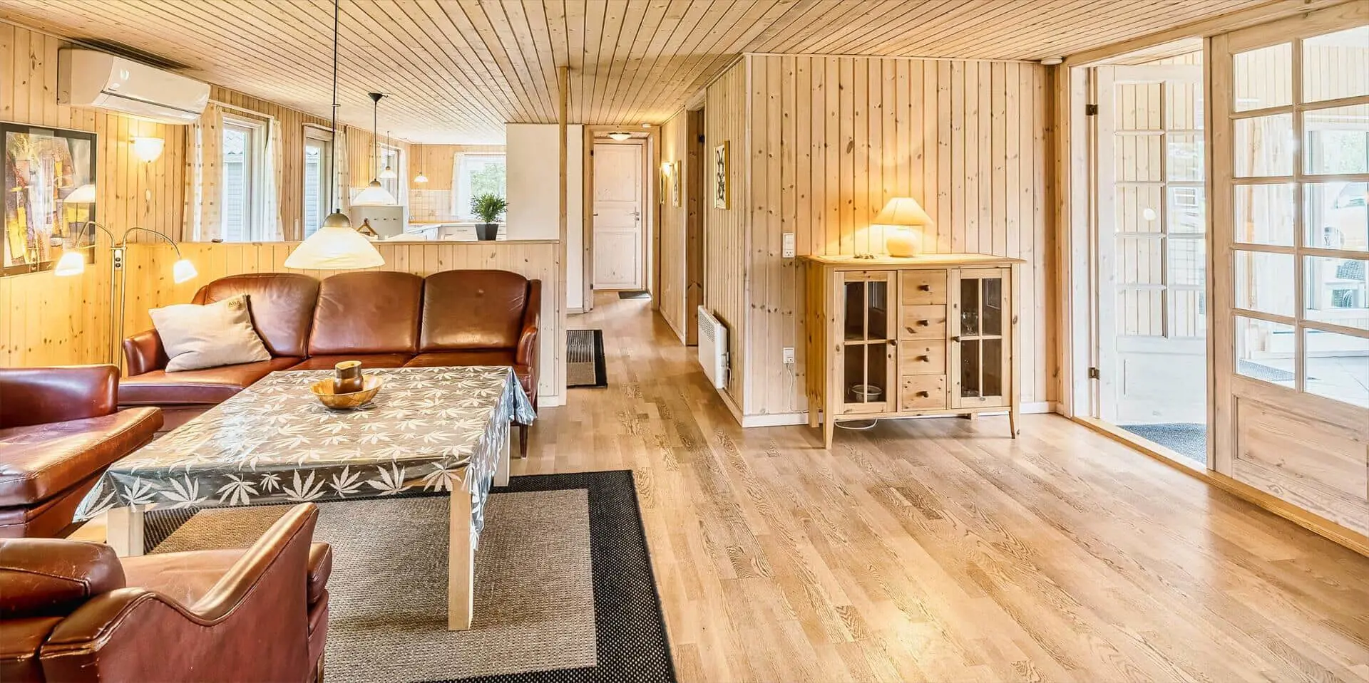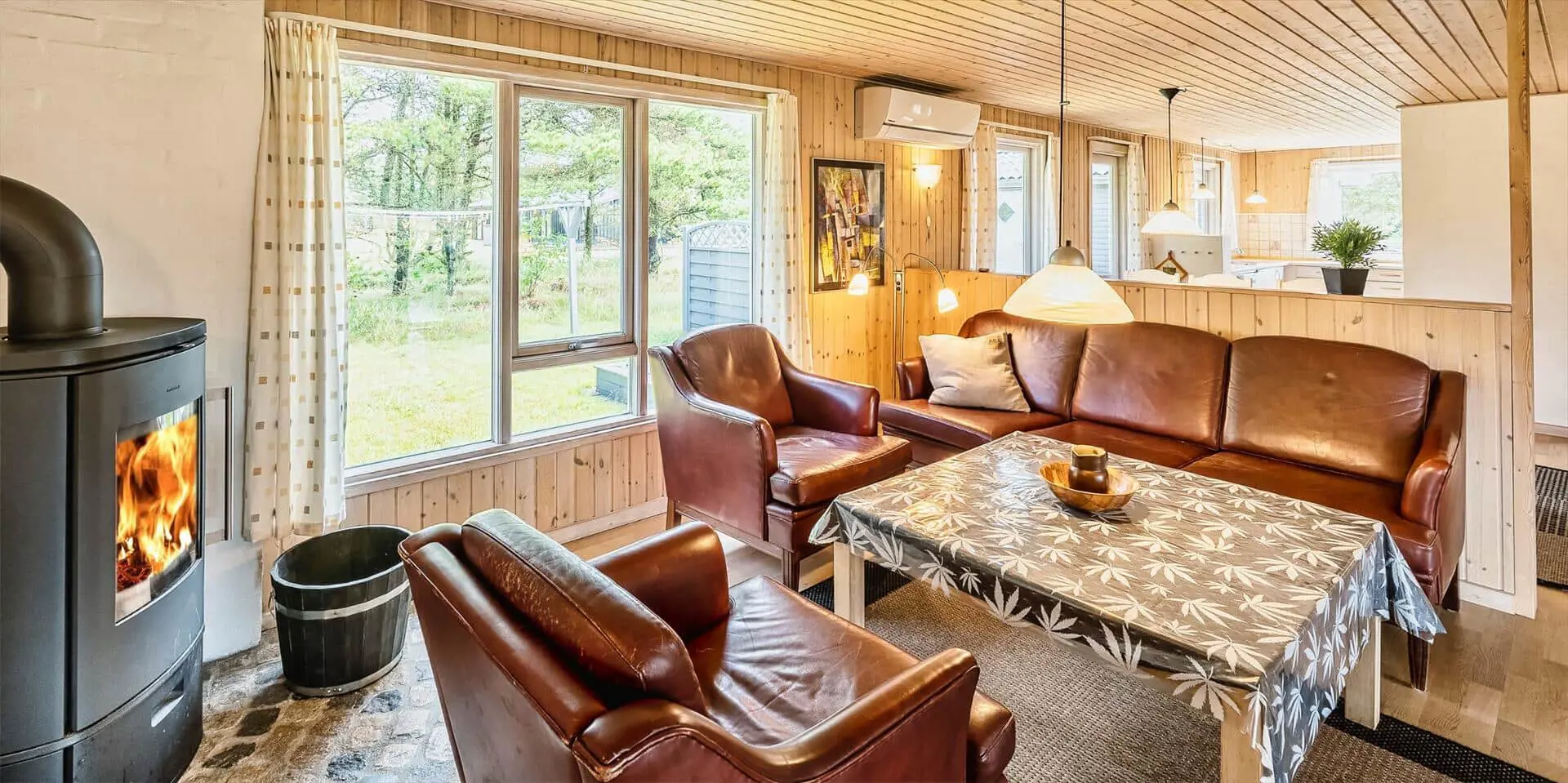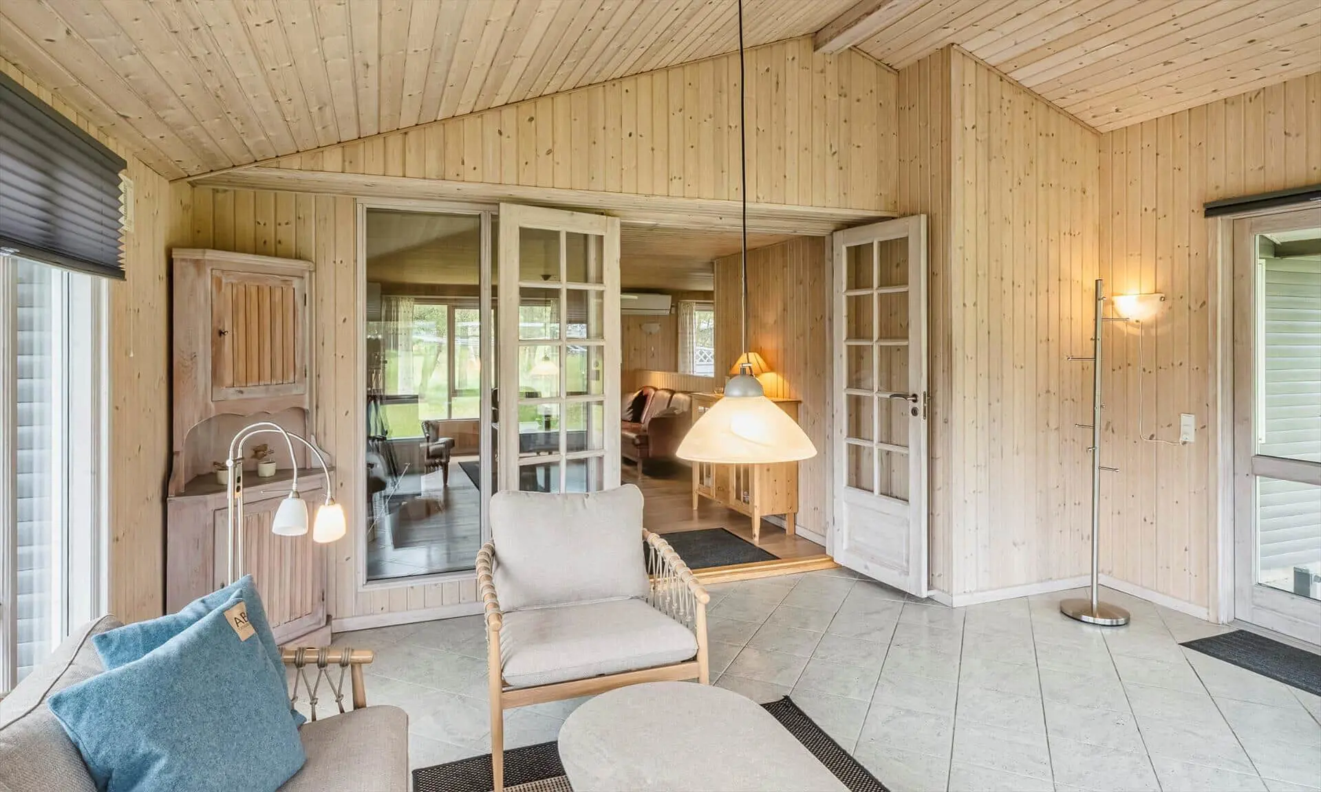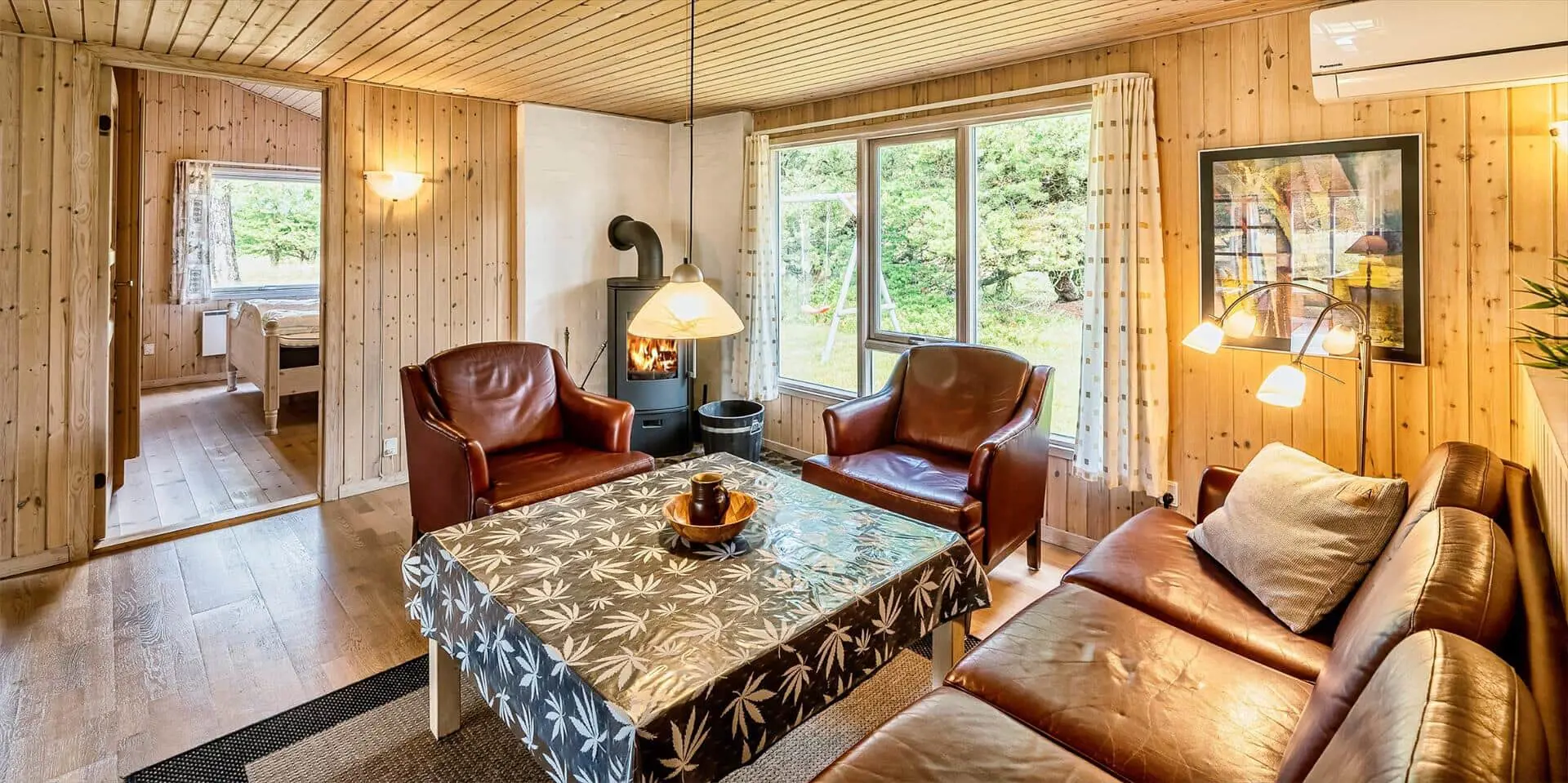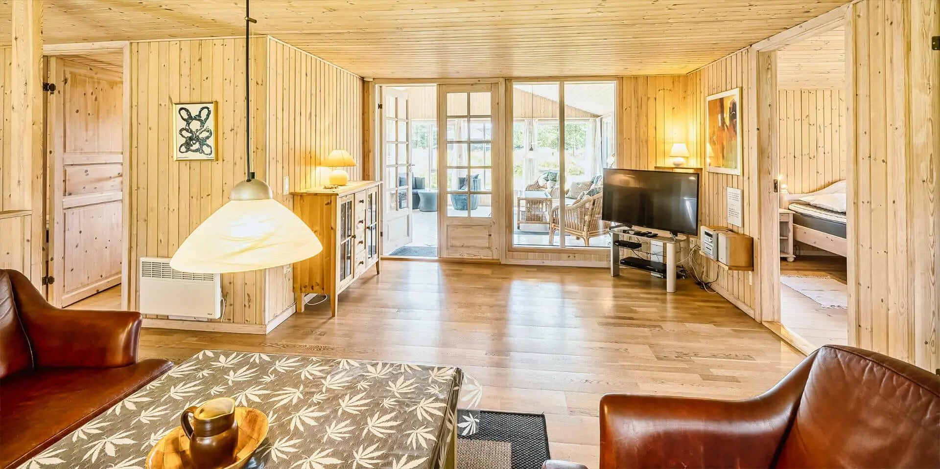 Schon beim Betreten des Ferienhauses spürst du die leichte und einladende Atmosphäre, die die Räume prägt. Die Einrichtung ist hell und freundlich, mit liebevollen Details, die für eine entspannte Ferienhausstimmung sorgen. Das Wohnzimmer bildet den natürlichen Treffpunkt des Hauses, wo du es dir mit einem Buch gemütlich machen, Brettspiele spielen oder einfach die Urlaubsruhe genießen kannst, während das Tageslicht durch die Fenster fällt. Vom Wohnzimmer aus gelangst du in einen wintergartenähnlichen Aufenthaltsraum, dessen Panoramafenster den Blick in den Garten öffnen und dir das Gefühl verleihen, mitten in der Natur zu sitzen – ganz gleich zu welcher Jahreszeit. Darüber hinaus bietet das Ferienhaus mehrere gemütliche Nischen, sodass du leicht deinen eigenen ruhigen Rückzugsort findest, wenn du eine kleine Auszeit brauchst.
