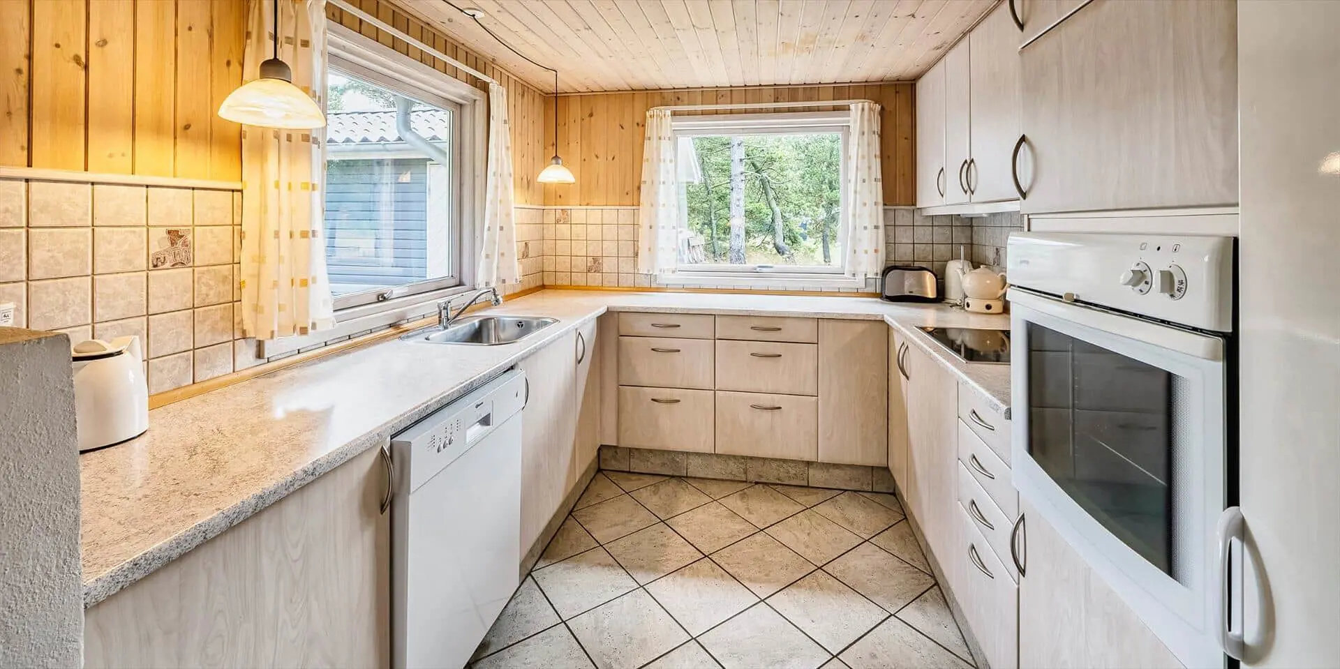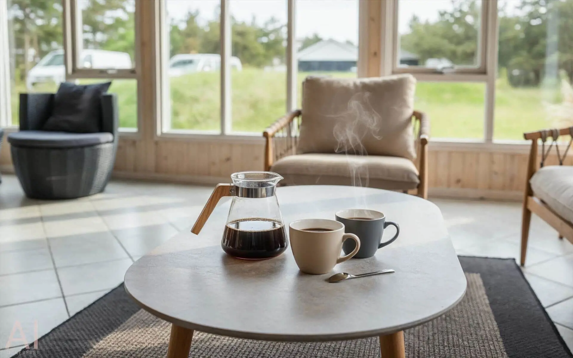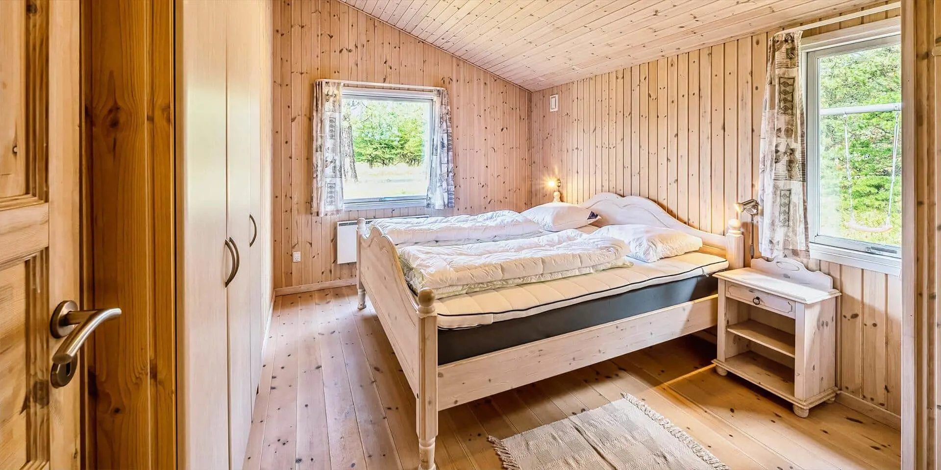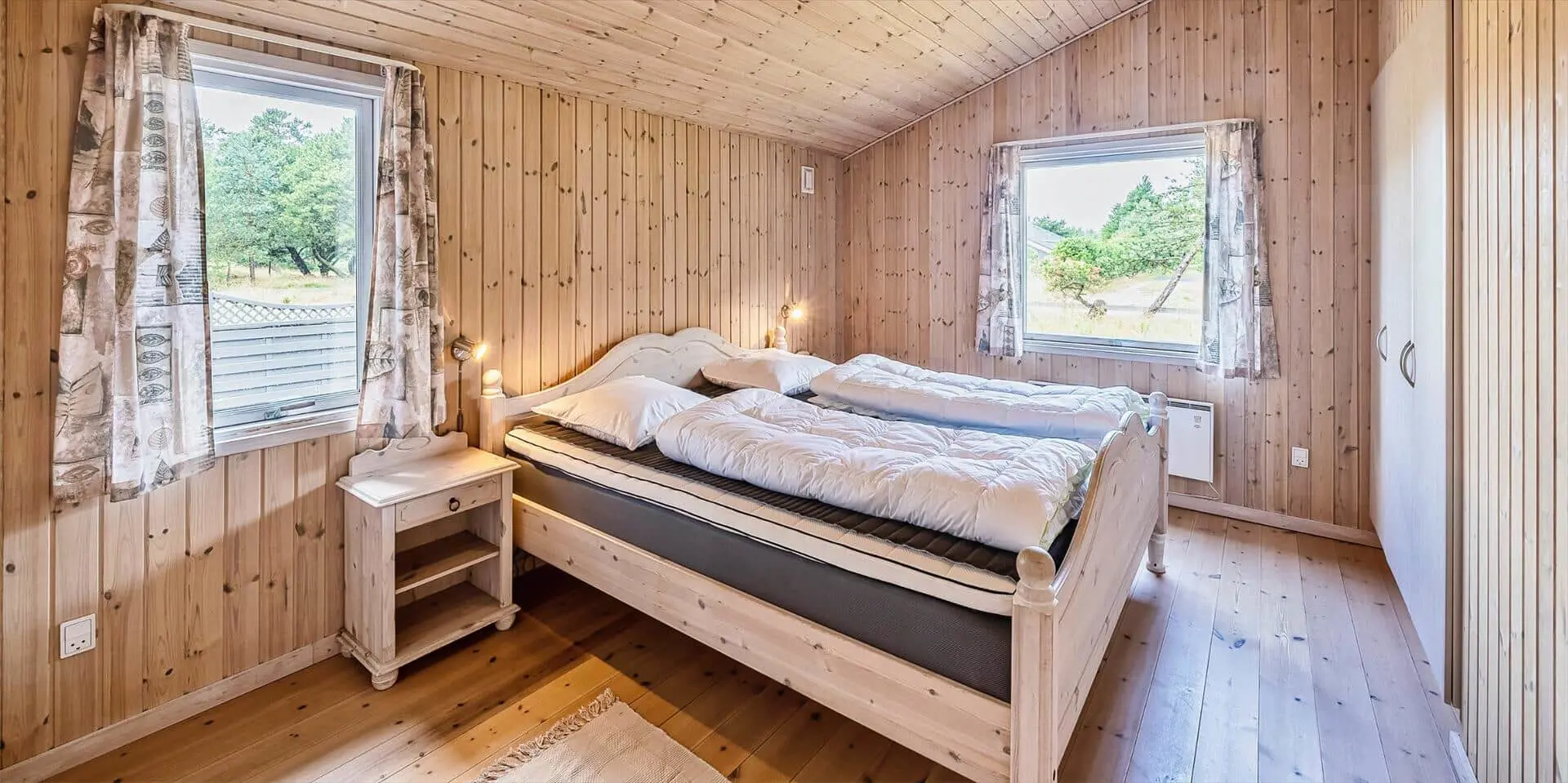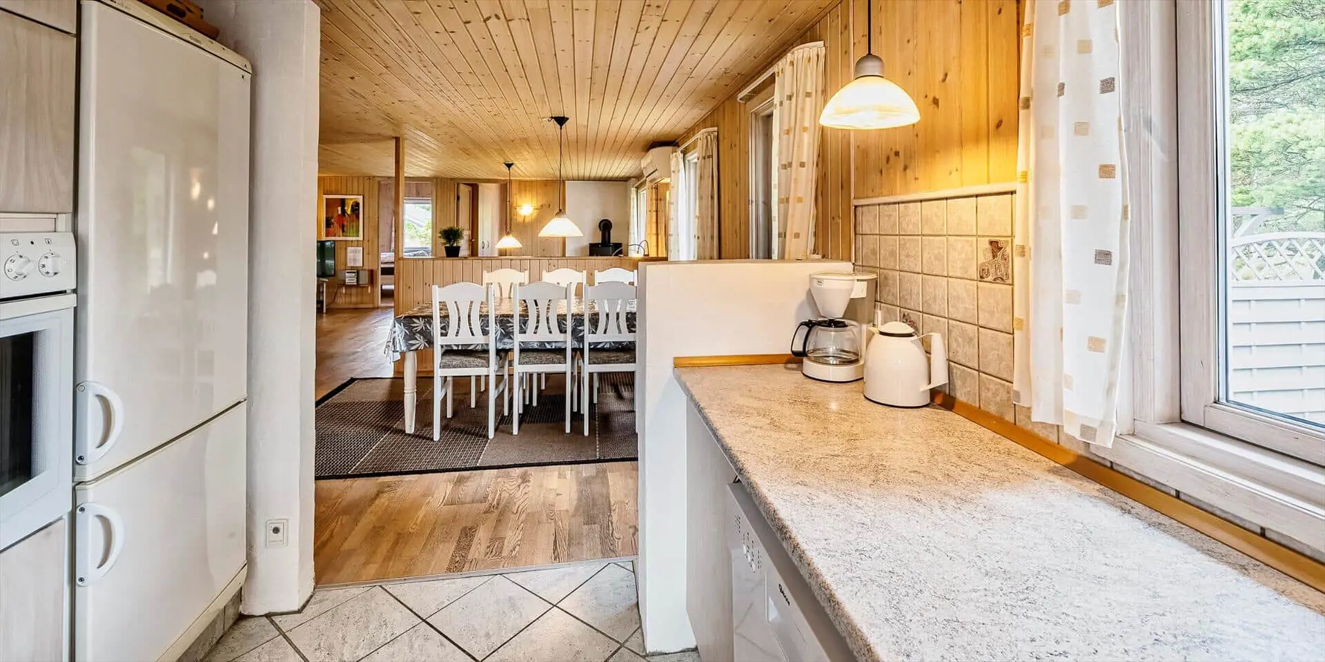 Schon beim Betreten des Ferienhauses spürst du die leichte und einladende Atmosphäre, die die Räume prägt. Die Einrichtung ist hell und freundlich, mit liebevollen Details, die für eine entspannte Ferienhausstimmung sorgen. Das Wohnzimmer bildet den natürlichen Treffpunkt des Hauses, wo du es dir mit einem Buch gemütlich machen, Brettspiele spielen oder einfach die Urlaubsruhe genießen kannst, während das Tageslicht durch die Fenster fällt. Vom Wohnzimmer aus gelangst du in einen wintergartenähnlichen Aufenthaltsraum, dessen Panoramafenster den Blick in den Garten öffnen und dir das Gefühl verleihen, mitten in der Natur zu sitzen – ganz gleich zu welcher Jahreszeit. Darüber hinaus bietet das Ferienhaus mehrere gemütliche Nischen, sodass du leicht deinen eigenen ruhigen Rückzugsort findest, wenn du eine kleine Auszeit brauchst.