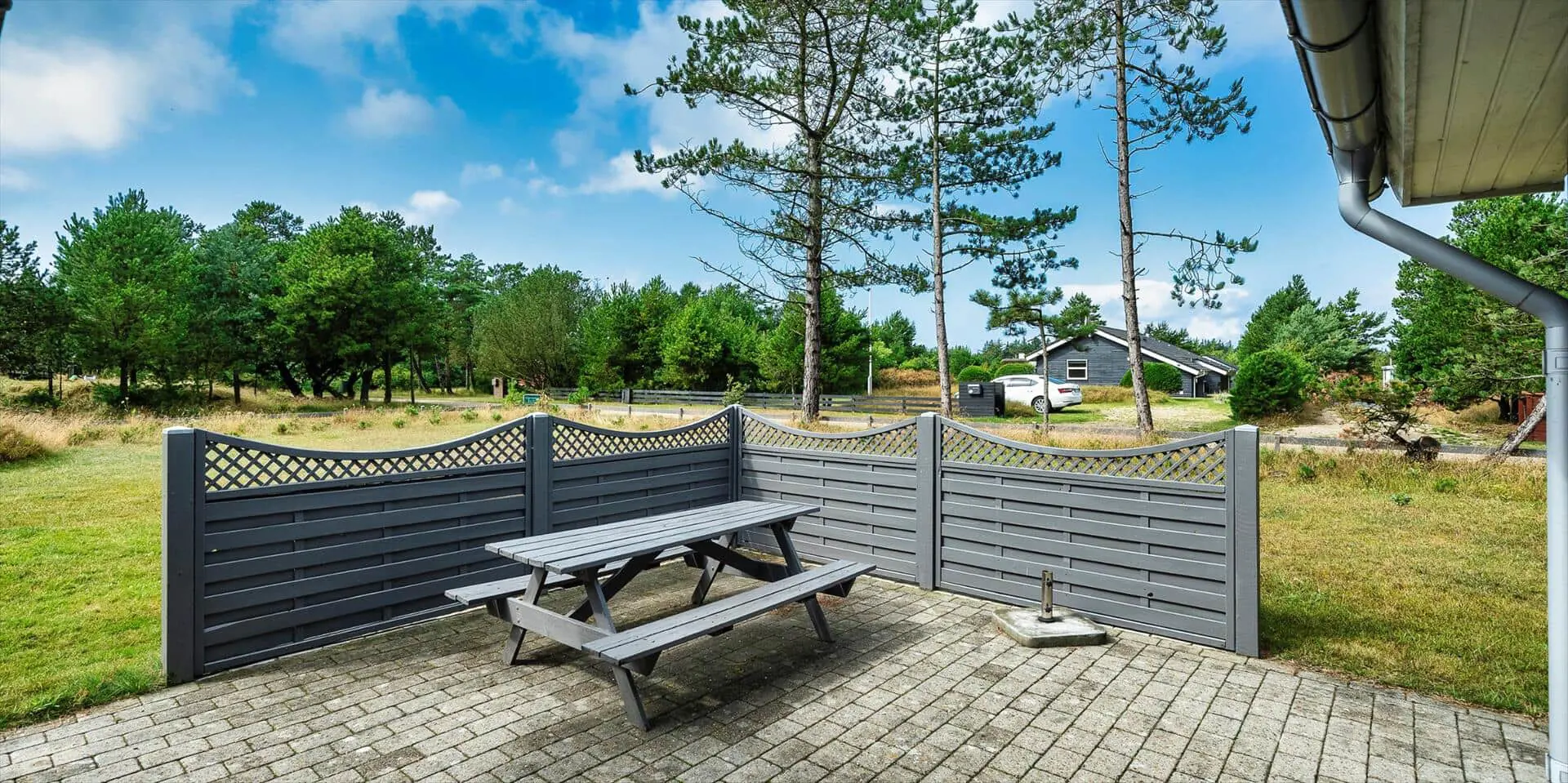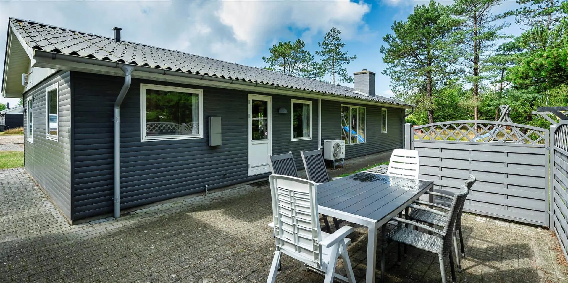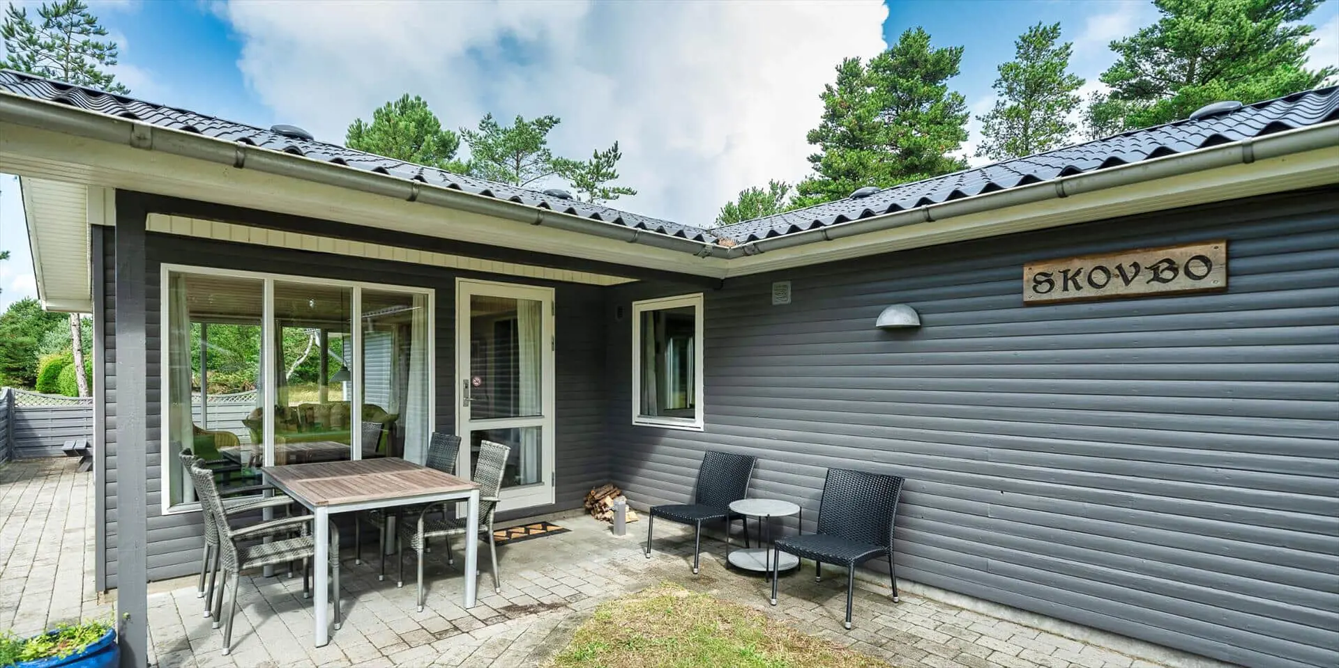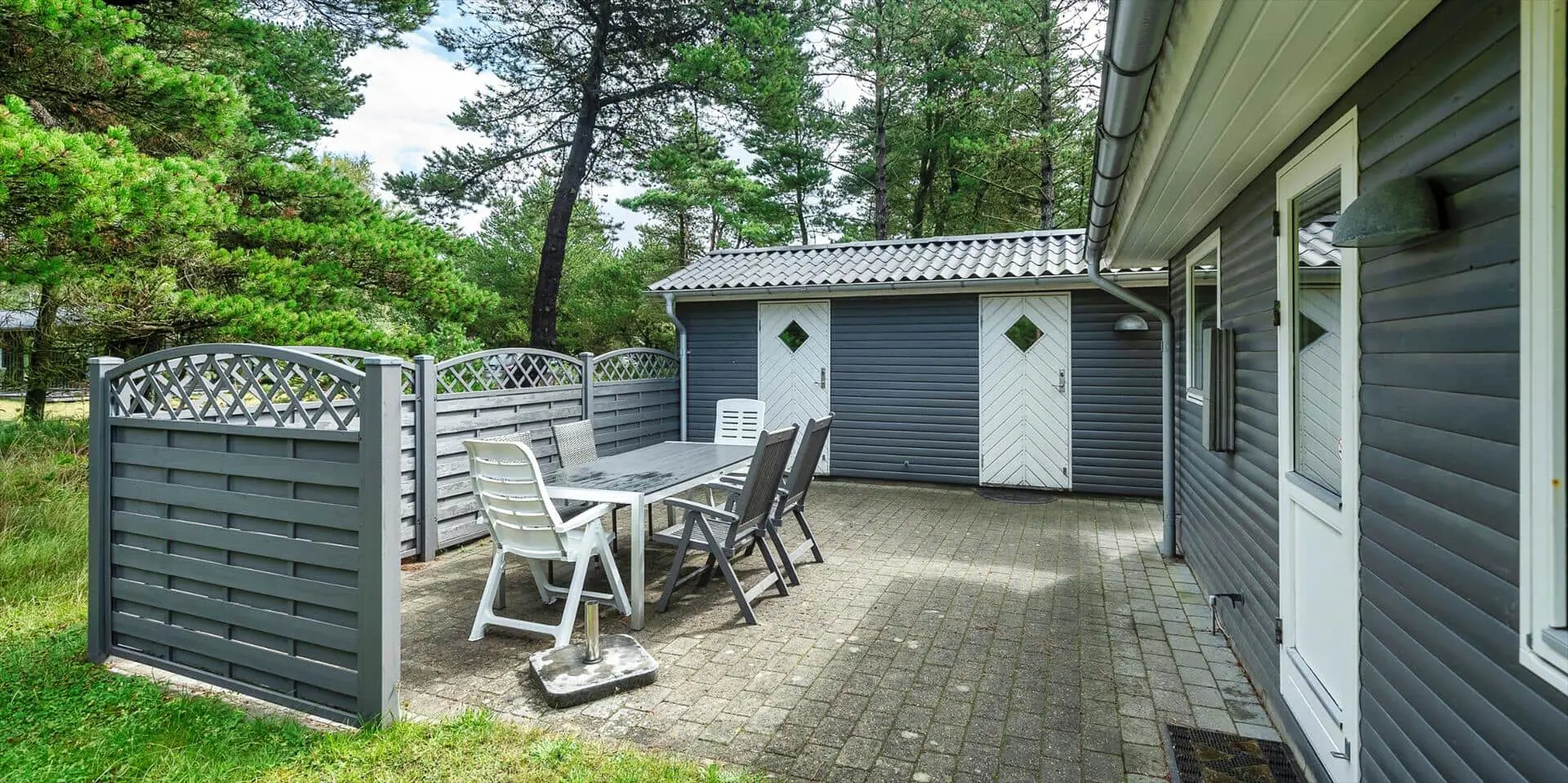 Rund um das Ferienhaus findest du ideale Bedingungen, denn die Terrasse ist mit mehreren Sitzbereichen gestaltet, sodass du je nach Wetter und Stimmung immer einen passenden Platz in der Sonne, im Windschutz oder unter freiem Himmel findest. Hier können die Urlaubstage entspannt genossen werden – mit Mahlzeiten im Freien, langen Nachmittagen bei einer Tasse Kaffee und ruhigen Abenden, an denen du den Geräuschen des Gartens lauschst.