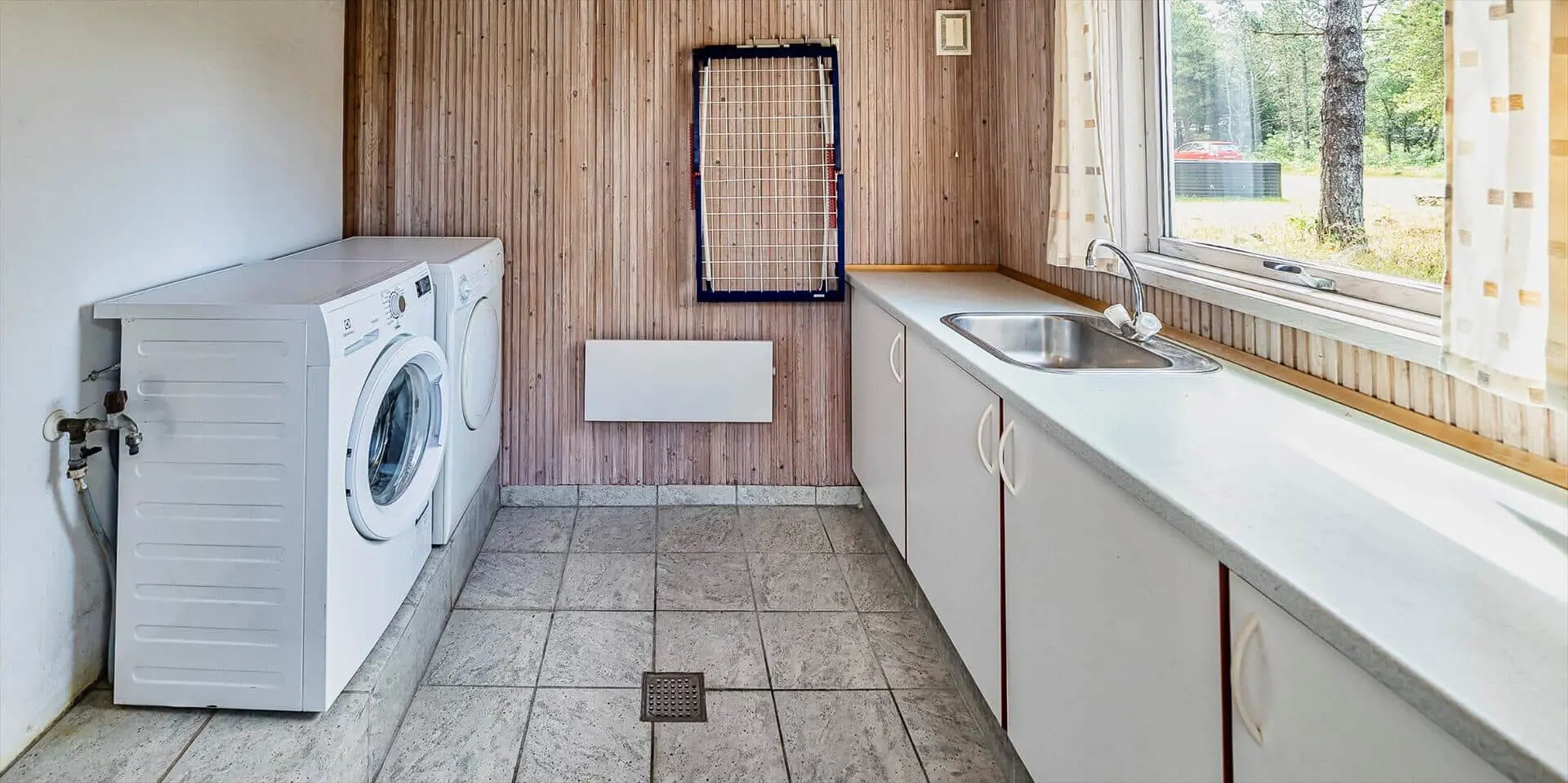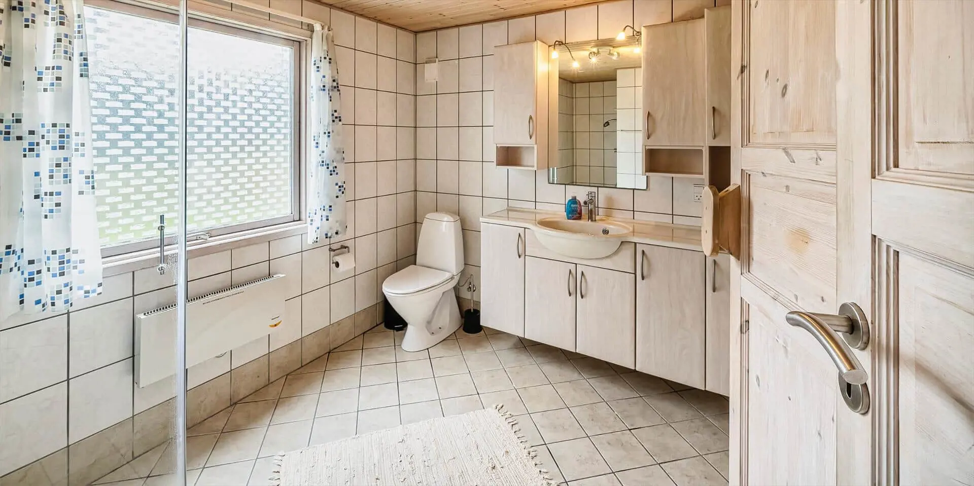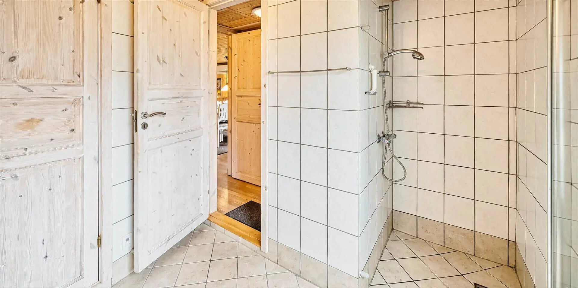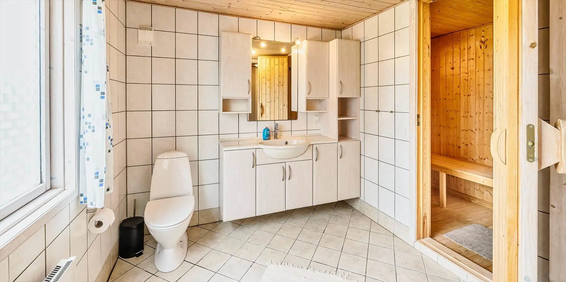 Die Schlafzimmer sind in einem rustikalen und soliden Stil eingerichtet, der das Gefühl von Geborgenheit und Komfort unterstreicht, während das Badezimmer großzügig und einladend wirkt. Von hier hast du direkten Zugang zur hauseigenen Sauna, in der du deinen Körper nach einem langen Tag in der frischen Nordseeluft verwöhnen kannst. Ein praktischer Hauswirtschaftsraum mit viel Stauraum erleichtert es, während des Aufenthalts Ordnung zu halten, und rundet die funktionale und durchdachte Einrichtung des Hauses ab.