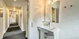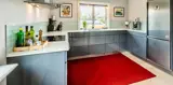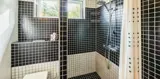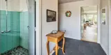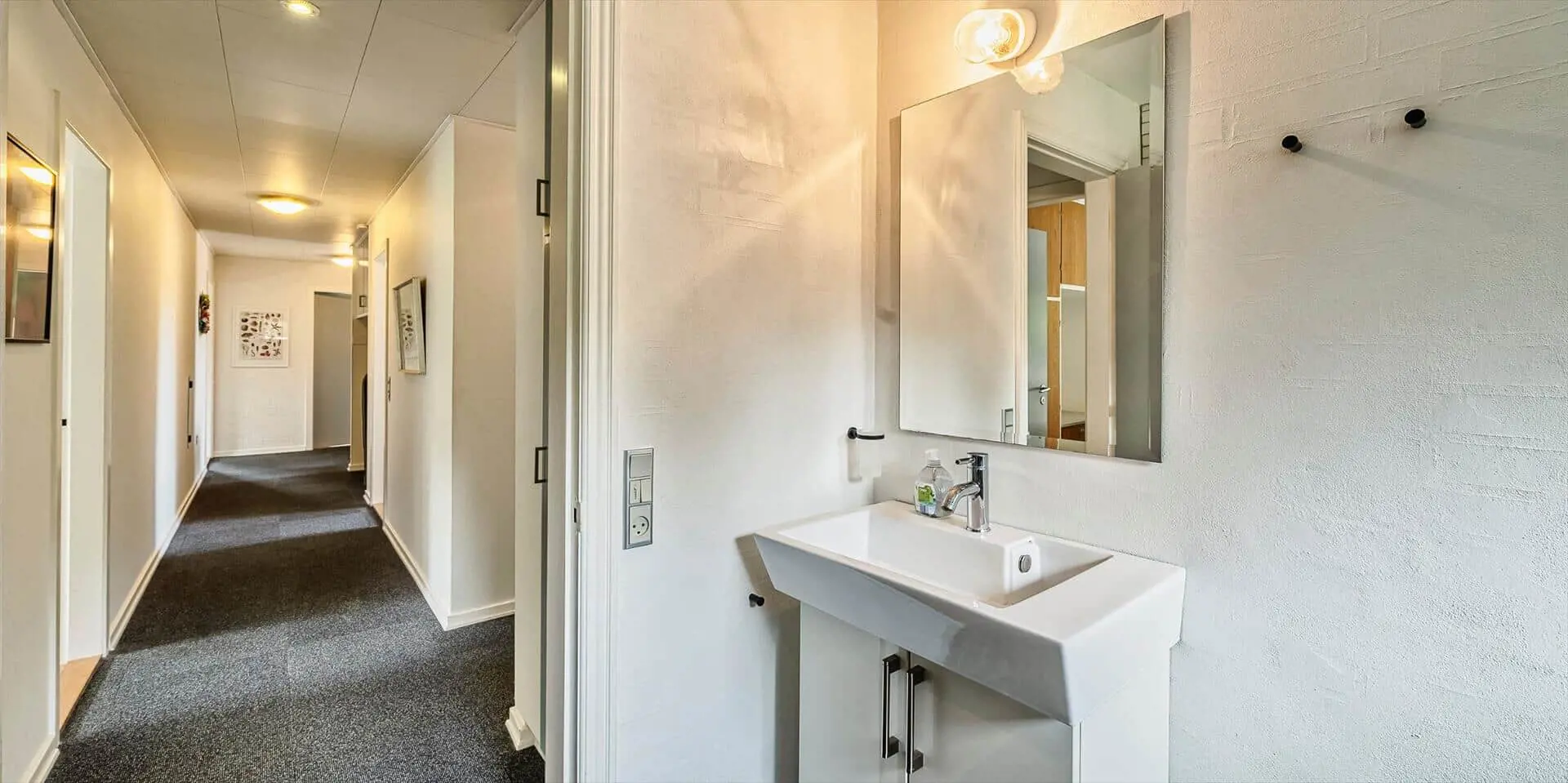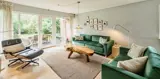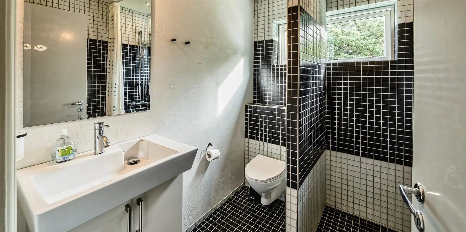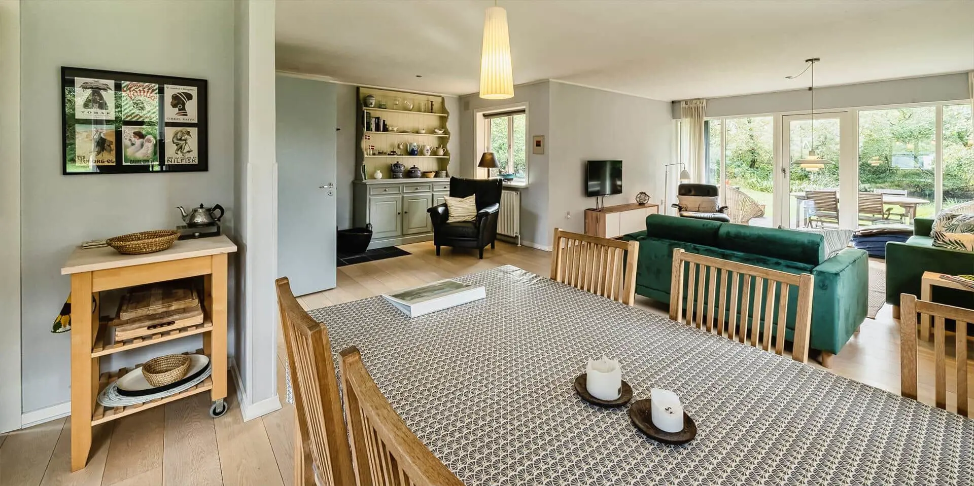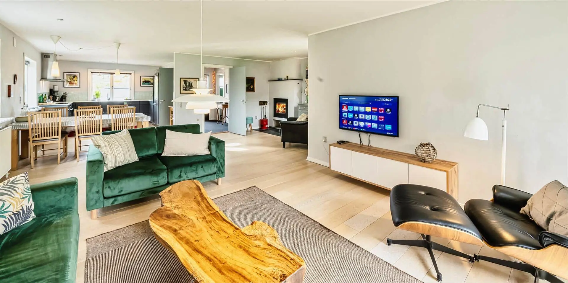 Drinnen findest du ein offenes, helles Wohnzimmer, das mit ausgesuchten Möbeln und einem unkonventionellen Stil eingerichtet ist, in dem Farben und Formen auf interessante und einladende Weise zusammenspielen. Die elegante, offene Küche bietet viel Arbeitsfläche, sodass das Kochen zur gemeinsamen Freude und zum natürlichen Treffpunkt wird. Rund um den Couchtisch stehen zahlreiche bequeme Sitzplätze — ideal zum Kuscheln bei Filmen, für ruhige Gespräche oder Gesellschaftsspiele. Das überraschende Design setzt sich bis in die Bäder fort, wo ein schönes Farbenspiel in den Fliesen jedem Sanitärraum Charakter und einen künstlerischen Akzent verleiht. Materialwahl und Beleuchtung sind mit Liebe zum Detail getroffen, sodass die Ästhetik des Hauses eine angenehme, fast beruhigende Stimmung schafft und jede Ecke durchdacht wirkt.