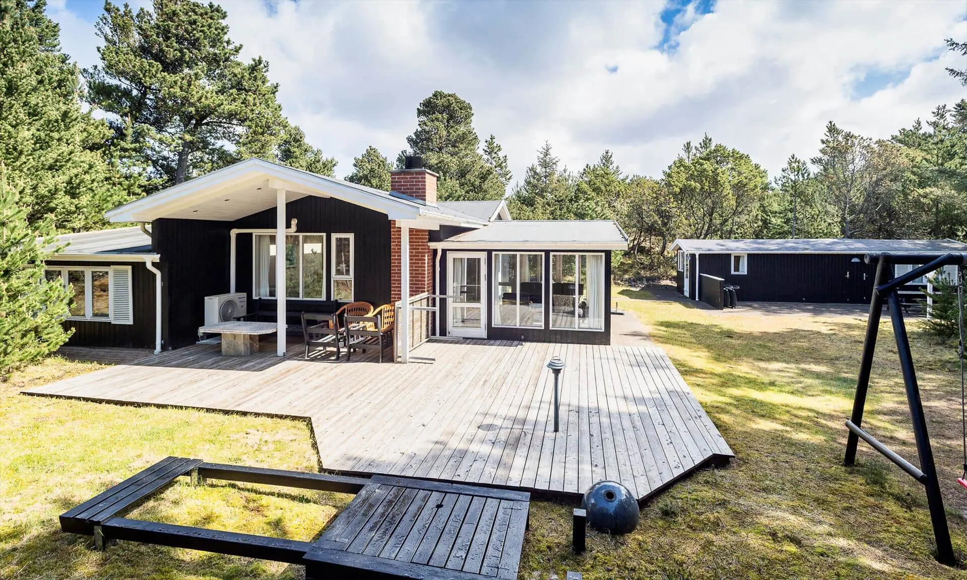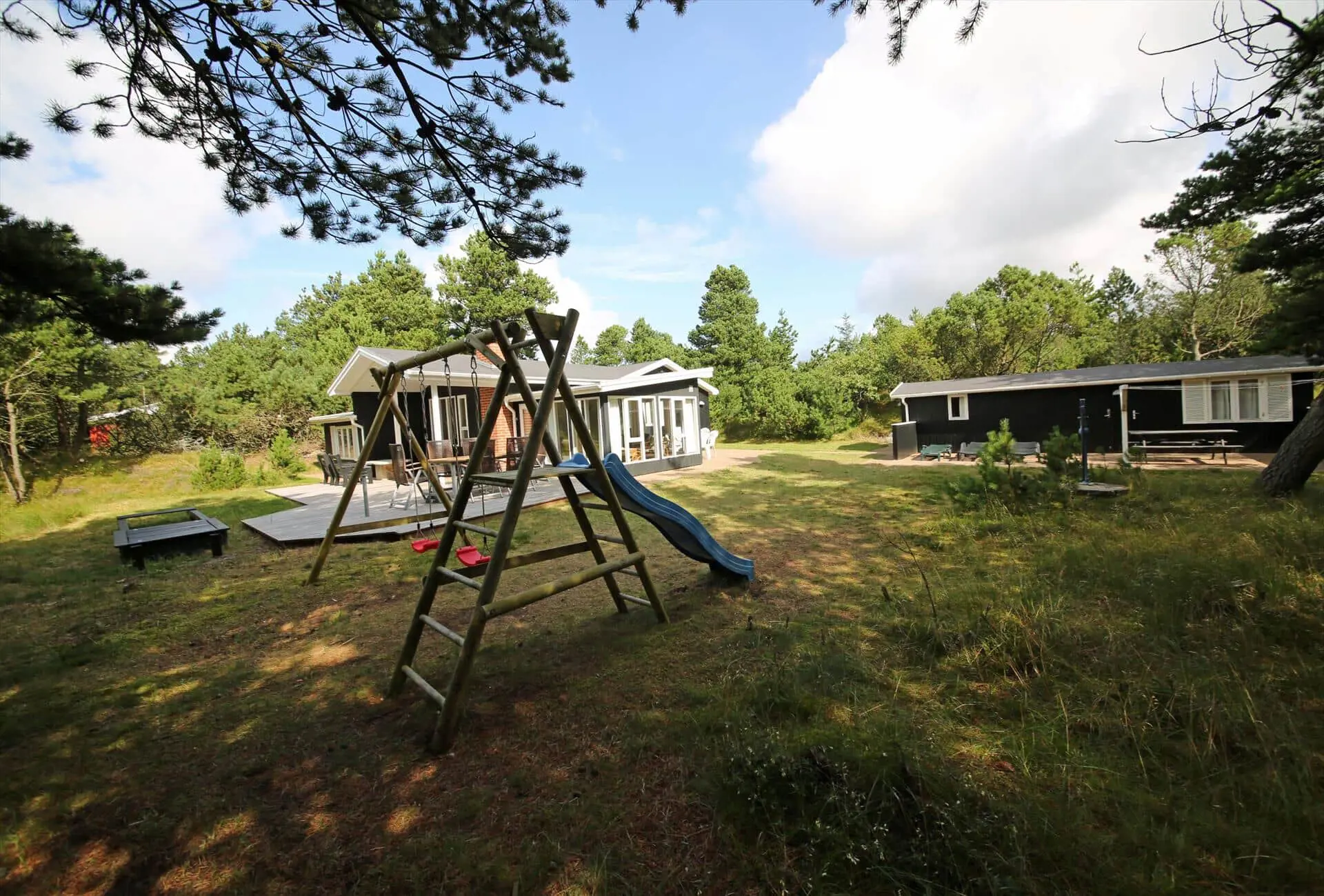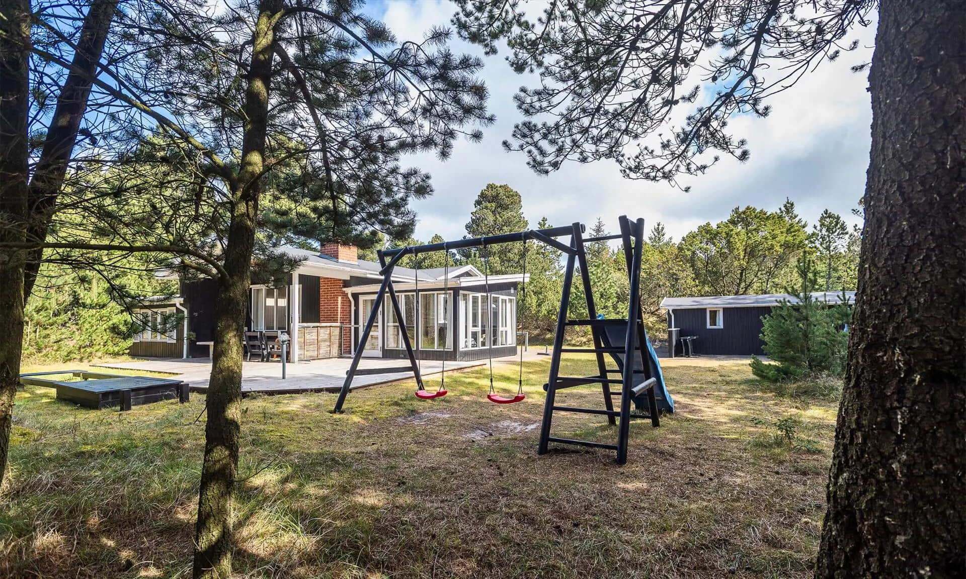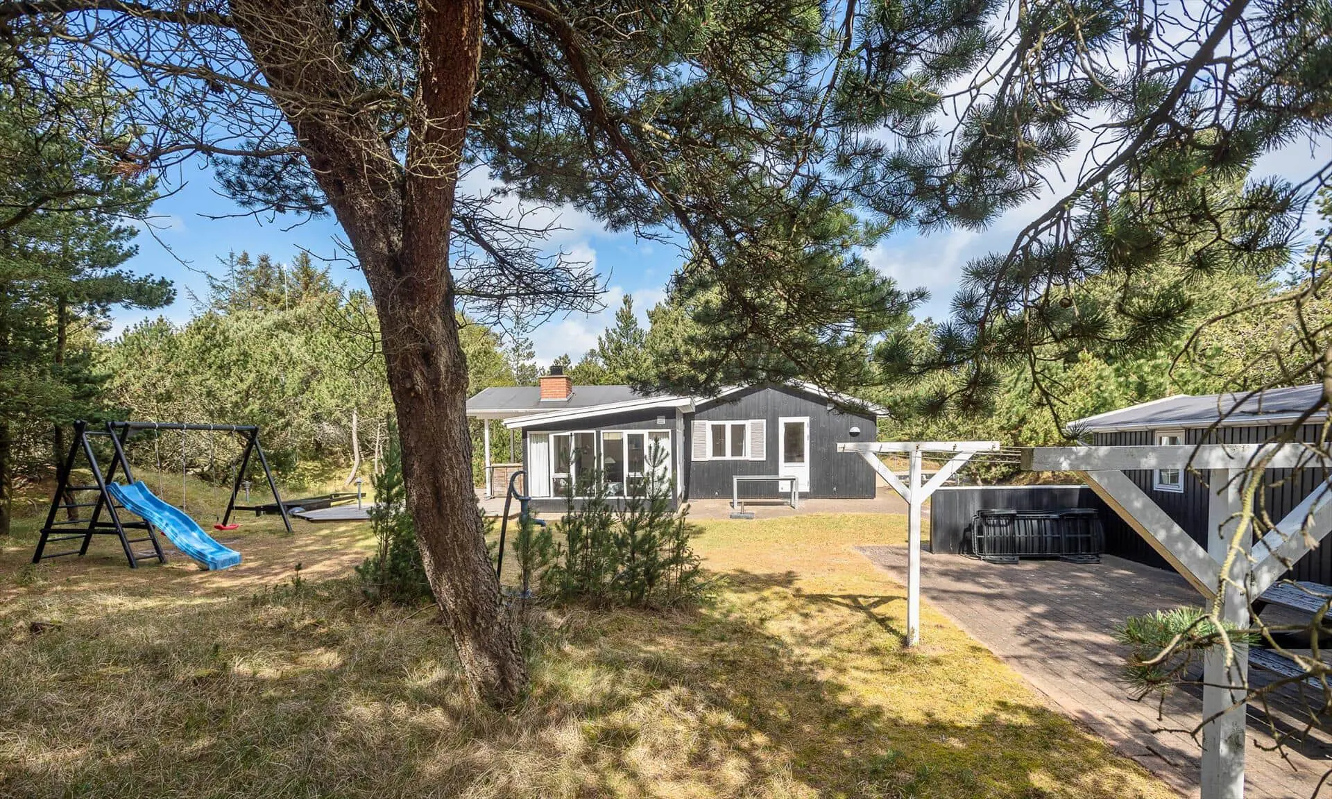Die Außenbereiche rund um Sonnenfunken laden sowohl zu Aktivität als auch zur Entspannung ein. Es gibt sowohl eine geflieste als auch eine Holzterrasse mit Gartenmöbeln, sodass du je nach Stimmung die Wärme der Sonne oder gemütlichen Schatten wählen kannst. Der Wintergarten öffnet sich zum Garten, sodass du die Kinder auf dem Spielbereich im Blick behalten oder einfach die Aussicht auf die grüne Natur genießen kannst, während du deinen Nachmittagskaffee schlürfst. Für die Kleinen gibt es ein schönes Klettergerüst, wo die Stunden im Spiel und Lachen verfliegen, und die Treffpunkte deiner Familie im Freien lassen sich leicht schaffen — von gemütlichen Abenden zusammen bis zu ruhigen Morgen mit dem Klang des Windes in den Bäumen. Der separate Anbau beherbergt einen Hauswirtschaftsraum mit Waschmöglichkeiten und eine Sauna, in die du dich zurückziehen und die Wärme in deinem Körper spüren kannst. Eine zusätzliche Terrasse am Anbau bietet Raum für private Ruhe, Morgenyoga oder Abende unter dem Sternenhimmel nach der Wärme der Sauna.