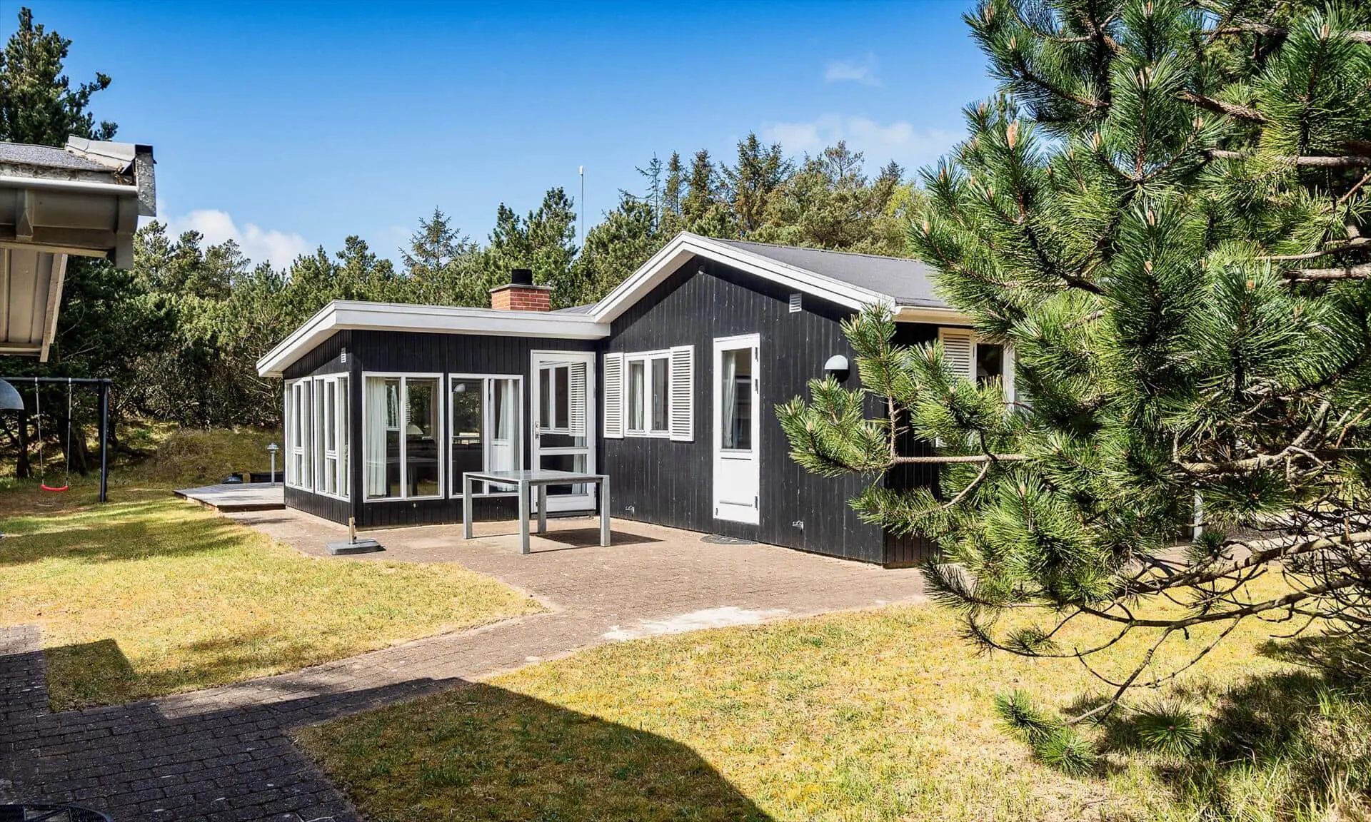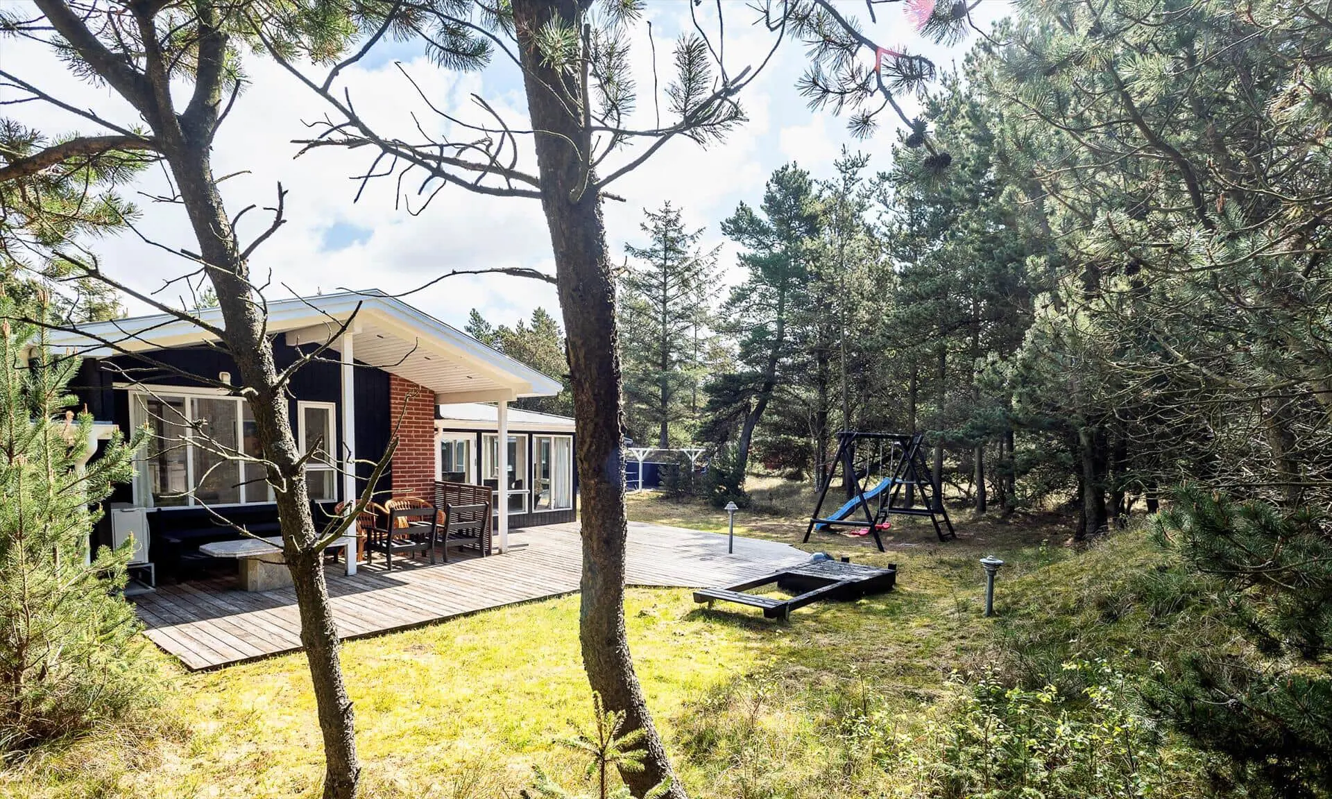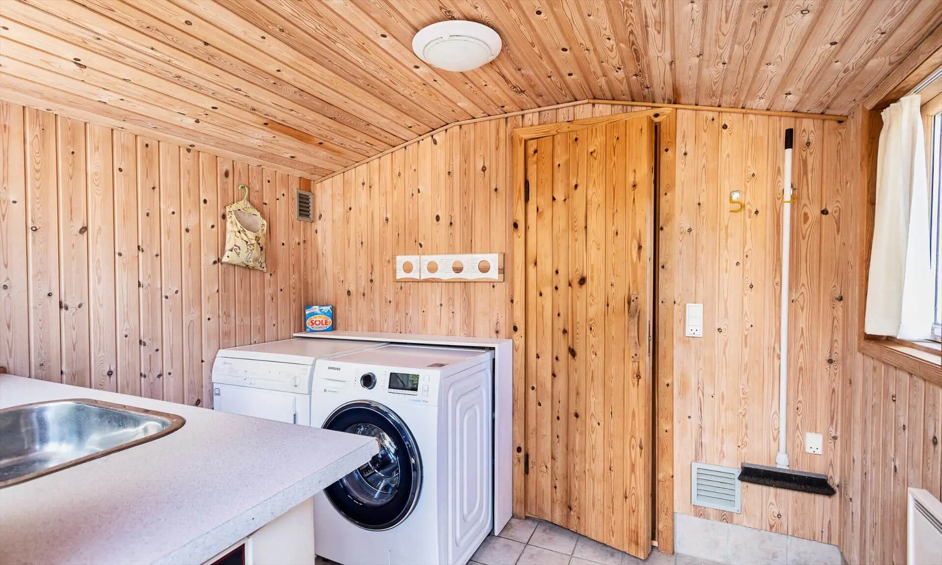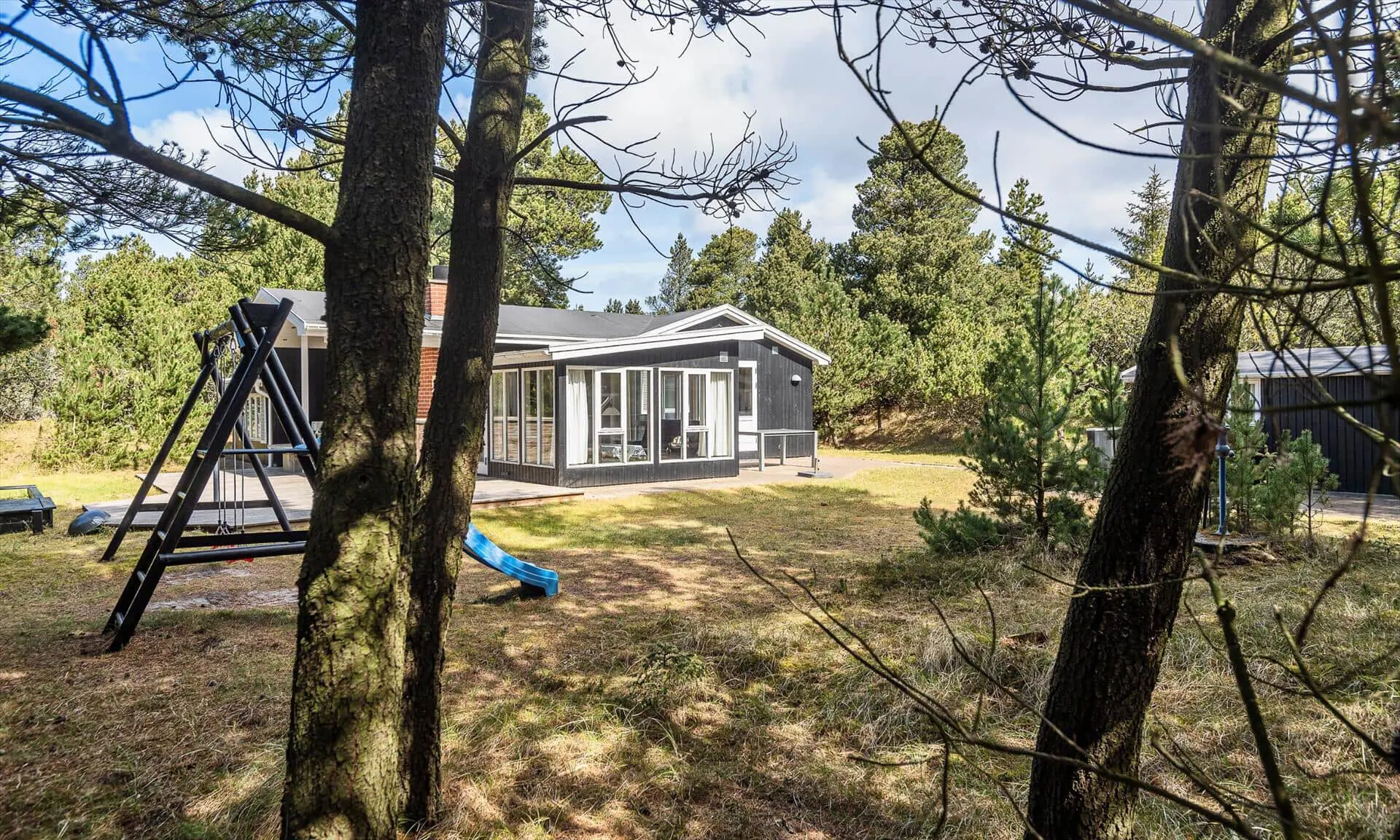 Die Außenbereiche rund um Sonnenfunken laden sowohl zu Aktivität als auch zur Entspannung ein. Es gibt sowohl eine geflieste als auch eine Holzterrasse mit Gartenmöbeln, sodass du je nach Stimmung die Wärme der Sonne oder gemütlichen Schatten wählen kannst. Der Wintergarten öffnet sich zum Garten, sodass du die Kinder auf dem Spielbereich im Blick behalten oder einfach die Aussicht auf die grüne Natur genießen kannst, während du deinen Nachmittagskaffee schlürfst. Für die Kleinen gibt es ein schönes Klettergerüst, wo die Stunden im Spiel und Lachen verfliegen, und die Treffpunkte deiner Familie im Freien lassen sich leicht schaffen — von gemütlichen Abenden zusammen bis zu ruhigen Morgen mit dem Klang des Windes in den Bäumen. Der separate Anbau beherbergt einen Hauswirtschaftsraum mit Waschmöglichkeiten und eine Sauna, in die du dich zurückziehen und die Wärme in deinem Körper spüren kannst. Eine zusätzliche Terrasse am Anbau bietet Raum für private Ruhe, Morgenyoga oder Abende unter dem Sternenhimmel nach der Wärme der Sauna.