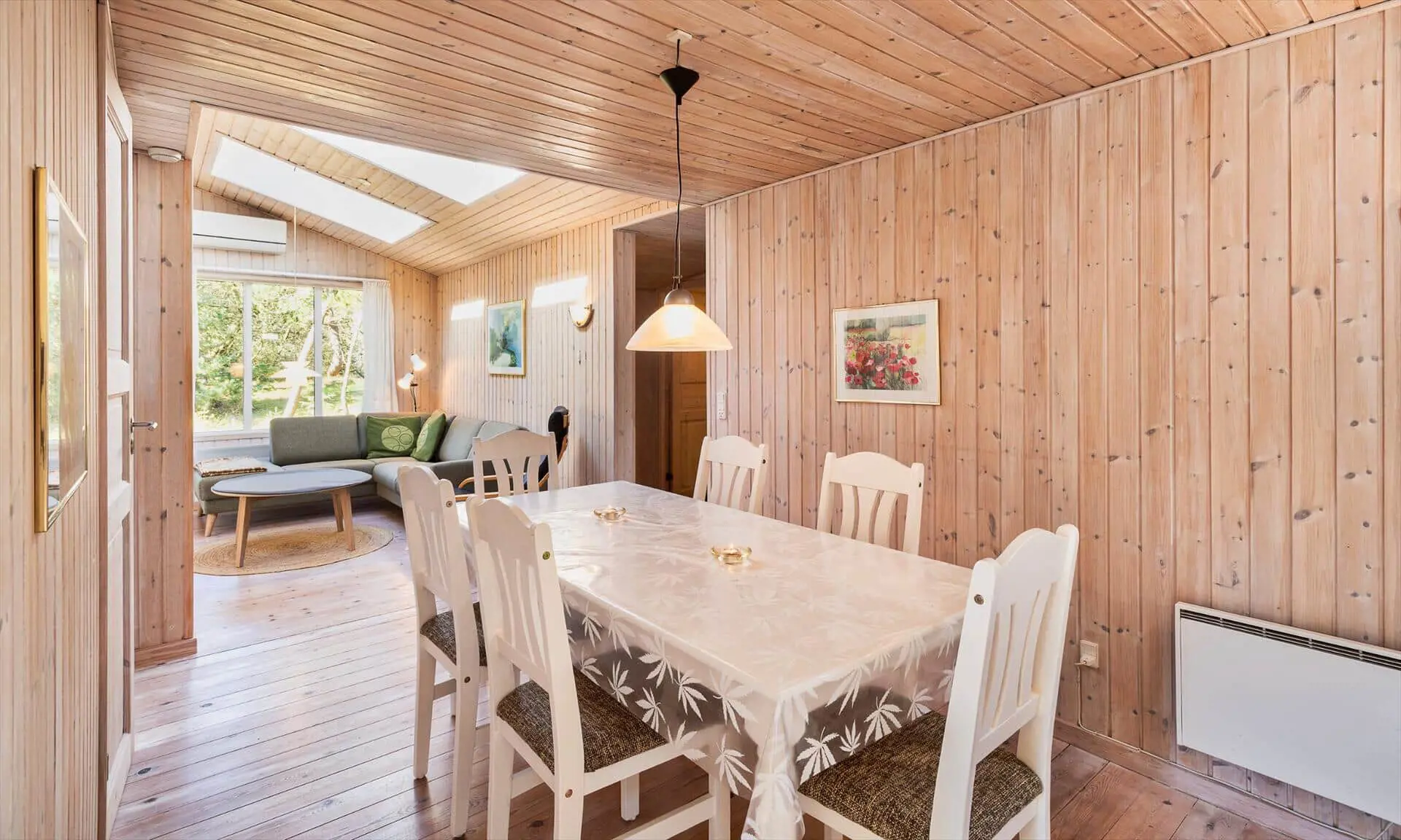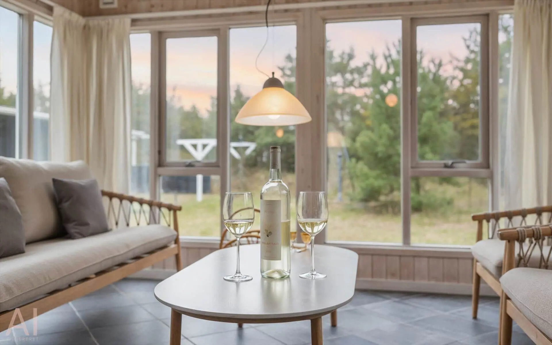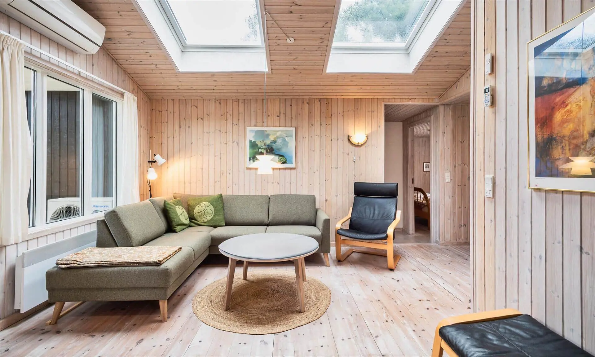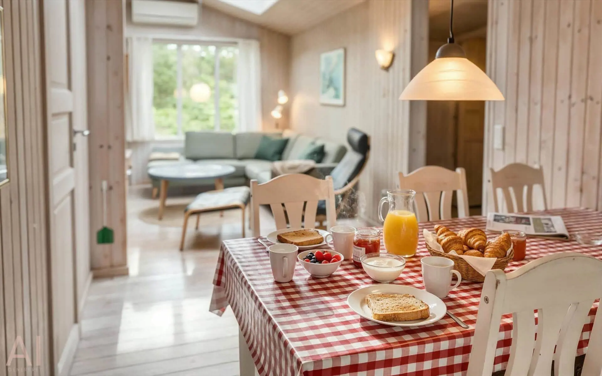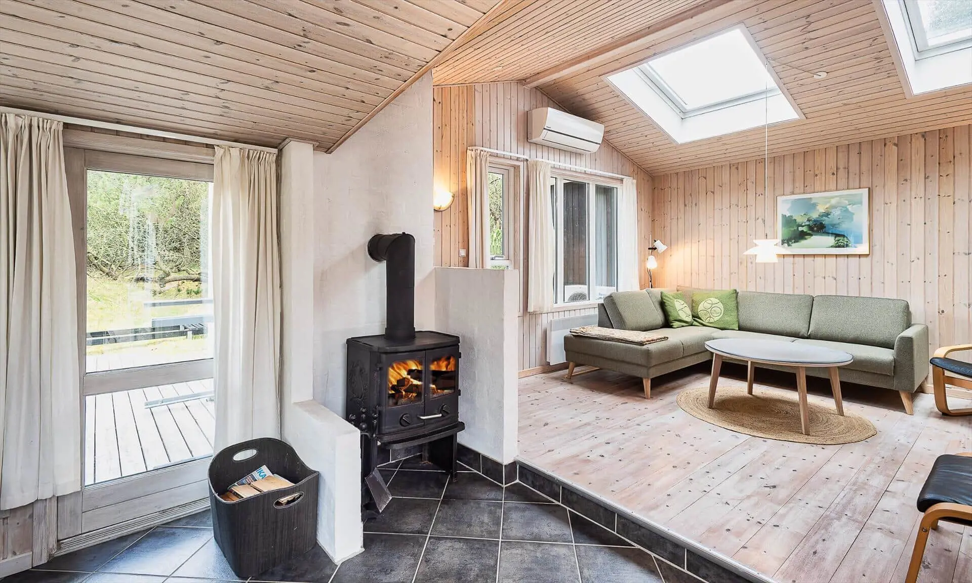 Drinnen spürst du sofort, warum das Haus Sonnenstrahl heißt: Die beiden Dachfenster über dem Sofa lassen Tageslicht hereinströmen und verleihen dem Wohnzimmer eine einladende, sonnenhelle Atmosphäre, in der die Familie von selbst zu gemeinsamen Momenten zusammenkommt. Die gut ausgestattete Küche in ruhigen, dezenten Farben ist mit praktischen Lösungen in Arbeitshöhe eingerichtet, sodass das Kochen leicht und gemütlich wird — denk an den Duft von frisch gebackenem Brot und Kaffee, vermischt mit dem Licht, das durch die Scheiben bricht. Der helle Wintergarten fungiert als Panorama zum Garten: Hier kannst du lesen, Spiele spielen oder den Kindern beim Spielen zusehen, während warme Sonnenstrahlen und Vogelgezwitscher den Raum erfüllen. Das Interieur ist auf Entspannung ausgelegt, und die sanfte Wärme des Holzofens sowie weiche Textilien laden zu langen, ruhigen Abenden zusammen ein.