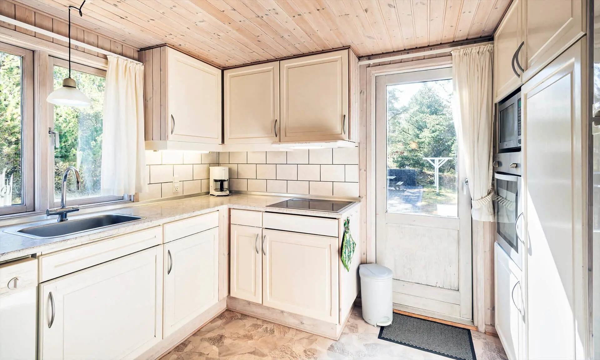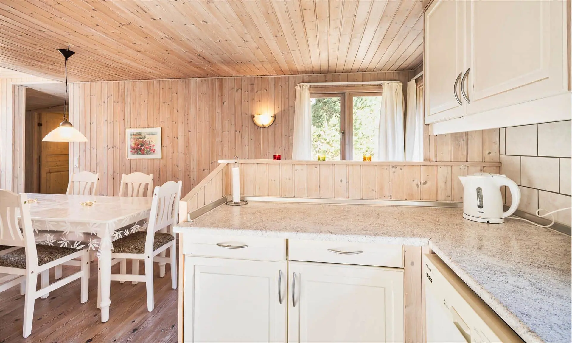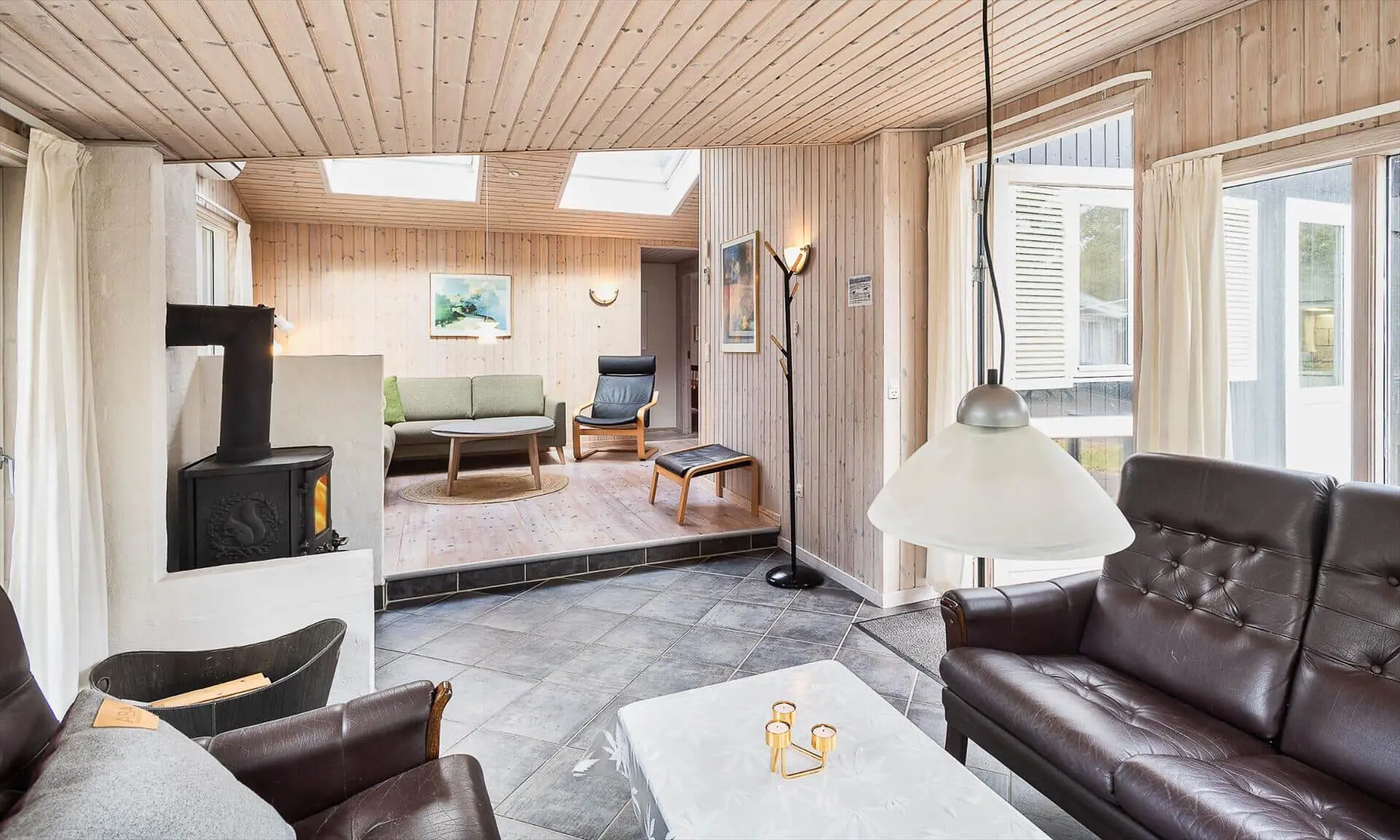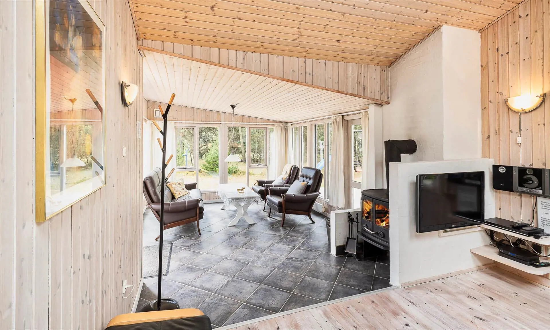 Drinnen spürst du sofort, warum das Haus Sonnenstrahl heißt: Die beiden Dachfenster über dem Sofa lassen Tageslicht hereinströmen und verleihen dem Wohnzimmer eine einladende, sonnenhelle Atmosphäre, in der die Familie von selbst zu gemeinsamen Momenten zusammenkommt. Die gut ausgestattete Küche in ruhigen, dezenten Farben ist mit praktischen Lösungen in Arbeitshöhe eingerichtet, sodass das Kochen leicht und gemütlich wird — denk an den Duft von frisch gebackenem Brot und Kaffee, vermischt mit dem Licht, das durch die Scheiben bricht. Der helle Wintergarten fungiert als Panorama zum Garten: Hier kannst du lesen, Spiele spielen oder den Kindern beim Spielen zusehen, während warme Sonnenstrahlen und Vogelgezwitscher den Raum erfüllen. Das Interieur ist auf Entspannung ausgelegt, und die sanfte Wärme des Holzofens sowie weiche Textilien laden zu langen, ruhigen Abenden zusammen ein.