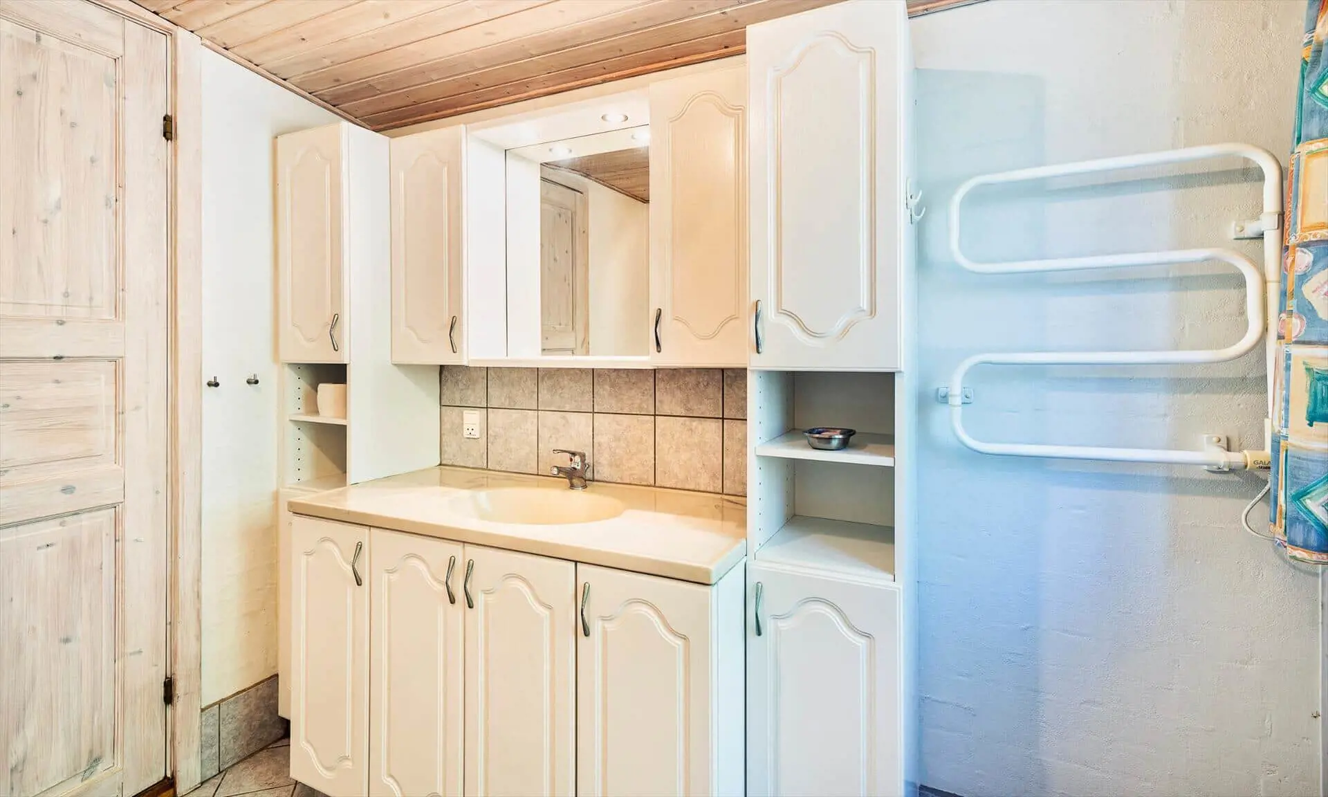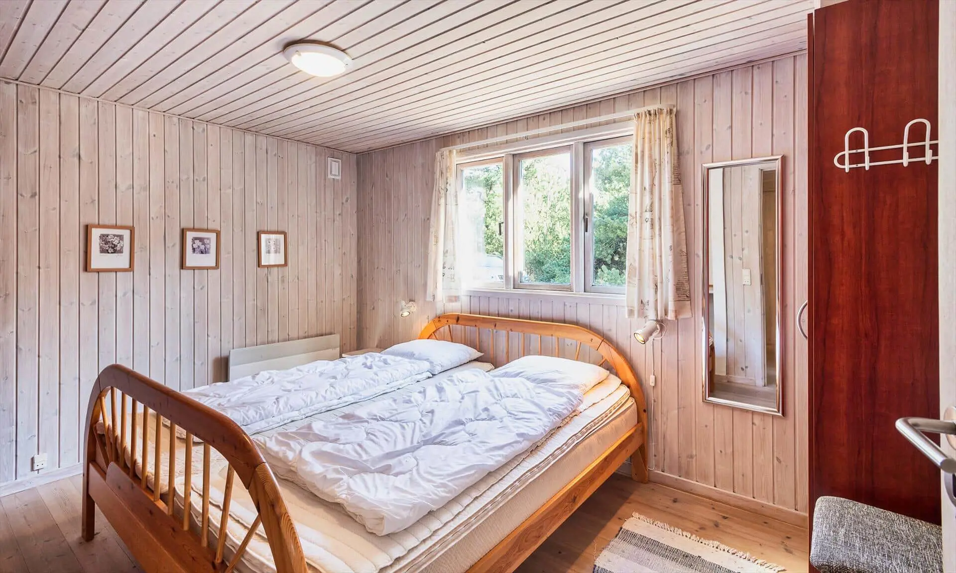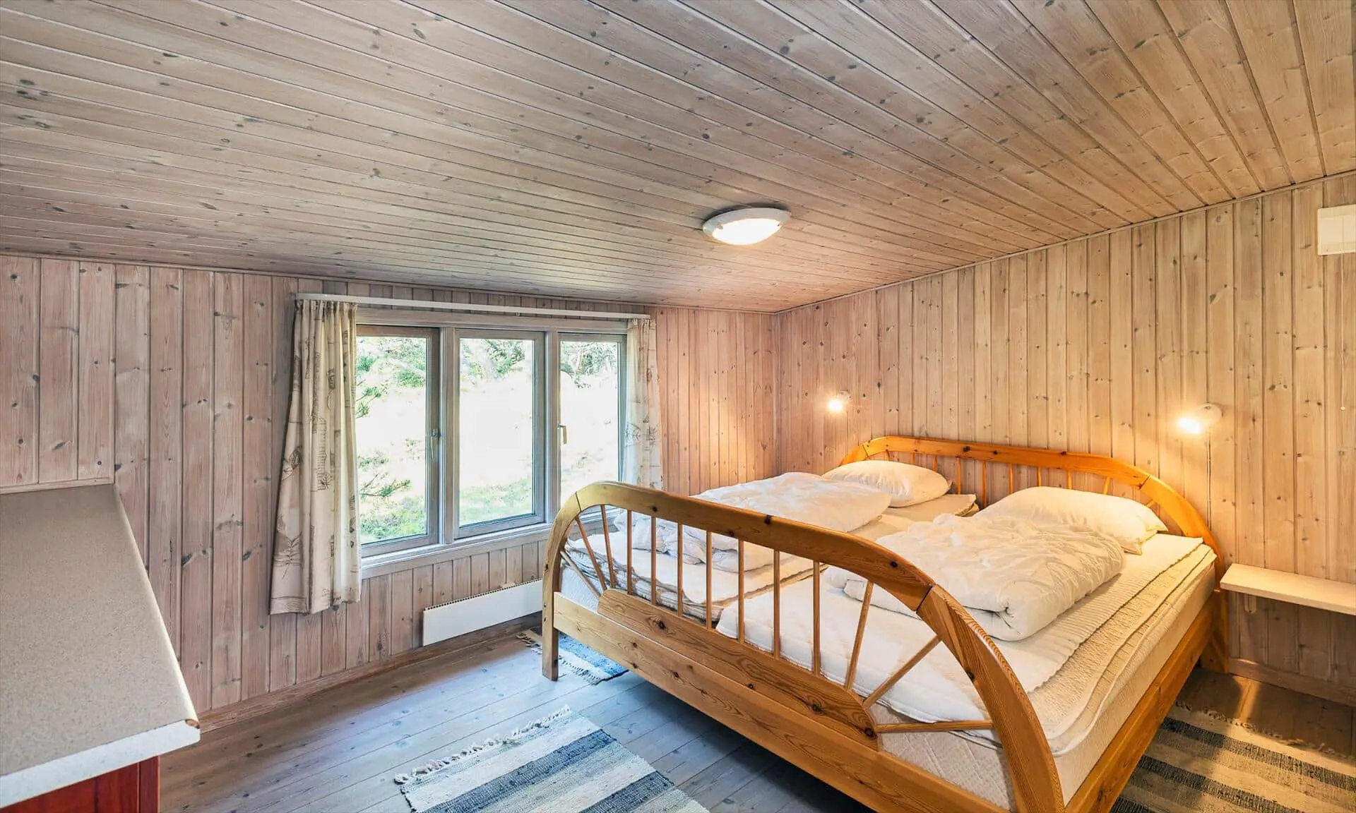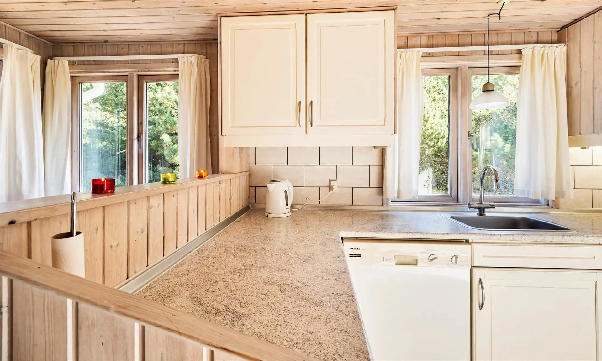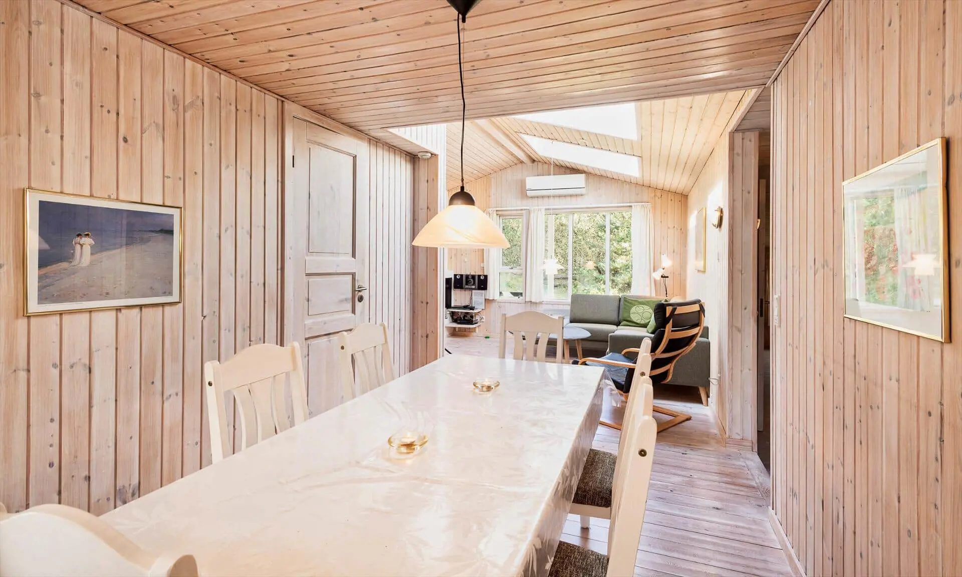 Drinnen spürst du sofort, warum das Haus Sonnenstrahl heißt: Die beiden Dachfenster über dem Sofa lassen Tageslicht hereinströmen und verleihen dem Wohnzimmer eine einladende, sonnenhelle Atmosphäre, in der die Familie von selbst zu gemeinsamen Momenten zusammenkommt. Die gut ausgestattete Küche in ruhigen, dezenten Farben ist mit praktischen Lösungen in Arbeitshöhe eingerichtet, sodass das Kochen leicht und gemütlich wird — denk an den Duft von frisch gebackenem Brot und Kaffee, vermischt mit dem Licht, das durch die Scheiben bricht. Der helle Wintergarten fungiert als Panorama zum Garten: Hier kannst du lesen, Spiele spielen oder den Kindern beim Spielen zusehen, während warme Sonnenstrahlen und Vogelgezwitscher den Raum erfüllen. Das Interieur ist auf Entspannung ausgelegt, und die sanfte Wärme des Holzofens sowie weiche Textilien laden zu langen, ruhigen Abenden zusammen ein.