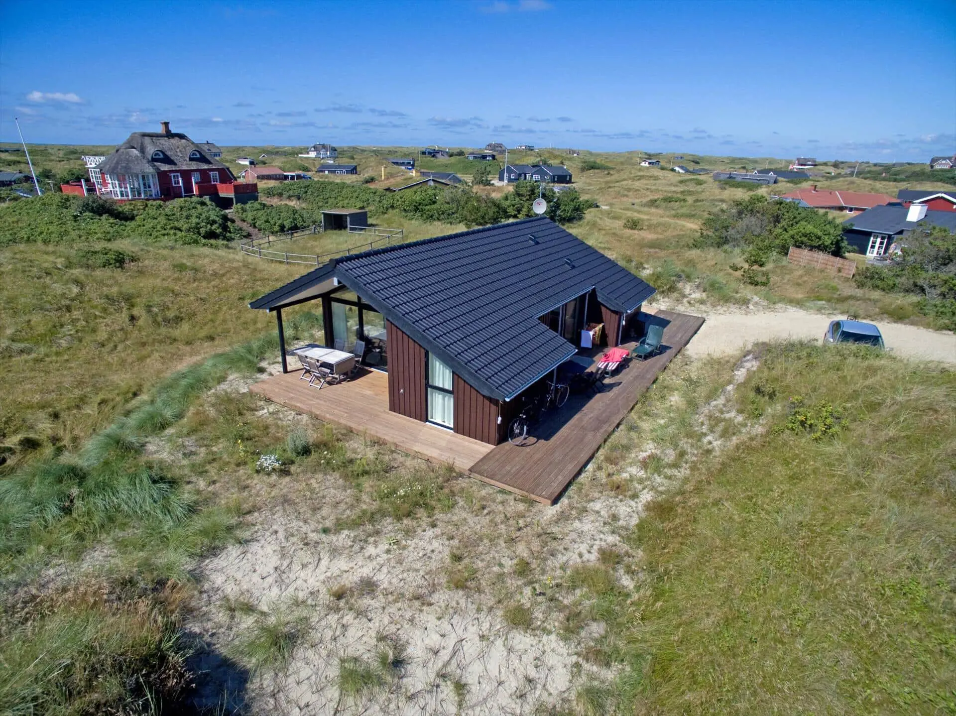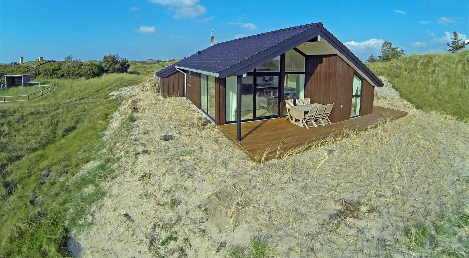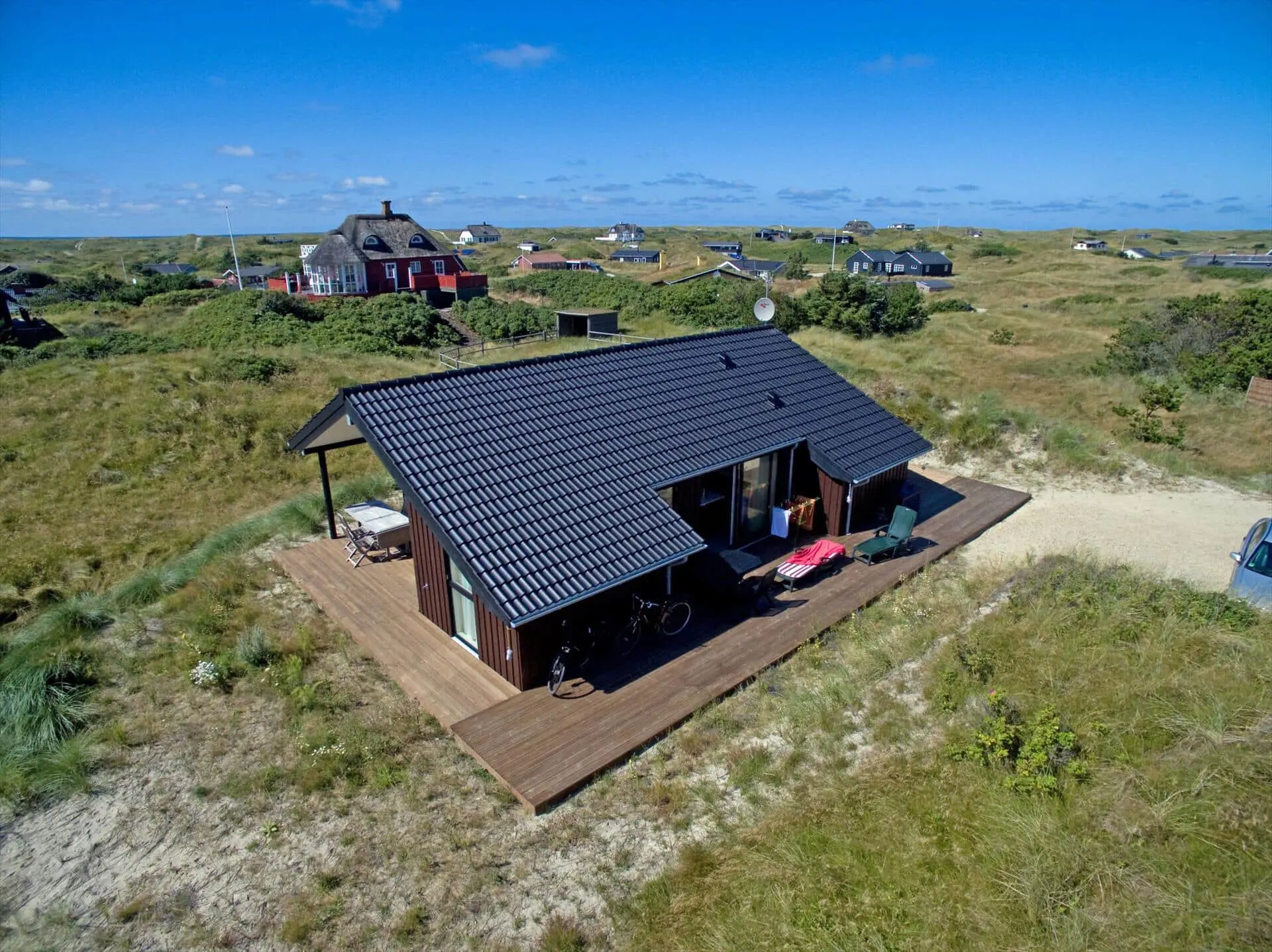 Das Dünengrundstück des Ferienhauses bietet eine naturnahe und ungestörte Kulisse für das Leben im Freien. Die Terrasse ist ein natürlicher Treffpunkt, an dem du den Wechsel des Tages verfolgen kannst: Vogelgezwitscher am Morgen, warme Vormittagssonne und die ruhigen Farben am Abend. Wenn dich das Bedürfnis nach Strand überkommt, erreichst du den Vejers Strand nach einem kurzen, angenehmen Spaziergang durch die Dünen — ideal für tägliche Ausflüge in Sand und salziger Luft, Spaziergänge am Wasser oder ein erfrischendes Bad in der Nordsee.