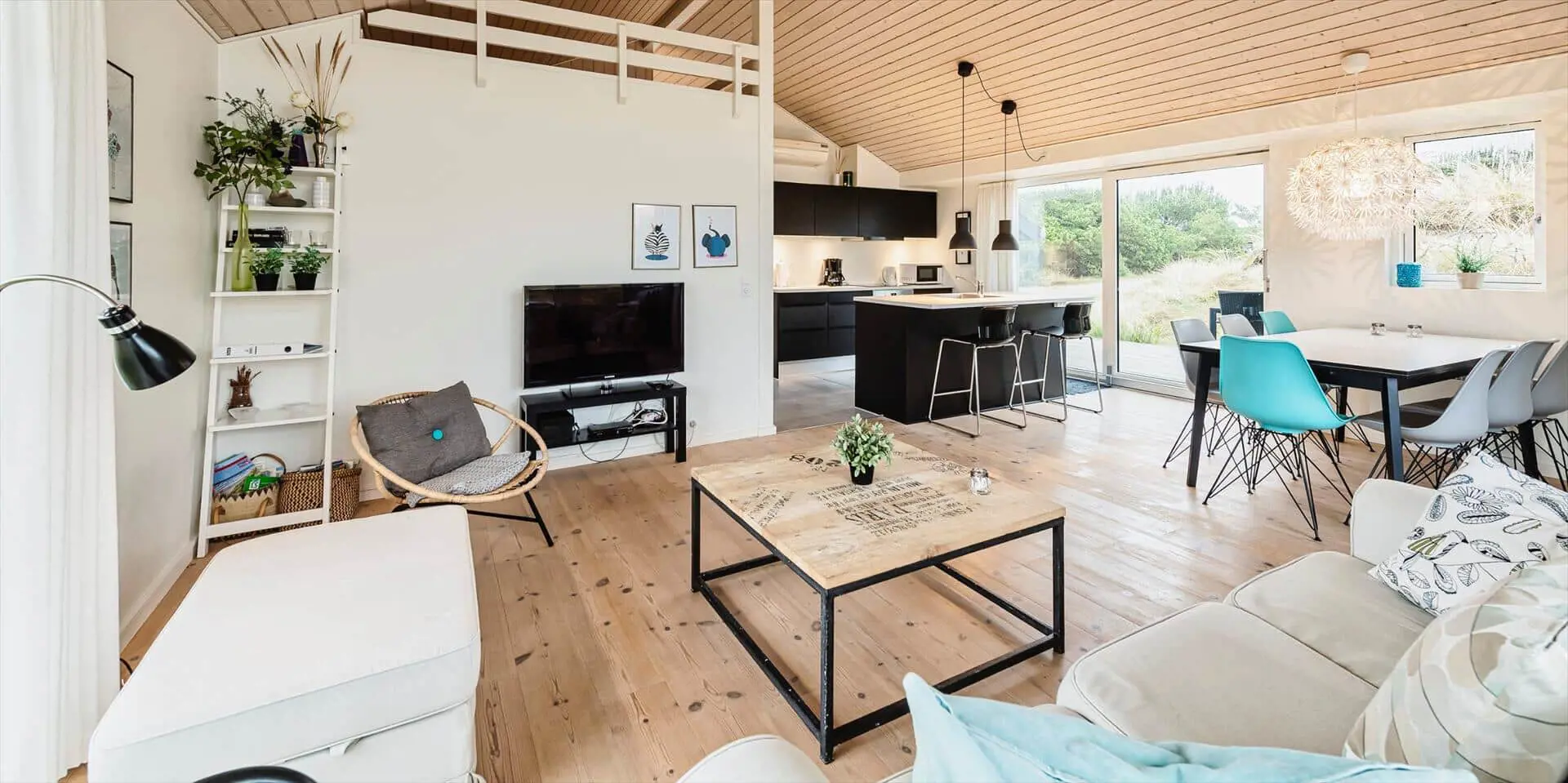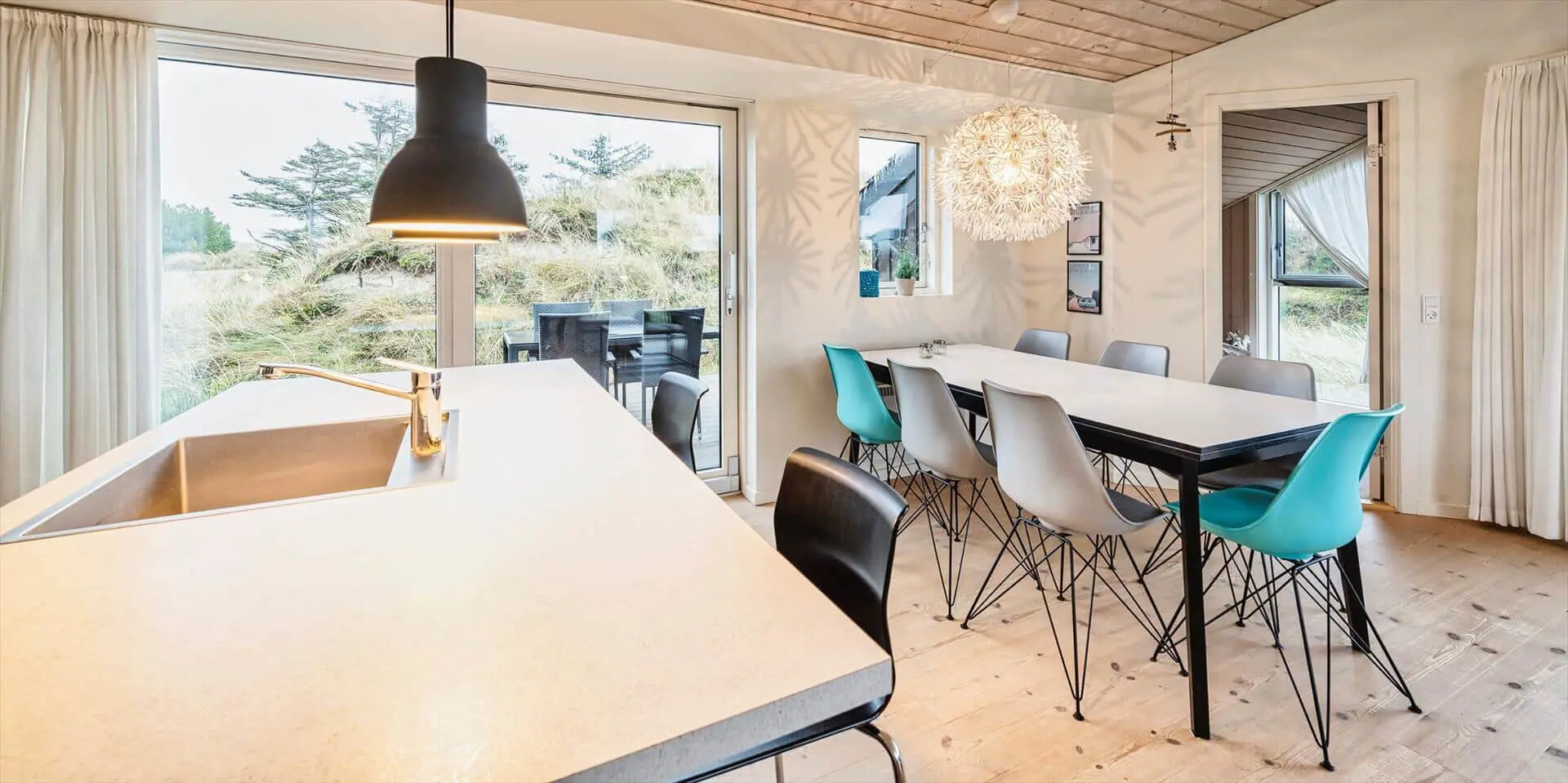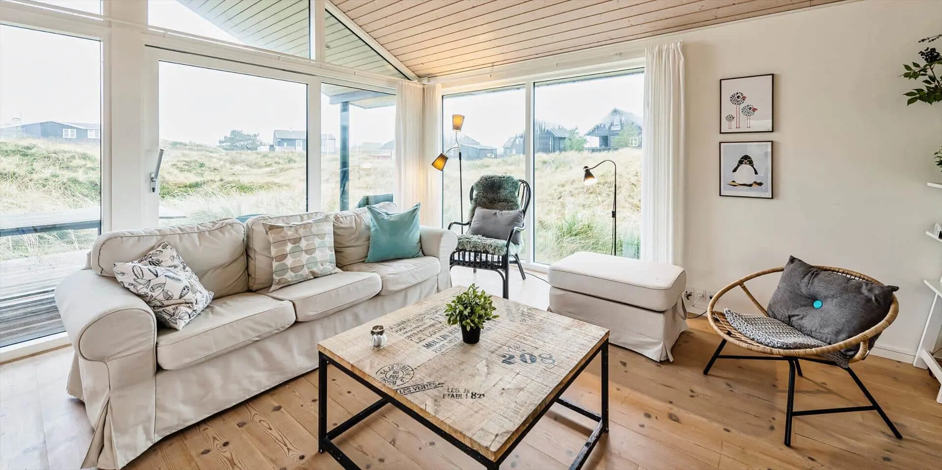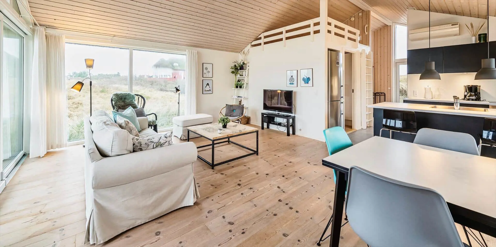 Drinnen empfängt dich eine offene Küche, die nahtlos in den Essbereich und das Wohnzimmer übergeht — ein Raum, in dem Gespräche ungestört weiterlaufen können, während du kochst oder deinen Nachmittagskaffee genießt. Das Wohnzimmer ist hell und mit einem starken persönlichen Stil eingerichtet; das Farbspiel der Möbel findet sich in Kissen und Textilien wieder und schafft ein harmonisches, einladendes Gesamtbild. Hier ist Platz zum Entspannen mit einem guten Buch, für Spiele mit der Familie oder für stille Momente mit Blick auf die umliegende Dünenlandschaft. Die Einrichtung wirkt durchdacht und gemütlich und lädt dazu ein, Erinnerungen zu schaffen — von sonnengefluteten Morgen am Esstisch bis zu ruhigen Abenden im sanften Licht der untergehenden Sonne.