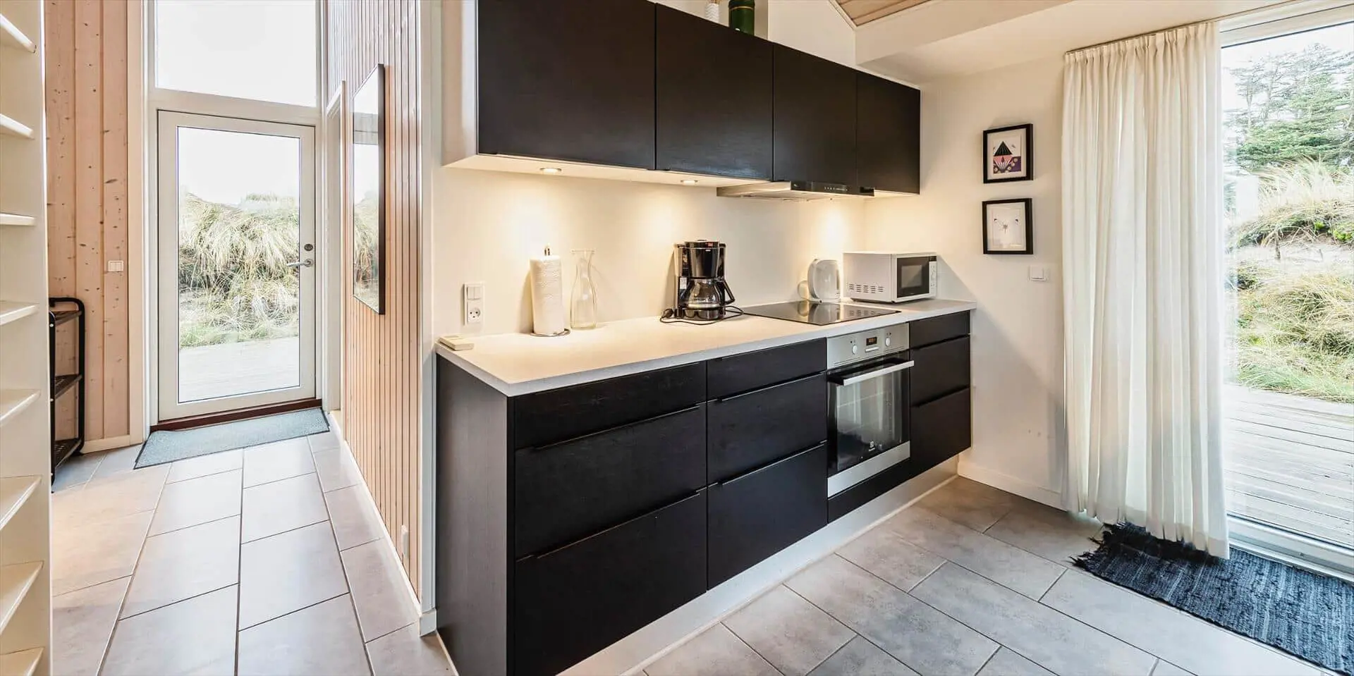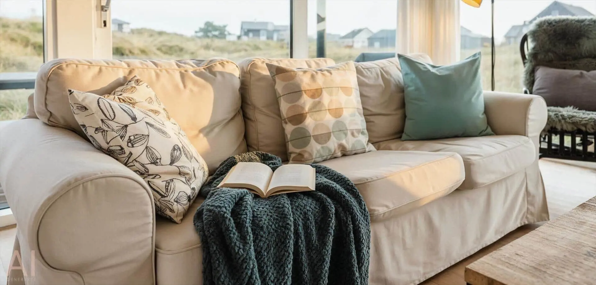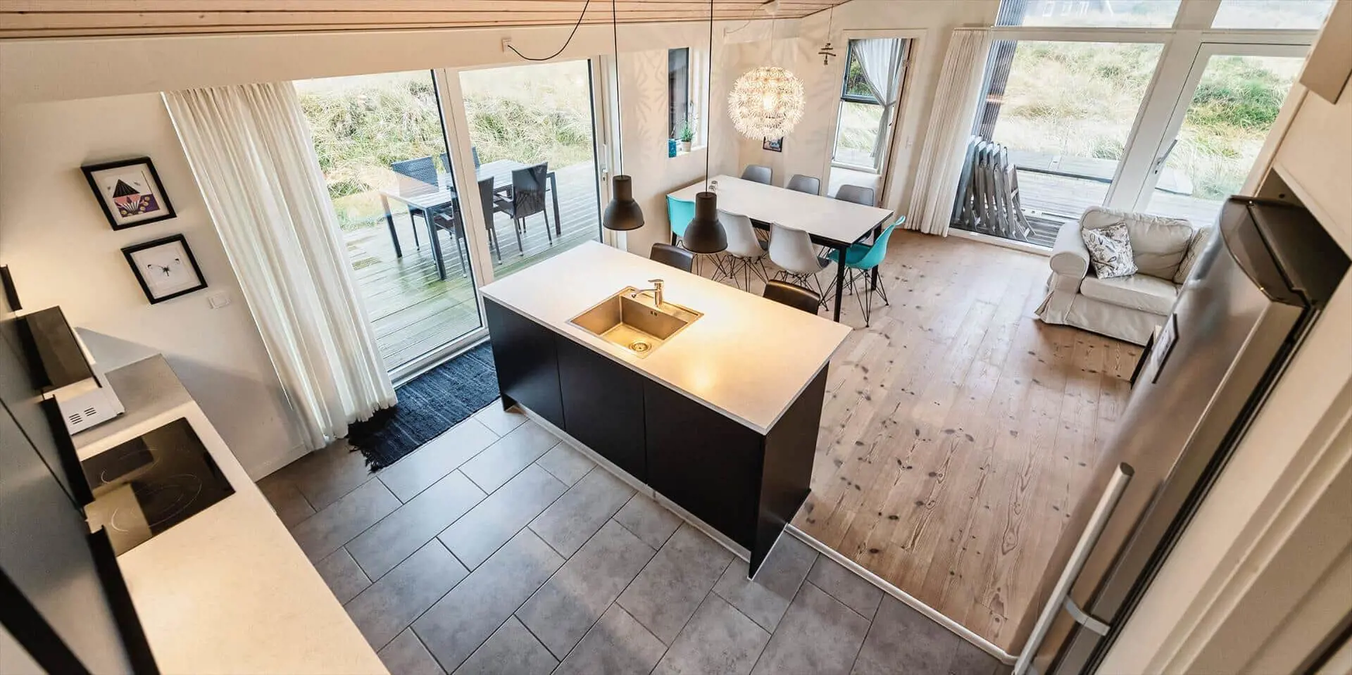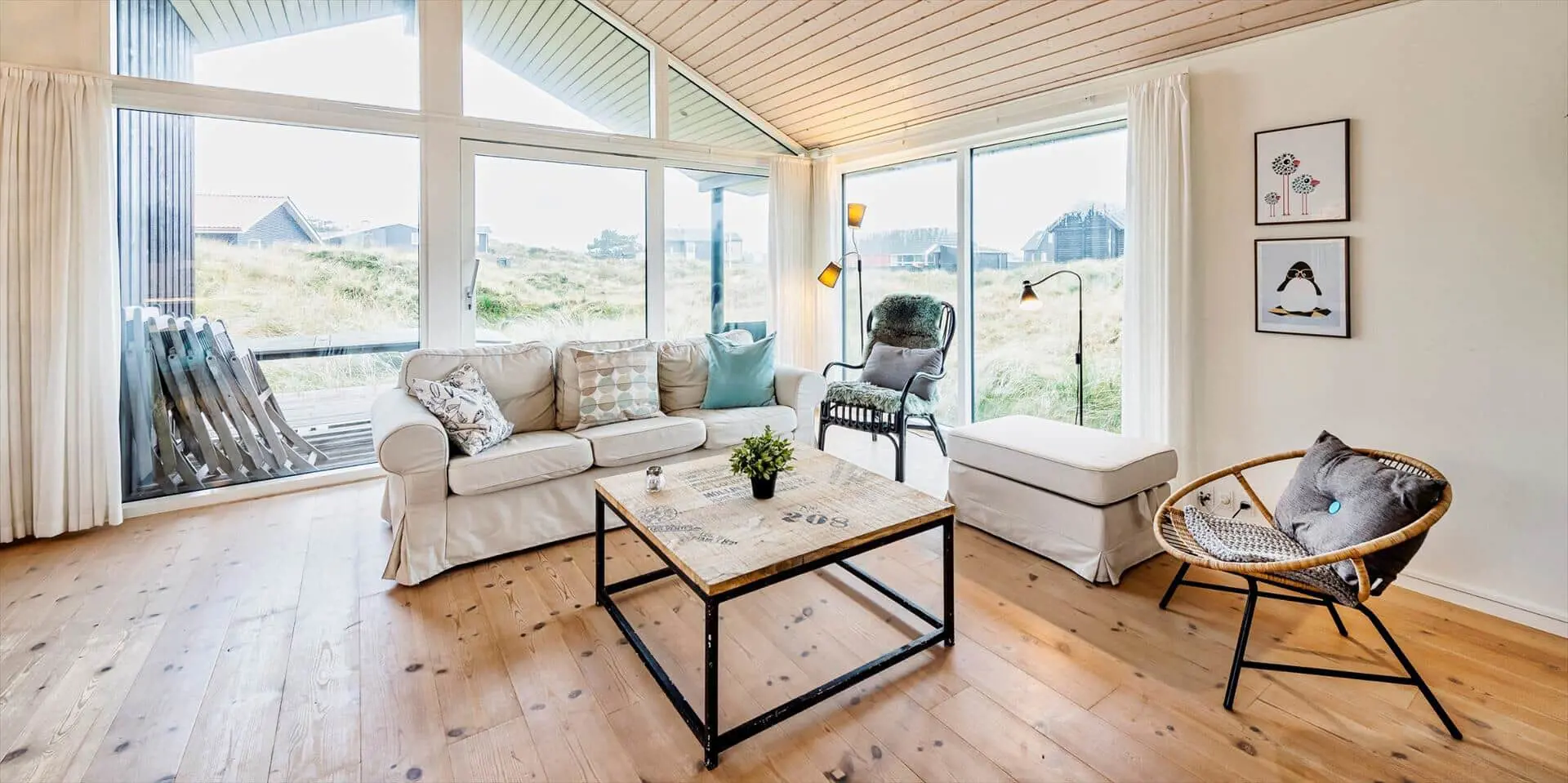 Drinnen empfängt dich eine offene Küche, die nahtlos in den Essbereich und das Wohnzimmer übergeht — ein Raum, in dem Gespräche ungestört weiterlaufen können, während du kochst oder deinen Nachmittagskaffee genießt. Das Wohnzimmer ist hell und mit einem starken persönlichen Stil eingerichtet; das Farbspiel der Möbel findet sich in Kissen und Textilien wieder und schafft ein harmonisches, einladendes Gesamtbild. Hier ist Platz zum Entspannen mit einem guten Buch, für Spiele mit der Familie oder für stille Momente mit Blick auf die umliegende Dünenlandschaft. Die Einrichtung wirkt durchdacht und gemütlich und lädt dazu ein, Erinnerungen zu schaffen — von sonnengefluteten Morgen am Esstisch bis zu ruhigen Abenden im sanften Licht der untergehenden Sonne.
