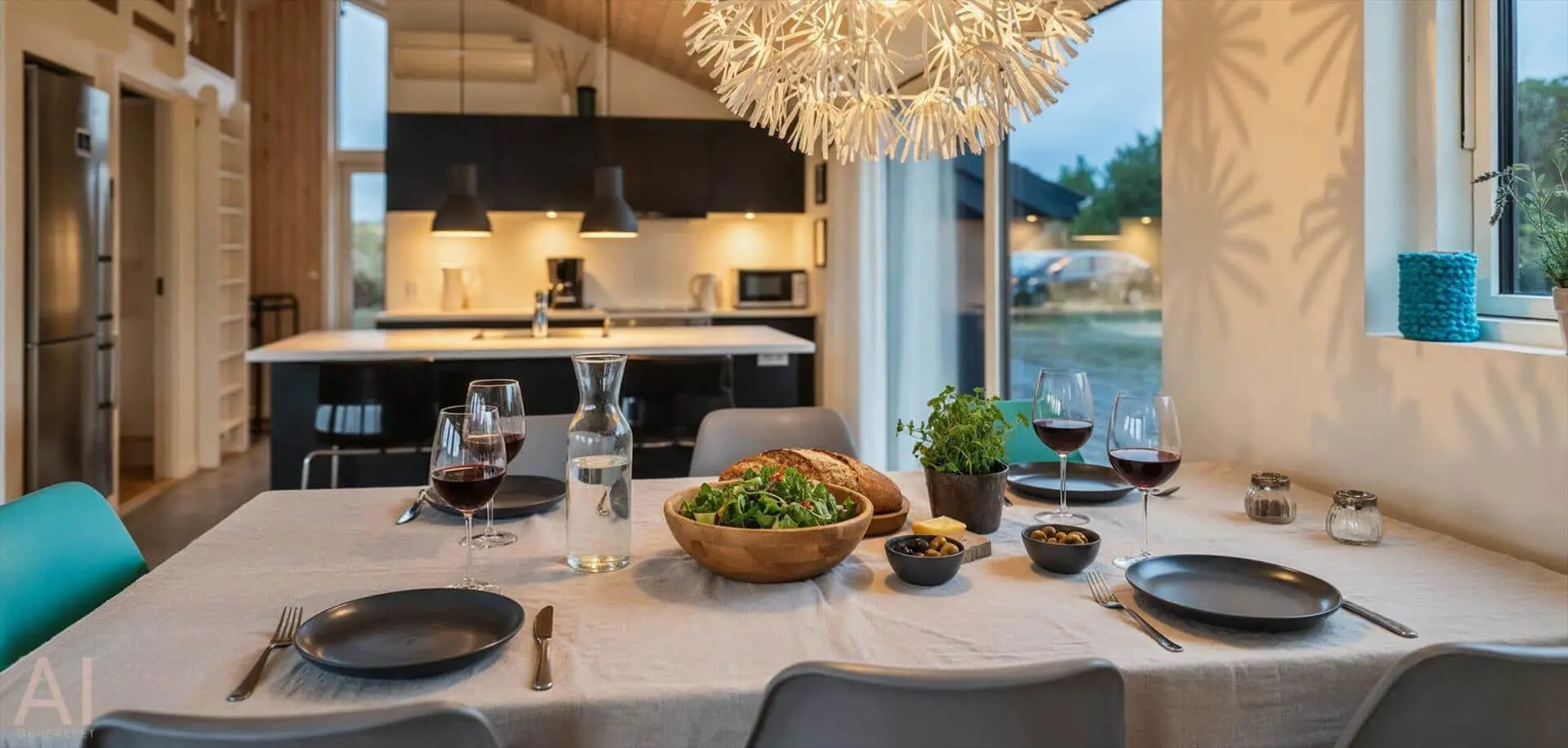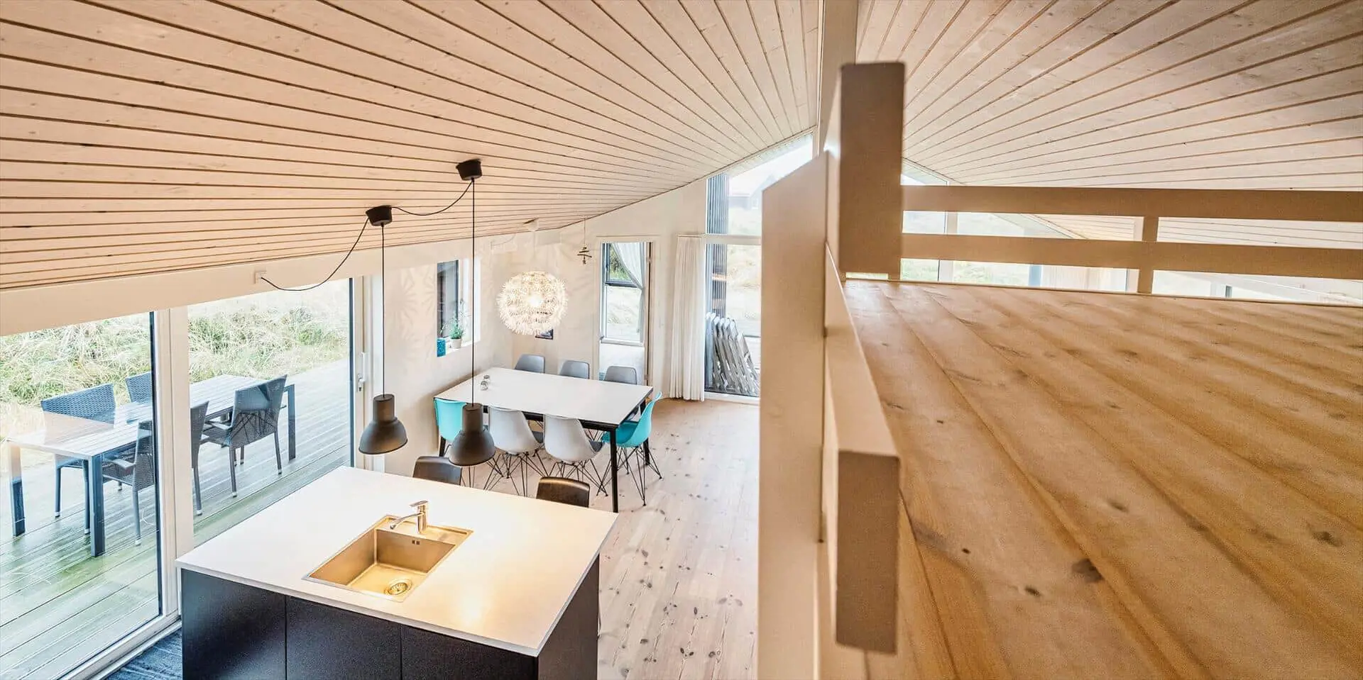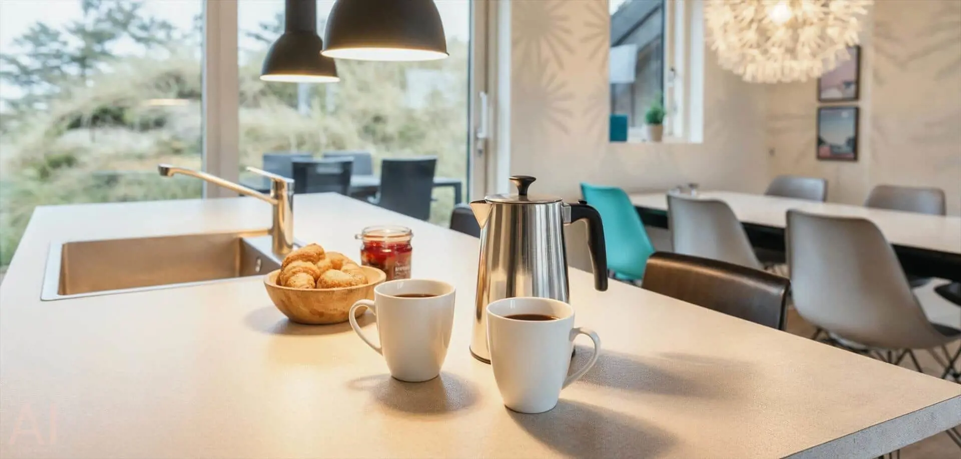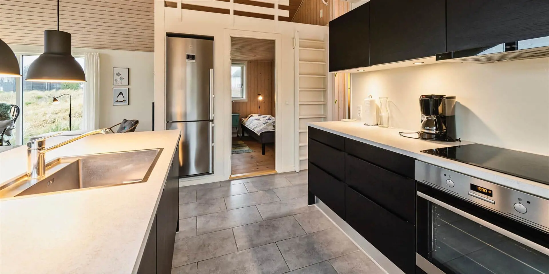 Drinnen empfängt dich eine offene Küche, die nahtlos in den Essbereich und das Wohnzimmer übergeht — ein Raum, in dem Gespräche ungestört weiterlaufen können, während du kochst oder deinen Nachmittagskaffee genießt. Das Wohnzimmer ist hell und mit einem starken persönlichen Stil eingerichtet; das Farbspiel der Möbel findet sich in Kissen und Textilien wieder und schafft ein harmonisches, einladendes Gesamtbild. Hier ist Platz zum Entspannen mit einem guten Buch, für Spiele mit der Familie oder für stille Momente mit Blick auf die umliegende Dünenlandschaft. Die Einrichtung wirkt durchdacht und gemütlich und lädt dazu ein, Erinnerungen zu schaffen — von sonnengefluteten Morgen am Esstisch bis zu ruhigen Abenden im sanften Licht der untergehenden Sonne.