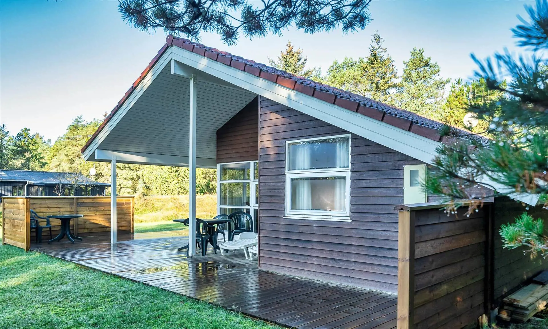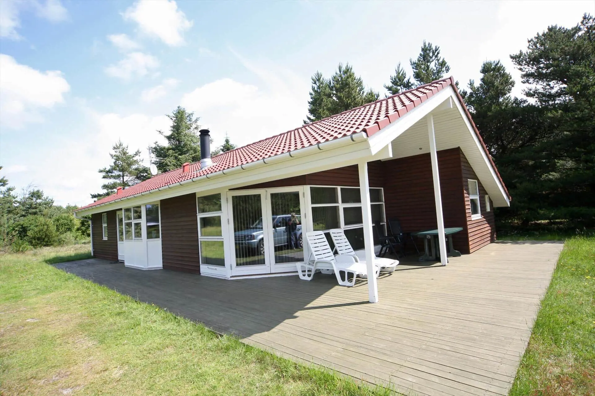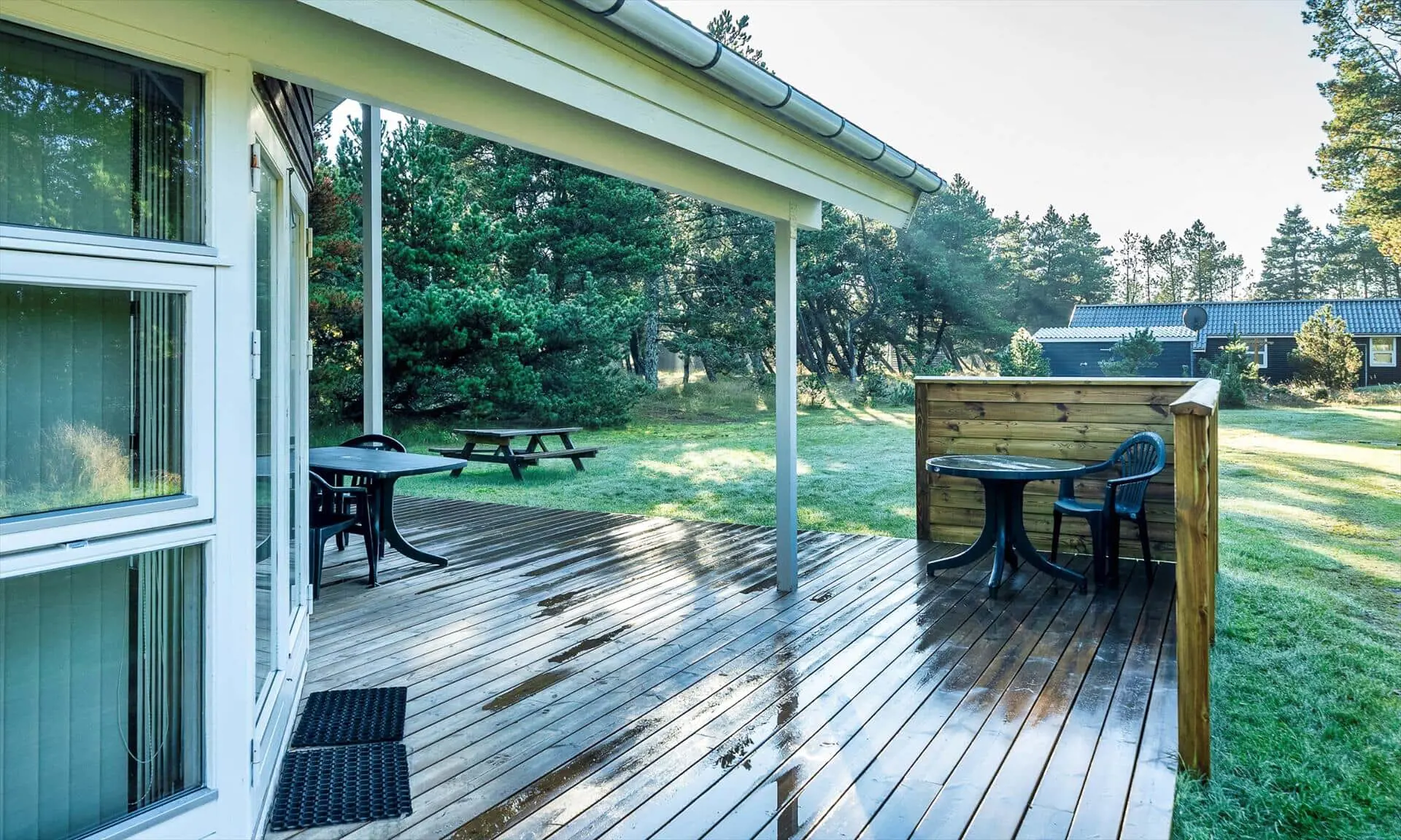 Draußen erwartet dich eine teilweise überdachte Terrasse, die Schutz und Platz für ruhige Frühstücke sowie lange Abende mit Essen und Lachen bietet. Die Terrasse erstreckt sich über zwei Seiten des Hauses und hat eine gemütliche Windschutzecke. Der gepflegte Rasen lädt zum Spielen, Sonnenbaden und Aktivitäten ein, während grüne Baumsilhouetten einen ruhigen Rahmen um das Haus bilden. Wenn die Sonne wärmt, kann die Familie bequem draußen sitzen und den Duft von frisch gemähtem Rasen und Salzwasser in der Luft genießen, und die Kinder werden die Freiheit lieben, herumzutollen. Abends ist es schön, den Kaminofen drinnen für eine warme Atmosphäre sorgen zu lassen, während die Terrasse weiterhin zum Sternegucken und zu ruhigen Gesprächen einlädt.