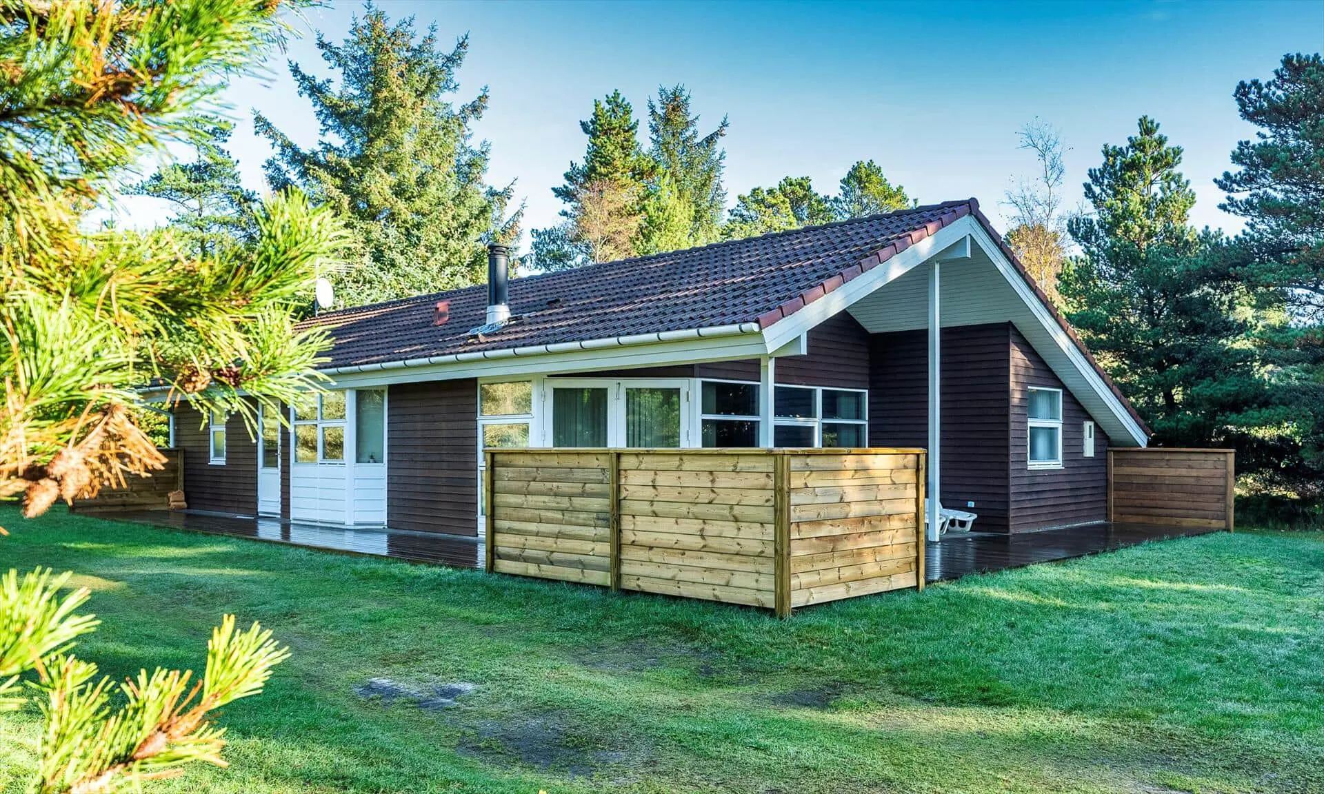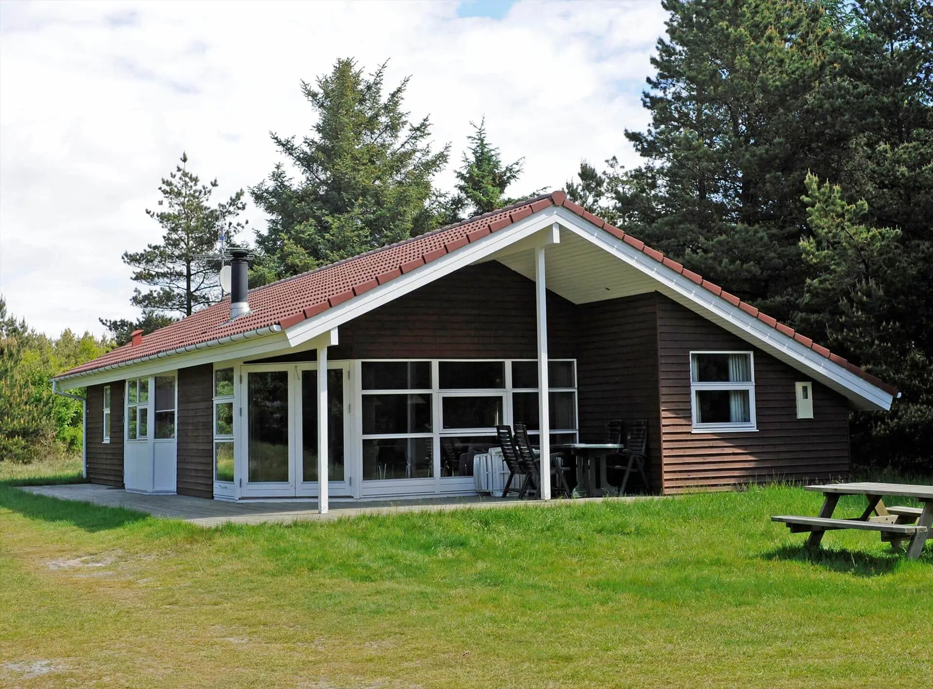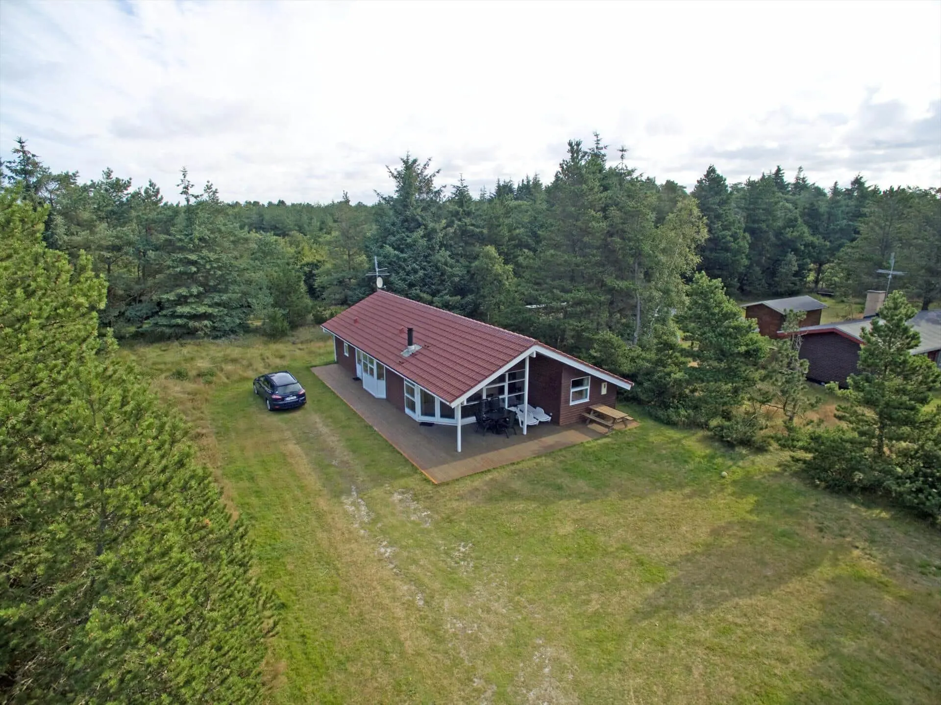 Draußen erwartet dich eine teilweise überdachte Terrasse, die Schutz und Platz für ruhige Frühstücke sowie lange Abende mit Essen und Lachen bietet. Die Terrasse erstreckt sich über zwei Seiten des Hauses und hat eine gemütliche Windschutzecke. Der gepflegte Rasen lädt zum Spielen, Sonnenbaden und Aktivitäten ein, während grüne Baumsilhouetten einen ruhigen Rahmen um das Haus bilden. Wenn die Sonne wärmt, kann die Familie bequem draußen sitzen und den Duft von frisch gemähtem Rasen und Salzwasser in der Luft genießen, und die Kinder werden die Freiheit lieben, herumzutollen. Abends ist es schön, den Kaminofen drinnen für eine warme Atmosphäre sorgen zu lassen, während die Terrasse weiterhin zum Sternegucken und zu ruhigen Gesprächen einlädt.