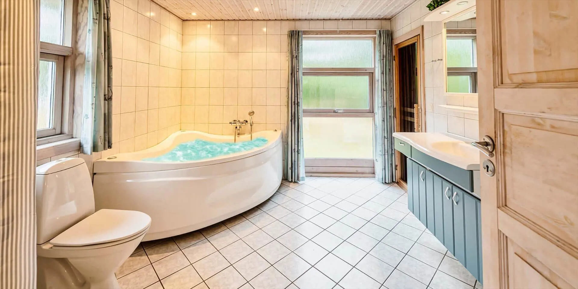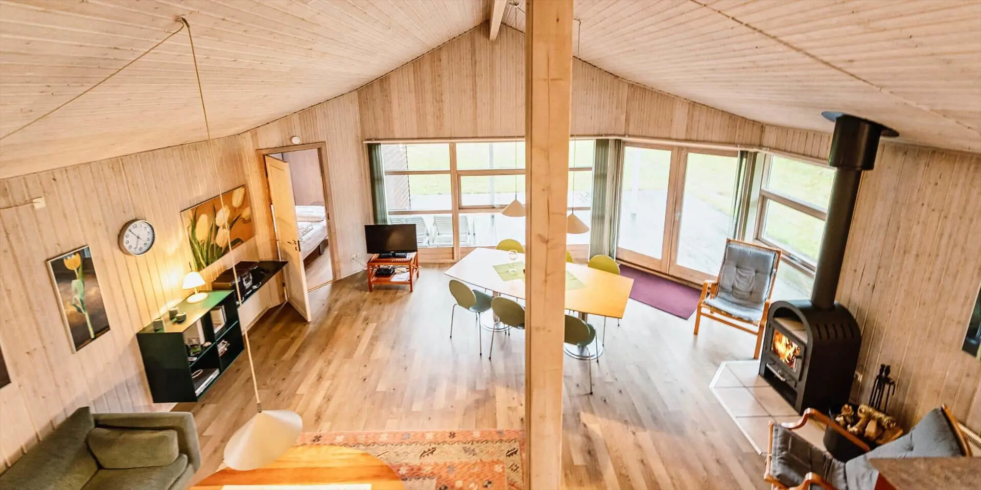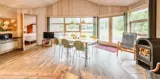 Tritt ein in einen Wohnraum, in dem eine große, weiche Sofaecke zu langen Entspannungstagen einlädt, mit Büchern, Brettspielen oder einem guten Film als natürlichen Begleitern. Die Farbe Grün ist dezent und durchgehend in den Räumen vertreten; Textilien, Kissen und Details verbinden das Innere mit den umliegenden Grünflächen, so dass du fast den Duft der Heide im Wohnzimmer spüren kannst. Ein effizienter Kaminofen verbreitet schnell Wärme und gemütliches Knistern, das an kühlen Abenden eine besondere Ferienstimmung entfacht, während natürliches Licht durch große Fenster strömt. Das Bad setzt das großzügige Raumgefühl des Hauses fort mit einem wunderbaren Whirlpool und einer Sauna, in der du die Erlebnisse des Tages nachklingen lassen, die Wärme fühlen und das Rauschen des Windes in den nahegelegenen Bäumen hören kannst — ein Gefühl von Wohlbefinden und Ruhe, welches das Abschalten leicht macht.