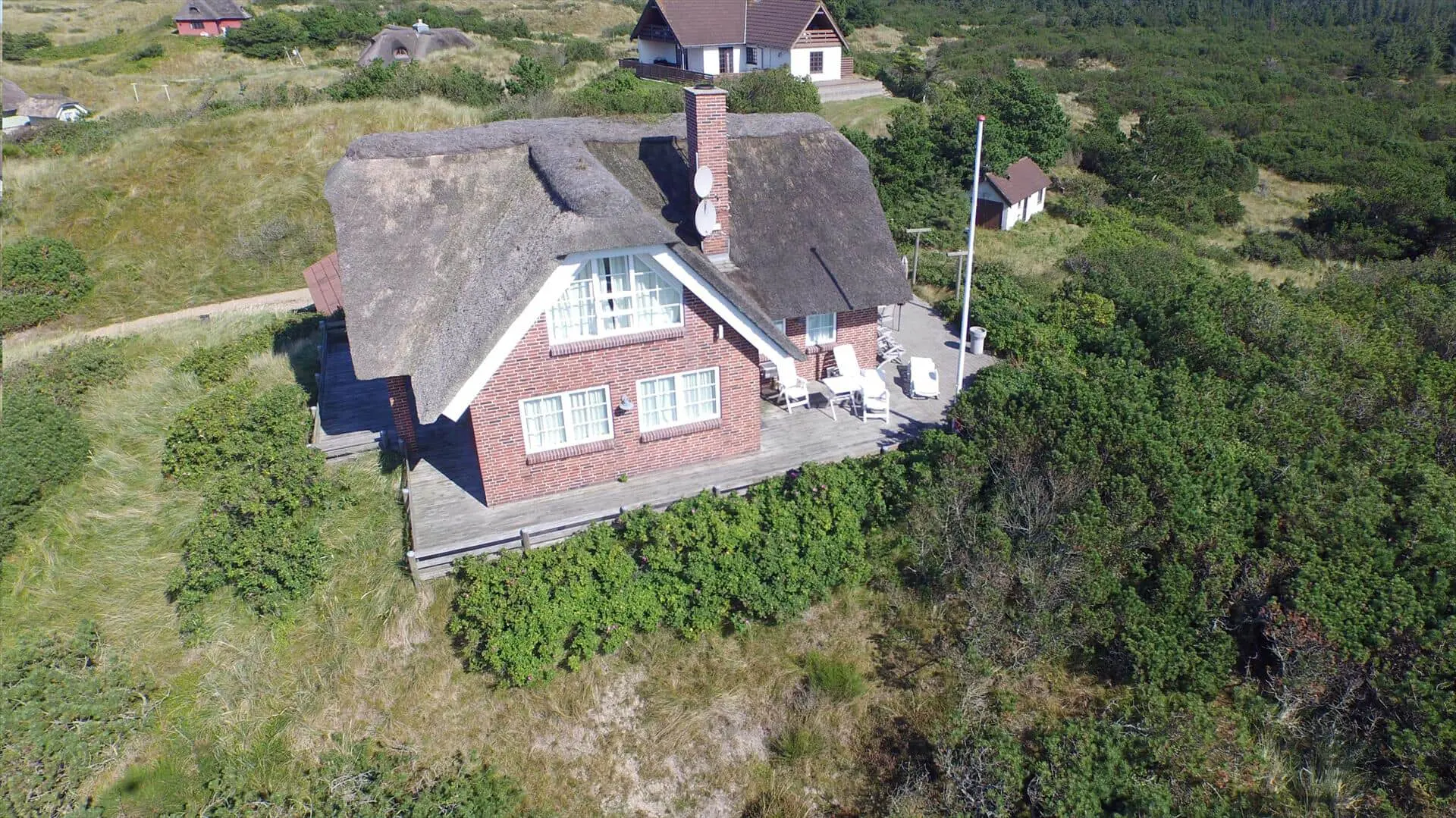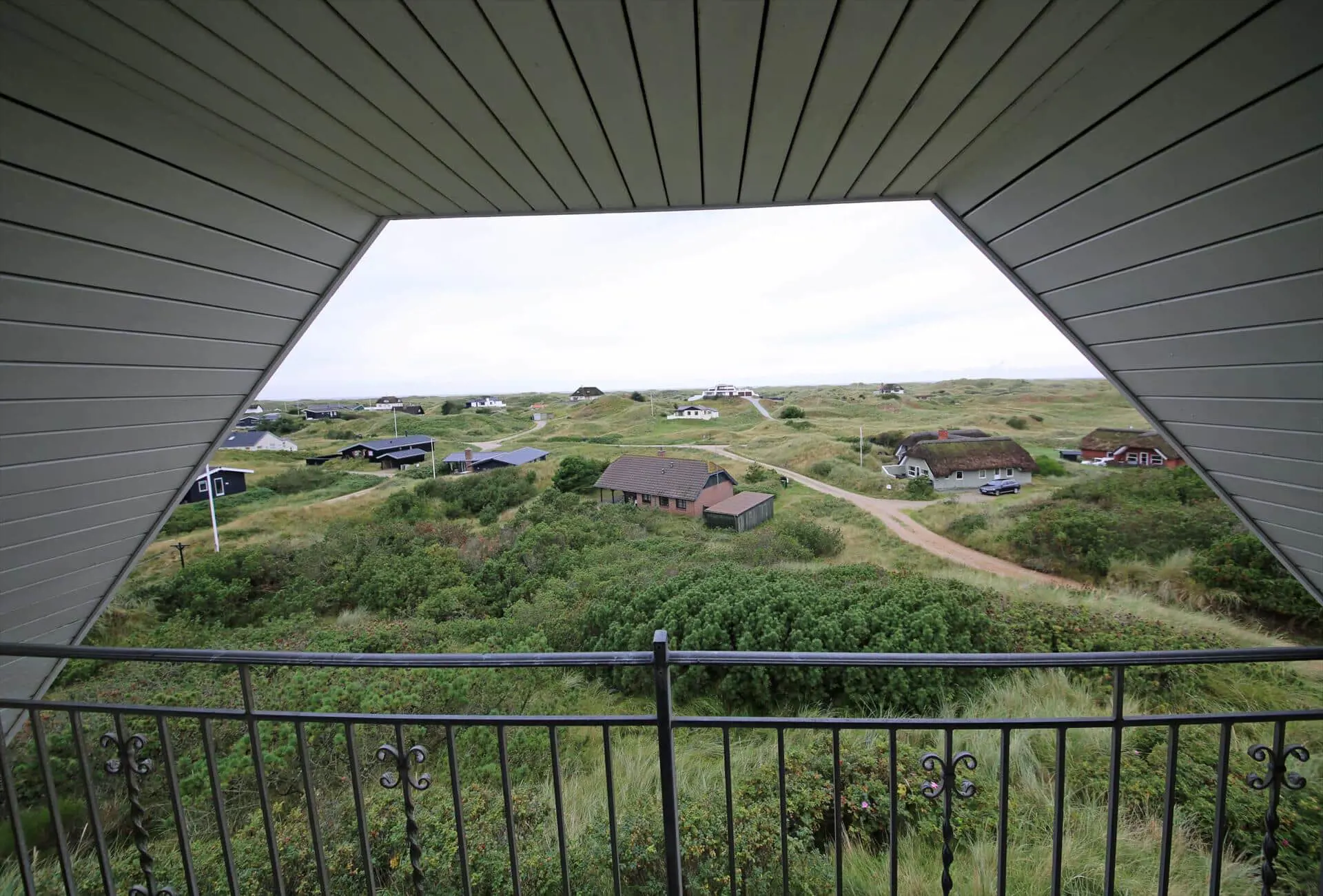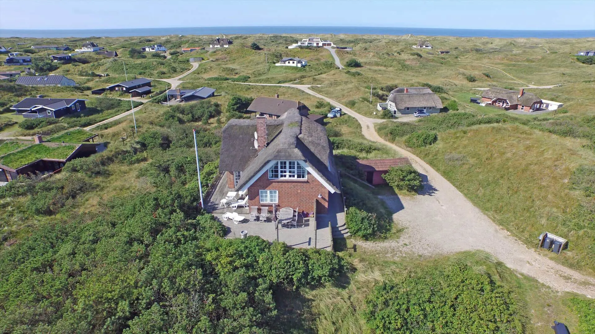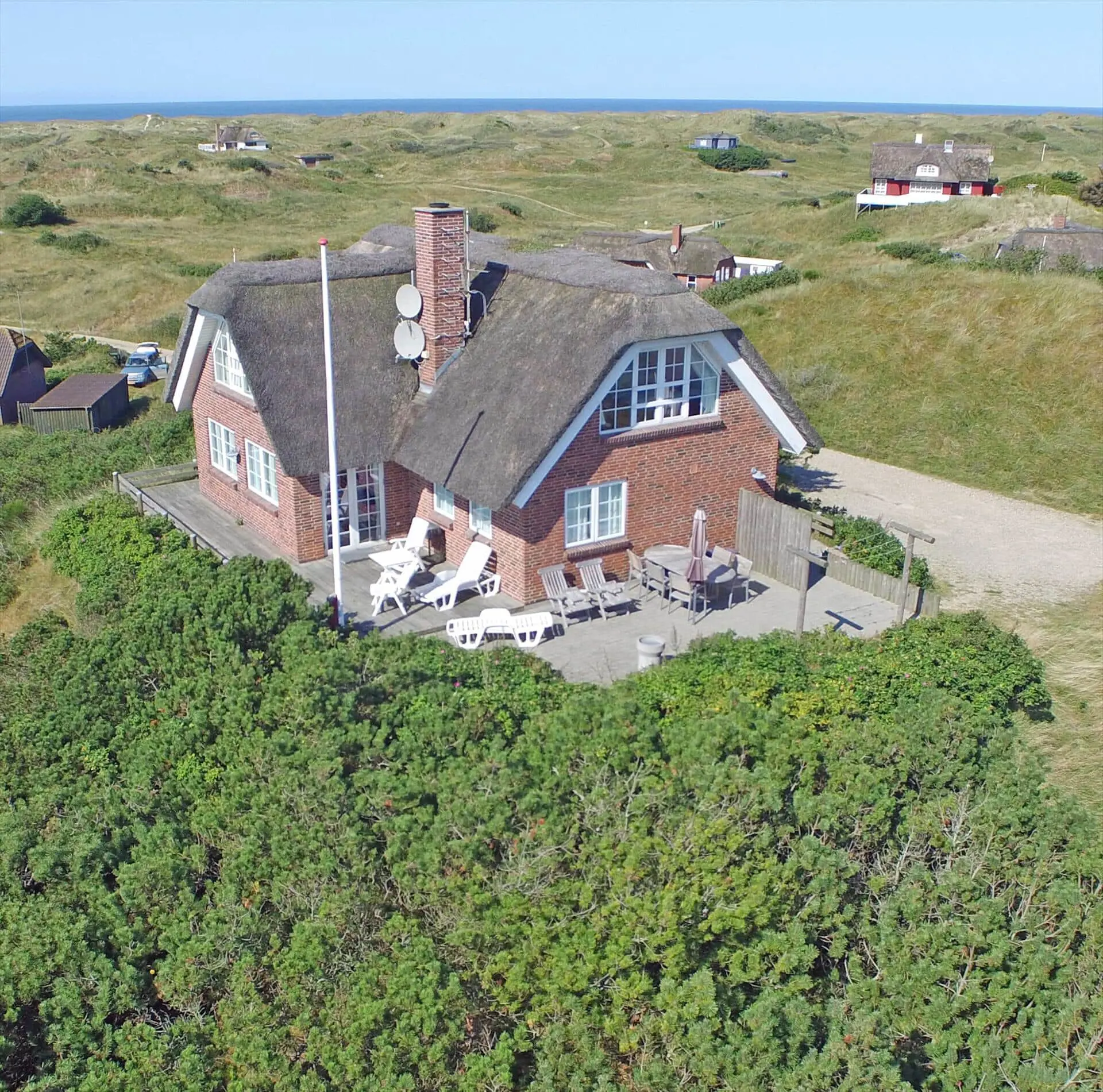 Draußen bieten das Grundstück gute Möglichkeiten zum Beisammensein und zum Zurückziehen in die Sonne. Ein Balkon bietet einen schönen Blick über die Landschaft mit den Ferienhäusern, die wie kleine Tupfer in den Dünen liegen, und von hier aus kannst du den morgendlichen Tau oder die warmen Töne der Abendsonne genießen. Die Terrasse und die Außenbereiche laden zu Mahlzeiten im Freien, Sonnenbädern und Spielen ein. Nur wenige Schritte vom Haus entfernt liegt der Strand — ein leichter, stimmungsvoller Spaziergang führt dich hinunter zur Nordsee, sodass du morgens oder abends problemlos ein erfrischendes Bad nehmen kannst und die salzige Luft sowie das Rauschen der Wellen den Tag vollkommen machen.