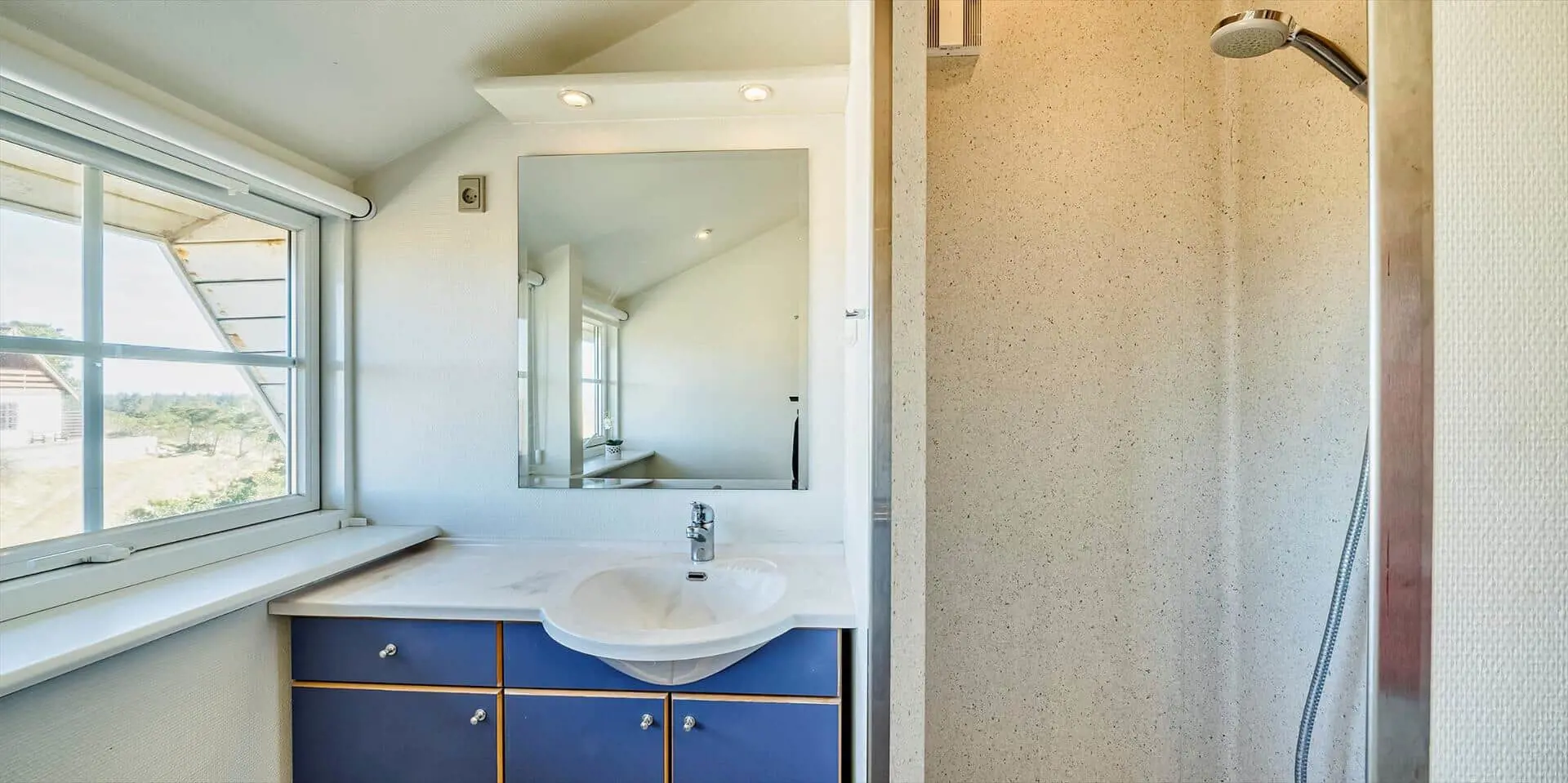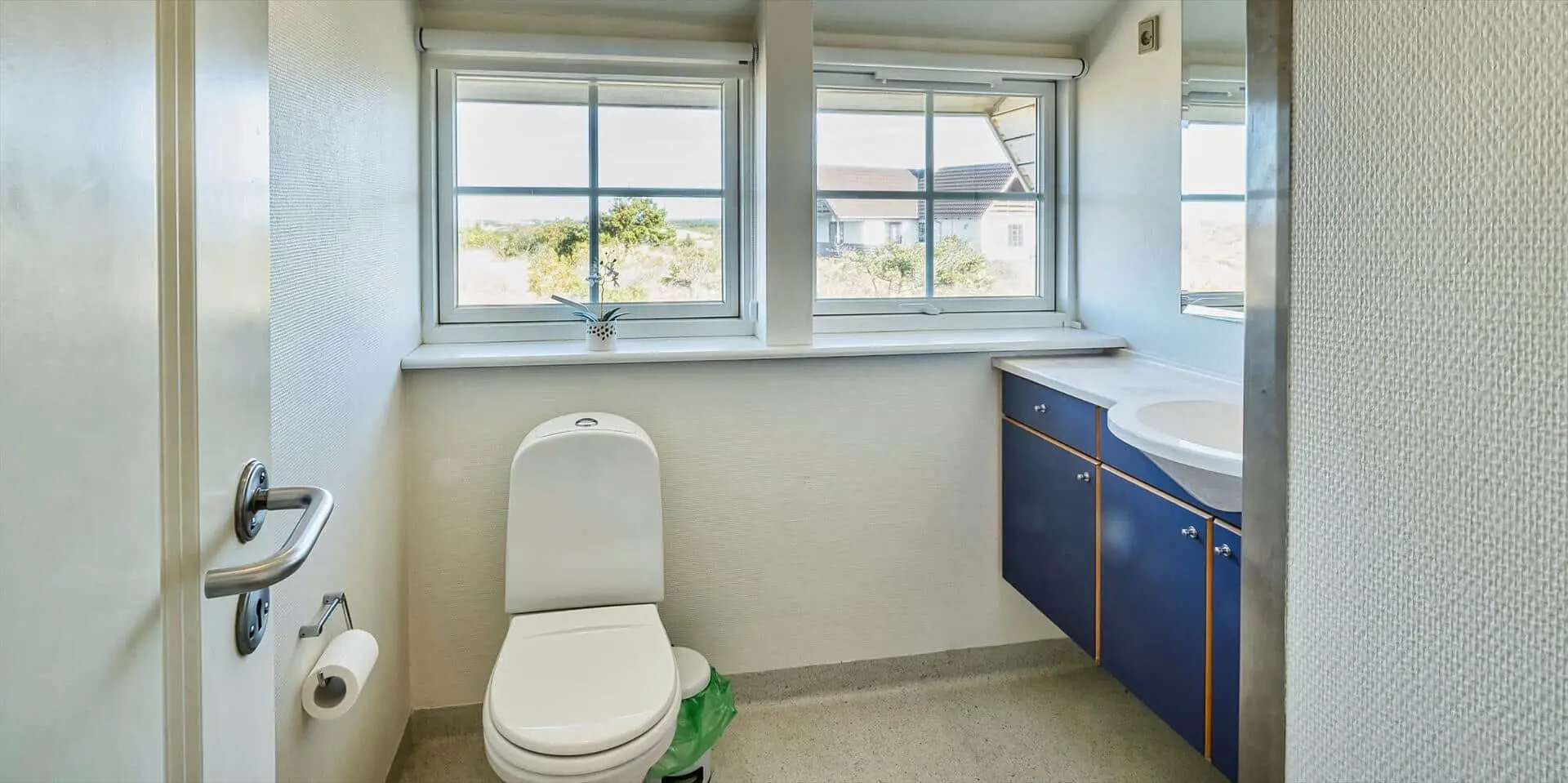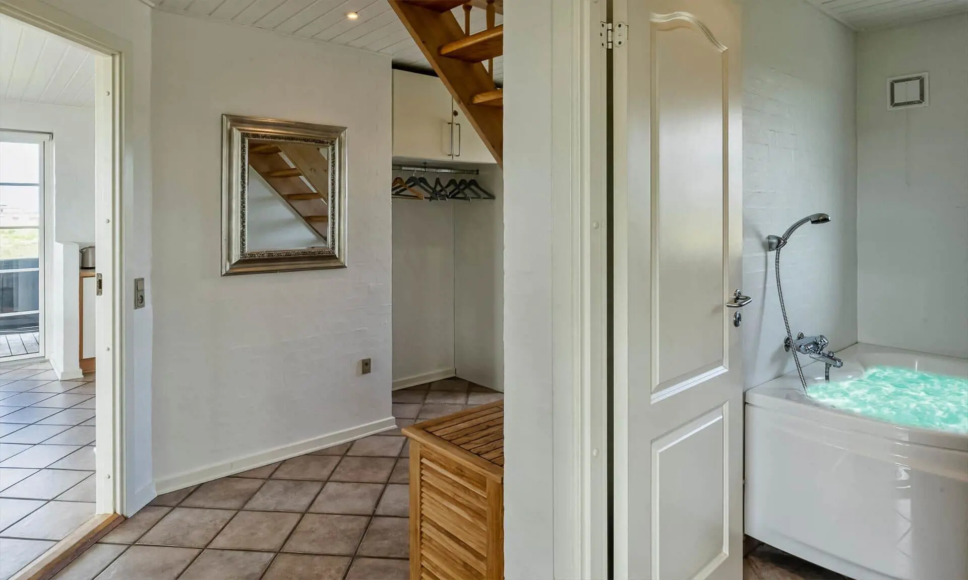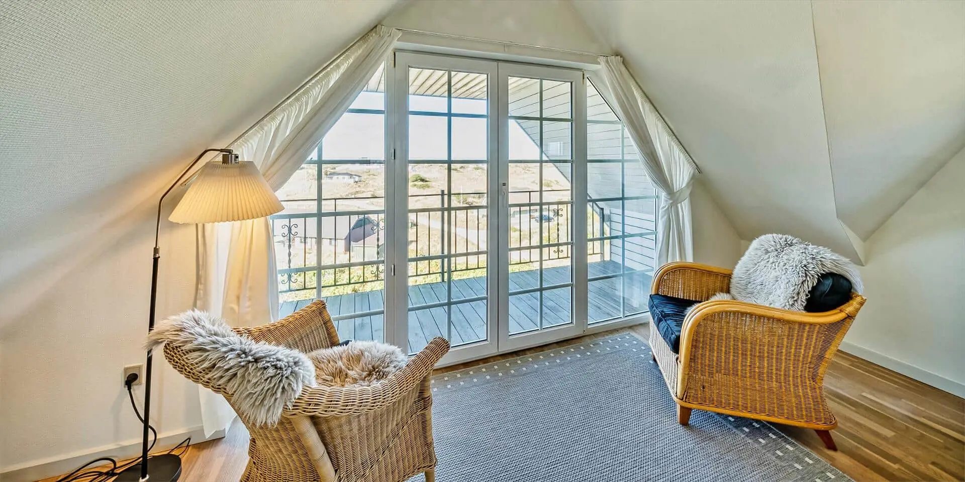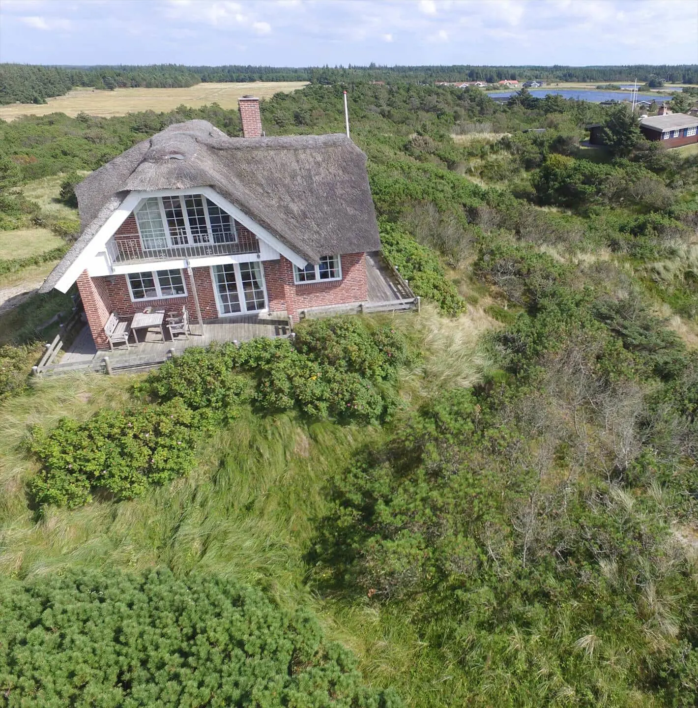 Draußen bieten das Grundstück gute Möglichkeiten zum Beisammensein und zum Zurückziehen in die Sonne. Ein Balkon bietet einen schönen Blick über die Landschaft mit den Ferienhäusern, die wie kleine Tupfer in den Dünen liegen, und von hier aus kannst du den morgendlichen Tau oder die warmen Töne der Abendsonne genießen. Die Terrasse und die Außenbereiche laden zu Mahlzeiten im Freien, Sonnenbädern und Spielen ein. Nur wenige Schritte vom Haus entfernt liegt der Strand — ein leichter, stimmungsvoller Spaziergang führt dich hinunter zur Nordsee, sodass du morgens oder abends problemlos ein erfrischendes Bad nehmen kannst und die salzige Luft sowie das Rauschen der Wellen den Tag vollkommen machen.