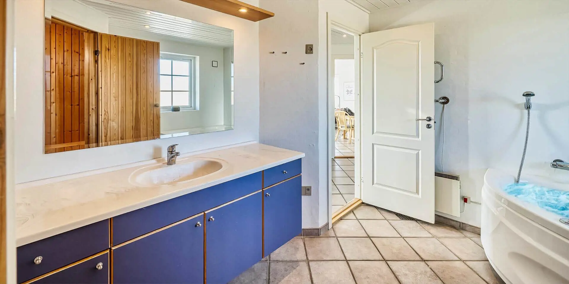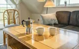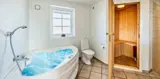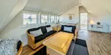Tritt ein in geräumige, helle und stilvolle Aufenthaltsräume, in denen große Fenster Tageslicht hereinlassen und eine angenehme, einladende Atmosphäre schaffen. Jede Etage verfügt über ein eigenes Wohnzimmer, Badezimmer und Schlafbereich, sodass ihr euch leicht aufteilen könnt, ohne den Kontakt zu verlieren — perfekt für zwei Familien, die tagsüber ihre privaten Zonen haben und sich dennoch zu Mahlzeiten und gemütlichen Abenden versammeln wollen. Die Einrichtung ist schlicht und modern mit warmen Materialien und bequemen Möbeln; die Sofabereiche laden zu langen Gesprächen, Spielen und ruhigen Lesestunden ein. Aus einigen Räumen kannst du die taktilen Silhouetten der Dünen durch die Fenster erahnen, und abends entsteht rund um den Brennofen oder sanfte Lampen eine besondere Stimmung, die es leicht macht, zur Ruhe zu kommen und die Familie zu gemeinsamen Erlebnissen und Gesprächen zu versammeln. Das Haus eignet sich auch hervorragend für Wellness‑Abende; Whirlpool und Sauna laden dazu ein, die Eindrücke des Tages wirken zu lassen, während der Wind draußen durch Gras und Dünen flüstert — ein ruhiges, sinnliches Erlebnis, das den Urlaub für Körper und Seele besonders wohltuend macht.