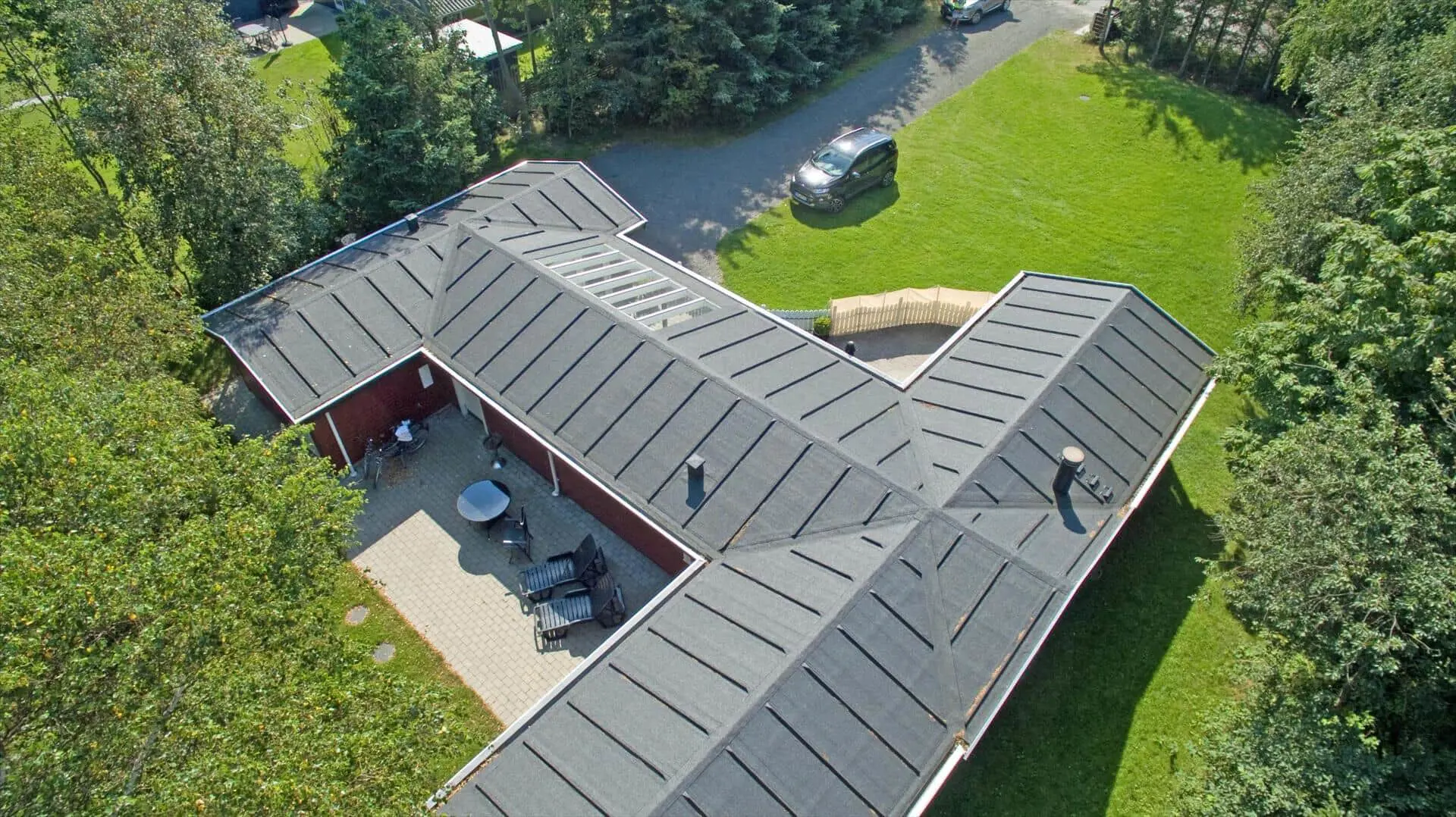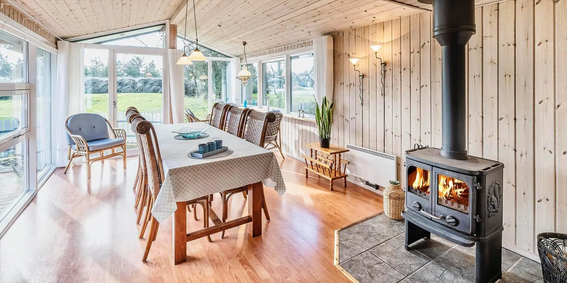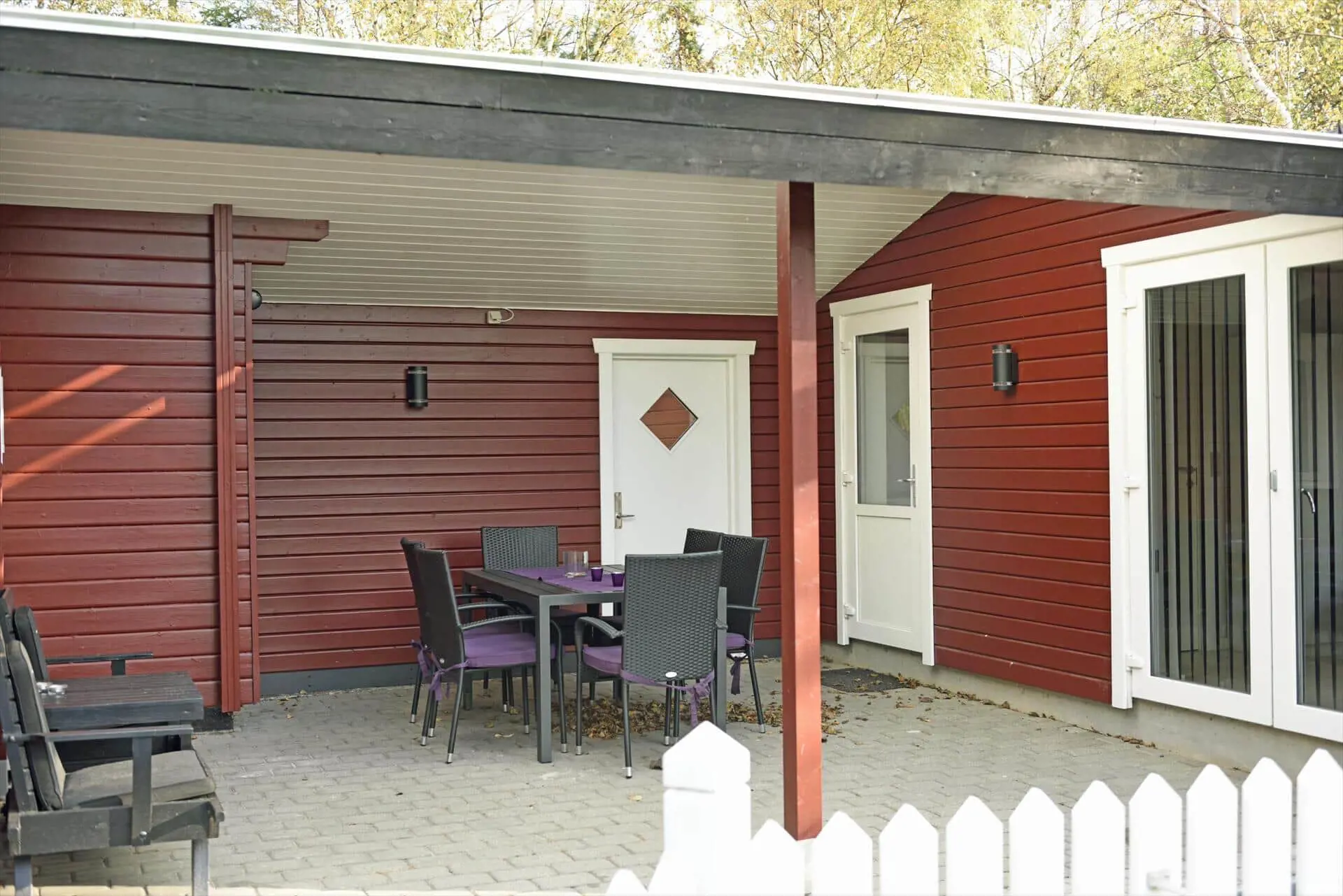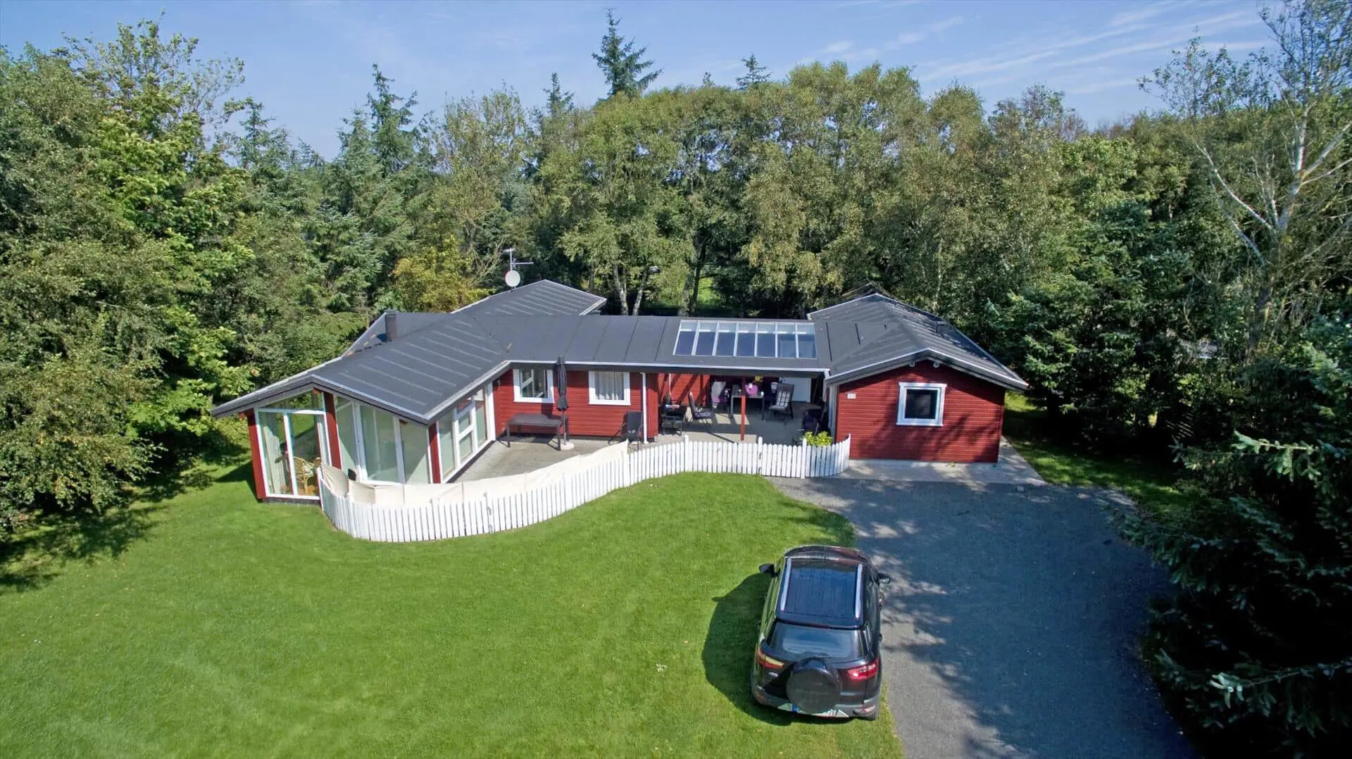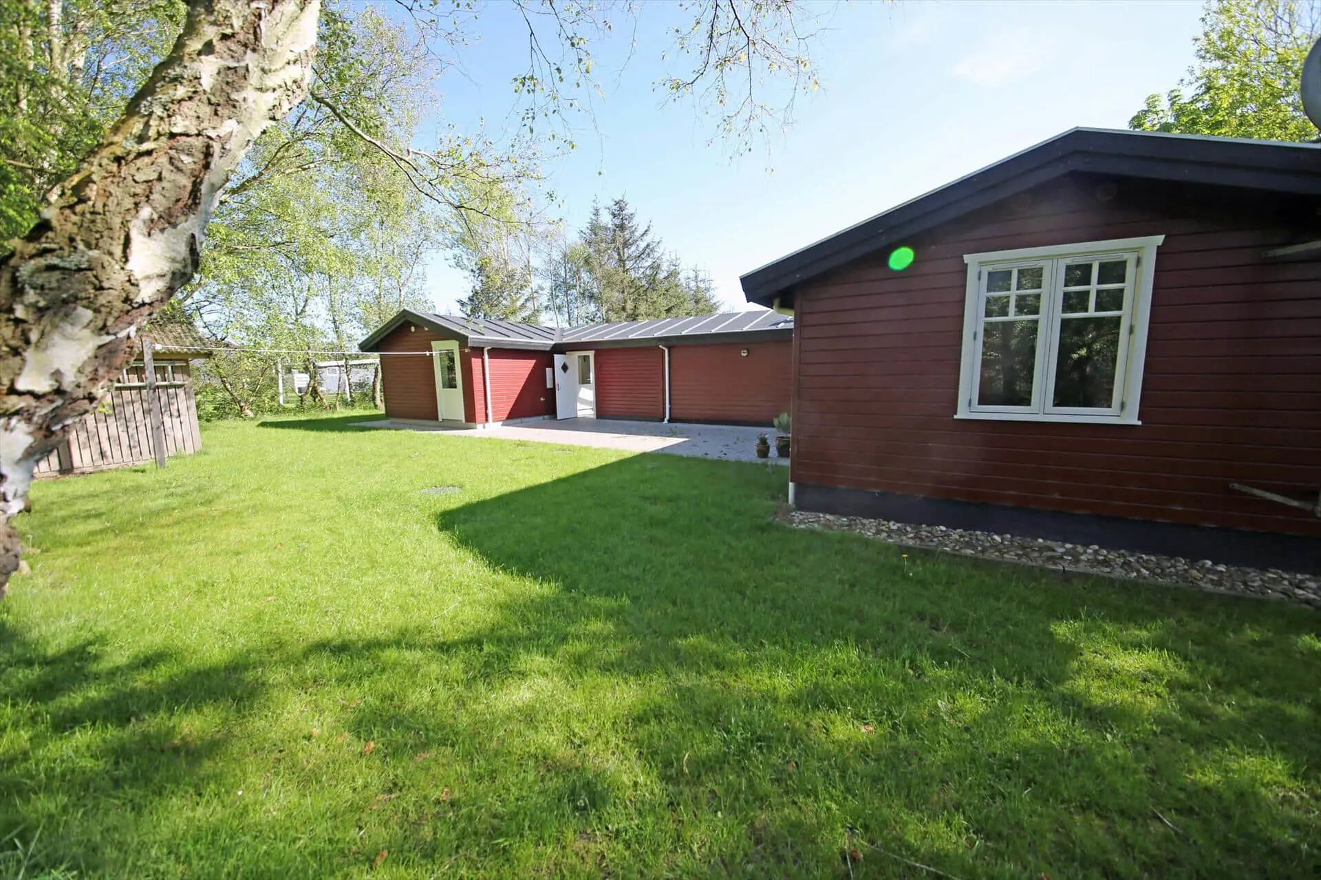 Draußen erwartet dich eine praktische, eingezäunte Terrasse mit bequemen Gartenmöbeln — ideal, wenn kleine Kinder oder Hunde sicher spielen sollen. Ein großer Teil der Terrasse ist mit transparenten Dachplatten überdacht, sodass du bei jedem Wetter trocken sitzen und dich trotzdem der Natur nahe fühlen kannst. Das private Grundstück mit großer Rasenfläche und umgebenden Bäumen bietet Platz zum Spielen, Ballspielen oder für ein Picknick auf der Decke. Hier kannst du den Morgenkaffee zum Vogelgesang genießen, die Kinder unbesorgt spielen lassen oder den Tag mit einem Glas Wein unter freiem Himmel ausklingen lassen, bevor ihr euch ins warme Wohnzimmer und die Gemütlichkeit des Brennofens zurückzieht.