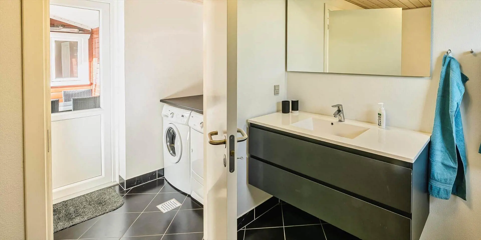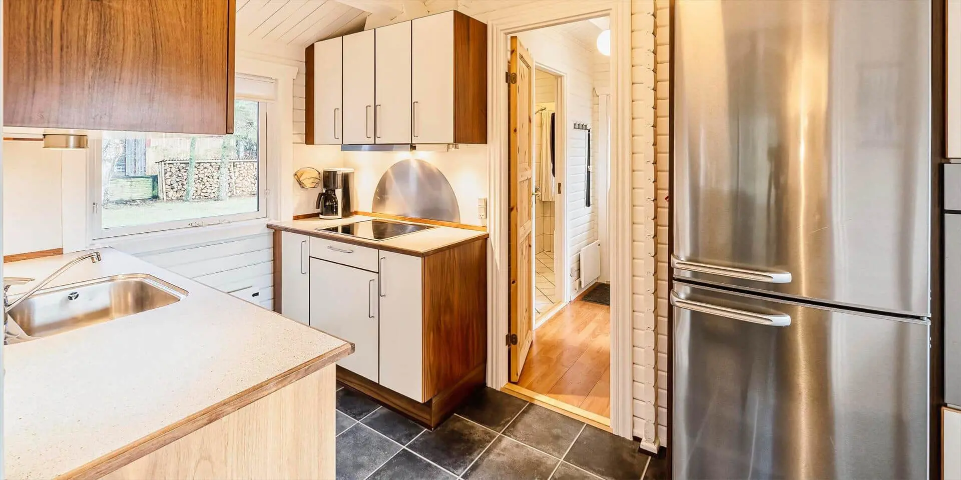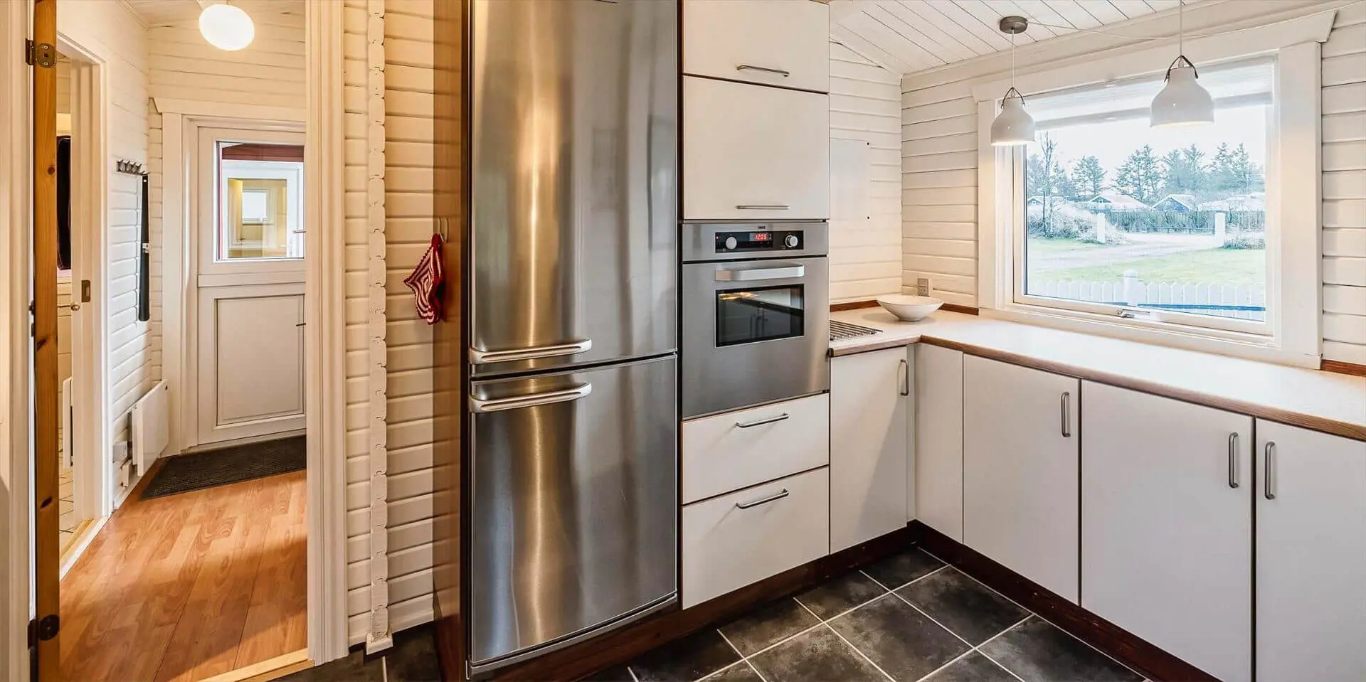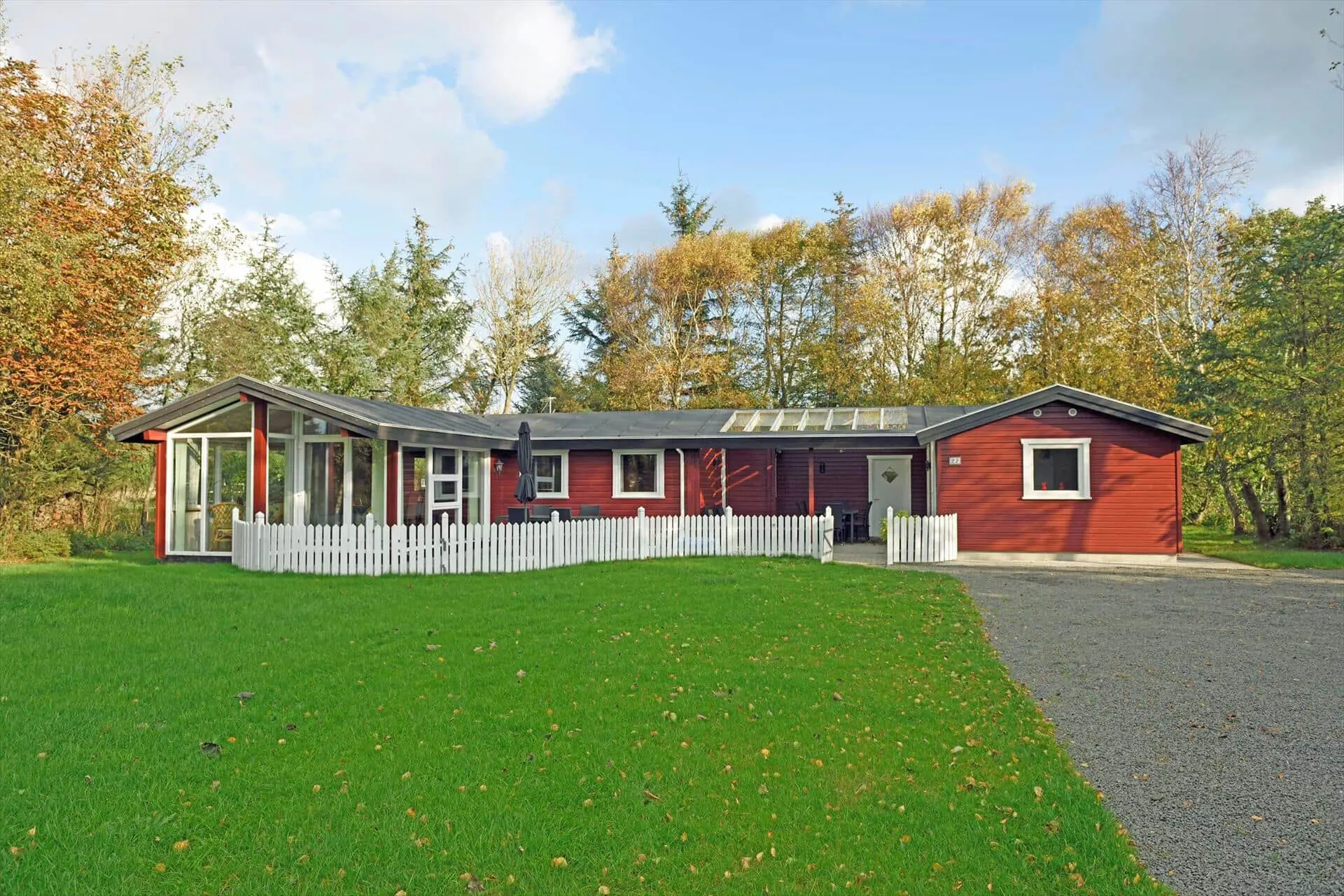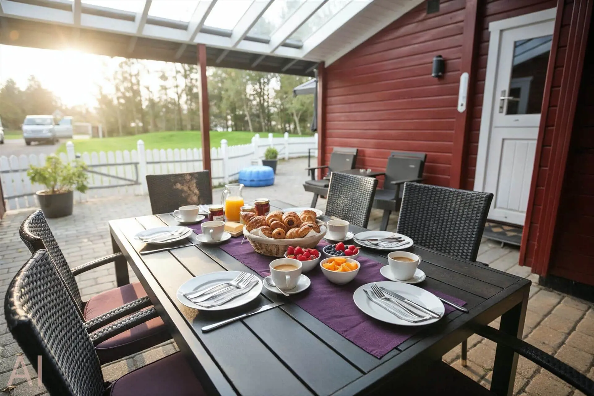 Draußen erwartet dich eine praktische, eingezäunte Terrasse mit bequemen Gartenmöbeln — ideal, wenn kleine Kinder oder Hunde sicher spielen sollen. Ein großer Teil der Terrasse ist mit transparenten Dachplatten überdacht, sodass du bei jedem Wetter trocken sitzen und dich trotzdem der Natur nahe fühlen kannst. Das private Grundstück mit großer Rasenfläche und umgebenden Bäumen bietet Platz zum Spielen, Ballspielen oder für ein Picknick auf der Decke. Hier kannst du den Morgenkaffee zum Vogelgesang genießen, die Kinder unbesorgt spielen lassen oder den Tag mit einem Glas Wein unter freiem Himmel ausklingen lassen, bevor ihr euch ins warme Wohnzimmer und die Gemütlichkeit des Brennofens zurückzieht.