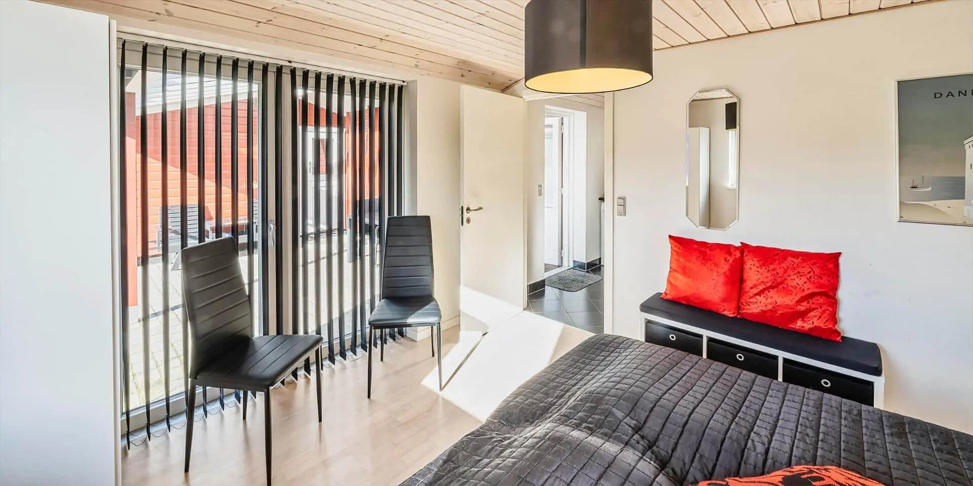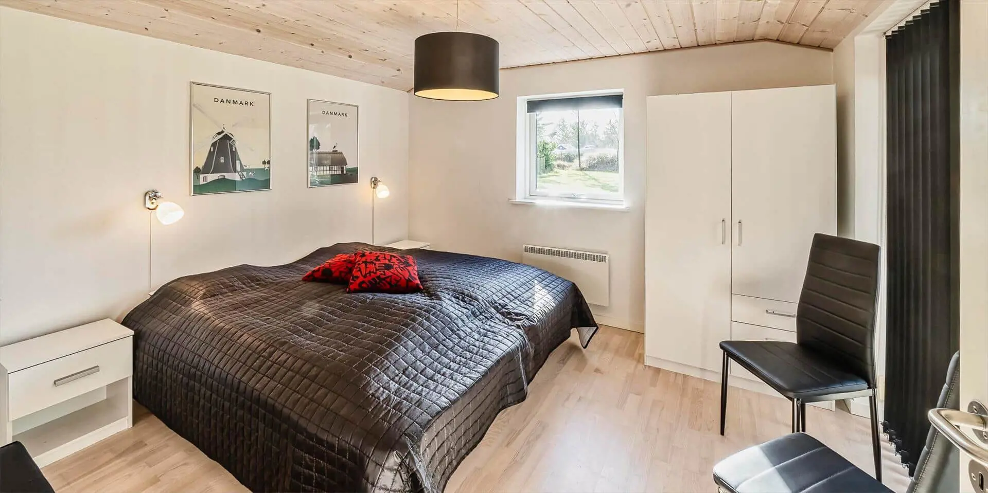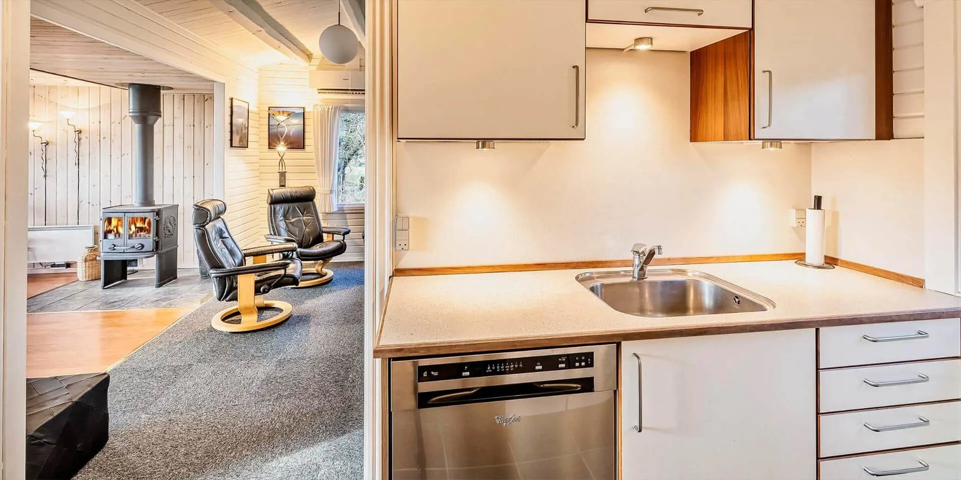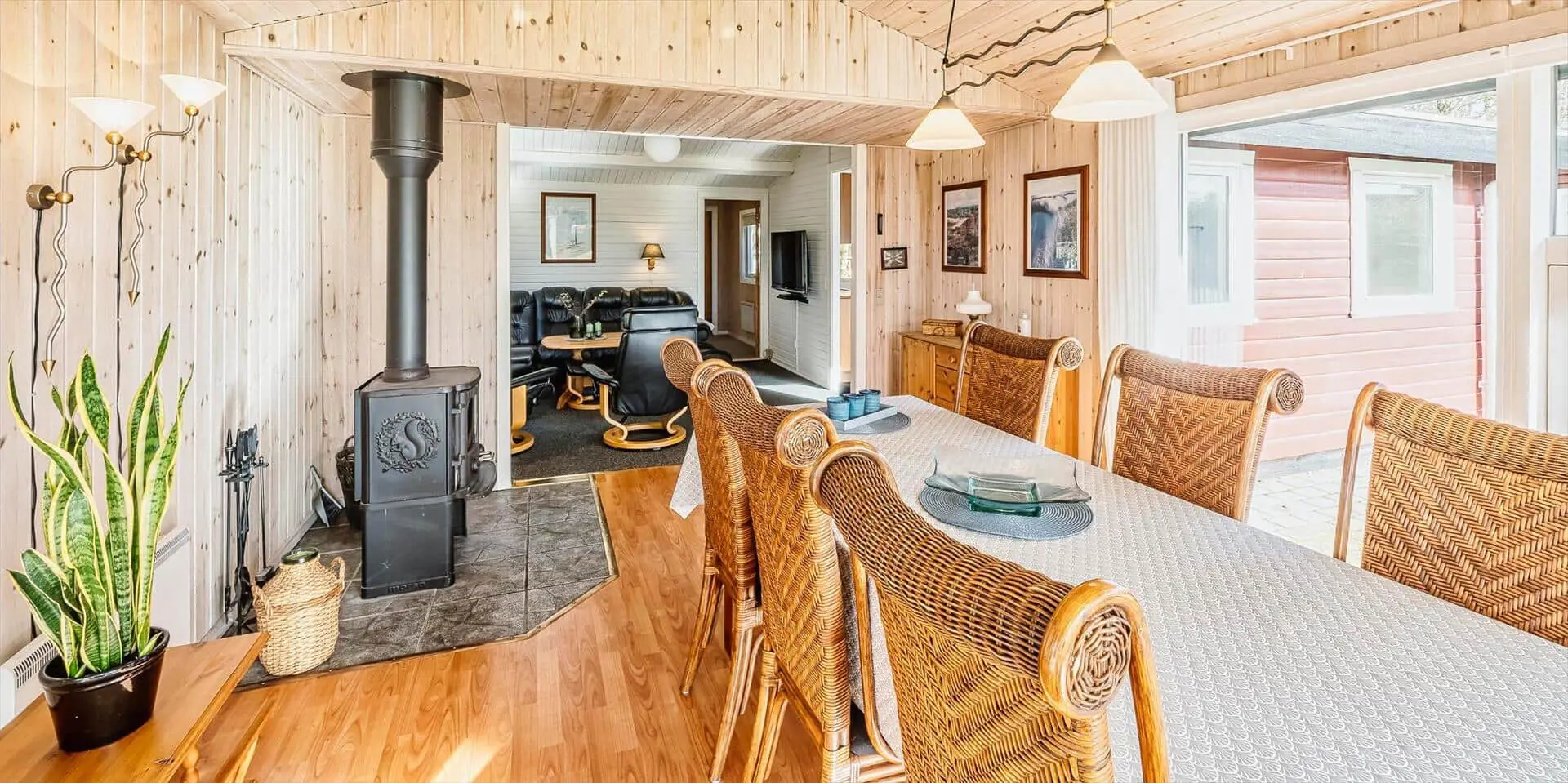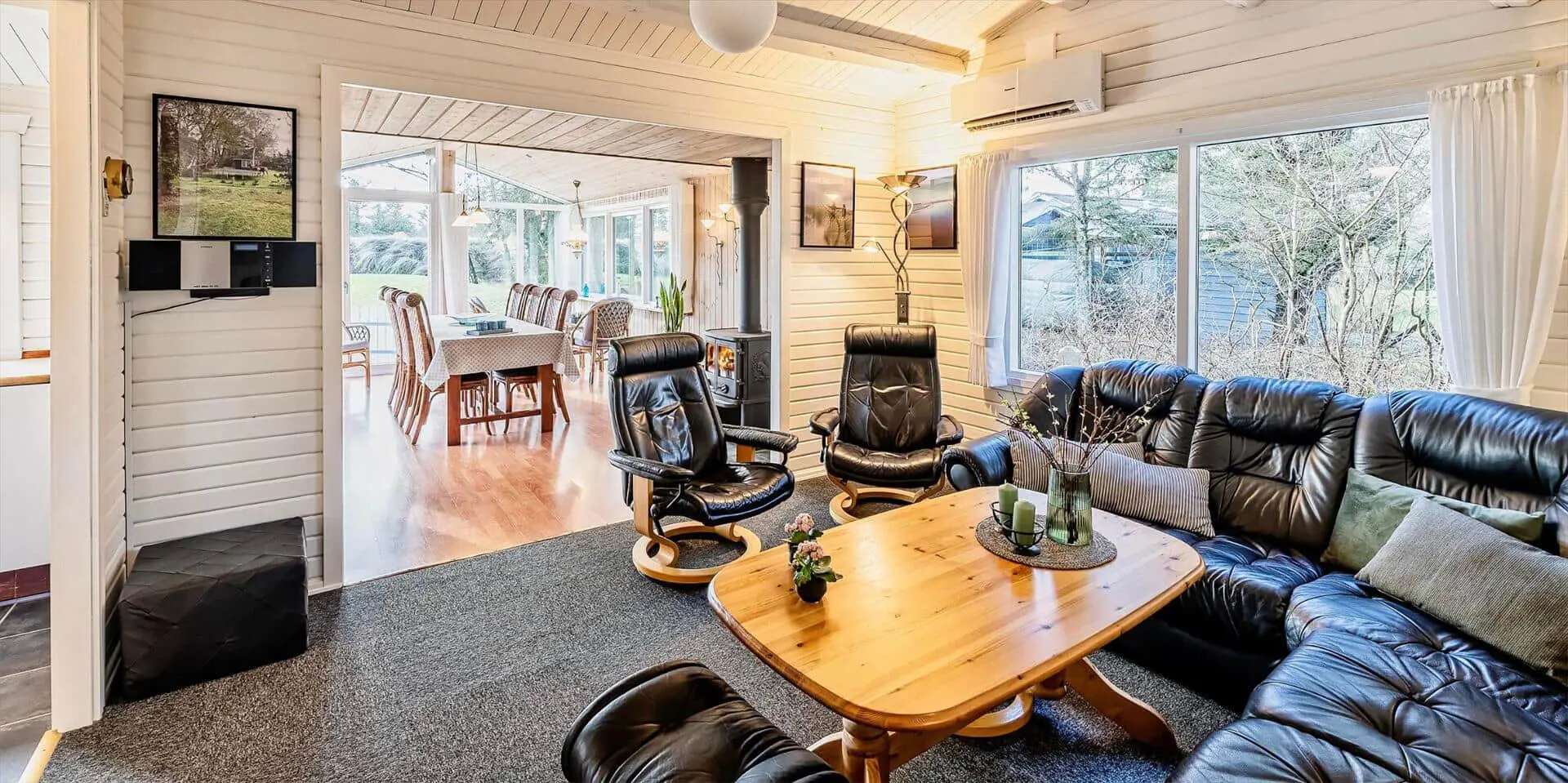 Drinnen findest du eine moderne, luftige Einrichtung, in der der zentral platzierte Brennofen Wärme und Atmosphäre sowohl im Essbereich als auch im Wohnraum schafft. Die große, gemütliche Sofaecke lädt dazu ein, dem Knistern des Feuers zu lauschen, und der Esstisch, umgeben von Panoramafenstern, bietet eine nahezu ungestörte Verbindung zur Landschaft draußen. Die offene Küche zum Wohnbereich hin macht es einfach, gemeinsam zu kochen und während der Zubereitung im Gespräch zu bleiben. Durchdachte Materialwahl und Lichtführung lassen Tageslicht durch die großen Fenster in die Räume strömen, während Einrichtungsdetails eine ruhige, hochwertige Atmosphäre erzeugen.