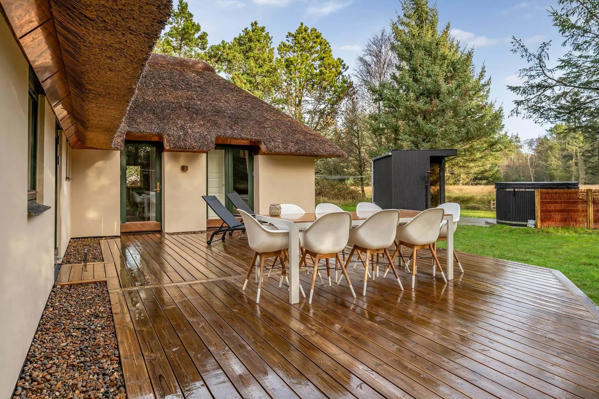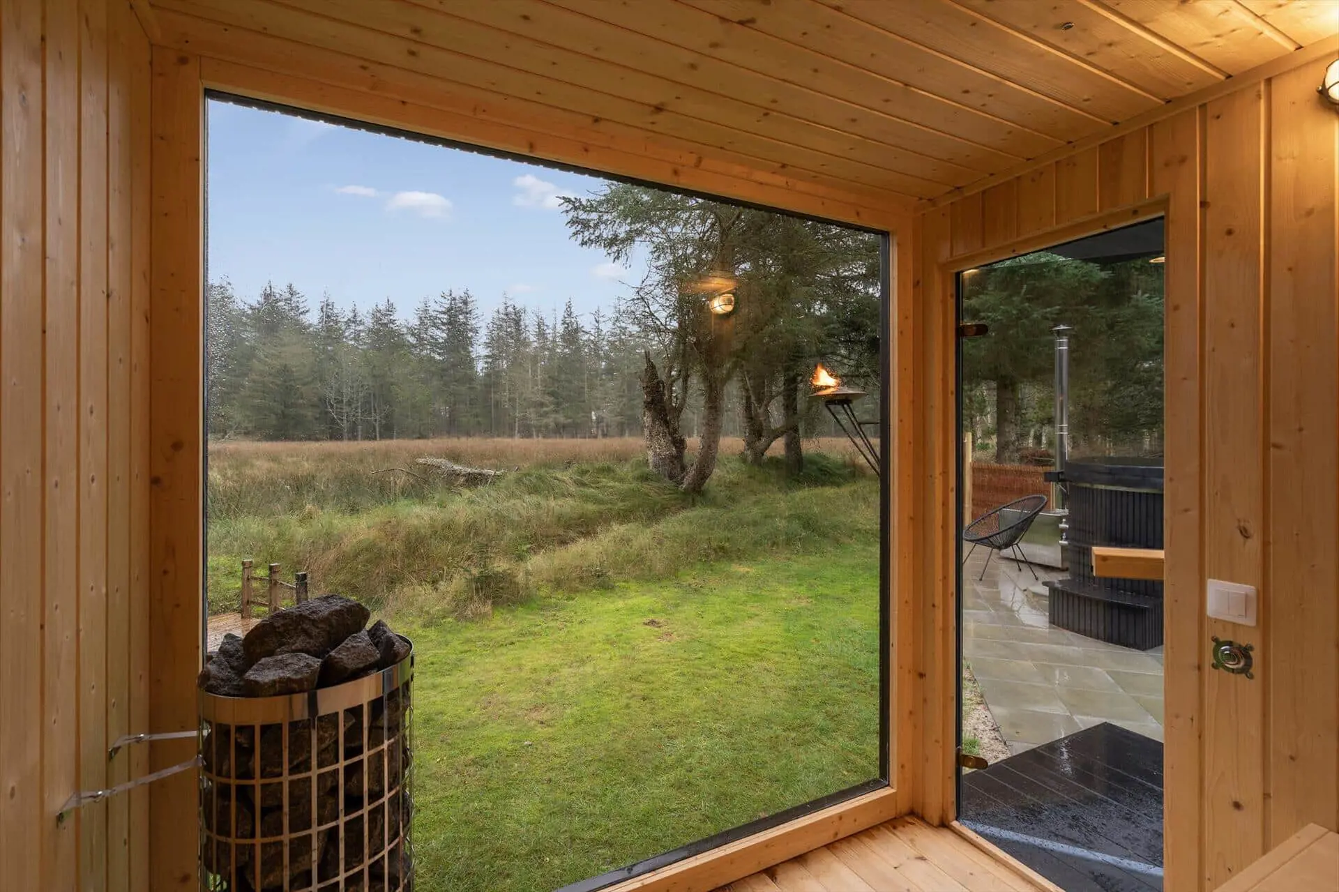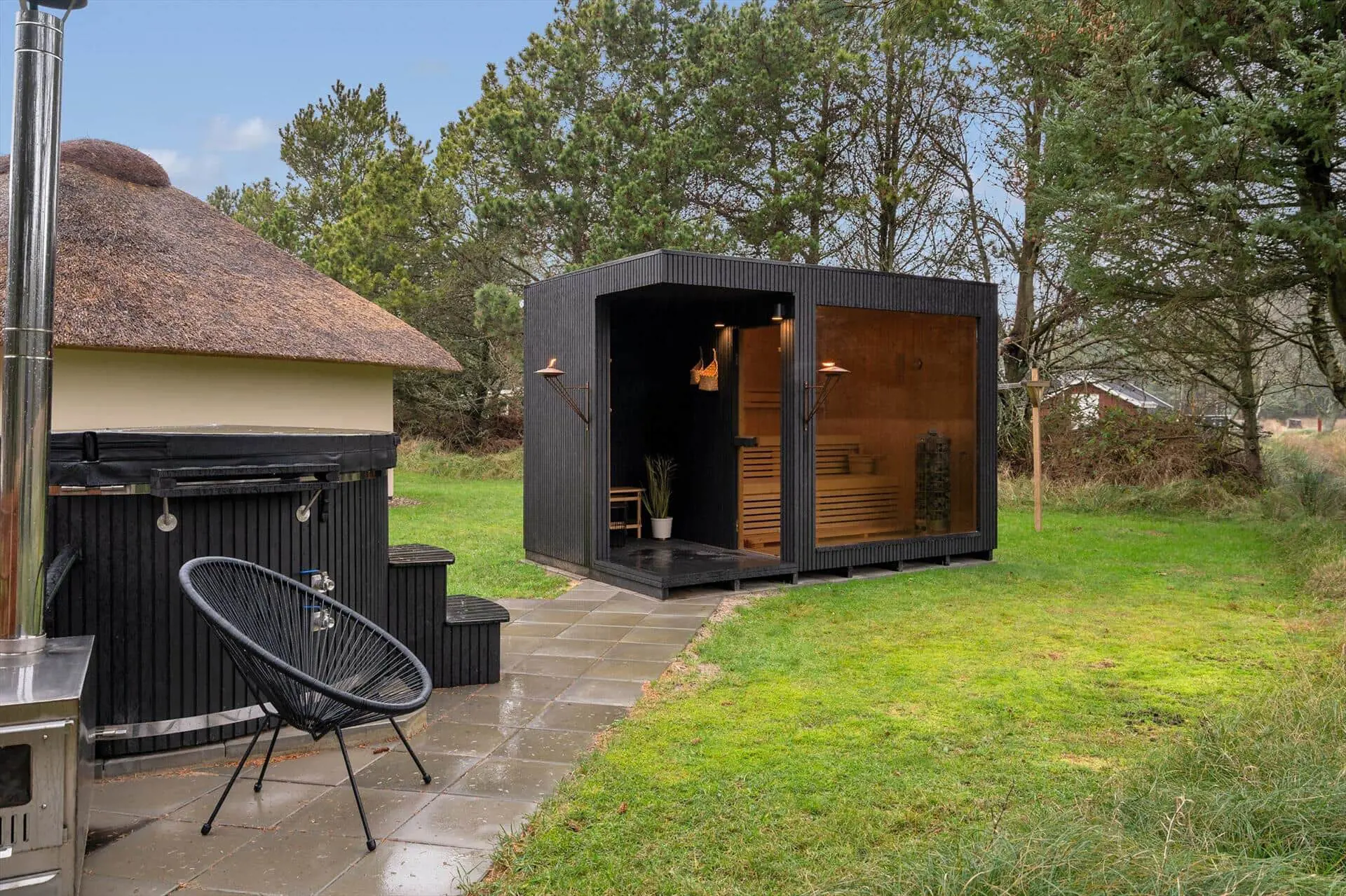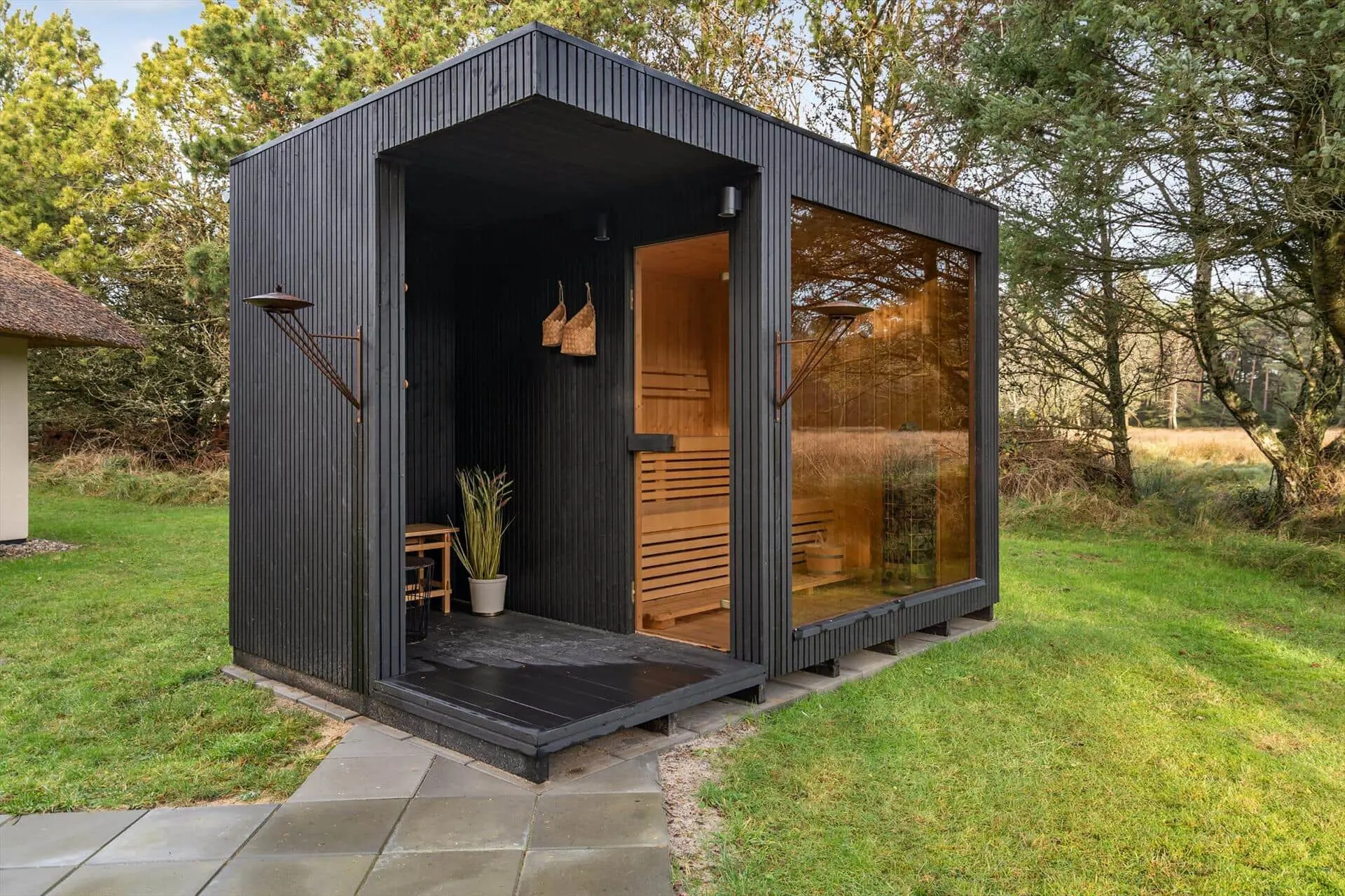Die Außenanlagen sind sehr durchdacht und bieten Platz für Aktivität und Erholung. Die schöne Terrasse fungiert als Outdoor‑Aufenthaltsraum mit gemütlichen Sitzbereichen, und die gepflegte Rasenfläche mit Spielgeräten bietet Kindern sichere Spielflächen. Eine separat stehende Saunahütte ist ein besonderes Highlight auf dem Grundstück — sie liegt mit herrlichem Blick über den Garten und Richtung des nahegelegenen Waldes, sodass du Wärme und Naturruhe in einem Atemzug genießen kannst. Daneben befindet sich ein Wildnisbad, in dem du ein warmes Bad mit einem kalten Getränk unter dem Sternenhimmel genießen kannst. Die Terrasse und Außenbereiche laden zu morgendlichem Kaffee in der Sonne, Picknicks auf der Wiese oder zum Zusammensitzen und Plaudern ein — hier ist Raum für Spiel, Besinnlichkeit und gemütliche Gespräche unter dem offenen Himmel.
