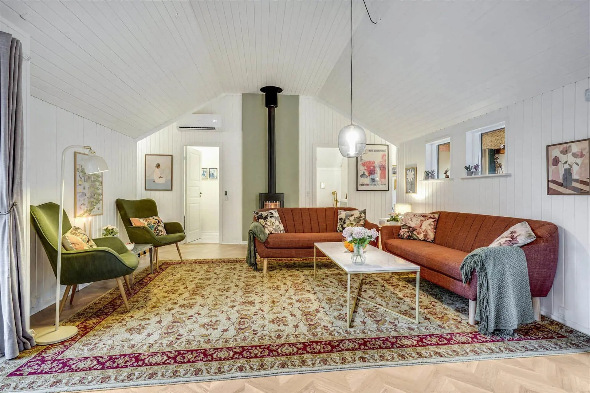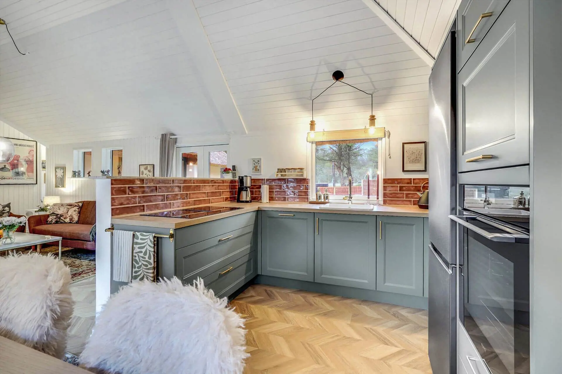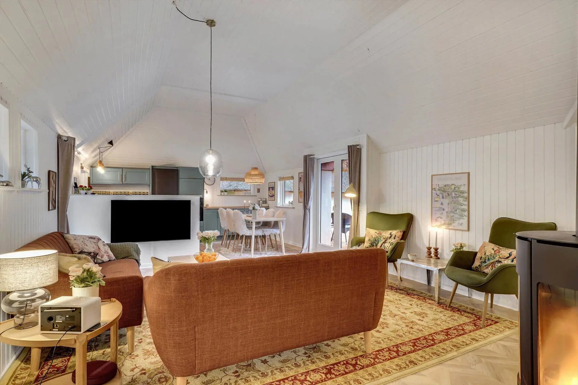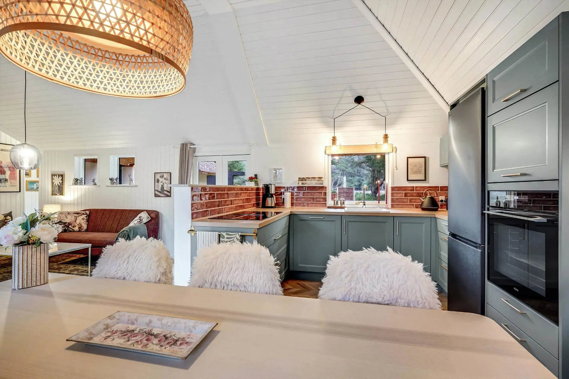 Im Inneren des Hauses wirst du von einer stimmigen und geschmackvollen Einrichtung empfangen, in der jeder Raum eine persönliche Handschrift in Material‑ und Farbwahl zeigt. Der offene Koch‑ und Wohnbereich ist so gestaltet, dass er Gemeinschaft fördert — hier möchte jeder kochen, denn das Spiel aus Boden, Wandfliesen und Schrankfronten macht das Zubereiten der Mahlzeiten zu einer kleinen Inszenierung. Die Einrichtung enthält besondere Details und handverlesene Elemente, die jeder Ecke Charakter geben; gemütliche Nischen laden zum Lesen ein und die geschmackvoll eingerichteten Schlafzimmer bieten ruhige Rückzugsorte. Die beiden Bäder sind im Messing‑Thema gehalten, und eines überrascht mit einer besonderen Badewanne, die zu entspannten Stunden einlädt. Insgesamt wirkt das Haus wohnlich und gleichzeitig verspielt — ein Ort, der die Sinne verwöhnt und Behaglichkeit in den Mittelpunkt stellt.