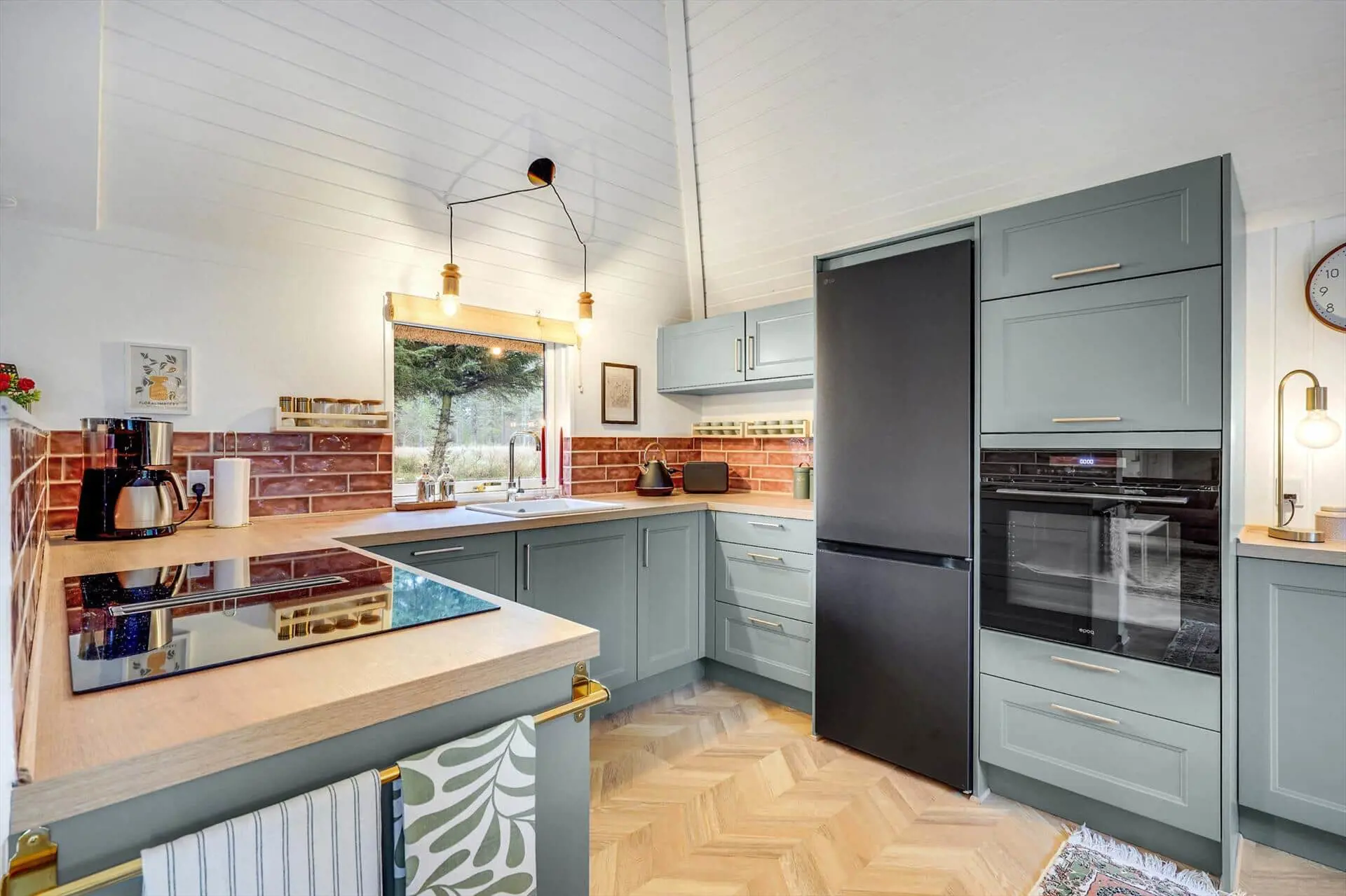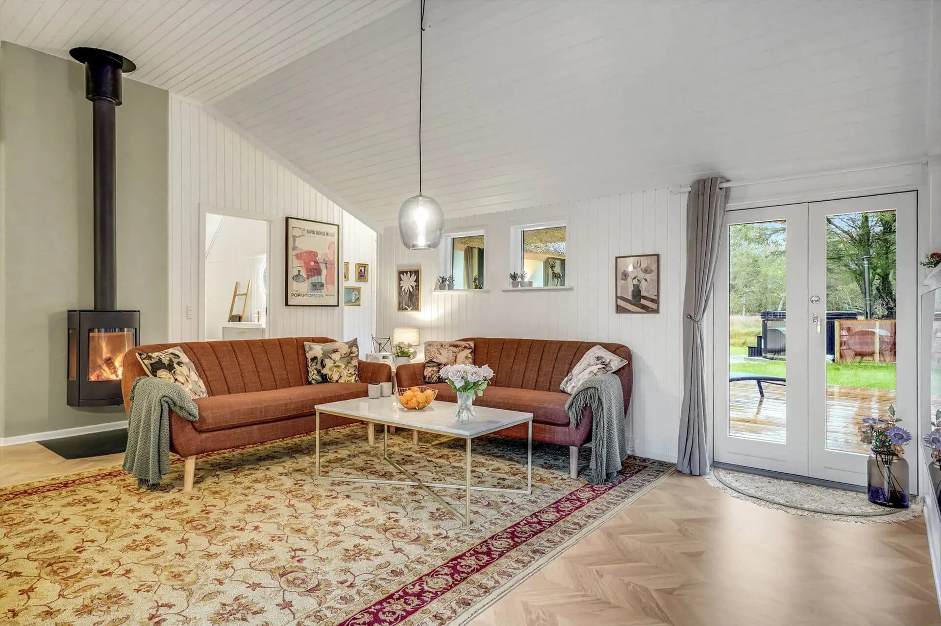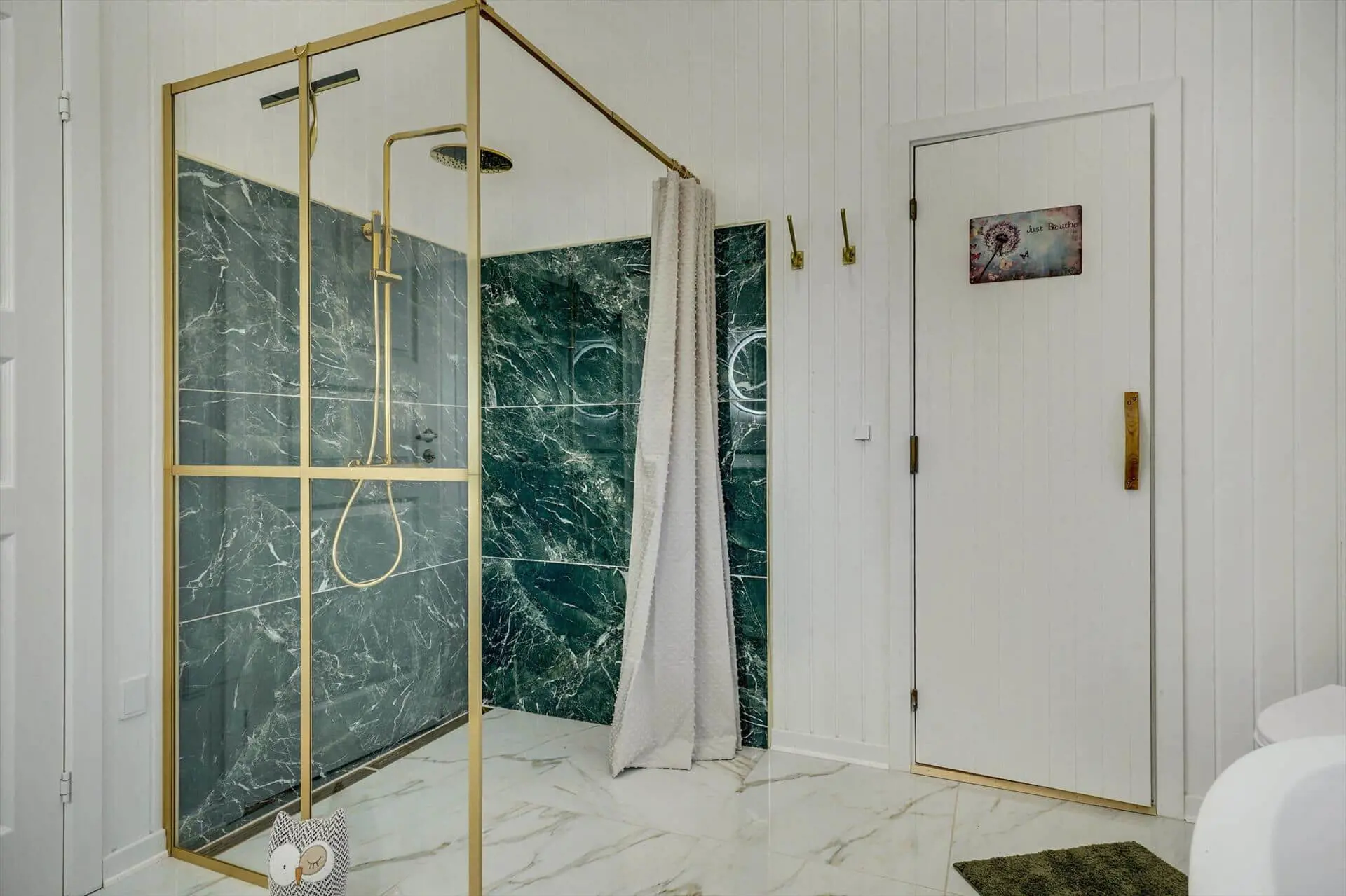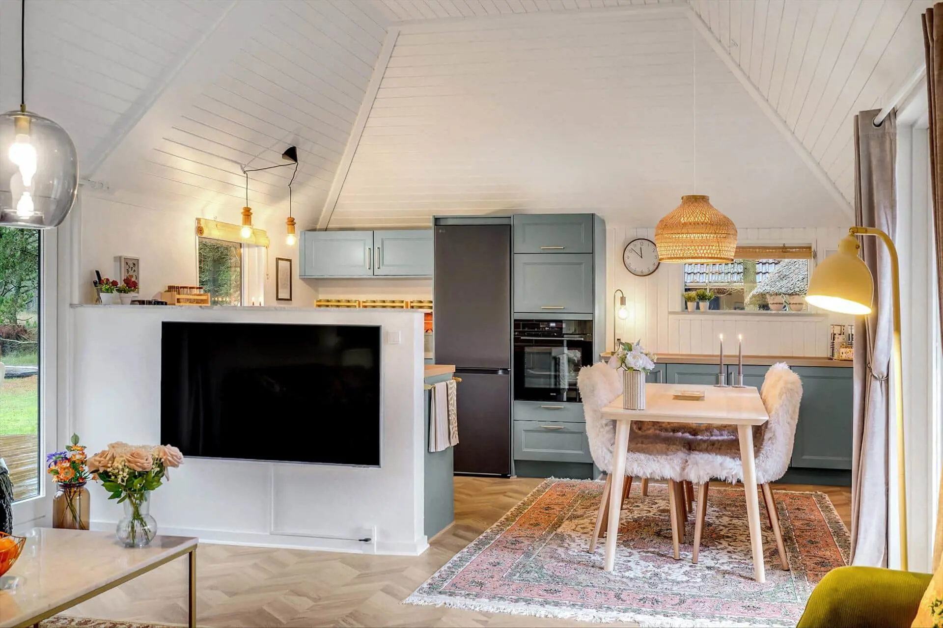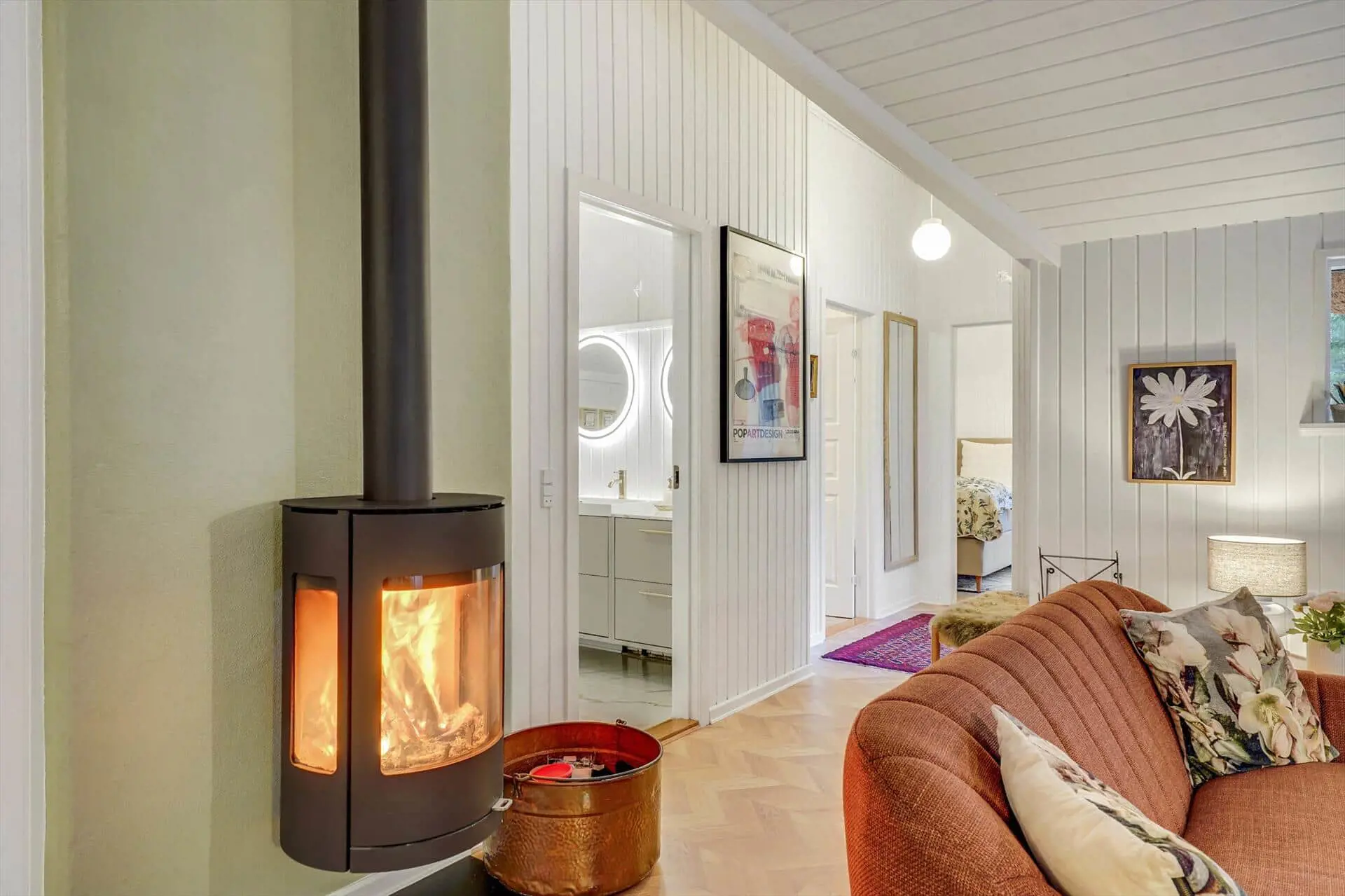 Im Inneren des Hauses wirst du von einer stimmigen und geschmackvollen Einrichtung empfangen, in der jeder Raum eine persönliche Handschrift in Material‑ und Farbwahl zeigt. Der offene Koch‑ und Wohnbereich ist so gestaltet, dass er Gemeinschaft fördert — hier möchte jeder kochen, denn das Spiel aus Boden, Wandfliesen und Schrankfronten macht das Zubereiten der Mahlzeiten zu einer kleinen Inszenierung. Die Einrichtung enthält besondere Details und handverlesene Elemente, die jeder Ecke Charakter geben; gemütliche Nischen laden zum Lesen ein und die geschmackvoll eingerichteten Schlafzimmer bieten ruhige Rückzugsorte. Die beiden Bäder sind im Messing‑Thema gehalten, und eines überrascht mit einer besonderen Badewanne, die zu entspannten Stunden einlädt. Insgesamt wirkt das Haus wohnlich und gleichzeitig verspielt — ein Ort, der die Sinne verwöhnt und Behaglichkeit in den Mittelpunkt stellt.