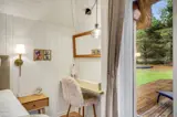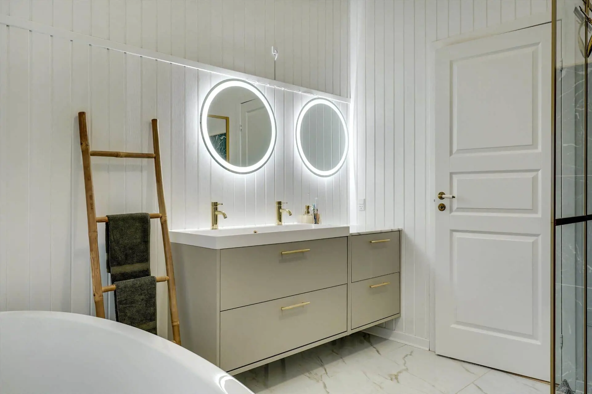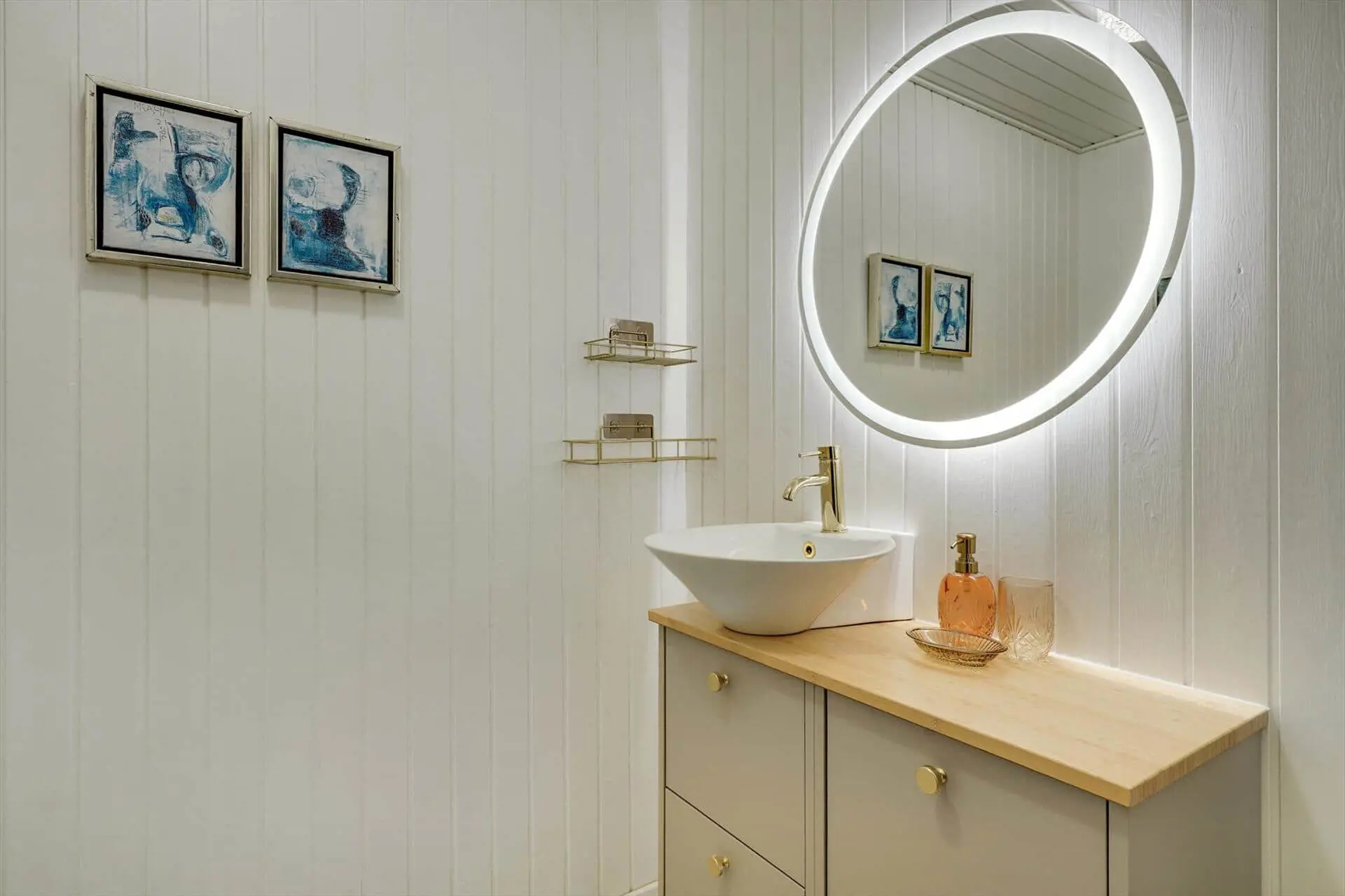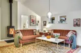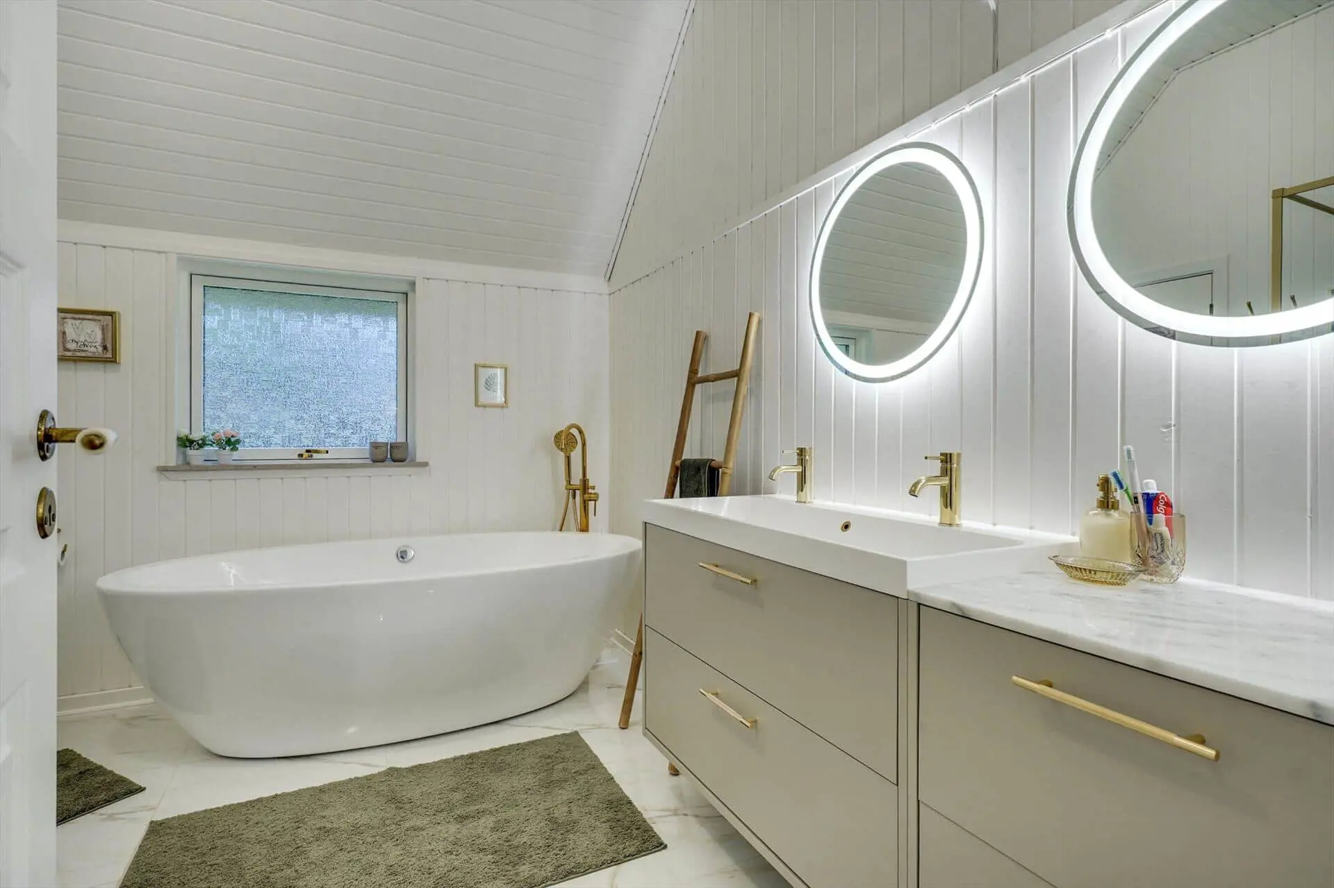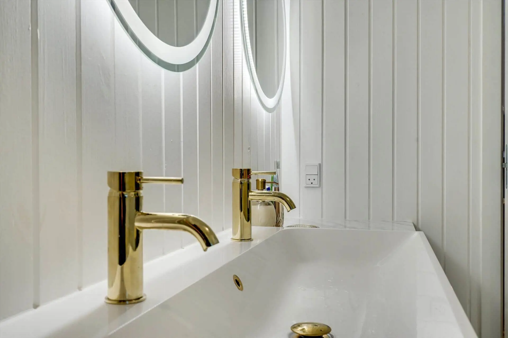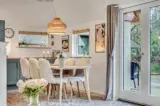 Im Inneren des Hauses wirst du von einer stimmigen und geschmackvollen Einrichtung empfangen, in der jeder Raum eine persönliche Handschrift in Material‑ und Farbwahl zeigt. Der offene Koch‑ und Wohnbereich ist so gestaltet, dass er Gemeinschaft fördert — hier möchte jeder kochen, denn das Spiel aus Boden, Wandfliesen und Schrankfronten macht das Zubereiten der Mahlzeiten zu einer kleinen Inszenierung. Die Einrichtung enthält besondere Details und handverlesene Elemente, die jeder Ecke Charakter geben; gemütliche Nischen laden zum Lesen ein und die geschmackvoll eingerichteten Schlafzimmer bieten ruhige Rückzugsorte. Die beiden Bäder sind im Messing‑Thema gehalten, und eines überrascht mit einer besonderen Badewanne, die zu entspannten Stunden einlädt. Insgesamt wirkt das Haus wohnlich und gleichzeitig verspielt — ein Ort, der die Sinne verwöhnt und Behaglichkeit in den Mittelpunkt stellt.