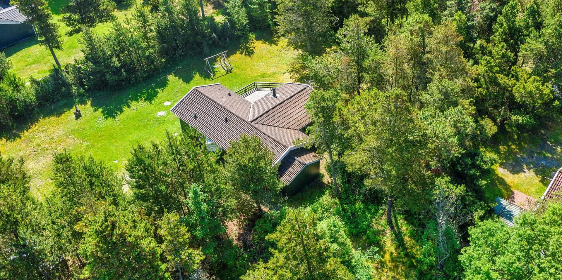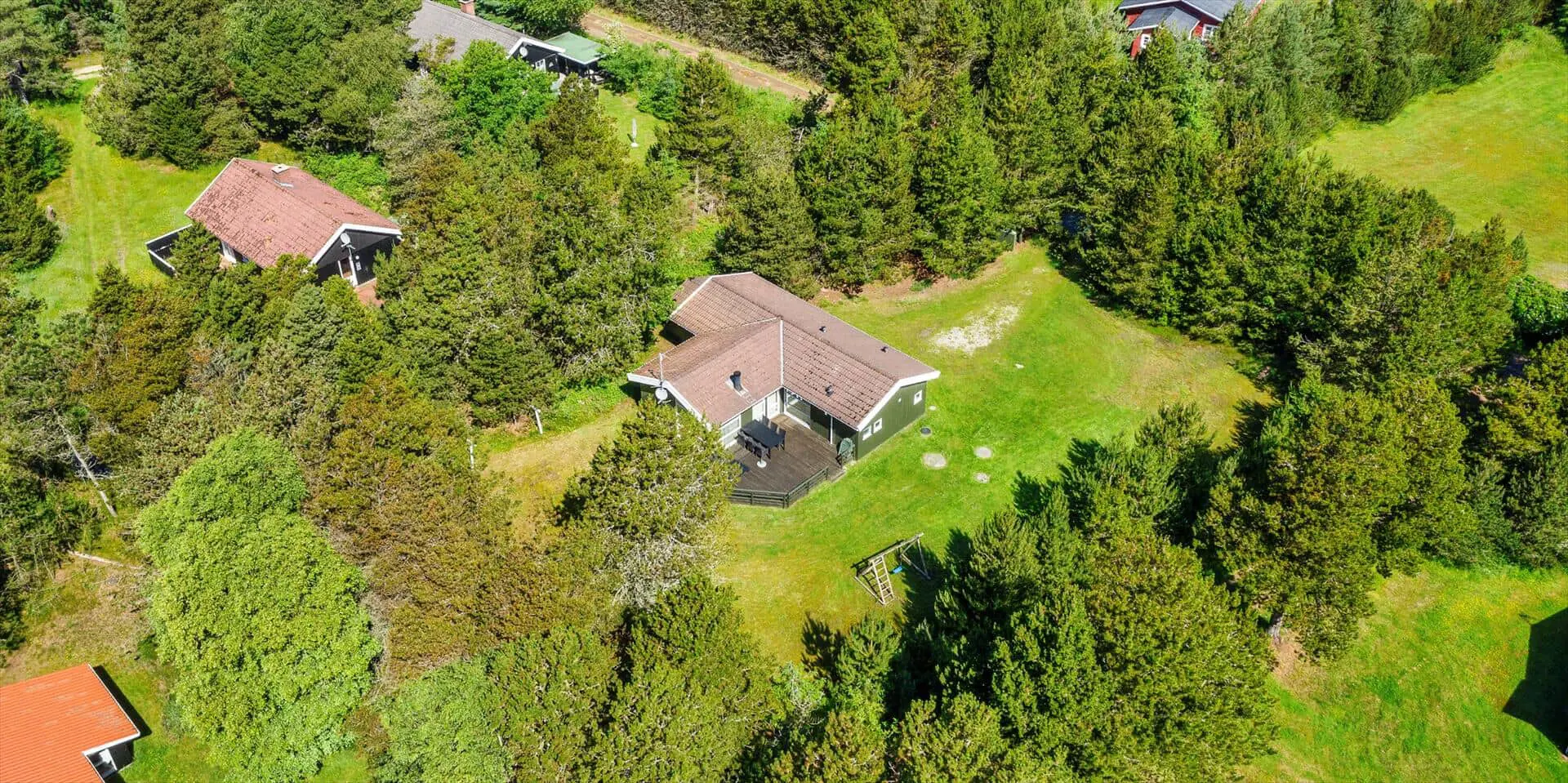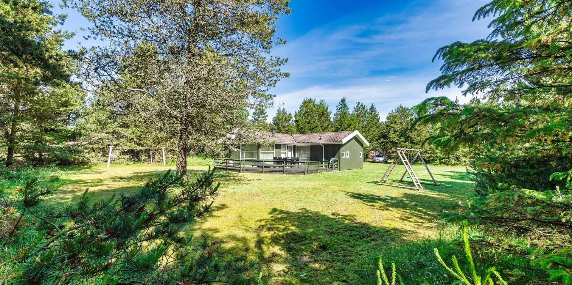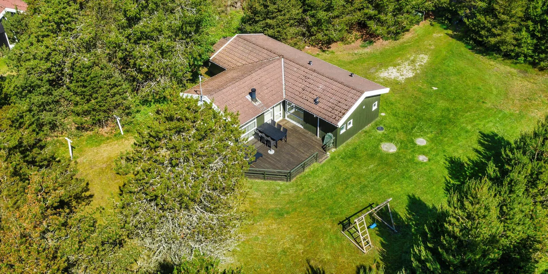 Das Haus liegt auf einem großzügigem Natur- und Waldgrundstück gelegen. Es bietet Platz für 6 bis 8 Personen. Das Ferienhaus ist ca. 1 Km vom Strand entfernt. Das Wohnzimmer ist nett eingerichtet und verfügt über eine gemütliche Rundsitzecke mit Kamin. Das deutsche Fernsehprogramm empfangen Sie über Stofa, dadurch empfangen Sie nur 5-8 deutsche Kanäle oder über Google Chromecast. DVD-Spieler. Es befindet sich eine Warmepumpe im Ferienhaus. Mit dieser Warmepumpe haben sie die Möglichkeit die Stromkosten zu senken, denn die Warmepumpe ist energiesparend. Der Küchenbereich ist zur Essecke offen gehalten, sozusagen eine Wohnküche. Die Kochinsel verfügt über einen Herd mit Platten und einem Backofen. Desweiteren ist die Küche mit einer Geschirrspülmaschine, einer Mikrowelle und einer Kühl- und Gefrierkombination ausgestattet. Das Badezimmer beinhaltet ein WC, ein Handwaschbecken und eine Dusche. Die Waschmaschine und der Trockner sind ebenfalls im Badezimmer untergebracht. In einen separate Badezimmer befindet sich der Whirlpool, eine Sauna und zusätzlich eine Dusche. Es gibt insgesamt 4 Schlafzimmer im Ferienhaus. Zwei der Schlafzimmer verfügen über je einem Doppelbett und die beiden anderen Schlafzimmer haben je ein Etagenbett. Ein gemütlicher Terrassenbereich steht am Haus ebenfalls zur Verfügung. Das Ferienhaus verfügt über einen Internetanschluss (W-Lan). Es sind max. drei Haustiere erlaubt. Für die Kleinen Gäste steht ein Schaukelstativ auf dem Grundstück zur Verfügung. Das Ferienhaus ist in 1968 erbaut worden und in 1991 renoviert. Rauchen im Haus ist nicht erlaubt.