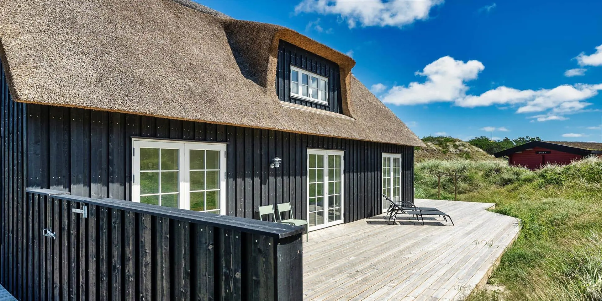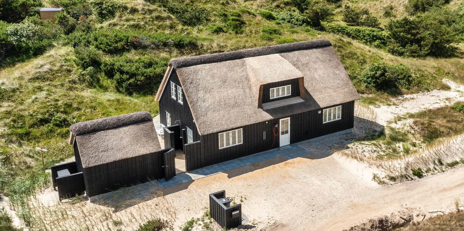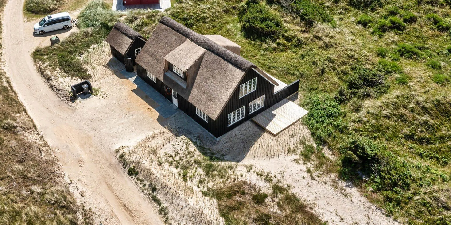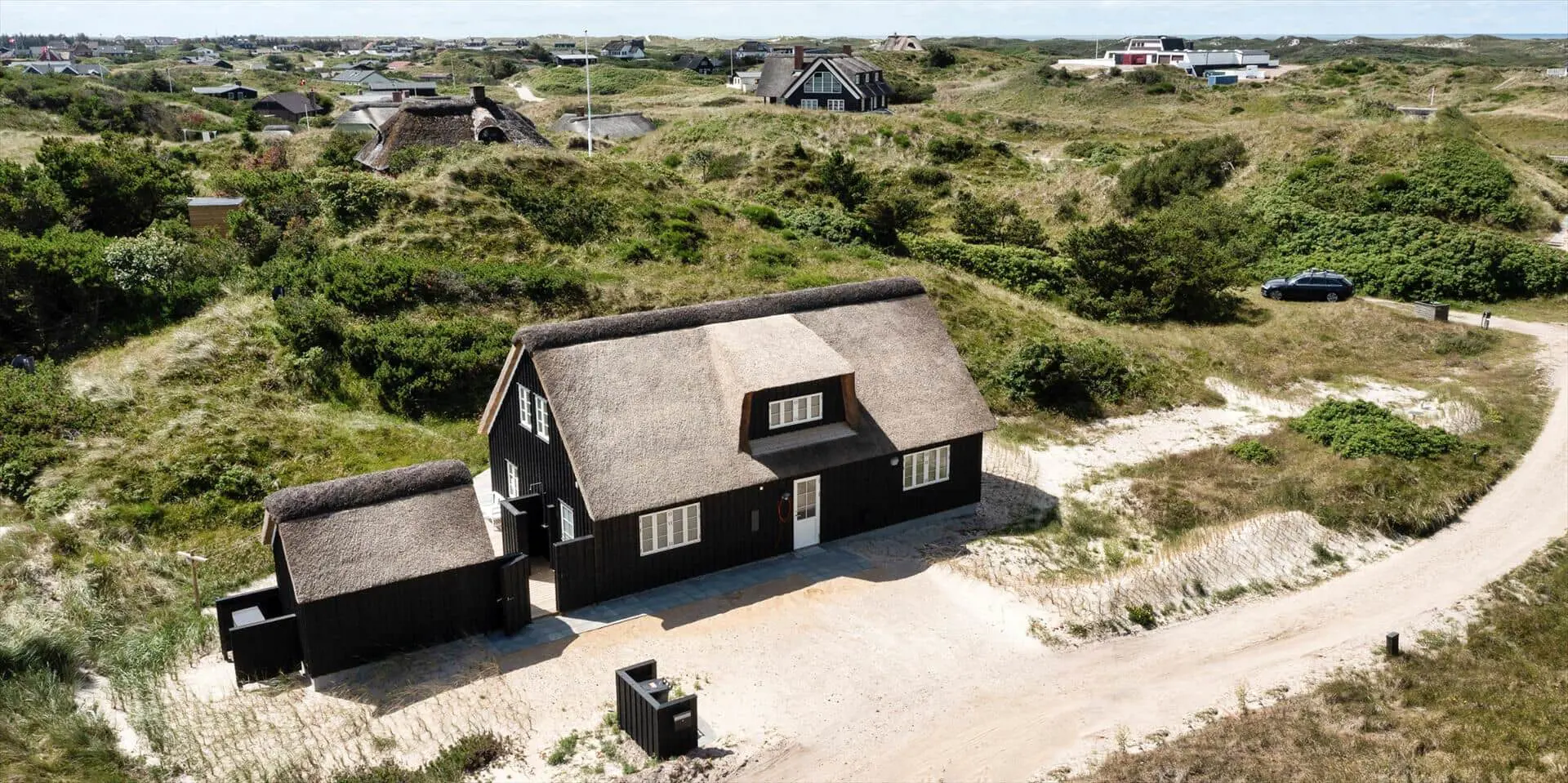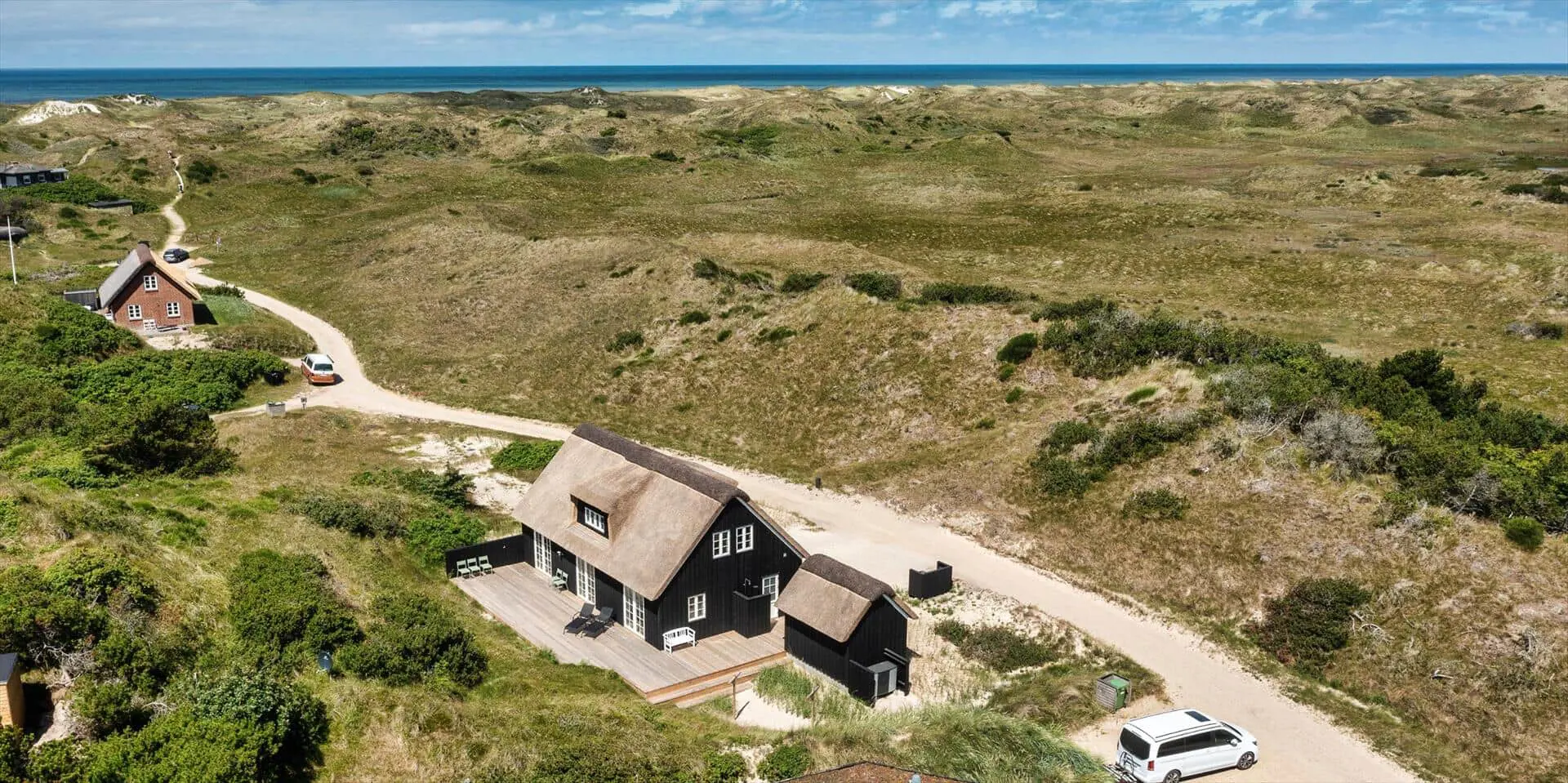 Der Strand ist ca. 400 Meter vom Haus entfernt. Das Ferienhaus selbst ist aus hochwertigen Materialien gebaut worden mit einem trendigen Design, das sich der Umgebung anpasst. Die Wohnfläche beträgt 157 qm2. Das Ferienhaus bietet eine wunderbare Atmosphäre im modernen und nordischen Stil. Im Erdgeschoss befinden sich der Eingangsbereich, der Wohn- und Essbereich und eine offene Küche, ein großes Badezimmer und ein Schlafzimmer. Über eine schöne Holztreppe gelangen Sie dann in das Obergeschoss. Das Ferienhaus wird im Erdgeschoss komplett mit einer Fußbodenheizung / Luft-Wasser-Wärmepumpe beheizt. Im Obergeschoss befinden sich weitere drei Schlafzimmer, ein kleines Gästebad und ein kleiner Flur oder auch Wohnbereich. Das Obergeschoss wird mit Elektroheizkörper geheizt. Das ganze Ferienhaus ist, außer in den Bädern und der Eingangsbereich, mit einem Laminat verlegt. Der Eingangsbereich ist großzügig gehalten und bietet genügend Platz für Garderobe und Schuhe. Der Wohn- und Essbereich ist zum Küchenbereich offengehalten. Das deutsche Fernsehen sollte über eine Parabolantenne empfangen werden können. Die dänischen Programme kommen über Smart TV. In einer Ecke im Wohnbereich ist ein kleiner Alkoven. Hier haben Sie die Möglichkeit zu entspannen und vielleicht oder auch Ihr Buch zu lesen. Die neue und trendige Einbauküche ist in einem tollen Design und bietet alles was Sie zum täglichen kochen benötigen. Die Küche verfügt über einen Herd mit Cerankochfeld, einem Backofen, einer Geschirrspülmaschine, und einer Kühl- und Gefrierkombination. Das große Badezimmer verfügt über eine Handwaschbecken mit reichlich Ablagefläche und Schränken, einem WC, einer Dusche und einer Sauna (wird max 60 Grad). Desweiteren sind die Waschmaschine und der Trockner hier im Bad untergebracht. Eine Tür damit Sie zum Terrassenbereich und der Aussendusche, die aber nur im Sommer genutzt werden kann, gelangen ist auch vorhanden. Das Schlafzimmer im Erdgeschoss verfügt über ein Doppelbett (180 cm x 200 cm). Über die Holztreppe gelangen Sie dann in das Obergeschoss. Hier ist gleich ein großer Bereich, der als weiterer Wohnraum genutzt werden kann. Desweiteren befinden sich hier die drei Schlafzimmer, davon ein Schlafzimmer mit einem Doppelbett (180 cm x 200 cm) und die beiden anderen Schlafzimmer mit je 2 Einzelbetten (90 cm x 200 cm). Ein Gästebad mit WC und Handwaschbecken und Dusche befindet sich auch hier auf der Etage. Das Ferienhaus verfügt über einen Internetanschluss (W-Lan). Das Rauchen im Ferienhaus ist nicht erlaubt. Es sind keine Haustiere erlaubt. Eine private Ladestation für El-Fahrzeuge steht den Gästen auch zur Verfügung. Der Eigentümer stellt einen Holzkohlegrill zur Verfügung. Bitte nach Gebrauch wieder gereinigt zurückstellen, damit der Nachfolgemieter auch noch was davon hat. Die Außenanlagen bieten wunderschöne Sonnenuntergänge, die Sie in vollen Zügen genießen können, oder auch natürlich Ihren Grillabend. Das Baujahr ist 2022.