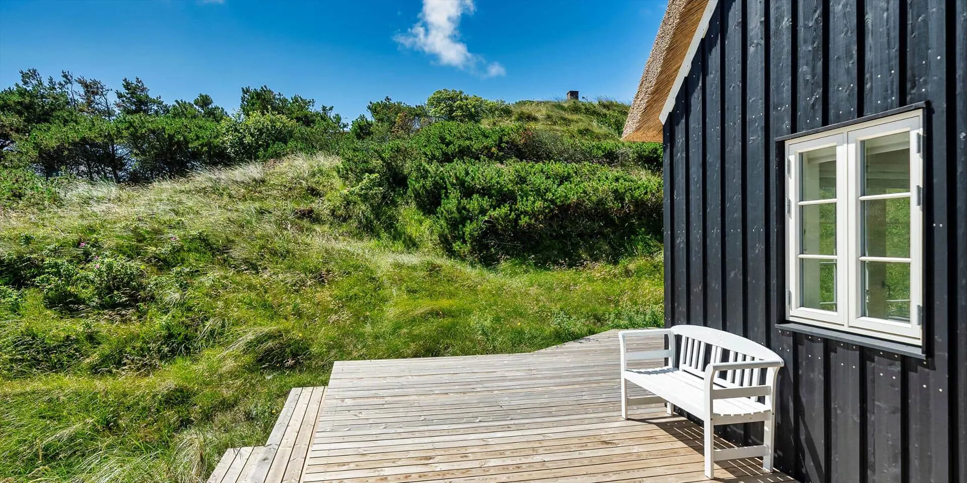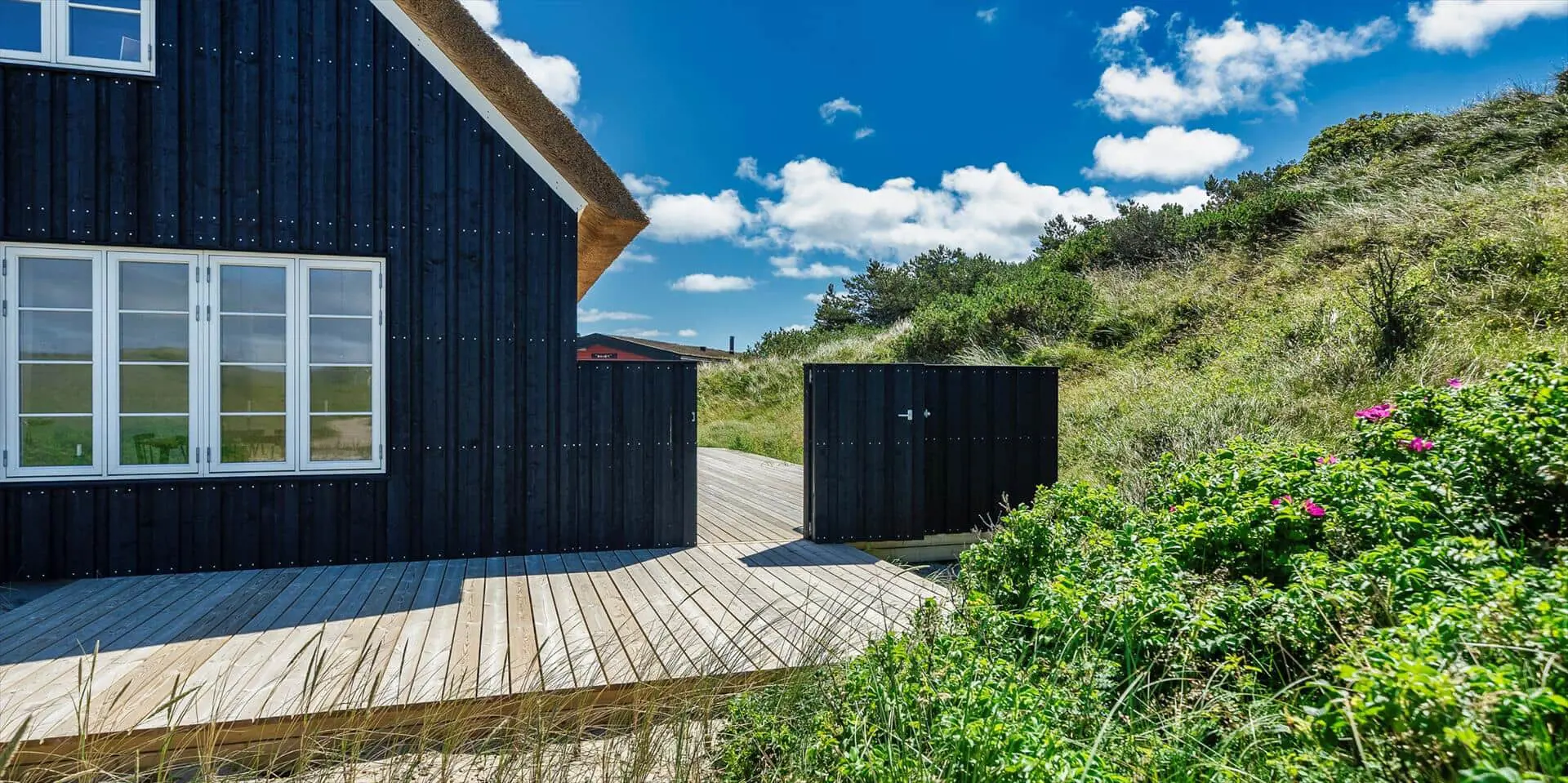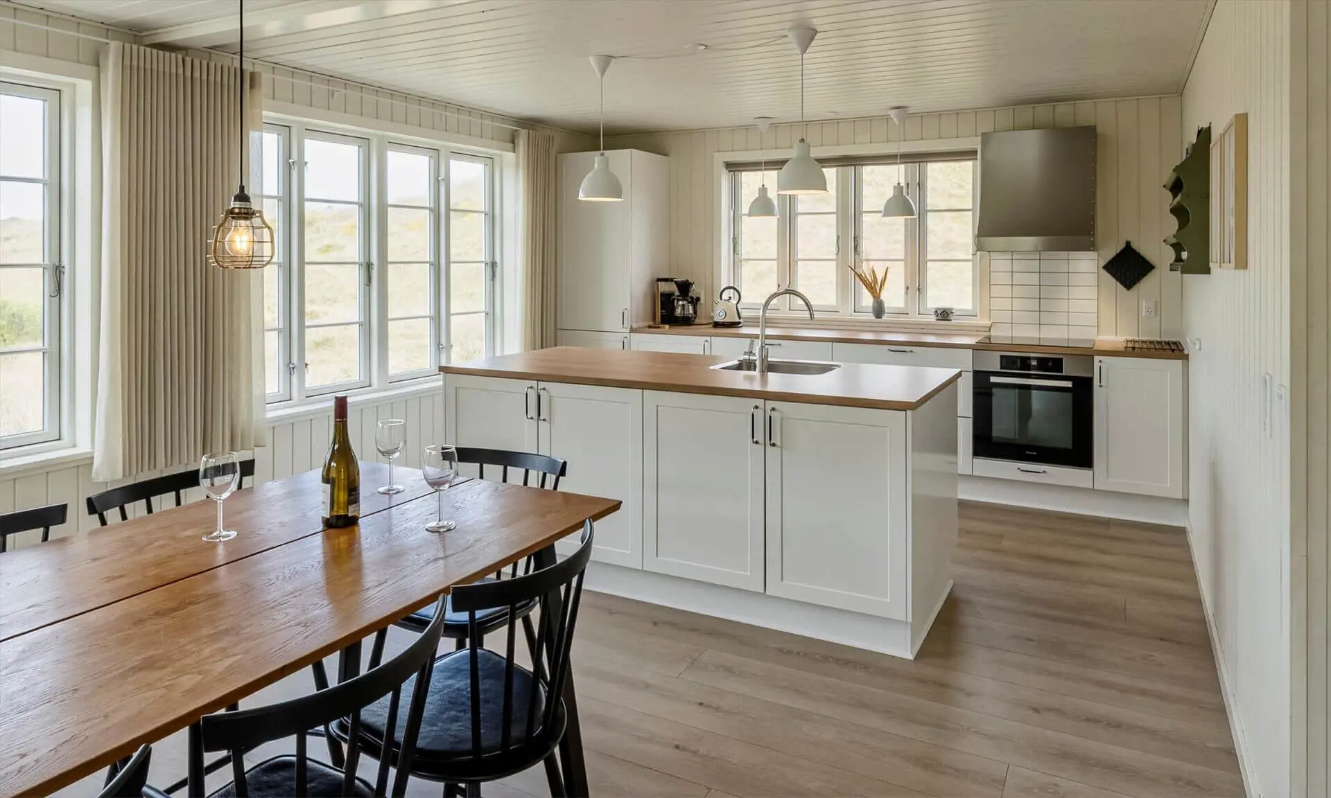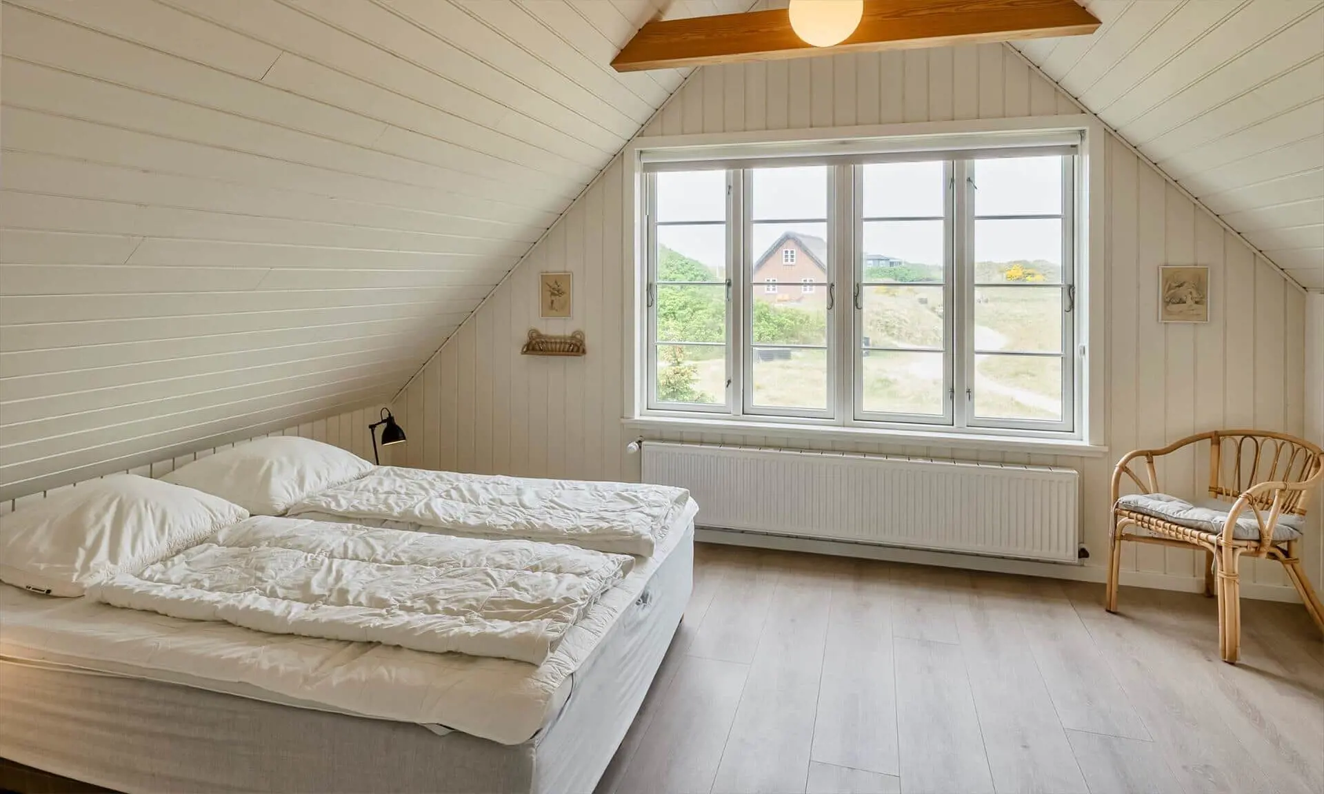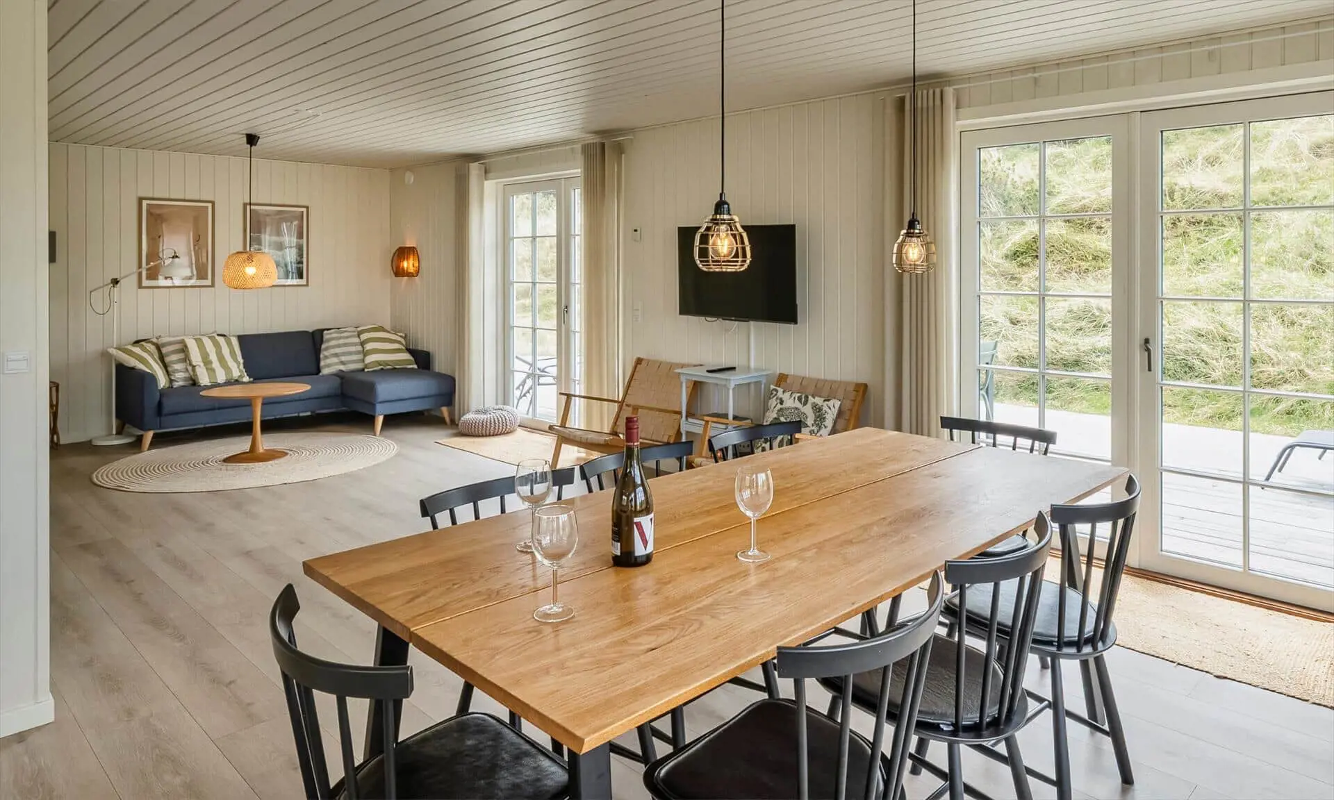 Der Strand ist ca. 400 Meter vom Haus entfernt. Das Ferienhaus selbst ist aus hochwertigen Materialien gebaut worden mit einem trendigen Design, das sich der Umgebung anpasst. Die Wohnfläche beträgt 157 qm2. Das Ferienhaus bietet eine wunderbare Atmosphäre im modernen und nordischen Stil. Im Erdgeschoss befinden sich der Eingangsbereich, der Wohn- und Essbereich und eine offene Küche, ein großes Badezimmer und ein Schlafzimmer. Über eine schöne Holztreppe gelangen Sie dann in das Obergeschoss. Das Ferienhaus wird im Erdgeschoss komplett mit einer Fußbodenheizung / Luft-Wasser-Wärmepumpe beheizt. Im Obergeschoss befinden sich weitere drei Schlafzimmer, ein kleines Gästebad und ein kleiner Flur oder auch Wohnbereich. Das Obergeschoss wird mit Elektroheizkörper geheizt. Das ganze Ferienhaus ist, außer in den Bädern und der Eingangsbereich, mit einem Laminat verlegt. Der Eingangsbereich ist großzügig gehalten und bietet genügend Platz für Garderobe und Schuhe. Der Wohn- und Essbereich ist zum Küchenbereich offengehalten. Das deutsche Fernsehen sollte über eine Parabolantenne empfangen werden können. Die dänischen Programme kommen über Smart TV. In einer Ecke im Wohnbereich ist ein kleiner Alkoven. Hier haben Sie die Möglichkeit zu entspannen und vielleicht oder auch Ihr Buch zu lesen. Die neue und trendige Einbauküche ist in einem tollen Design und bietet alles was Sie zum täglichen kochen benötigen. Die Küche verfügt über einen Herd mit Cerankochfeld, einem Backofen, einer Geschirrspülmaschine, und einer Kühl- und Gefrierkombination. Das große Badezimmer verfügt über eine Handwaschbecken mit reichlich Ablagefläche und Schränken, einem WC, einer Dusche und einer Sauna (wird max 60 Grad). Desweiteren sind die Waschmaschine und der Trockner hier im Bad untergebracht. Eine Tür damit Sie zum Terrassenbereich und der Aussendusche, die aber nur im Sommer genutzt werden kann, gelangen ist auch vorhanden. Das Schlafzimmer im Erdgeschoss verfügt über ein Doppelbett (180 cm x 200 cm). Über die Holztreppe gelangen Sie dann in das Obergeschoss. Hier ist gleich ein großer Bereich, der als weiterer Wohnraum genutzt werden kann. Desweiteren befinden sich hier die drei Schlafzimmer, davon ein Schlafzimmer mit einem Doppelbett (180 cm x 200 cm) und die beiden anderen Schlafzimmer mit je 2 Einzelbetten (90 cm x 200 cm). Ein Gästebad mit WC und Handwaschbecken und Dusche befindet sich auch hier auf der Etage. Das Ferienhaus verfügt über einen Internetanschluss (W-Lan). Das Rauchen im Ferienhaus ist nicht erlaubt. Es sind keine Haustiere erlaubt. Eine private Ladestation für El-Fahrzeuge steht den Gästen auch zur Verfügung. Der Eigentümer stellt einen Holzkohlegrill zur Verfügung. Bitte nach Gebrauch wieder gereinigt zurückstellen, damit der Nachfolgemieter auch noch was davon hat. Die Außenanlagen bieten wunderschöne Sonnenuntergänge, die Sie in vollen Zügen genießen können, oder auch natürlich Ihren Grillabend. Das Baujahr ist 2022.