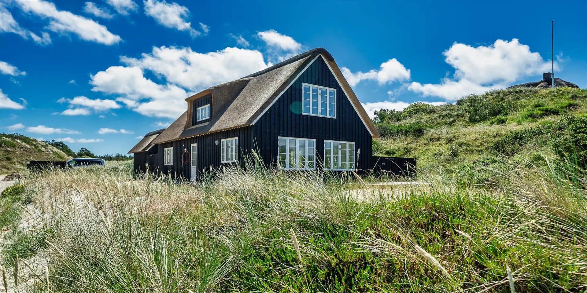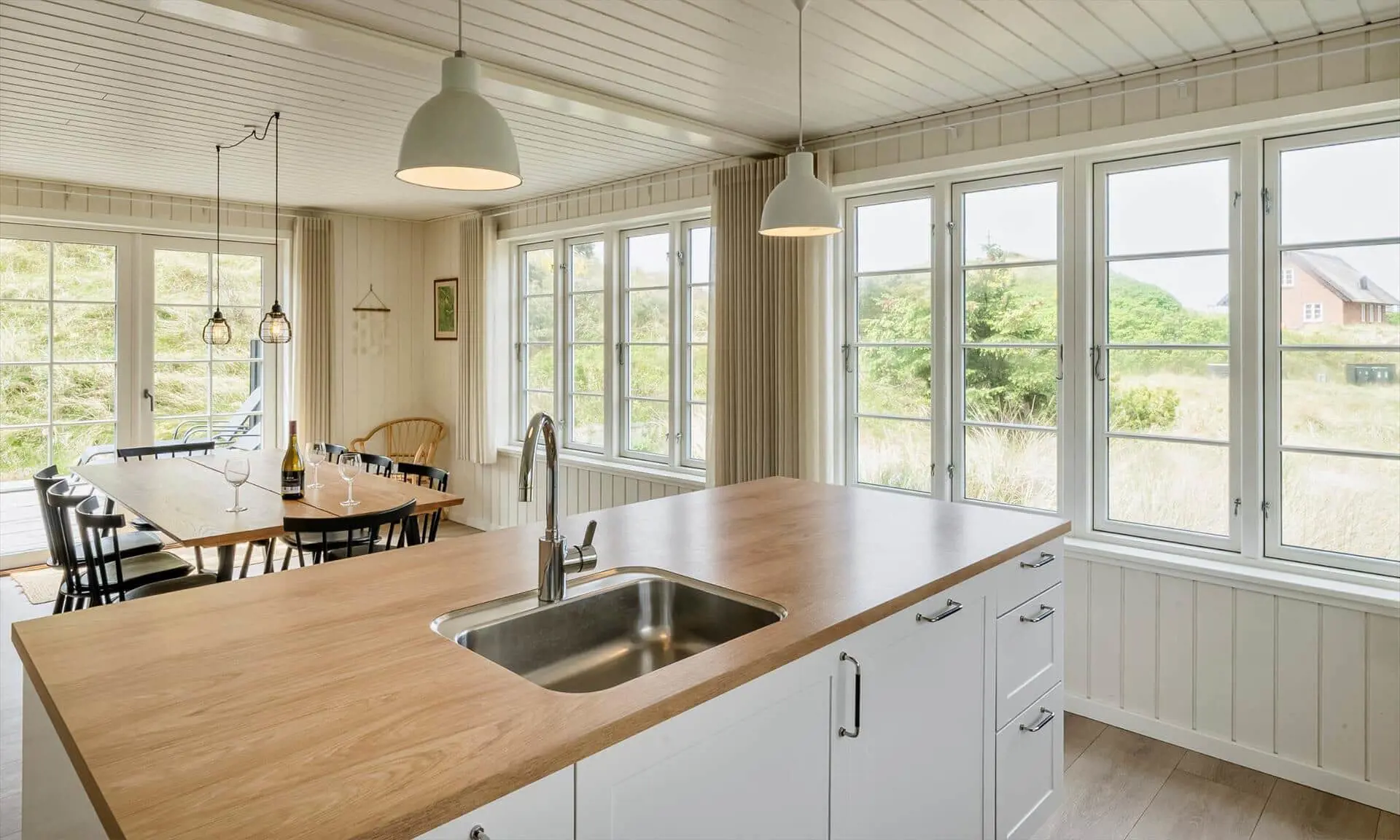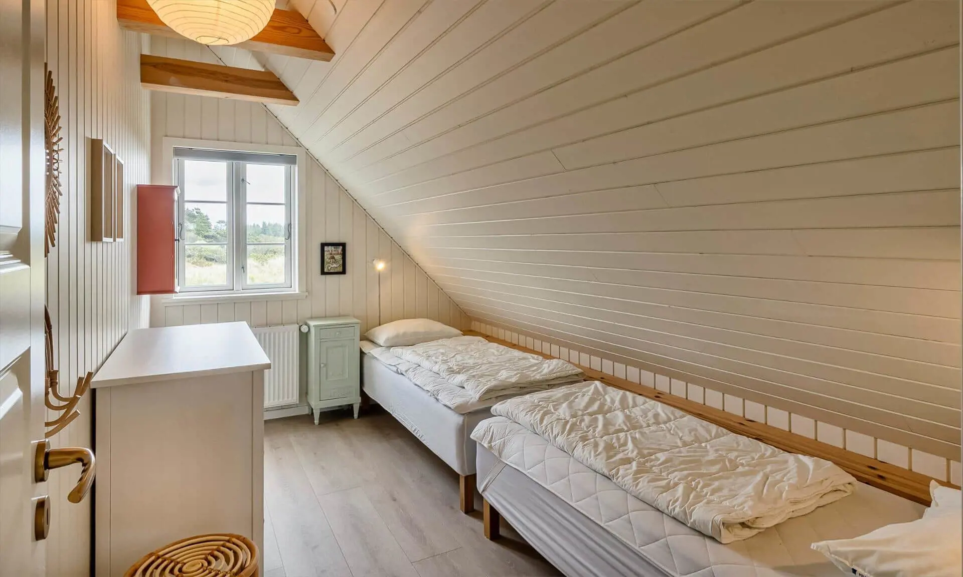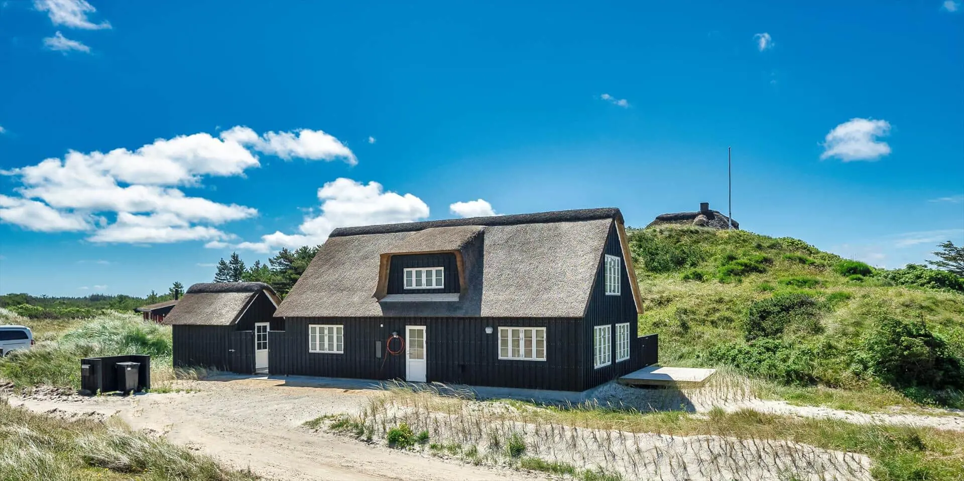 Der Strand ist ca. 400 Meter vom Haus entfernt. Das Ferienhaus selbst ist aus hochwertigen Materialien gebaut worden mit einem trendigen Design, das sich der Umgebung anpasst. Die Wohnfläche beträgt 157 qm2. Das Ferienhaus bietet eine wunderbare Atmosphäre im modernen und nordischen Stil. Im Erdgeschoss befinden sich der Eingangsbereich, der Wohn- und Essbereich und eine offene Küche, ein großes Badezimmer und ein Schlafzimmer. Über eine schöne Holztreppe gelangen Sie dann in das Obergeschoss. Das Ferienhaus wird im Erdgeschoss komplett mit einer Fußbodenheizung / Luft-Wasser-Wärmepumpe beheizt. Im Obergeschoss befinden sich weitere drei Schlafzimmer, ein kleines Gästebad und ein kleiner Flur oder auch Wohnbereich. Das Obergeschoss wird mit Elektroheizkörper geheizt. Das ganze Ferienhaus ist, außer in den Bädern und der Eingangsbereich, mit einem Laminat verlegt. Der Eingangsbereich ist großzügig gehalten und bietet genügend Platz für Garderobe und Schuhe. Der Wohn- und Essbereich ist zum Küchenbereich offengehalten. Das deutsche Fernsehen sollte über eine Parabolantenne empfangen werden können. Die dänischen Programme kommen über Smart TV. In einer Ecke im Wohnbereich ist ein kleiner Alkoven. Hier haben Sie die Möglichkeit zu entspannen und vielleicht oder auch Ihr Buch zu lesen. Die neue und trendige Einbauküche ist in einem tollen Design und bietet alles was Sie zum täglichen kochen benötigen. Die Küche verfügt über einen Herd mit Cerankochfeld, einem Backofen, einer Geschirrspülmaschine, und einer Kühl- und Gefrierkombination. Das große Badezimmer verfügt über eine Handwaschbecken mit reichlich Ablagefläche und Schränken, einem WC, einer Dusche und einer Sauna (wird max 60 Grad). Desweiteren sind die Waschmaschine und der Trockner hier im Bad untergebracht. Eine Tür damit Sie zum Terrassenbereich und der Aussendusche, die aber nur im Sommer genutzt werden kann, gelangen ist auch vorhanden. Das Schlafzimmer im Erdgeschoss verfügt über ein Doppelbett (180 cm x 200 cm). Über die Holztreppe gelangen Sie dann in das Obergeschoss. Hier ist gleich ein großer Bereich, der als weiterer Wohnraum genutzt werden kann. Desweiteren befinden sich hier die drei Schlafzimmer, davon ein Schlafzimmer mit einem Doppelbett (180 cm x 200 cm) und die beiden anderen Schlafzimmer mit je 2 Einzelbetten (90 cm x 200 cm). Ein Gästebad mit WC und Handwaschbecken und Dusche befindet sich auch hier auf der Etage. Das Ferienhaus verfügt über einen Internetanschluss (W-Lan). Das Rauchen im Ferienhaus ist nicht erlaubt. Es sind keine Haustiere erlaubt. Eine private Ladestation für El-Fahrzeuge steht den Gästen auch zur Verfügung. Der Eigentümer stellt einen Holzkohlegrill zur Verfügung. Bitte nach Gebrauch wieder gereinigt zurückstellen, damit der Nachfolgemieter auch noch was davon hat. Die Außenanlagen bieten wunderschöne Sonnenuntergänge, die Sie in vollen Zügen genießen können, oder auch natürlich Ihren Grillabend. Das Baujahr ist 2022.