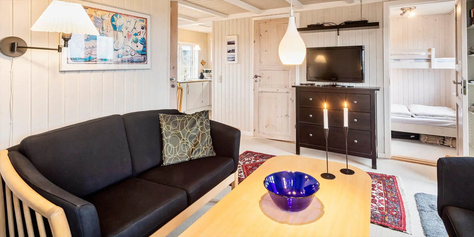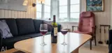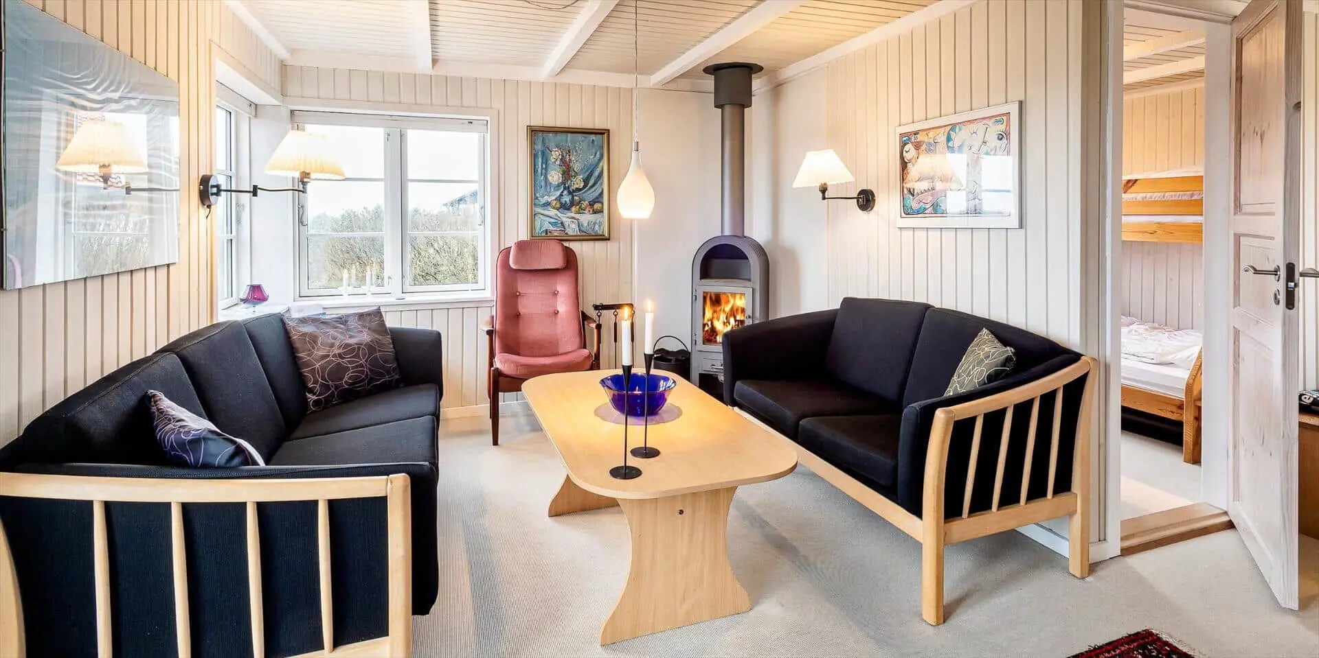 Offene Wohnküche mit Geschirrspülmaschine und Mikrowelle. Wohnzimmer mit Kaminofen und Sat-Tv. Badezimmer mit Du/Wc. 2 Schlafzimmer mit je 1 schmalem Doppelbett. 3 Terrassen mit Gartenmöbeln, hiervon ist eine teilweise geschlossen. ). Internetanschluss (W-Lan.