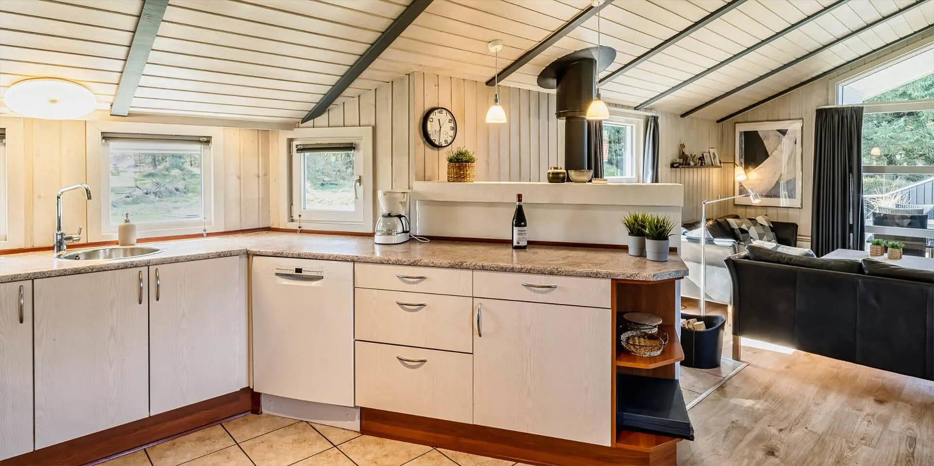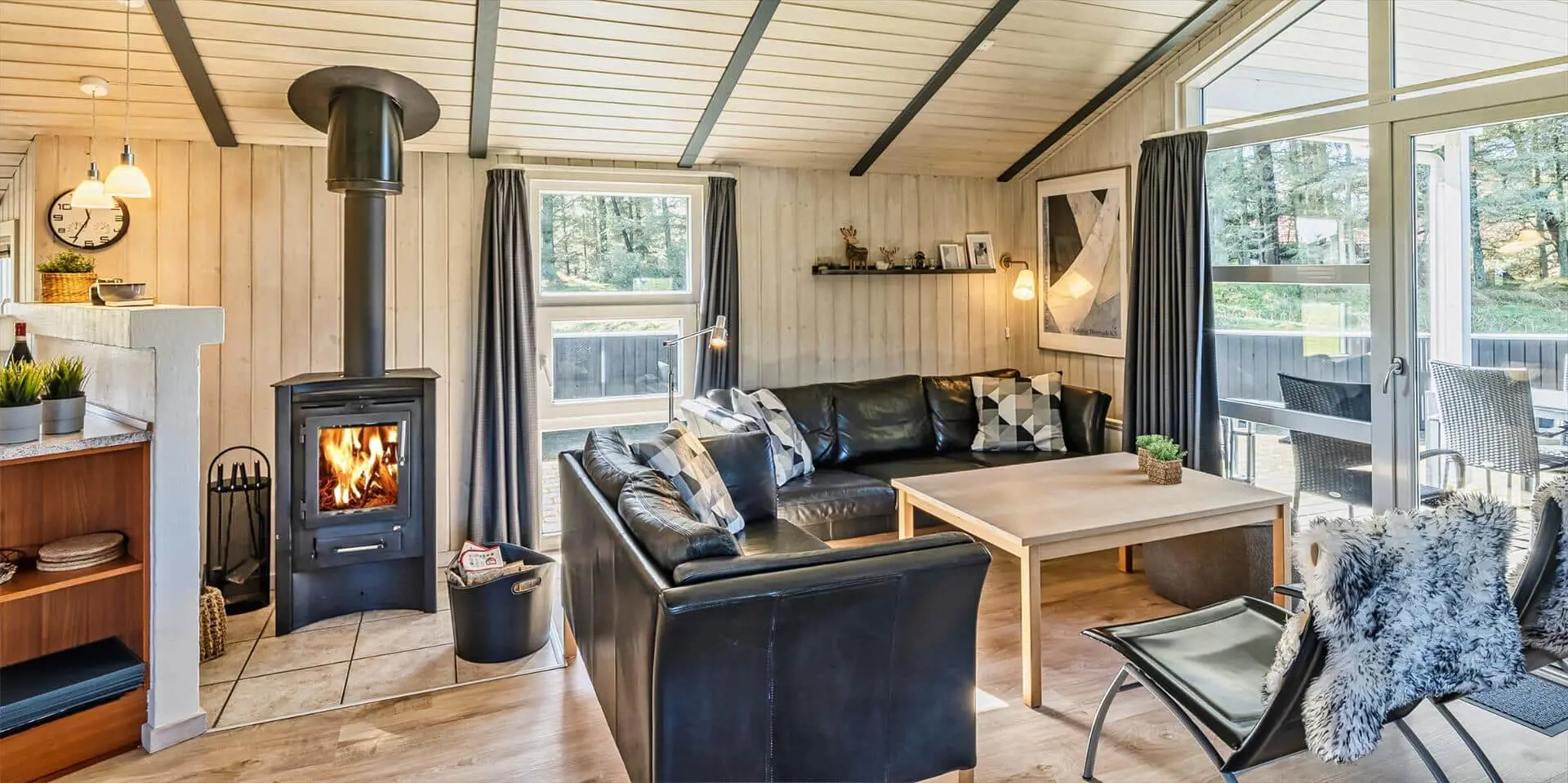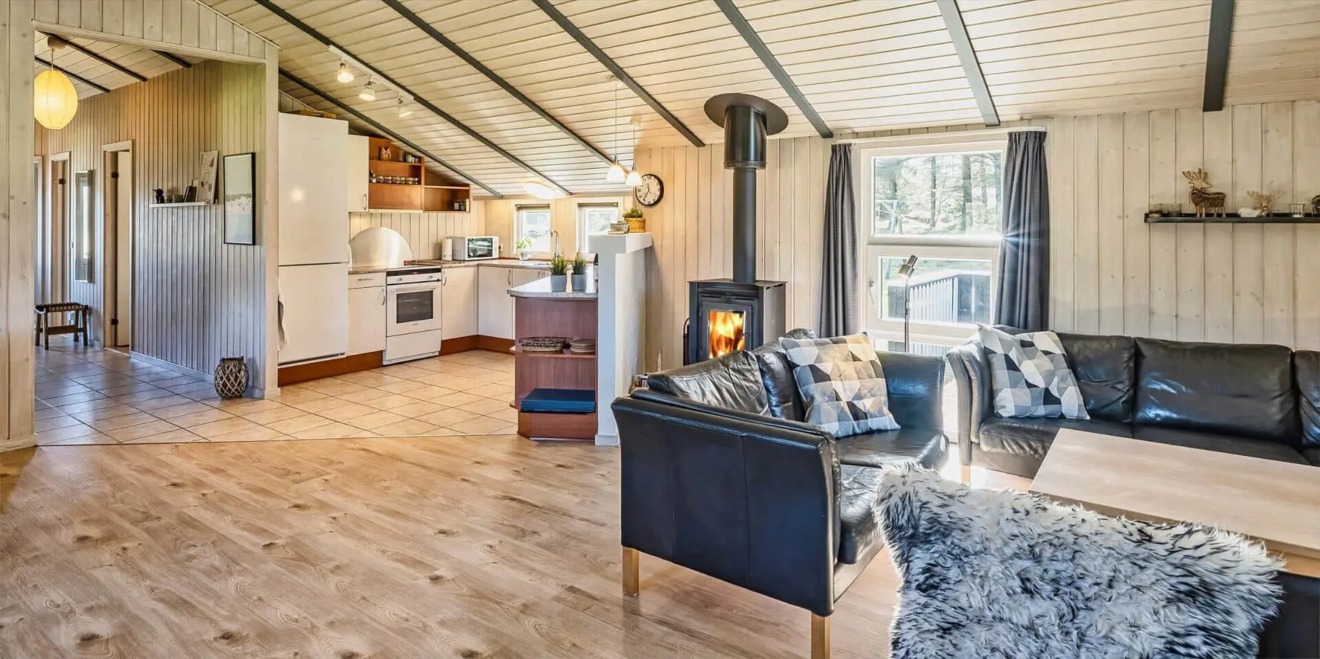 Der Wohn- und Essbereich ist mit einem Teppich ausgestattet und zur Küche hin offen gehalten. Gemütliche Sitzgarnitur lädt zum Relaxen ein. Der Kamin ist in der Essecke ausgestellt. Es befindet sich eine Warmepumpe im Ferienhaus. Mit dieser Warmepumpe haben sie die Möglichkeit die Stromkosten zu senken, denn die Warmepumpe ist energiesparend. Das deutsche Fernsehprogramm empfangen Sie über eine Parabolantenne. Desweiteren gibt es Smart TV im Hause. Appel Tv und Netxflix. Die Küche verfügt über einen Herd mit Cerankochfeld, einem Backofen, einer Geschirrspülmaschine und einer Kühl- und Gefrierkombination. Es stehen den Gästen zwei Badezimmer zur Verfügung. Das kleine Badezimmer hat ein WC, ein Handwaschbecken und eine Dusche. Die Waschmaschine und der Trockner sind hier in diesem Bad untergebracht. Das große Badezimmer hat ein WC, ein Handwaschbecken, eine Dusche, eine Sauna und den Standwasser-Whirlpool und ist renoviert worden. Dieser Standwasser-Whirlpool ist immer mit Wasser gefüllt. Und daher ist er sofort betriebsbereit bei Ihrer Ankunft. Ins gesamt stehen vier Schlafzimmer zur Verfügung. Alle Schlafzimmer sind mit neuen Boxermadrassen (Doppelbett) ausgestattet. Der Terrassenbereich am Ferienhaus ist großzügig und ein kleiner Teil ist sogar überdacht. Ein grosser Weber Gasgrill steht Ihnen zur Verfügung. Gas stellt der Eigentümer, sollte die Flasche leer sein, melden Sie sich bitte im Büro. Auf dem schönen Rasengrundstück steht für die kleinen Gäste eine Sandkiste und ein kleines Fussbaltor zur Verfügung. Das Ferienhaus verfügt über einen Internetanschluss (W-Lan). Airplay-Lautsprecher.