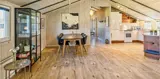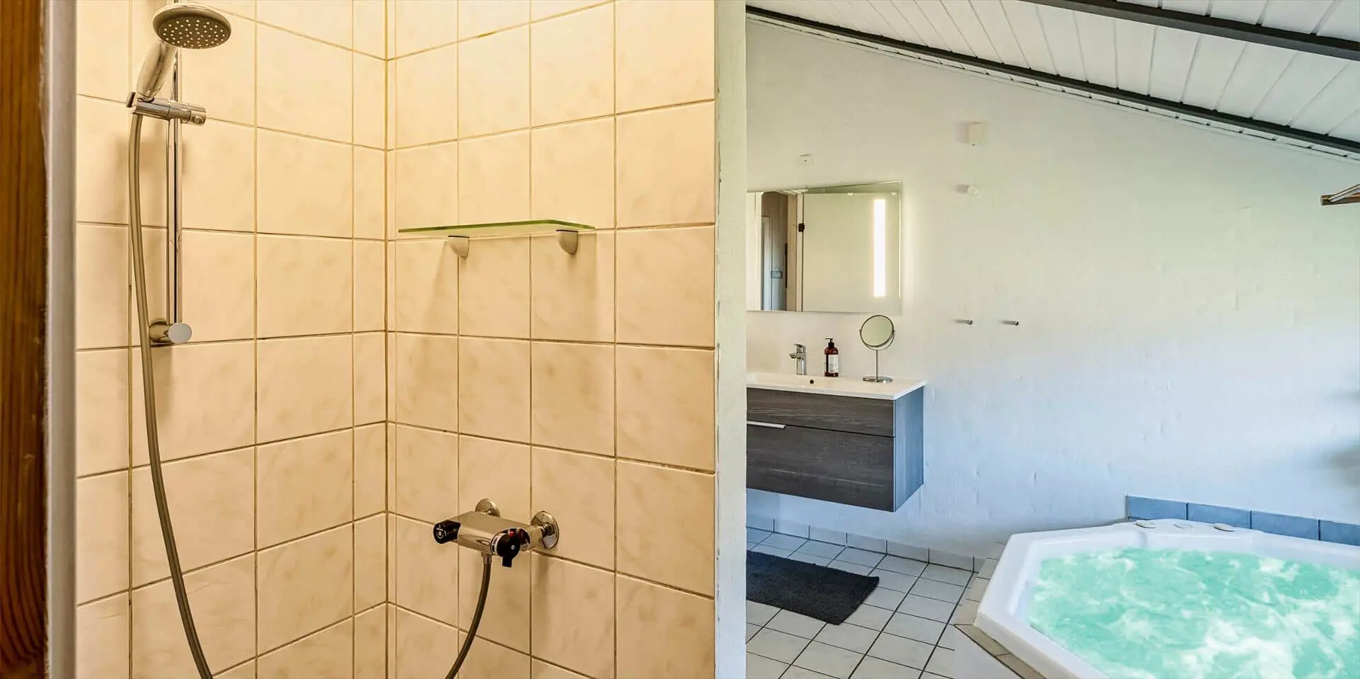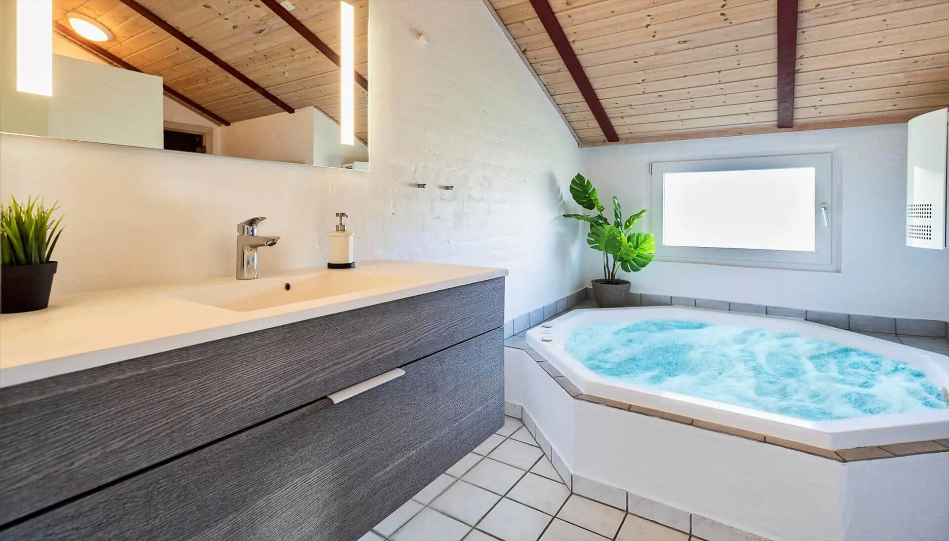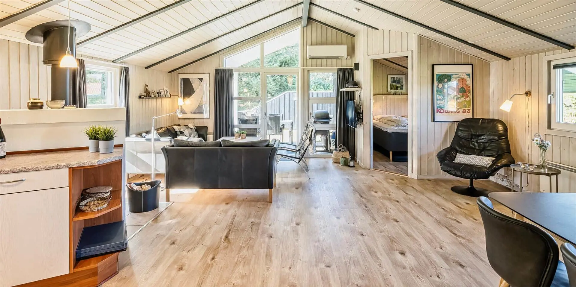 Der Wohn- und Essbereich ist mit einem Teppich ausgestattet und zur Küche hin offen gehalten. Gemütliche Sitzgarnitur lädt zum Relaxen ein. Der Kamin ist in der Essecke ausgestellt. Es befindet sich eine Warmepumpe im Ferienhaus. Mit dieser Warmepumpe haben sie die Möglichkeit die Stromkosten zu senken, denn die Warmepumpe ist energiesparend. Das deutsche Fernsehprogramm empfangen Sie über eine Parabolantenne. Desweiteren gibt es Smart TV im Hause. Appel Tv und Netxflix. Die Küche verfügt über einen Herd mit Cerankochfeld, einem Backofen, einer Geschirrspülmaschine und einer Kühl- und Gefrierkombination. Es stehen den Gästen zwei Badezimmer zur Verfügung. Das kleine Badezimmer hat ein WC, ein Handwaschbecken und eine Dusche. Die Waschmaschine und der Trockner sind hier in diesem Bad untergebracht. Das große Badezimmer hat ein WC, ein Handwaschbecken, eine Dusche, eine Sauna und den Standwasser-Whirlpool und ist renoviert worden. Dieser Standwasser-Whirlpool ist immer mit Wasser gefüllt. Und daher ist er sofort betriebsbereit bei Ihrer Ankunft. Ins gesamt stehen vier Schlafzimmer zur Verfügung. Alle Schlafzimmer sind mit neuen Boxermadrassen (Doppelbett) ausgestattet. Der Terrassenbereich am Ferienhaus ist großzügig und ein kleiner Teil ist sogar überdacht. Ein grosser Weber Gasgrill steht Ihnen zur Verfügung. Gas stellt der Eigentümer, sollte die Flasche leer sein, melden Sie sich bitte im Büro. Auf dem schönen Rasengrundstück steht für die kleinen Gäste eine Sandkiste und ein kleines Fussbaltor zur Verfügung. Das Ferienhaus verfügt über einen Internetanschluss (W-Lan). Airplay-Lautsprecher.