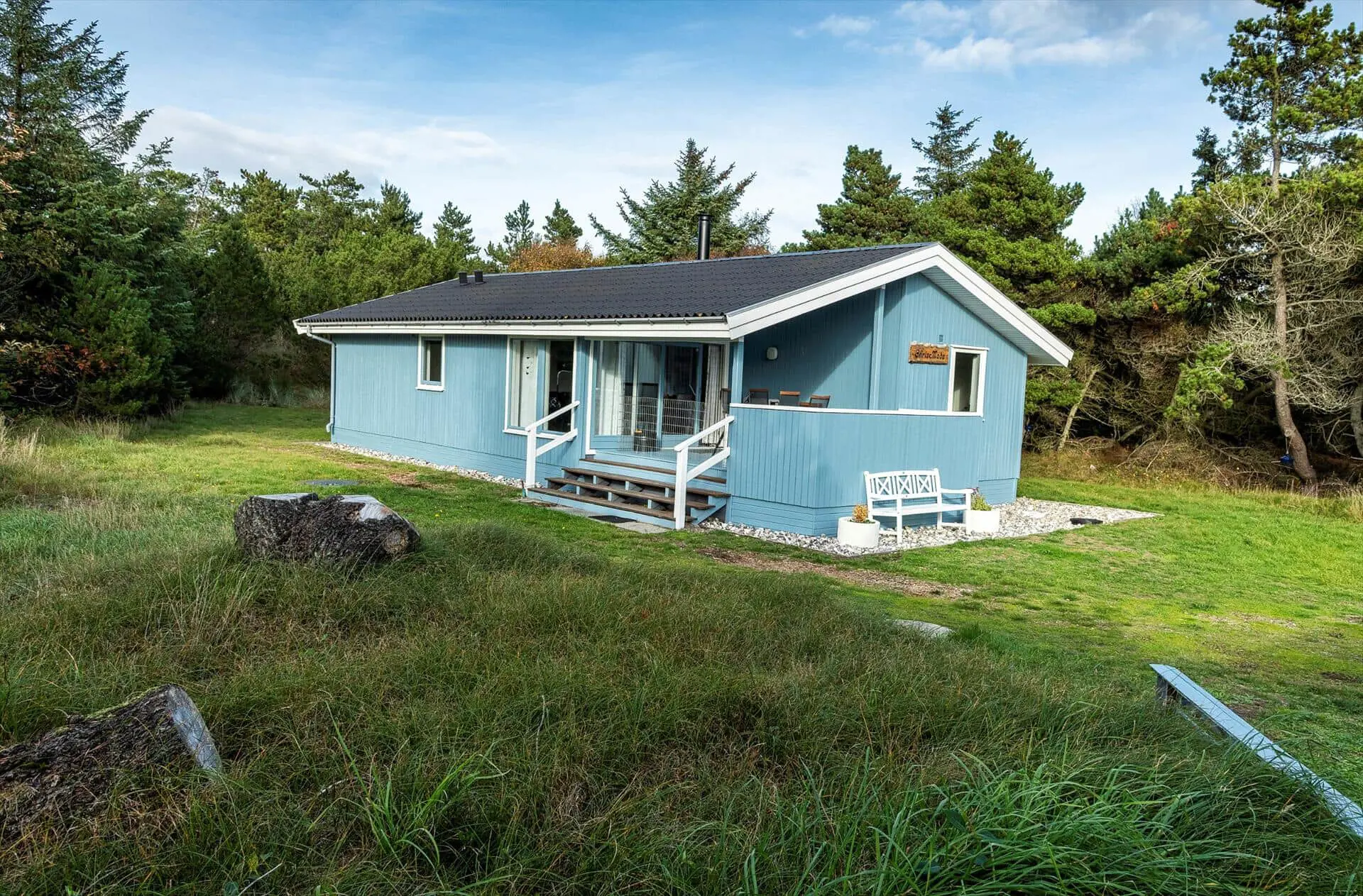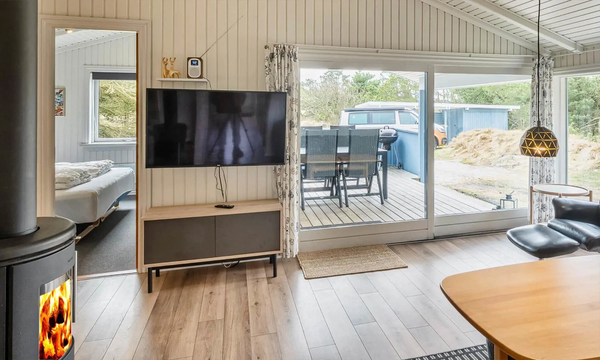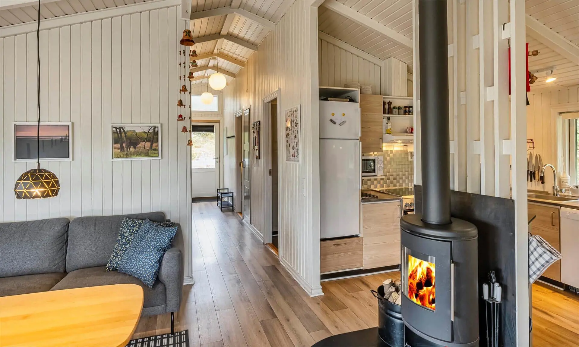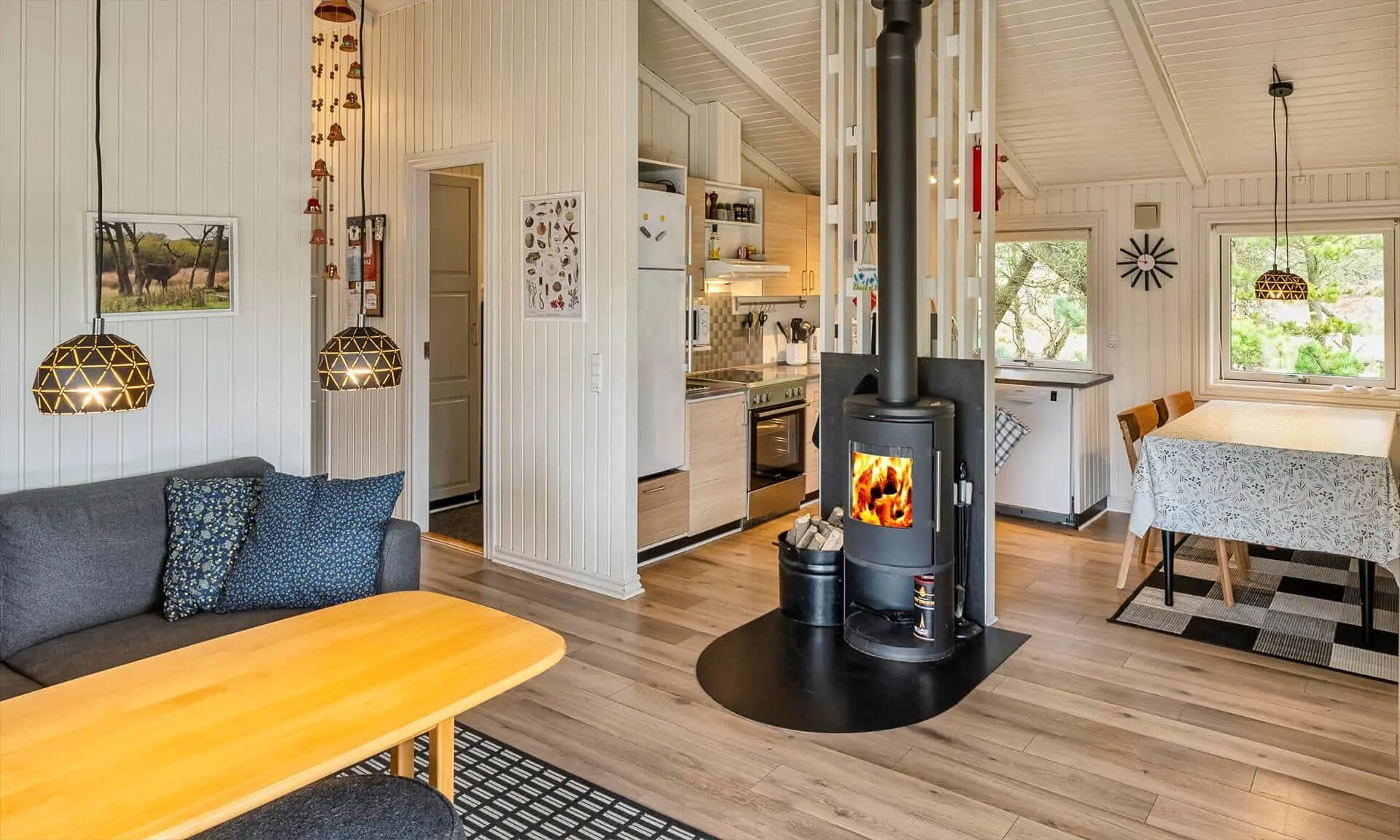 Ferienhaus für 6-7 Personen, Kaminofen, Warmepumpe und Tv. deutsche Fernsehprogramm über Stofa, daher nur 5-8 deutsche Kanäle, Küche mit Herd mit Cerankochfeld, Backofen, Geschirrspülmaschine, Mikrowelle und einer Kühl-/Gefrierkombination. Duschbadezimmer, Sauna, Gästetoilette. Waschmaschine und Trockner. 4 Schlafzimmer: 2 davon mit Doppelbett, 1 Schlafzimmer mit einem Etagebett und 1 Schlafzimmer mit 1 Einzelbett. Internetanschluss (W-Lan). Wildnisbad. Ein Teil der gemütlichen Holzterrasse ist überdacht. Carport.