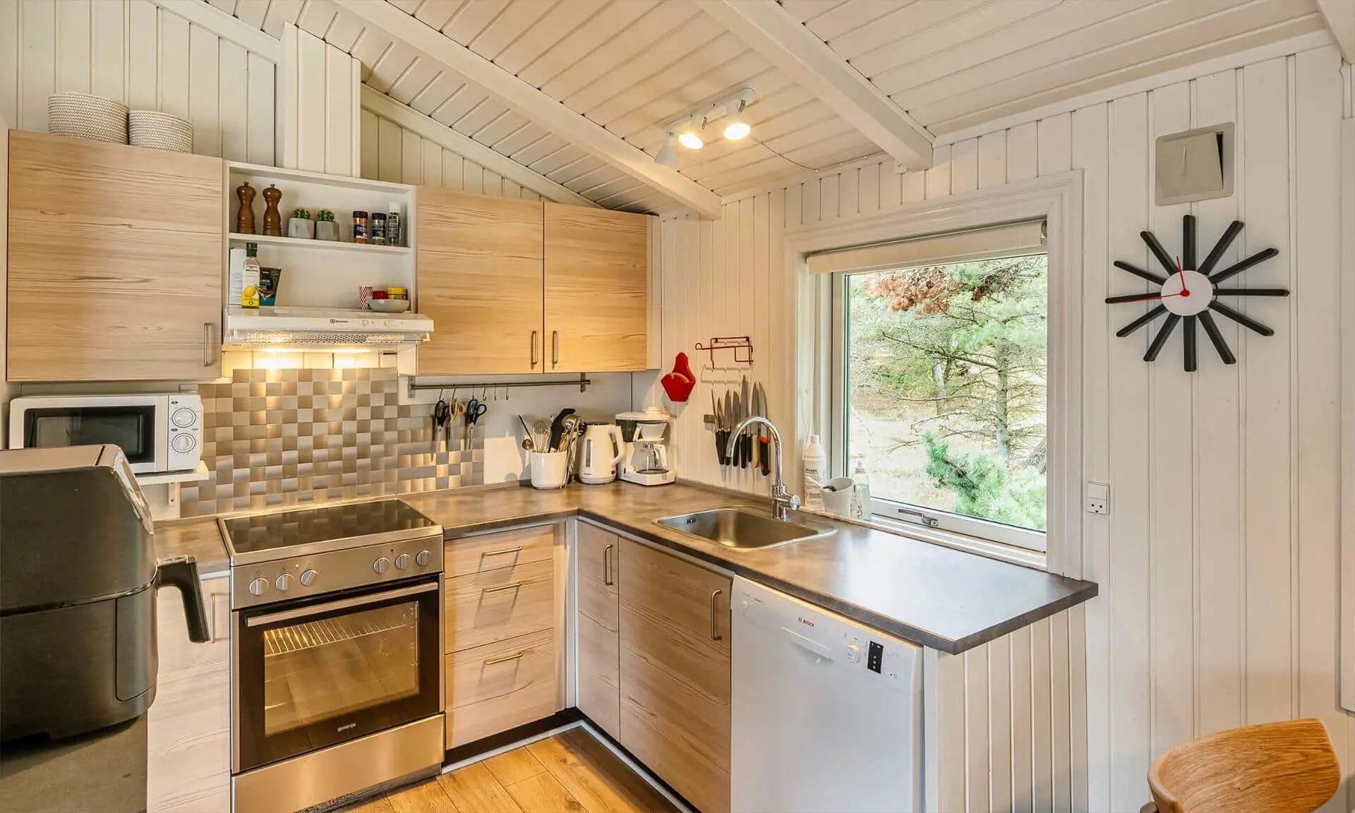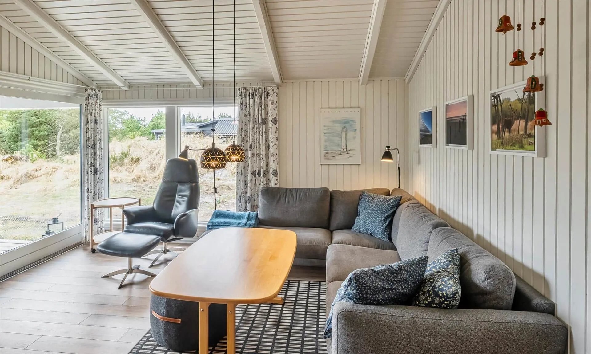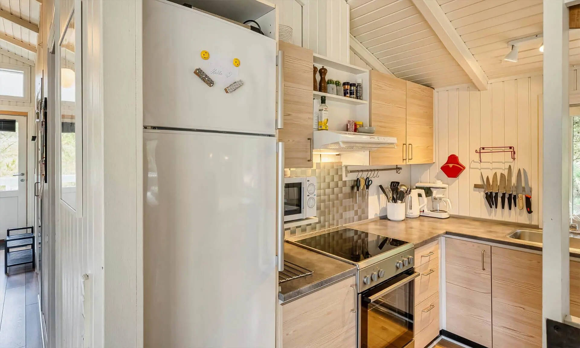 Ferienhaus für 6-7 Personen, Kaminofen, Warmepumpe und Tv. deutsche Fernsehprogramm über Stofa, daher nur 5-8 deutsche Kanäle, Küche mit Herd mit Cerankochfeld, Backofen, Geschirrspülmaschine, Mikrowelle und einer Kühl-/Gefrierkombination. Duschbadezimmer, Sauna, Gästetoilette. Waschmaschine und Trockner. 4 Schlafzimmer: 2 davon mit Doppelbett, 1 Schlafzimmer mit einem Etagebett und 1 Schlafzimmer mit 1 Einzelbett. Internetanschluss (W-Lan). Wildnisbad. Ein Teil der gemütlichen Holzterrasse ist überdacht. Carport.