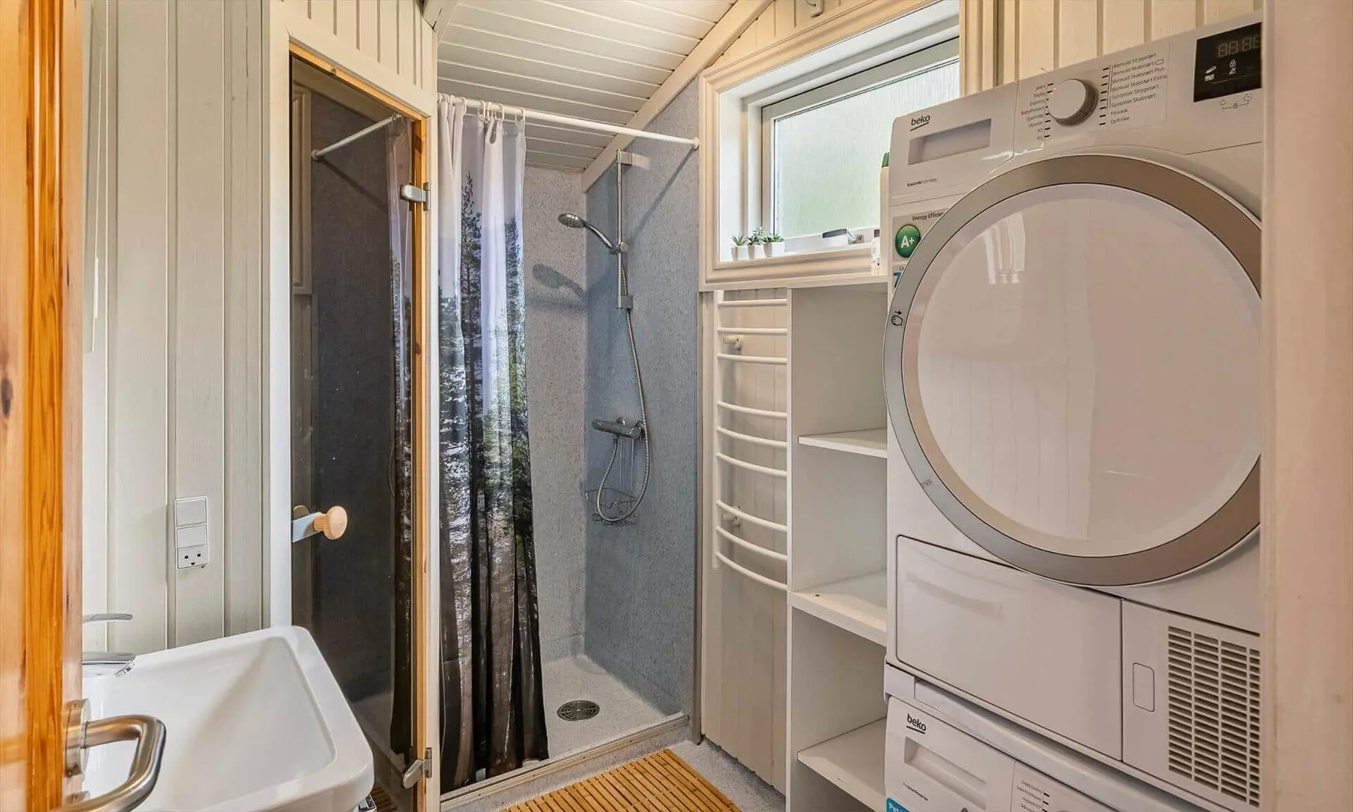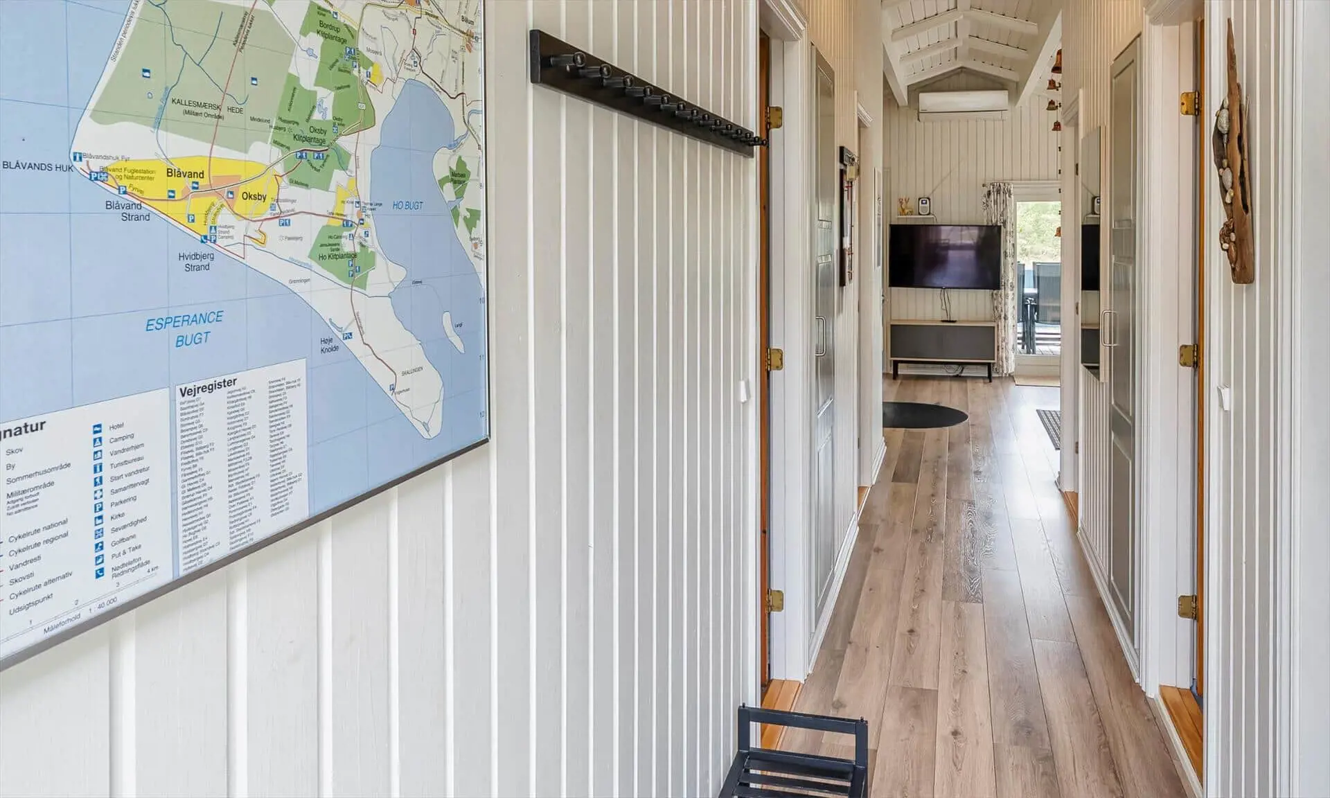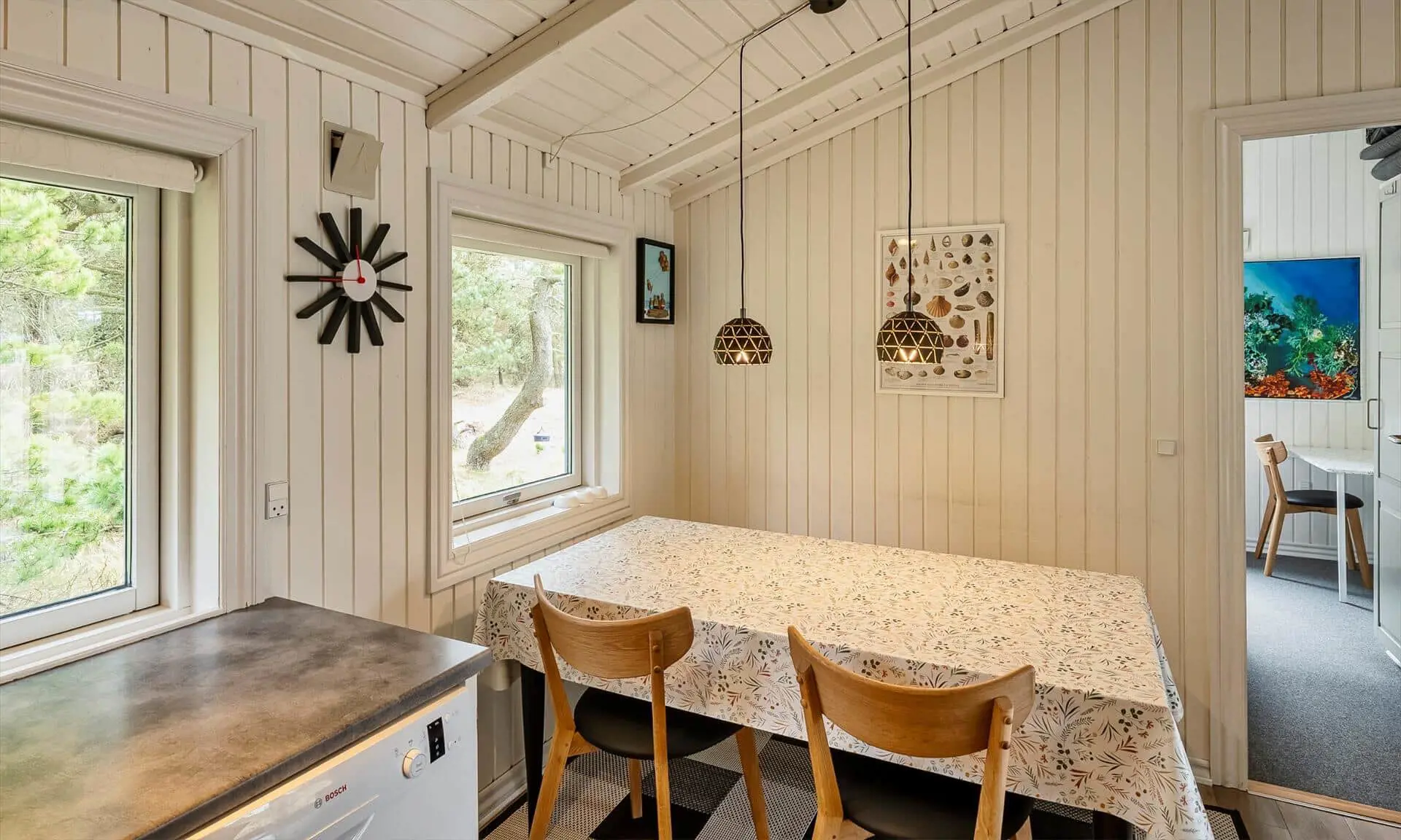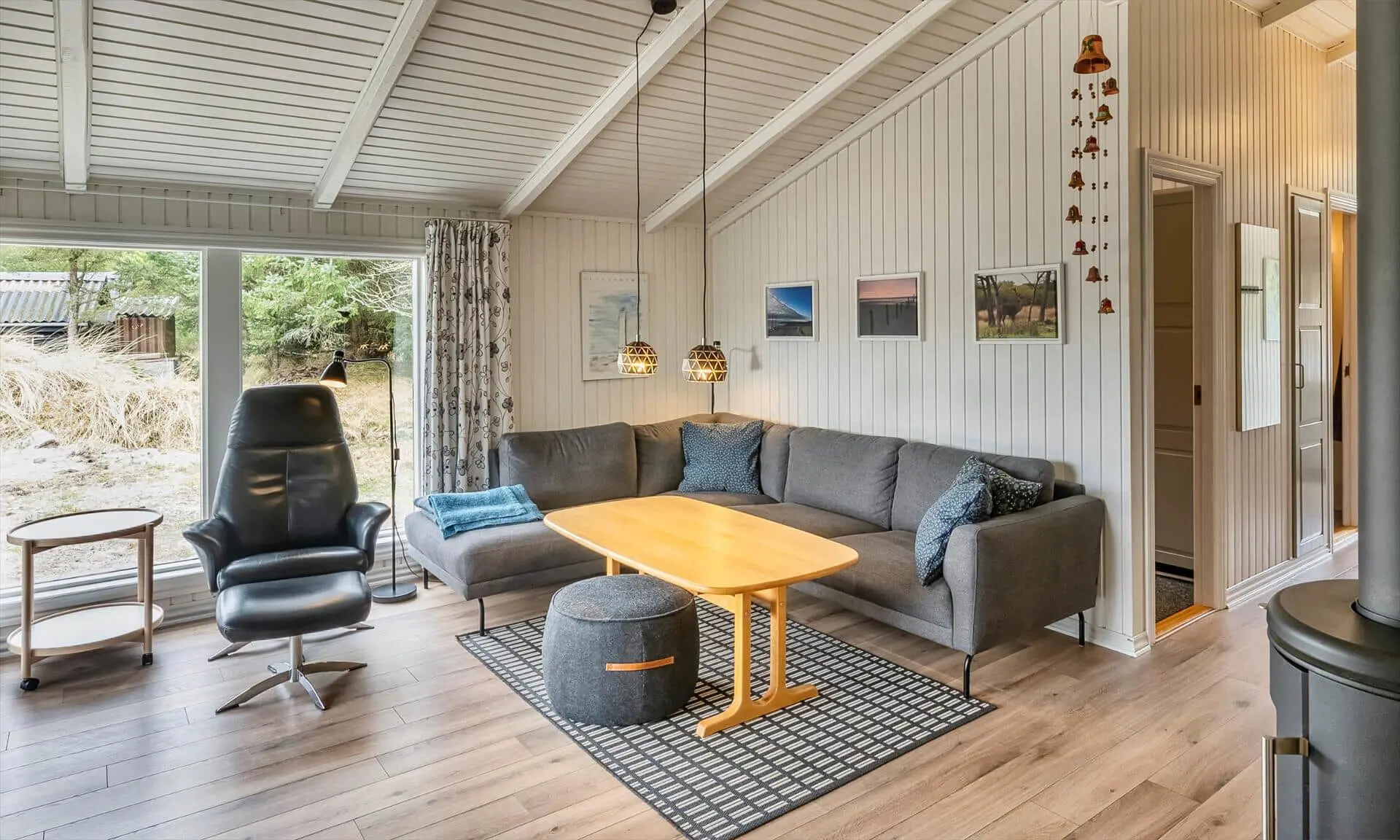 Ferienhaus für 6-7 Personen, Kaminofen, Warmepumpe und Tv. deutsche Fernsehprogramm über Stofa, daher nur 5-8 deutsche Kanäle, Küche mit Herd mit Cerankochfeld, Backofen, Geschirrspülmaschine, Mikrowelle und einer Kühl-/Gefrierkombination. Duschbadezimmer, Sauna, Gästetoilette. Waschmaschine und Trockner. 4 Schlafzimmer: 2 davon mit Doppelbett, 1 Schlafzimmer mit einem Etagebett und 1 Schlafzimmer mit 1 Einzelbett. Internetanschluss (W-Lan). Wildnisbad. Ein Teil der gemütlichen Holzterrasse ist überdacht. Carport.