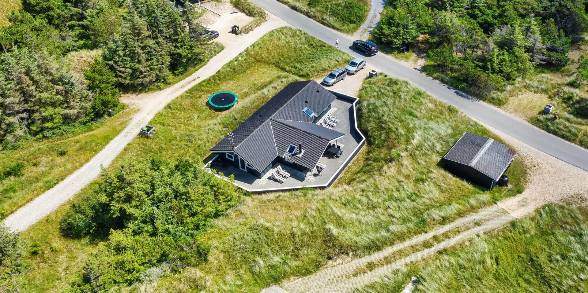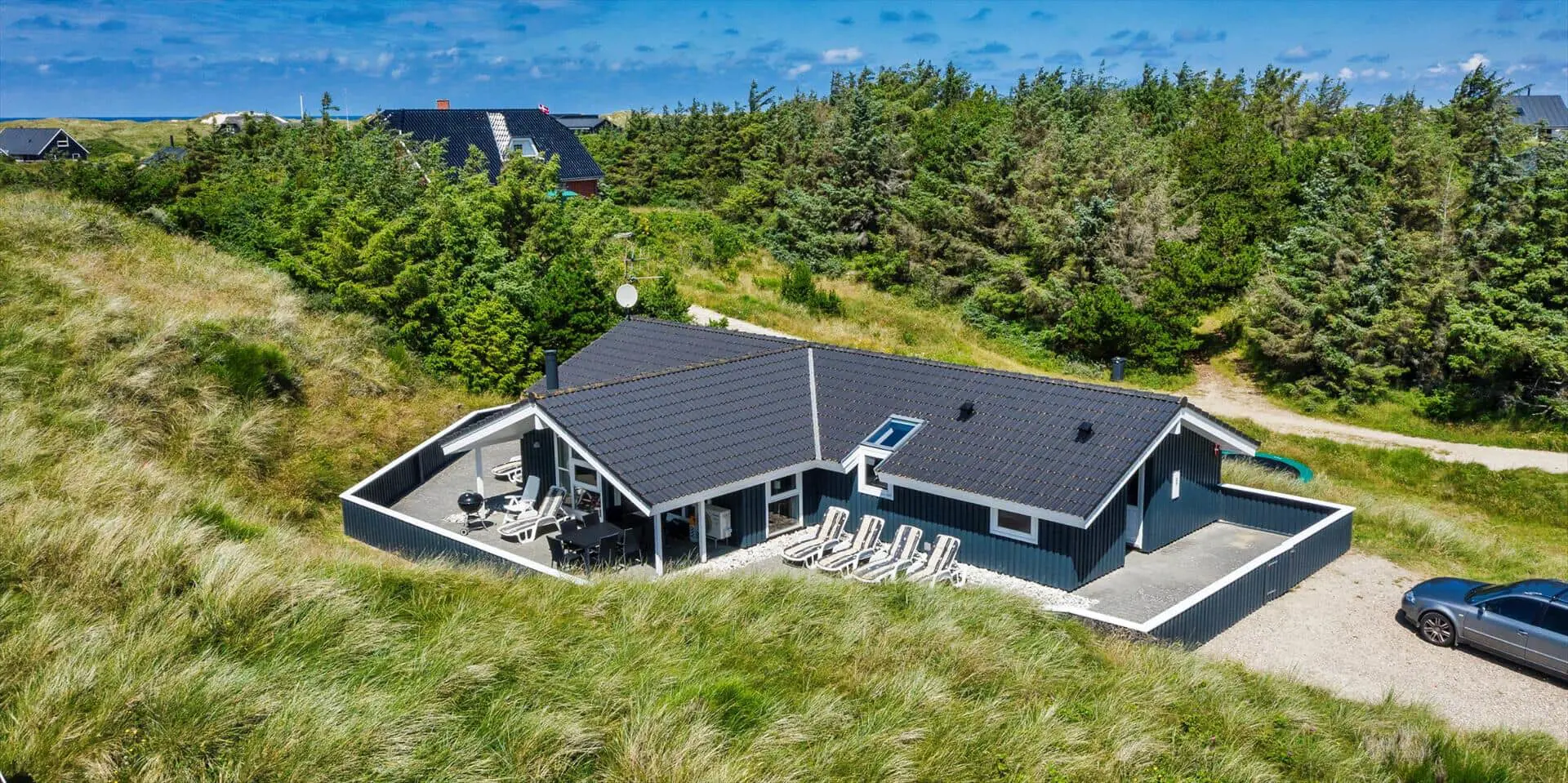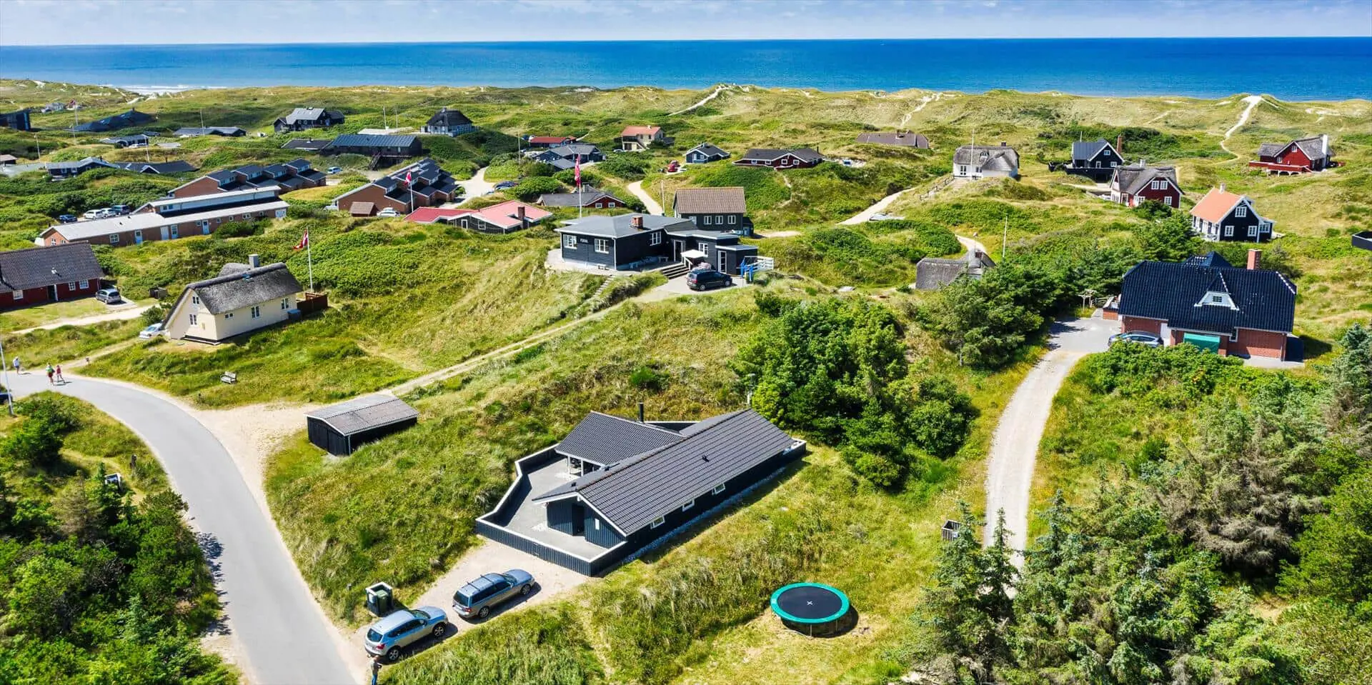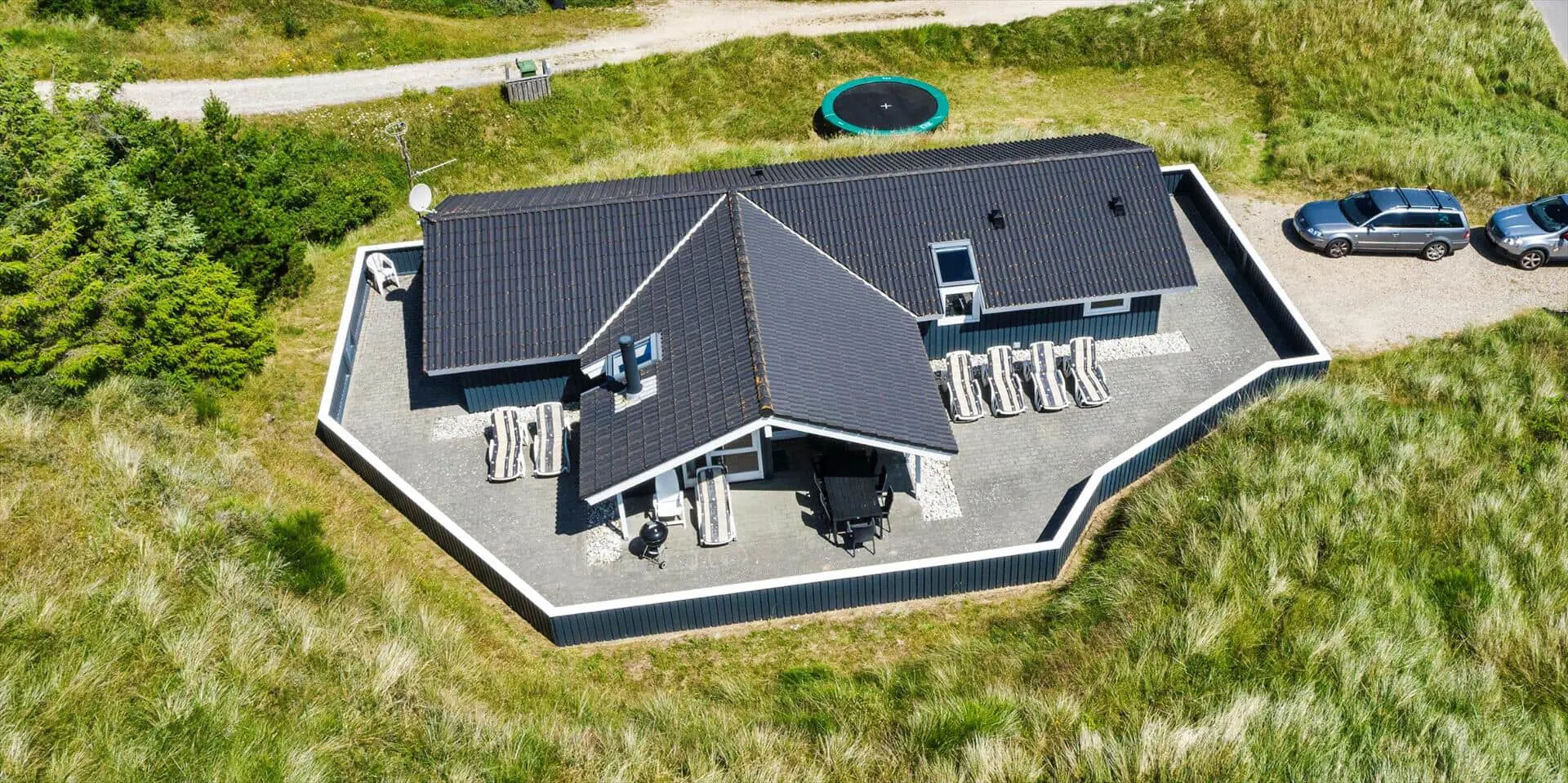 Hübsch eingerichtetes Ferienhaus von Dünen umgeben und für 8 Personen ausgestattet. Der Strand ist nur 200 Meter vom Haus entfernt. Der Wohnbereich ist zum Essbereich und der Küche hin offen und strahlt eine angenehme Wärme durch den schicken Holzfußboden aus. Farblich sind die Gardinen mit der Rundsitzecke gut abgestimmt. Der Kamin ist in einer Ecke im Wohnbereich aufgestellt. Es befindet sich eine Warmepumpe im Ferienhaus. Mit dieser Warmepumpe haben sie die Möglichkeit die Stromkosten zu senken, denn die Warmepumpe ist energiesparend. Das deutsche Fernsehprogramm empfangen Sie über Stofa, dadurch empfangen Sie nur 5-8 deutsche Kanäle. Die Küche ist zum Wohn- und Essbereich offen gehalten. Über dem Spülbecken in der Küche ist ein Oberlicht eingebaut und bringt zusätzliches Licht in die Küche. Die Küche verfügt über einen Herd mit Cerankochfeld, einem Backofen, einer Geschirrspülmaschine, einer Mikrowelle und einer Kühl- und Gefrierkombination. Zwei Bäder stehen den Gästen zur Verfügung. Beide sind mit einem WC, einem Handwaschbecken und einer Dusche ausgestattet. Das größere Bad hat zusätzlich eine Sauna und einen Whirlpool. Vier Schlafzimmer, mit je einem Doppelbett stehen den Gästen zur Verfügung. Eine Waschmaschine und ein Trockner steht zur Benutzung bereit. Das Ferienhaus verfügt über einen Internetanschluss (W-LanEs steht eine schöne geräumige Terrasse am Ferienhaus bereit. Ein Teil davon ist überdacht und sie ist sogar geschlossen. Hier können Sie mal Ihre Vierbeiner Luft schnappen lassen ohne das sie stiften gehen können. Für die Kleinen Gäste ist ein Trampolin aufgestellt, das das ganze Jahr benutzt werden kann. Für dieses Haus fallen extra Wasserkosten an.