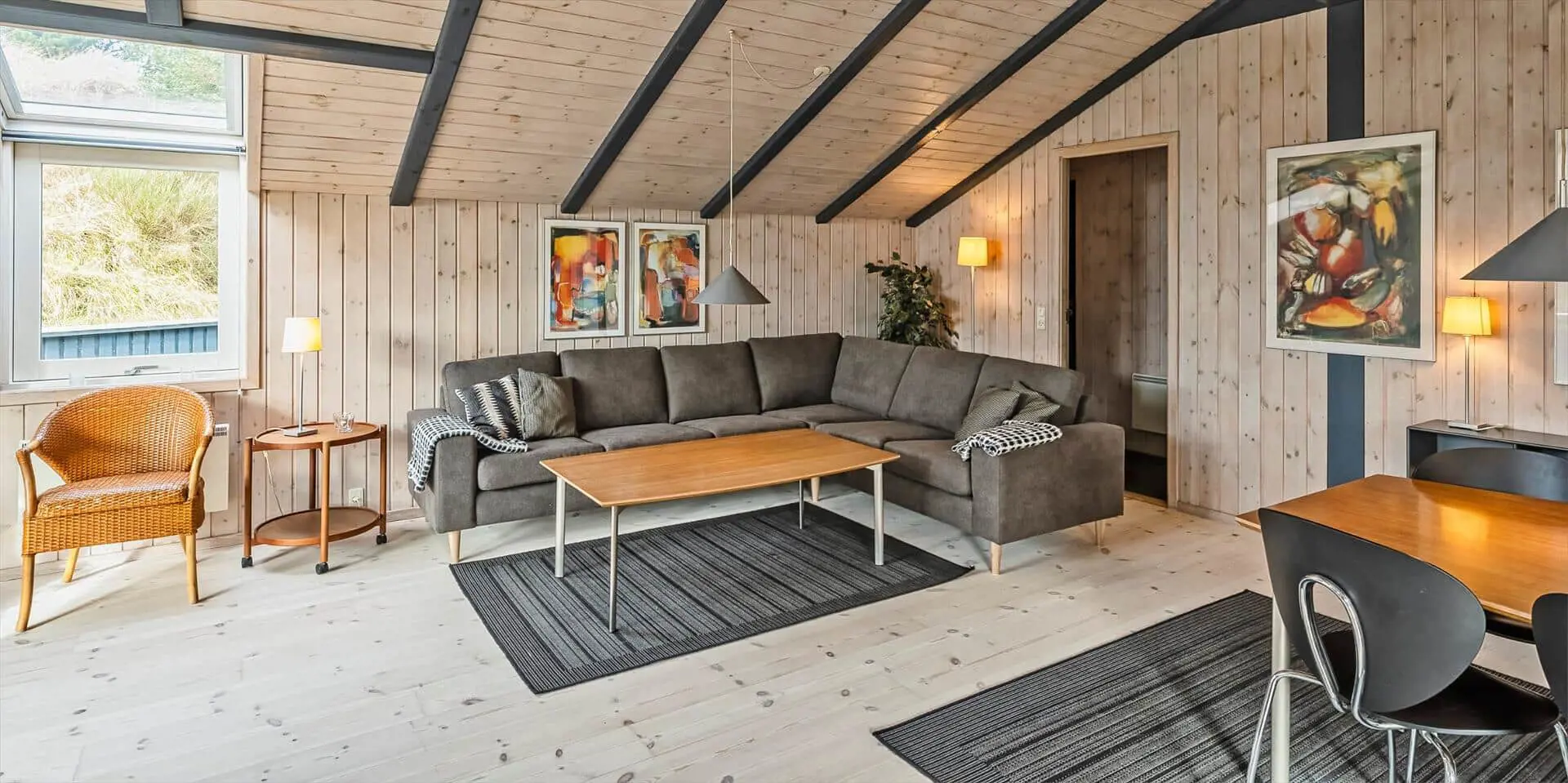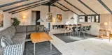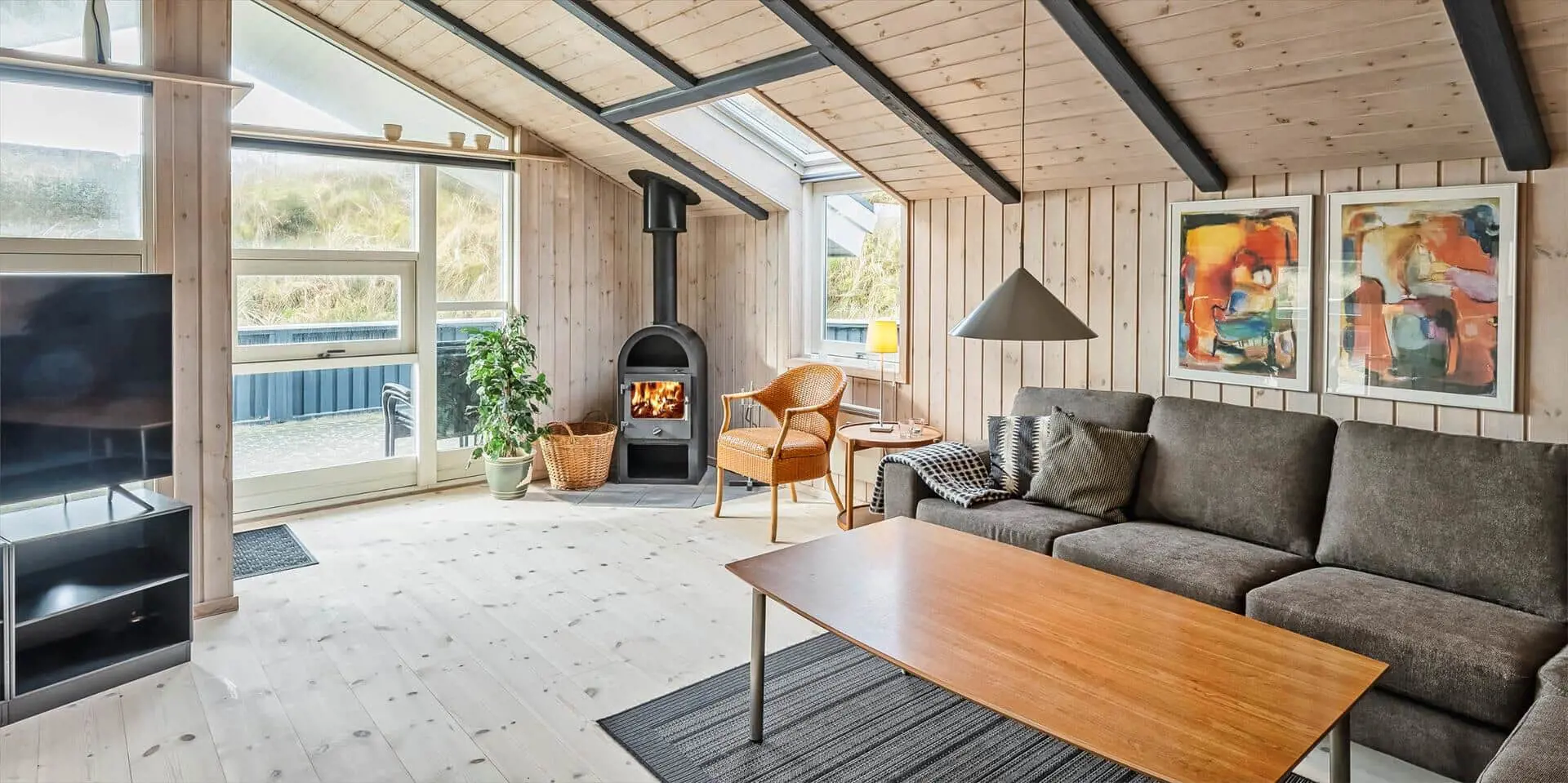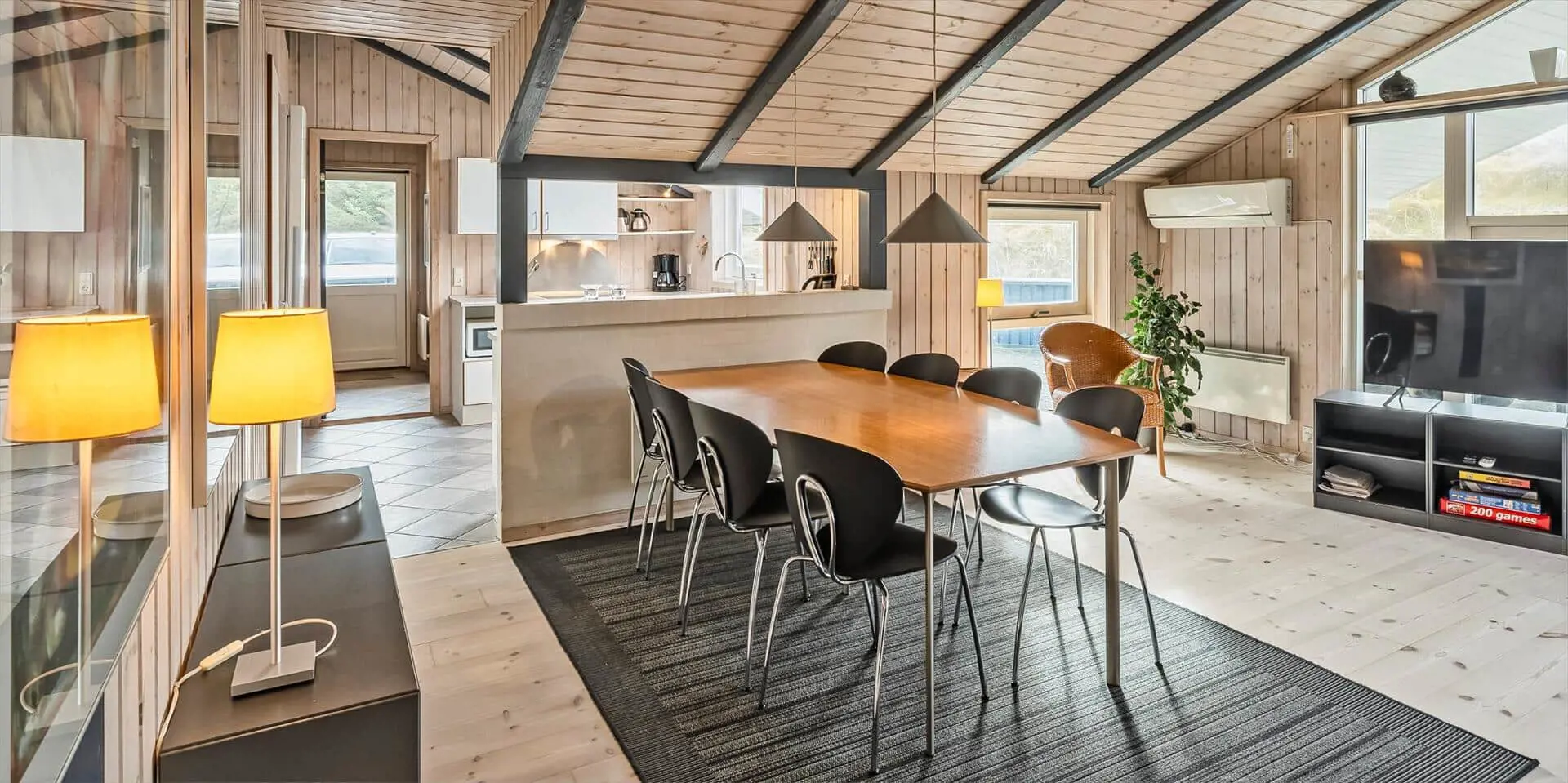 Hübsch eingerichtetes Ferienhaus von Dünen umgeben und für 8 Personen ausgestattet. Der Strand ist nur 200 Meter vom Haus entfernt. Der Wohnbereich ist zum Essbereich und der Küche hin offen und strahlt eine angenehme Wärme durch den schicken Holzfußboden aus. Farblich sind die Gardinen mit der Rundsitzecke gut abgestimmt. Der Kamin ist in einer Ecke im Wohnbereich aufgestellt. Es befindet sich eine Warmepumpe im Ferienhaus. Mit dieser Warmepumpe haben sie die Möglichkeit die Stromkosten zu senken, denn die Warmepumpe ist energiesparend. Das deutsche Fernsehprogramm empfangen Sie über Stofa, dadurch empfangen Sie nur 5-8 deutsche Kanäle. Die Küche ist zum Wohn- und Essbereich offen gehalten. Über dem Spülbecken in der Küche ist ein Oberlicht eingebaut und bringt zusätzliches Licht in die Küche. Die Küche verfügt über einen Herd mit Cerankochfeld, einem Backofen, einer Geschirrspülmaschine, einer Mikrowelle und einer Kühl- und Gefrierkombination. Zwei Bäder stehen den Gästen zur Verfügung. Beide sind mit einem WC, einem Handwaschbecken und einer Dusche ausgestattet. Das größere Bad hat zusätzlich eine Sauna und einen Whirlpool. Vier Schlafzimmer, mit je einem Doppelbett stehen den Gästen zur Verfügung. Eine Waschmaschine und ein Trockner steht zur Benutzung bereit. Das Ferienhaus verfügt über einen Internetanschluss (W-LanEs steht eine schöne geräumige Terrasse am Ferienhaus bereit. Ein Teil davon ist überdacht und sie ist sogar geschlossen. Hier können Sie mal Ihre Vierbeiner Luft schnappen lassen ohne das sie stiften gehen können. Für die Kleinen Gäste ist ein Trampolin aufgestellt, das das ganze Jahr benutzt werden kann. Für dieses Haus fallen extra Wasserkosten an.