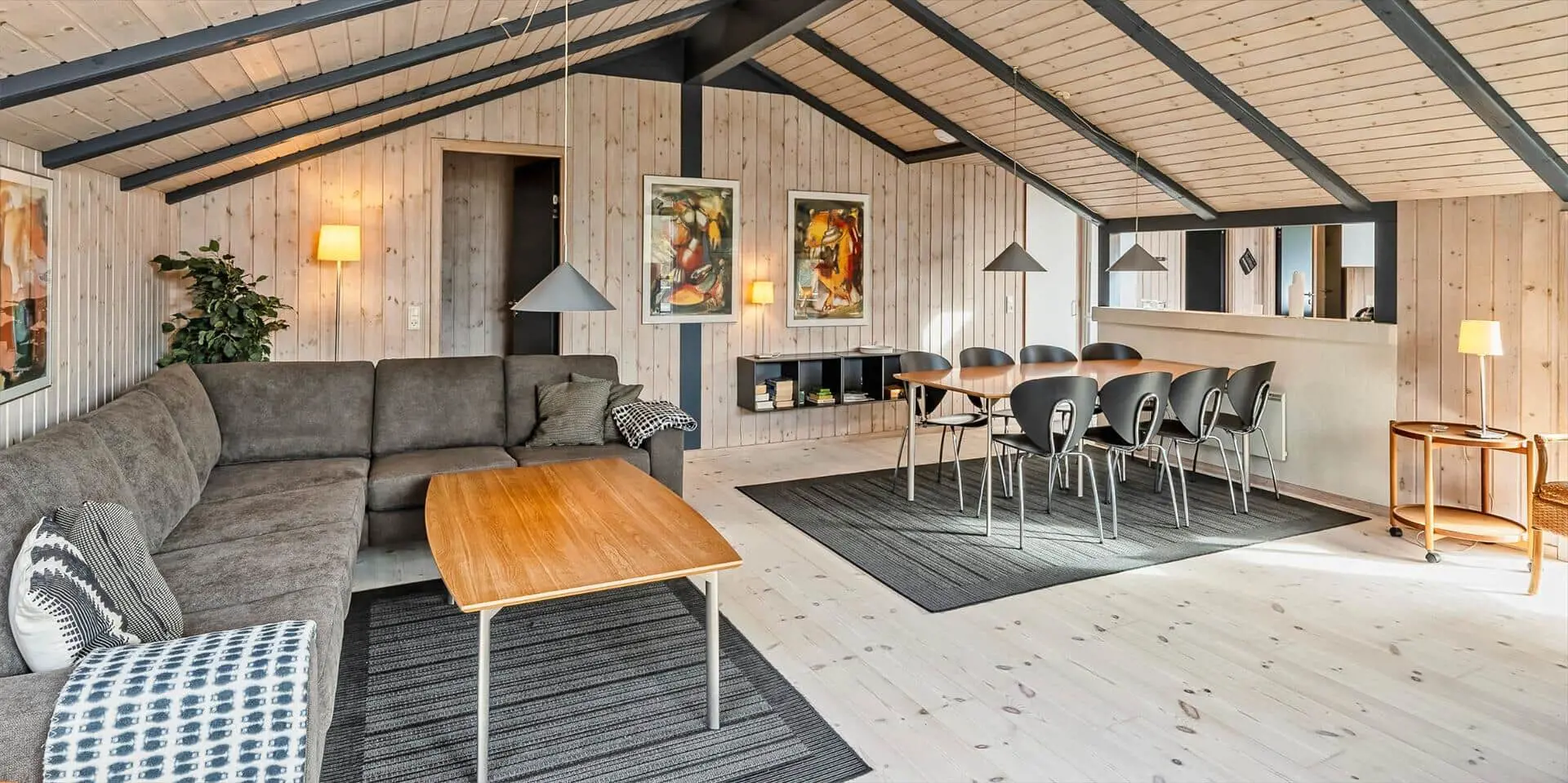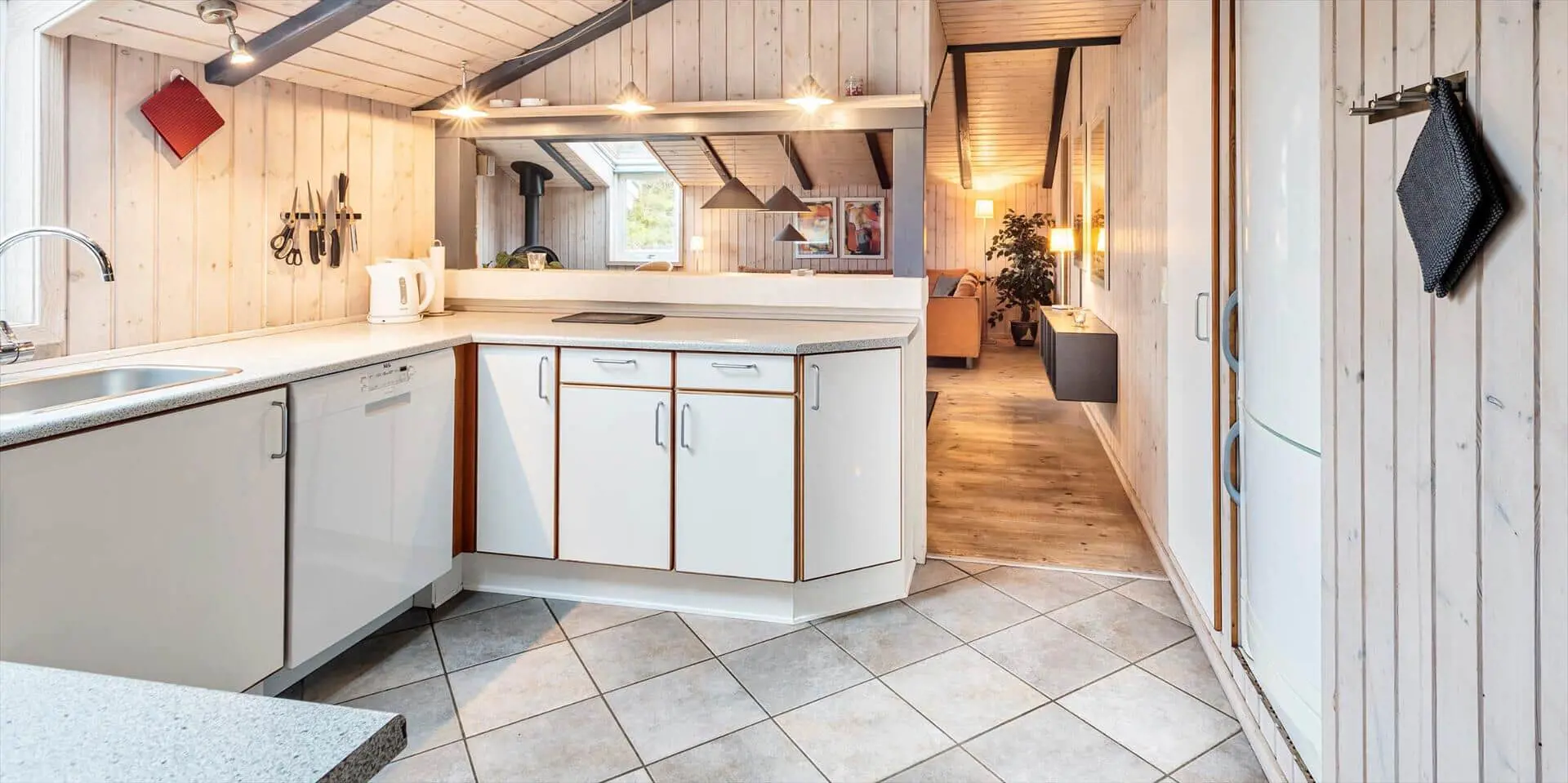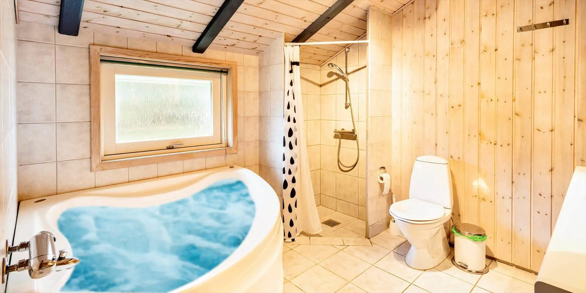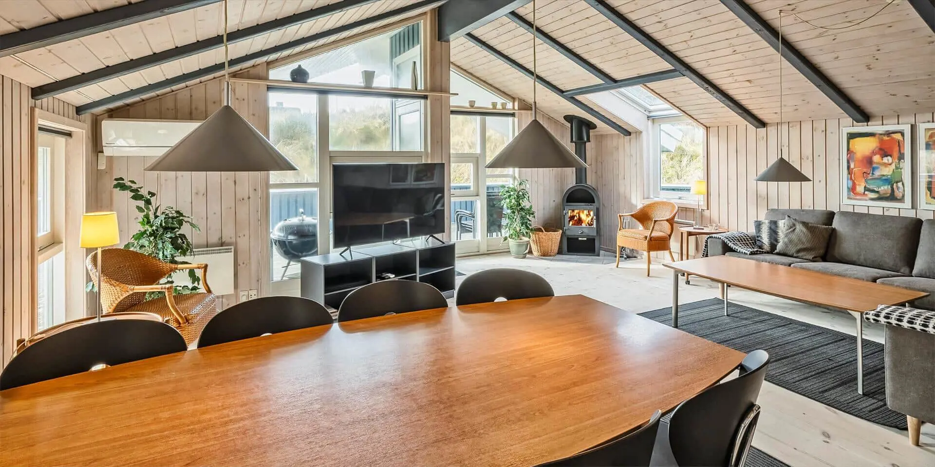 Hübsch eingerichtetes Ferienhaus von Dünen umgeben und für 8 Personen ausgestattet. Der Strand ist nur 200 Meter vom Haus entfernt. Der Wohnbereich ist zum Essbereich und der Küche hin offen und strahlt eine angenehme Wärme durch den schicken Holzfußboden aus. Farblich sind die Gardinen mit der Rundsitzecke gut abgestimmt. Der Kamin ist in einer Ecke im Wohnbereich aufgestellt. Es befindet sich eine Warmepumpe im Ferienhaus. Mit dieser Warmepumpe haben sie die Möglichkeit die Stromkosten zu senken, denn die Warmepumpe ist energiesparend. Das deutsche Fernsehprogramm empfangen Sie über Stofa, dadurch empfangen Sie nur 5-8 deutsche Kanäle. Die Küche ist zum Wohn- und Essbereich offen gehalten. Über dem Spülbecken in der Küche ist ein Oberlicht eingebaut und bringt zusätzliches Licht in die Küche. Die Küche verfügt über einen Herd mit Cerankochfeld, einem Backofen, einer Geschirrspülmaschine, einer Mikrowelle und einer Kühl- und Gefrierkombination. Zwei Bäder stehen den Gästen zur Verfügung. Beide sind mit einem WC, einem Handwaschbecken und einer Dusche ausgestattet. Das größere Bad hat zusätzlich eine Sauna und einen Whirlpool. Vier Schlafzimmer, mit je einem Doppelbett stehen den Gästen zur Verfügung. Eine Waschmaschine und ein Trockner steht zur Benutzung bereit. Das Ferienhaus verfügt über einen Internetanschluss (W-LanEs steht eine schöne geräumige Terrasse am Ferienhaus bereit. Ein Teil davon ist überdacht und sie ist sogar geschlossen. Hier können Sie mal Ihre Vierbeiner Luft schnappen lassen ohne das sie stiften gehen können. Für die Kleinen Gäste ist ein Trampolin aufgestellt, das das ganze Jahr benutzt werden kann. Für dieses Haus fallen extra Wasserkosten an.
