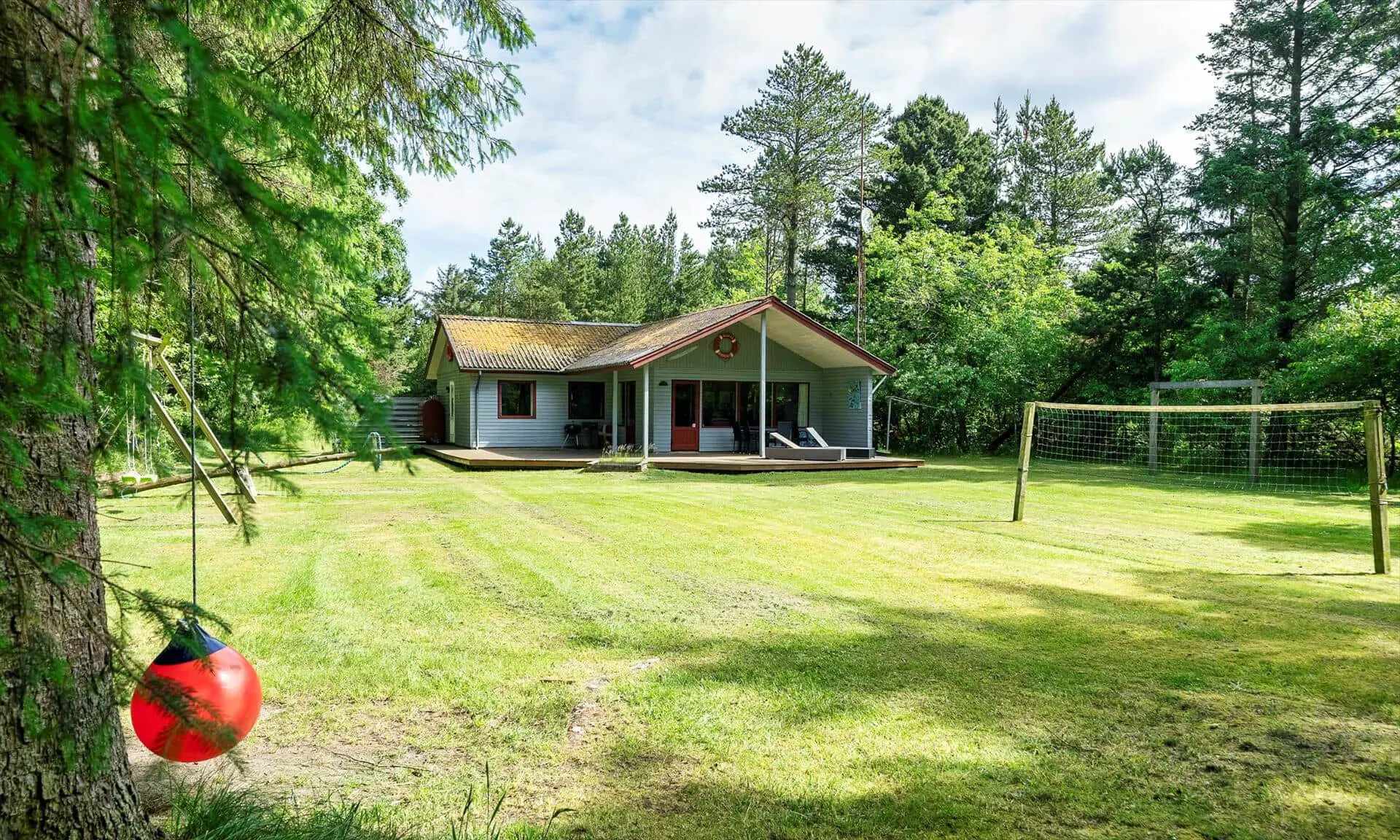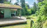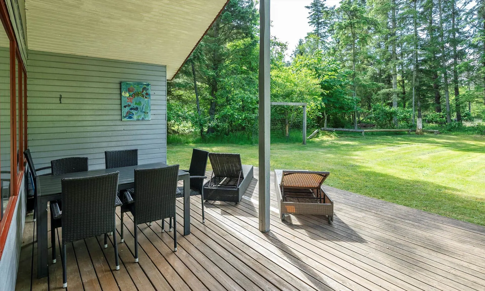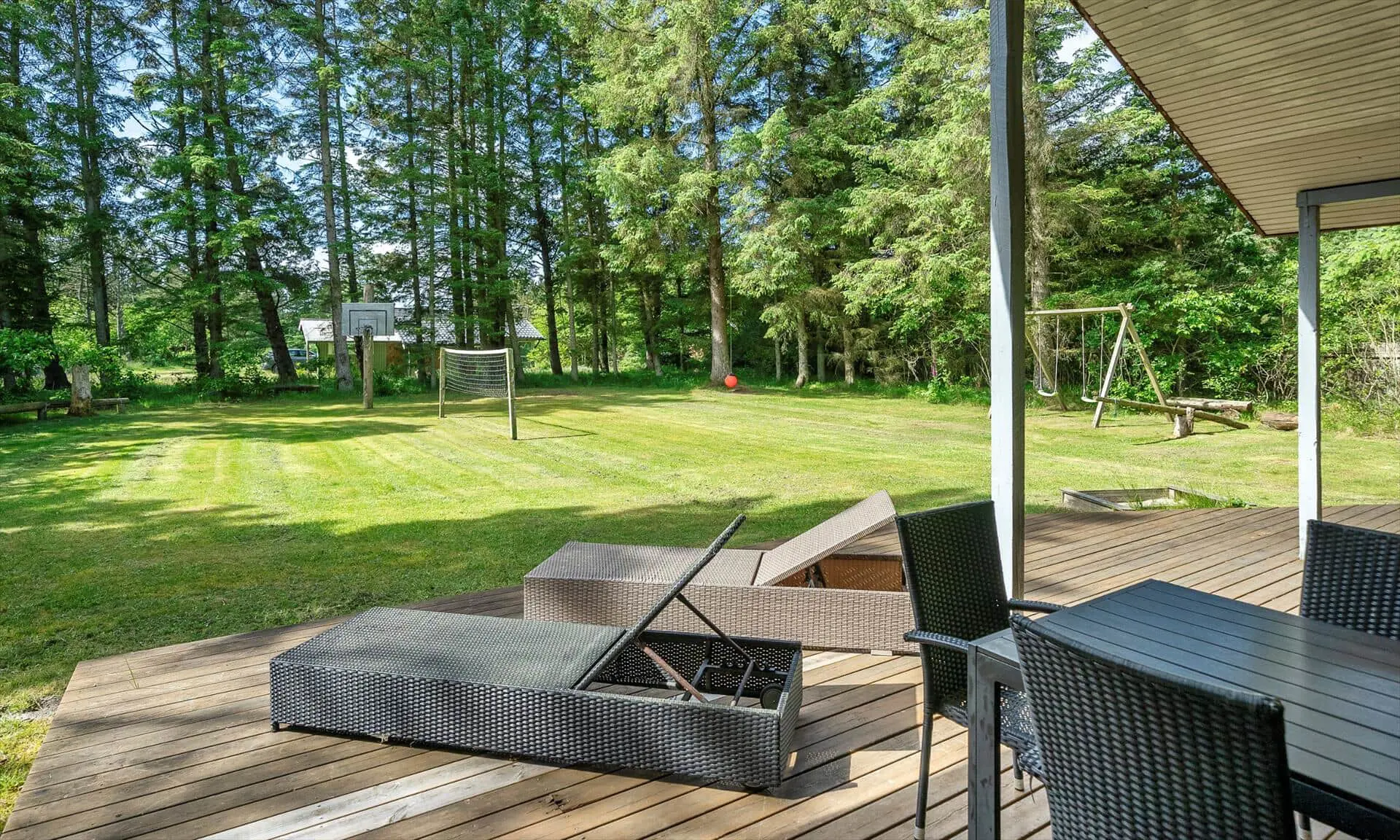 Vom Wohnzimmer gelangen Sie auf eine schöne überdachte Terrasse, auf der Sie Ihren Morgenkaffee oder ein Abendessen im Freien genießen können – bei jedem Wetter. Die Terrasse bietet mehrere gemütliche Ecken mit Blick auf den großen, uneinsehbaren Garten. Im Garten gibt es einen Basketballkorb und ein Volleyballnetz, die zu viel Spaß und Spiel für Kinder und Erwachsene einladen. Das Naturgrundstück lädt zu vielen Stunden im Freien ein, um die Umgebung und die Tierwelt zu entdecken.