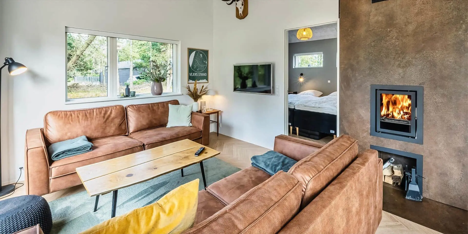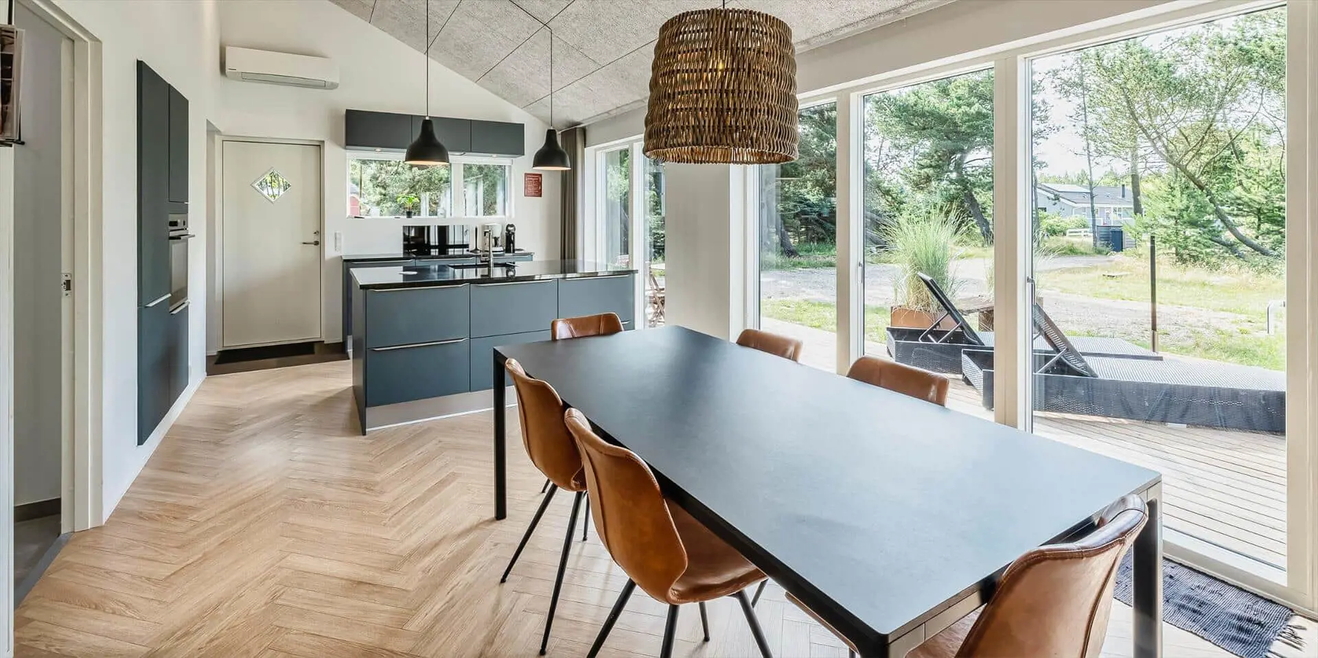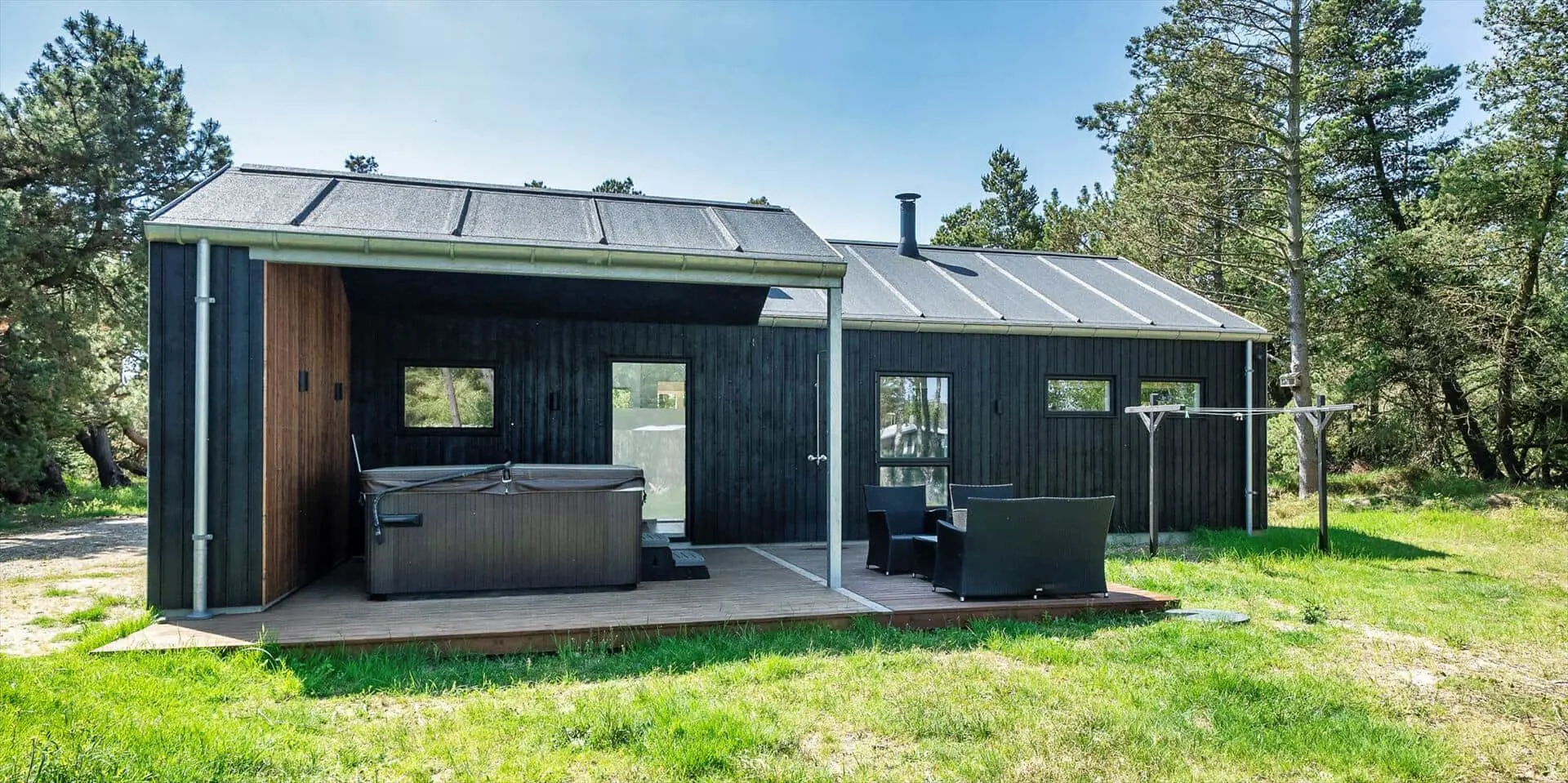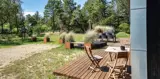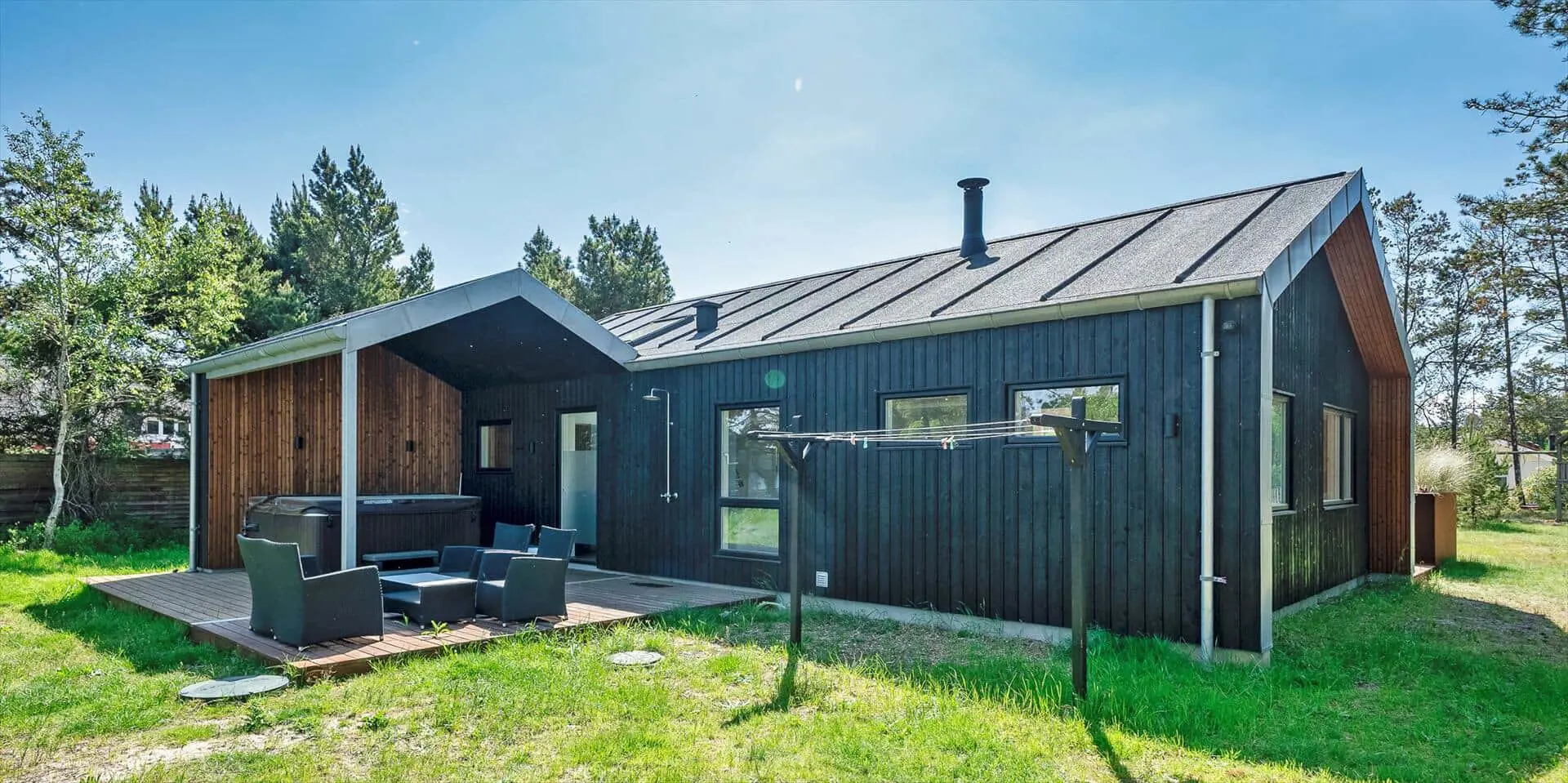 Wirklich schönes neueres Ferienhaus auf einem wunderschönen Naturgrundstück gelegen. Der Strand ist ca.1,8 Km vom Haus entfernt. Das Ferienhaus ist für 5 Personen ausgestattet. Alle Räumlichkeiten sind sehr grosszügig gehalten und bieten viel Platz für alle Bewohner des Hauses an. Das Ferienhaus ist ganzjährig isoliert und daher sehr energiesparend und ausserdem verfügt das Ferienhaus über eine Fussbodenheizung im ganzen Haus. Das Wohnzimmer ist mit dem Essbereich und der Küche offen gehalten. Die gemütliche Sofagarnitur lädt zum Kuscheln und Relaxen ein. Dazu der eingbaute Kamin an und der Abend kann mit einem Glächen Wein genossen werden. Erholung pur. Die Küche verfügt über einen Herd mit Cerankochfeld, Mikrowelle, einem Backofen, einer Geschirrspülmaschine und einer Kühl- und Gefrierkombination. Hier vom Küchenbereich ist ein Zugang zum Terrassenberich. Vom Essbereich haben Sie einen wundervollen Blick auf den Kamin. Der Wohnbereich ist mit grossen Panoramafenstern ausgestattet, damit Sie Ihren Blick auf das Naturgebiet richtig geniessen können. Das Fernsehprogramm empfangen Sie über Stofa, daher sind nur 5-8 deutsche Känale zu empfangen. Das Badezimmer ist mit einem Handwaschbecken, einem WC und einer Dusche ausgestattet. Vom Badezimmer aus haben Sie einen Zugang zur Sauna. Eine kombinierte Waschmaschine mit Trockner steht den Gästen für Ihren Aufenthalt im Hause zur Verfügung. Vom Badezimmer ist ein weiterer Zugang zum überdachten Terrassenbereich, wo sich ein Aussen Whirlpool und eine Aussendusche befindet. Im Ferienhaus gibt es zwei Schlafzimmer. Das eine Schlafzimmer verfügt über ein Doppelbett (180x200) und das zweite Schlafzimmer hat zwei Einzelbetten und ein Hängeboden. Wärmepumpe. Es befindet sich eine schöne neue Holzterrasse am Ferienhaus. Es ist nur ein Haustier erlaubt. Das Rauchen im Ferienhaus ist absolut nicht erlaubt. Das Ferienhaus verfügt über einen Internetanschluss (W-Lan). Baujahr 2020.